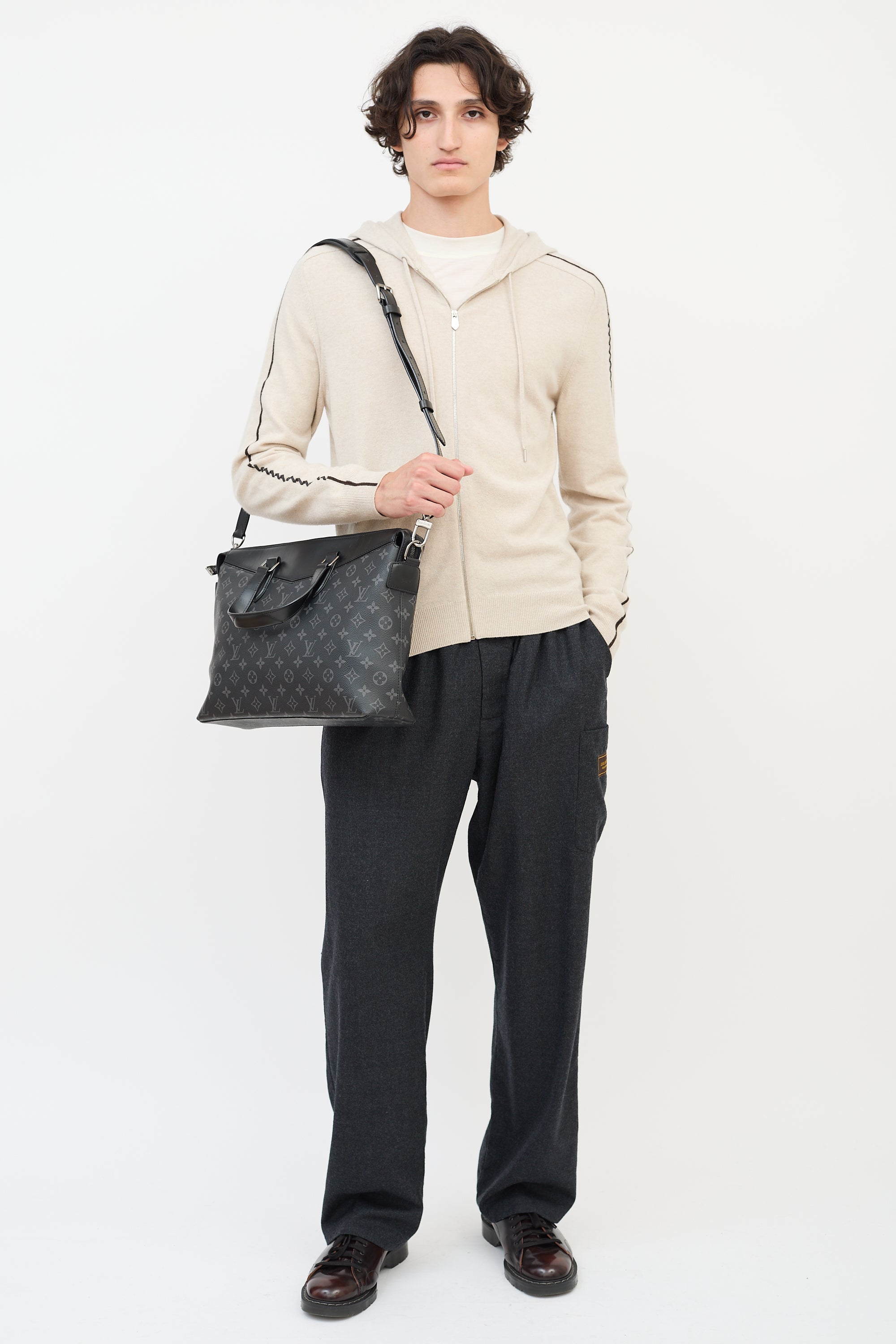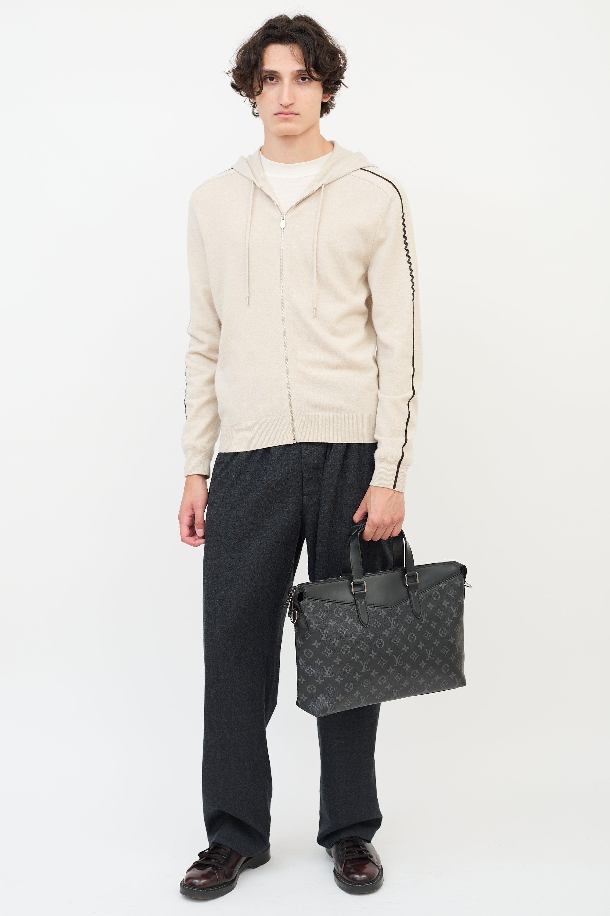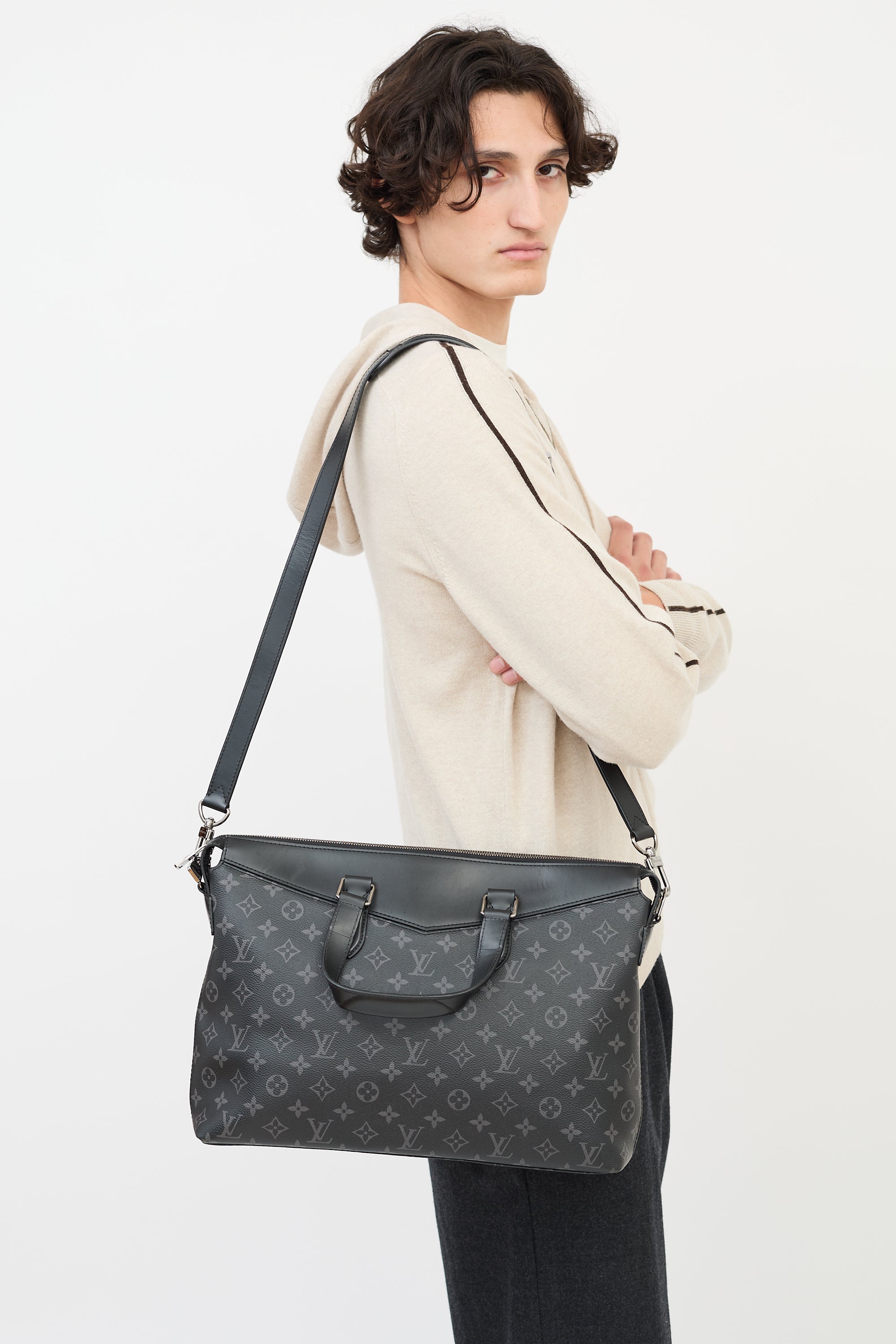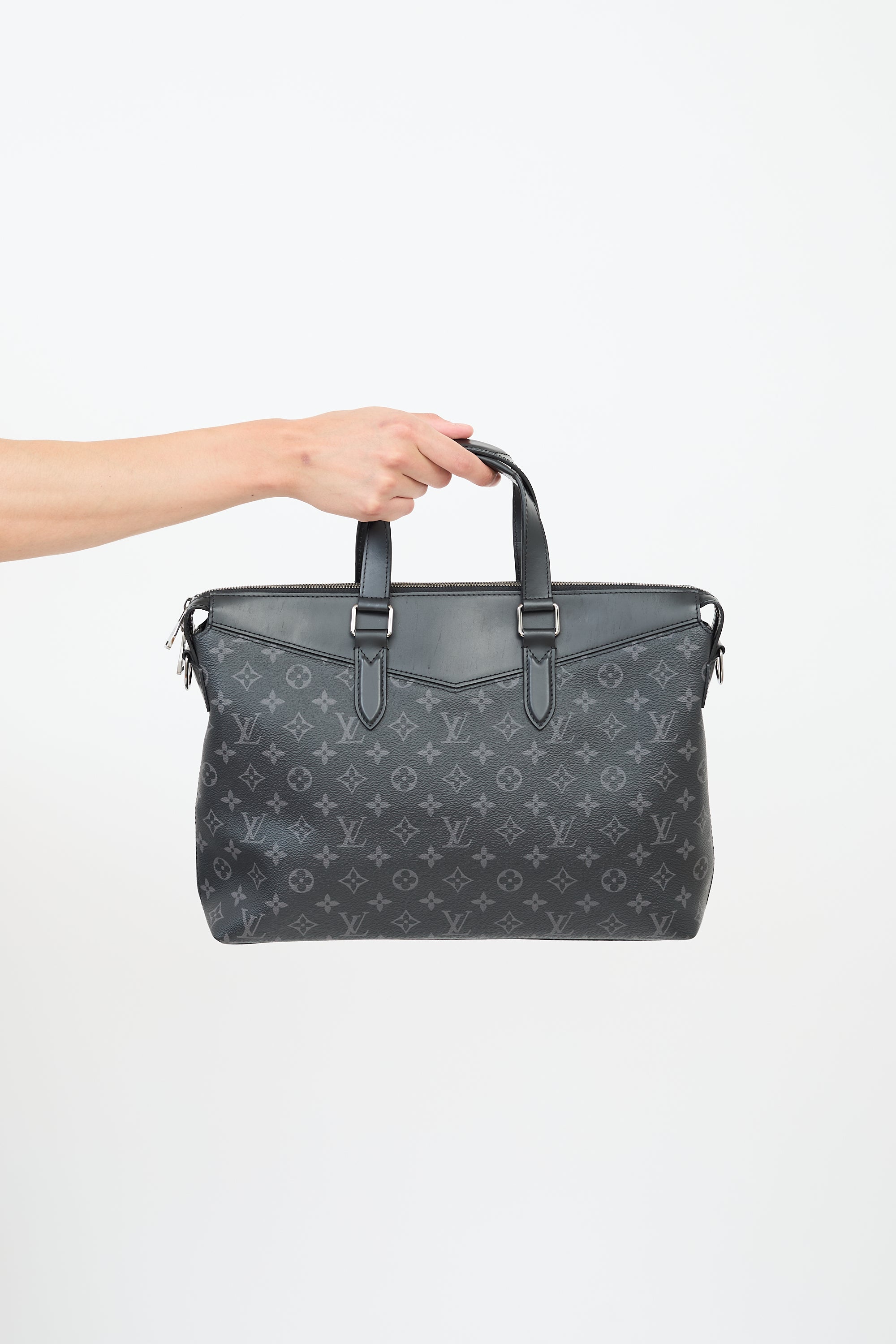 Pre-owned Louis Vuitton black Explorer briefcase featuring Monogram Eclipse canvas body, tonal stitching, silver tone hardware, black smooth leather top panelling with stamped logo at front, dual flat top handles, detachable and adjustable shoulder strap, top double zip closure, and one lined main compartment with four slip pockets.