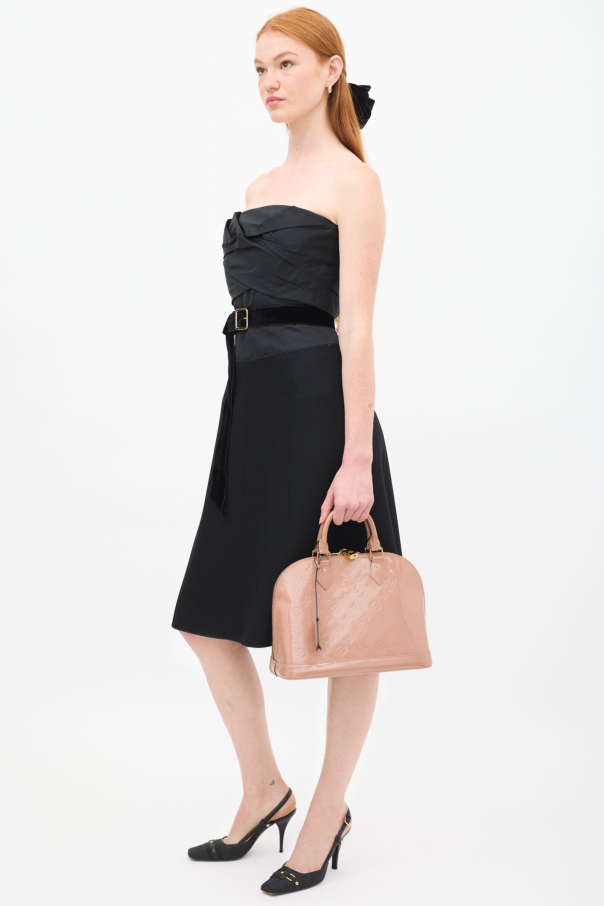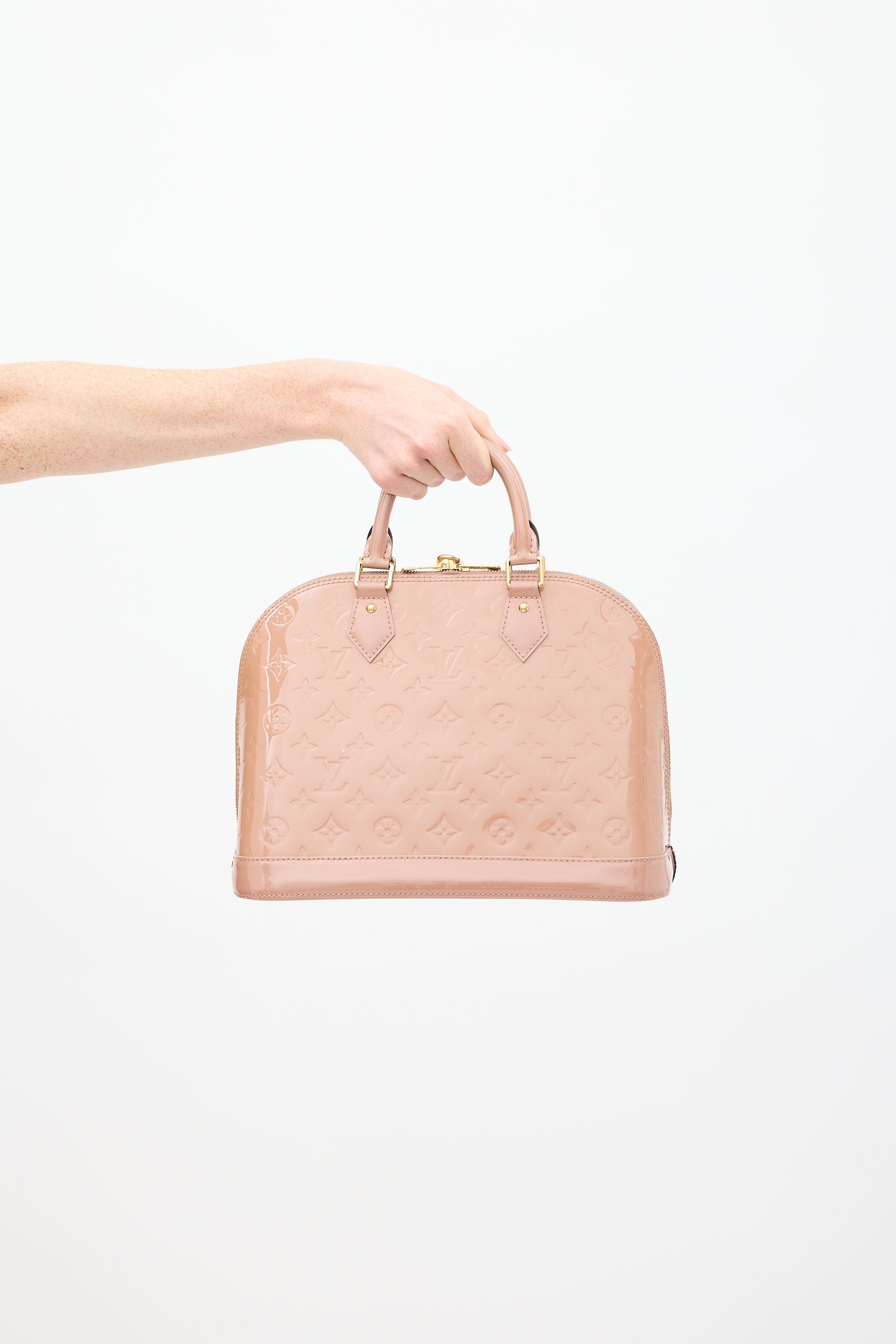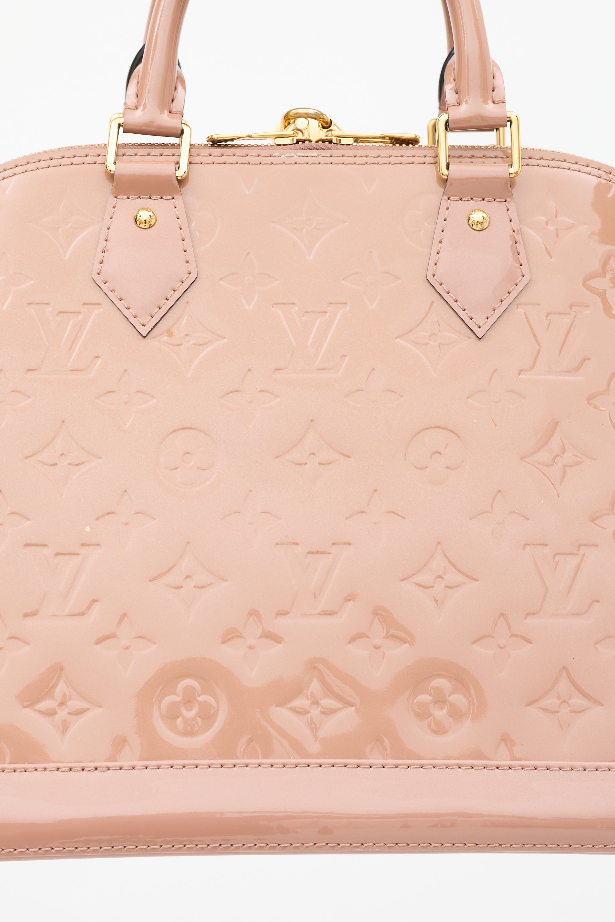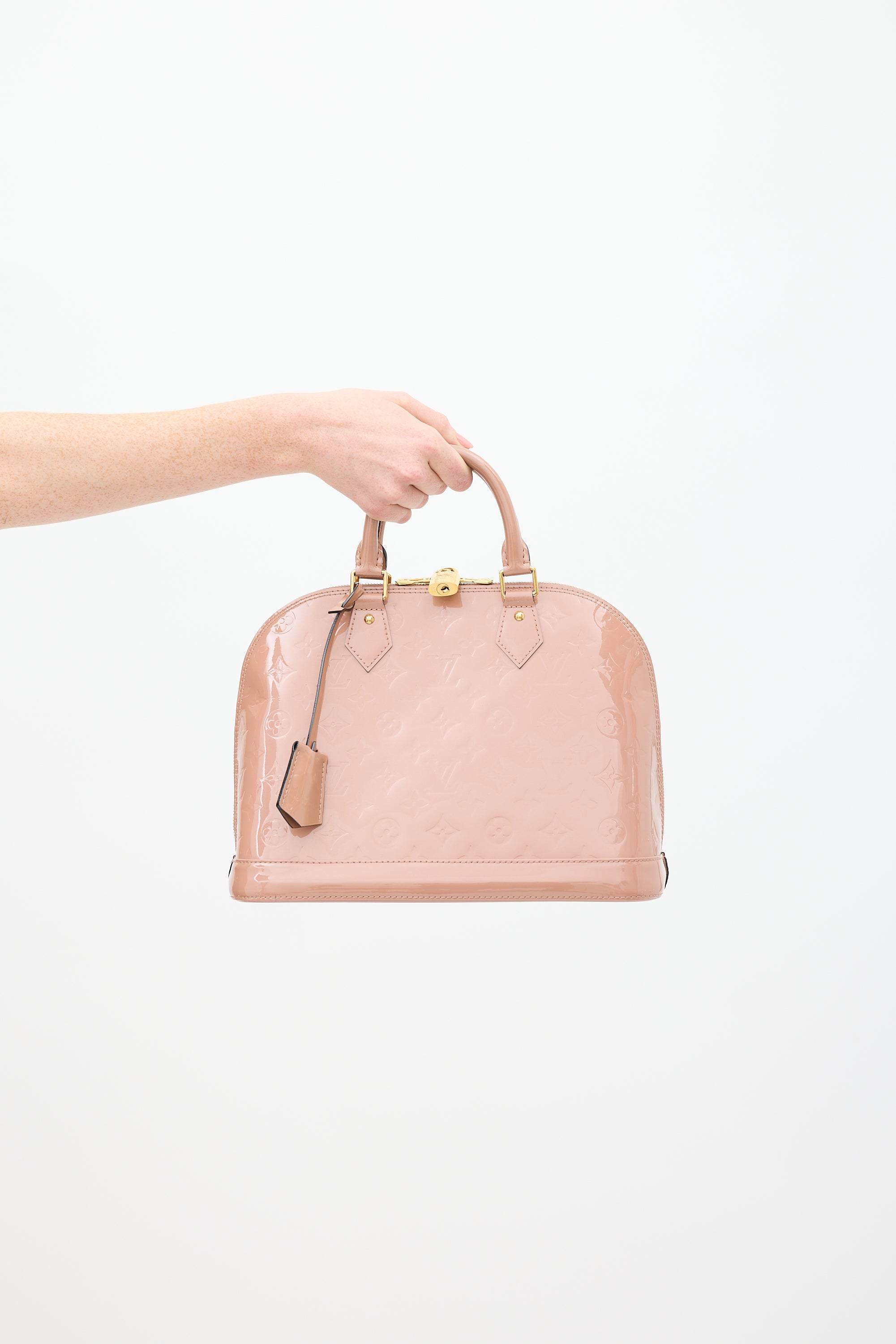 Pre-owned Louis Vuitton pink Alma PM bag in monogram Vernis patent leather featuring tonal stitching, gold tone hardware, four protective feet at base, dual rolled top handles, key clochette at handle, dual top zip with debossed logo padlock at zipper pull, and one lined main compartment with two slip pockets.