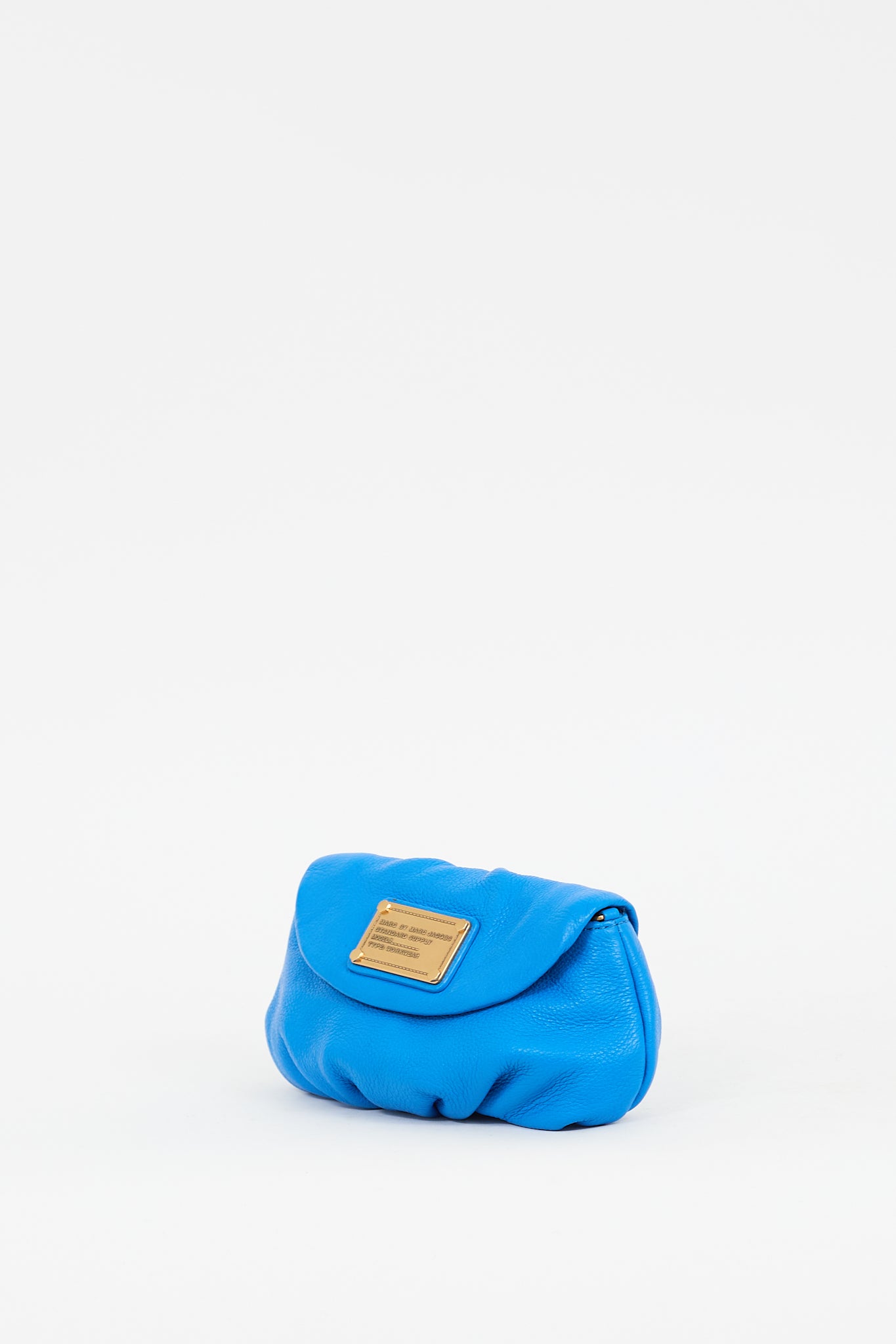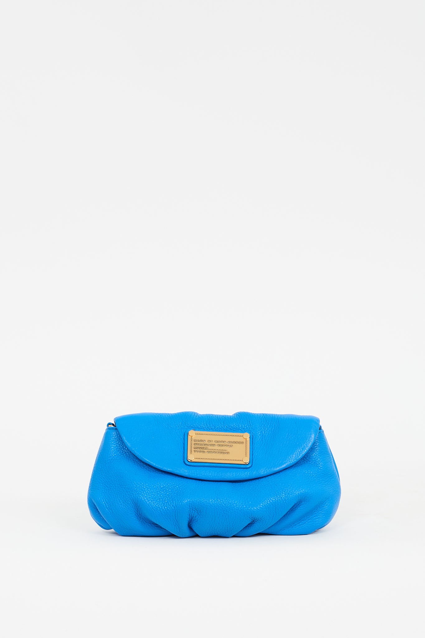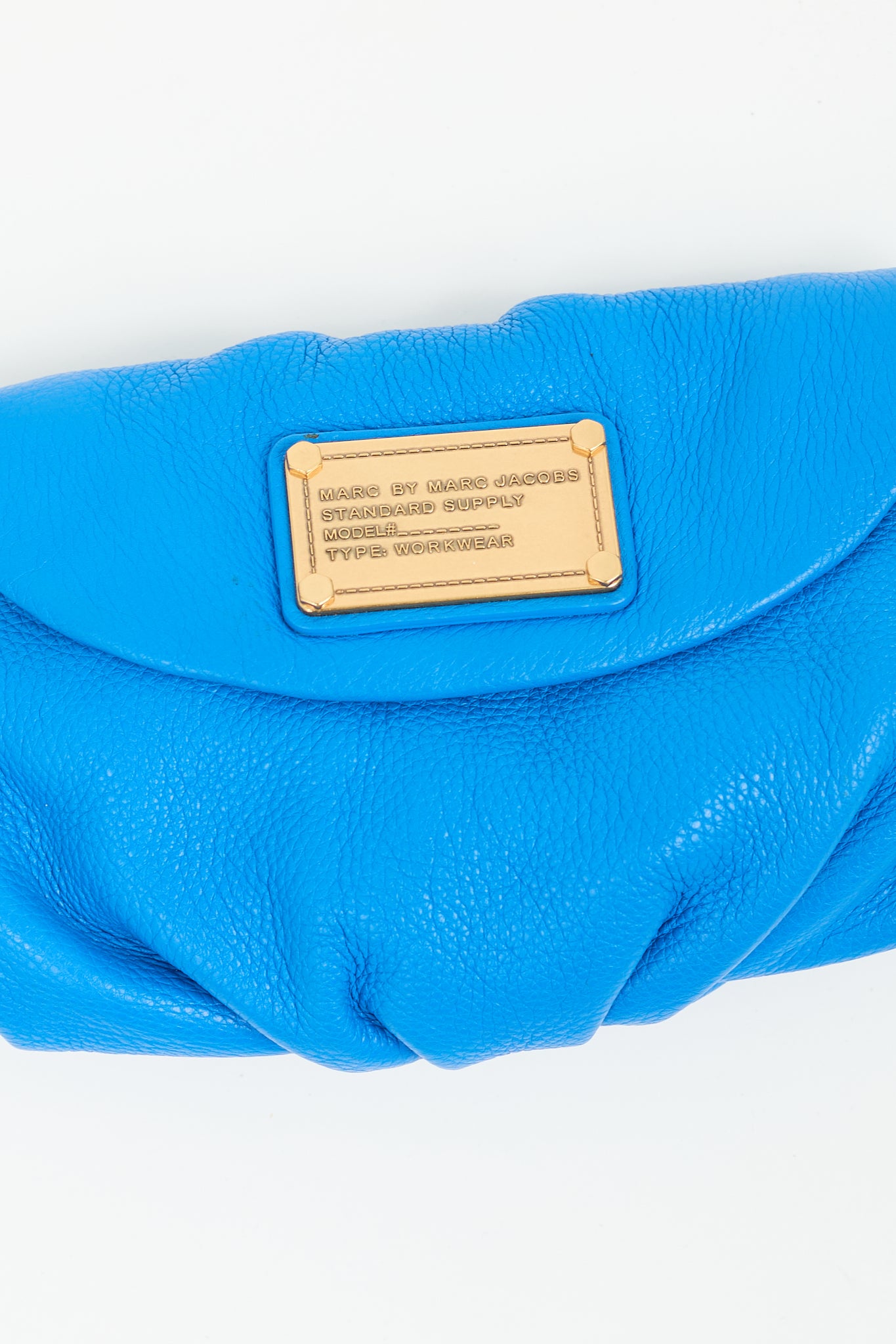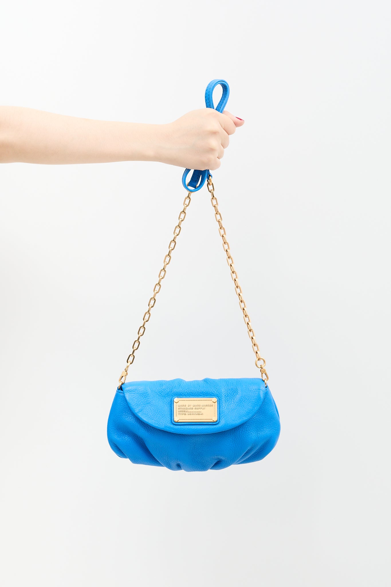 Pre-owned Marc Jacobs blue leather Classic Q Karlie bag featuring gold tone hardware, pleated base, adjustable leather and chain crossbody strap, top flap with logo plaque, magnetic snap closure, and one lined main compartment with six card slots.