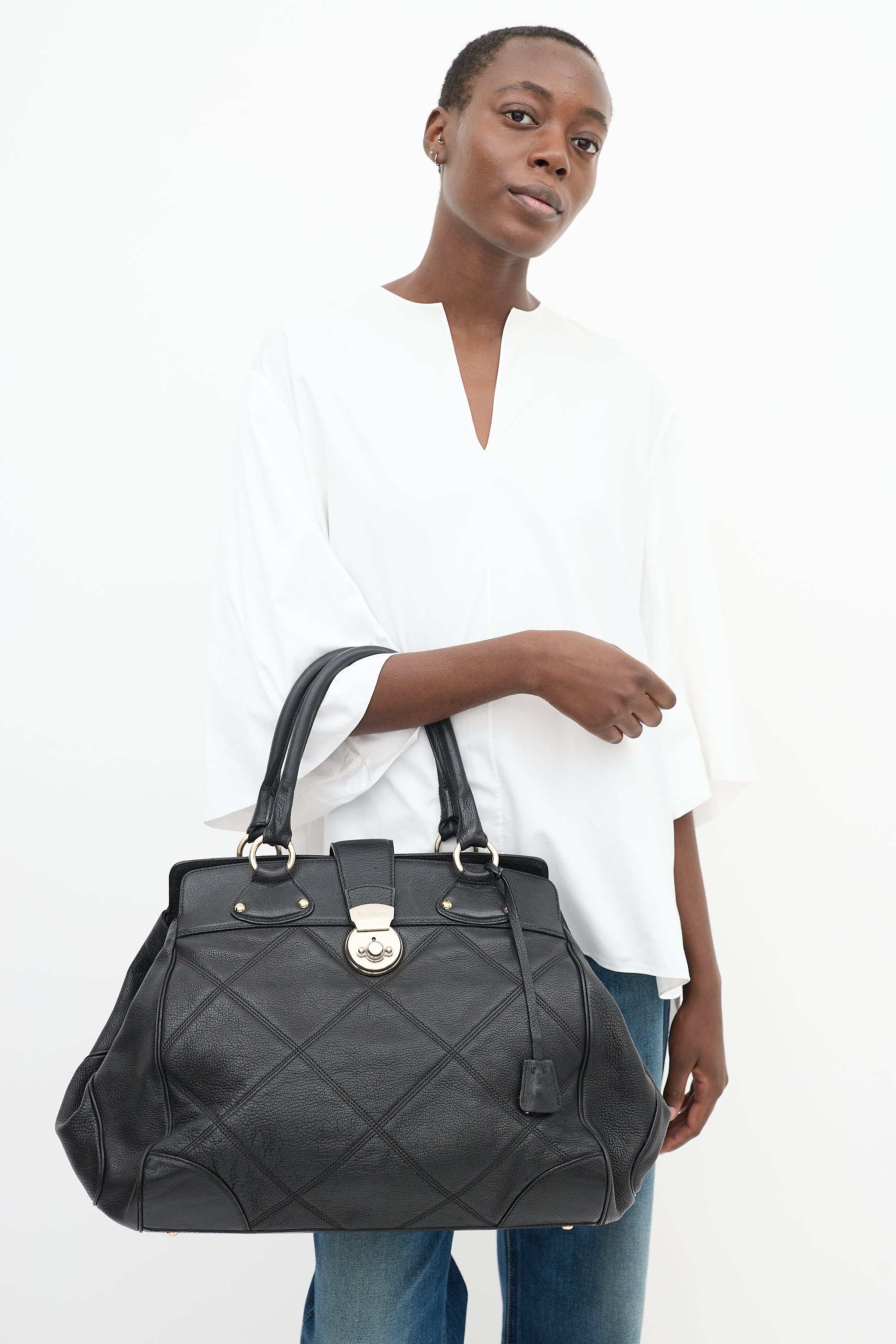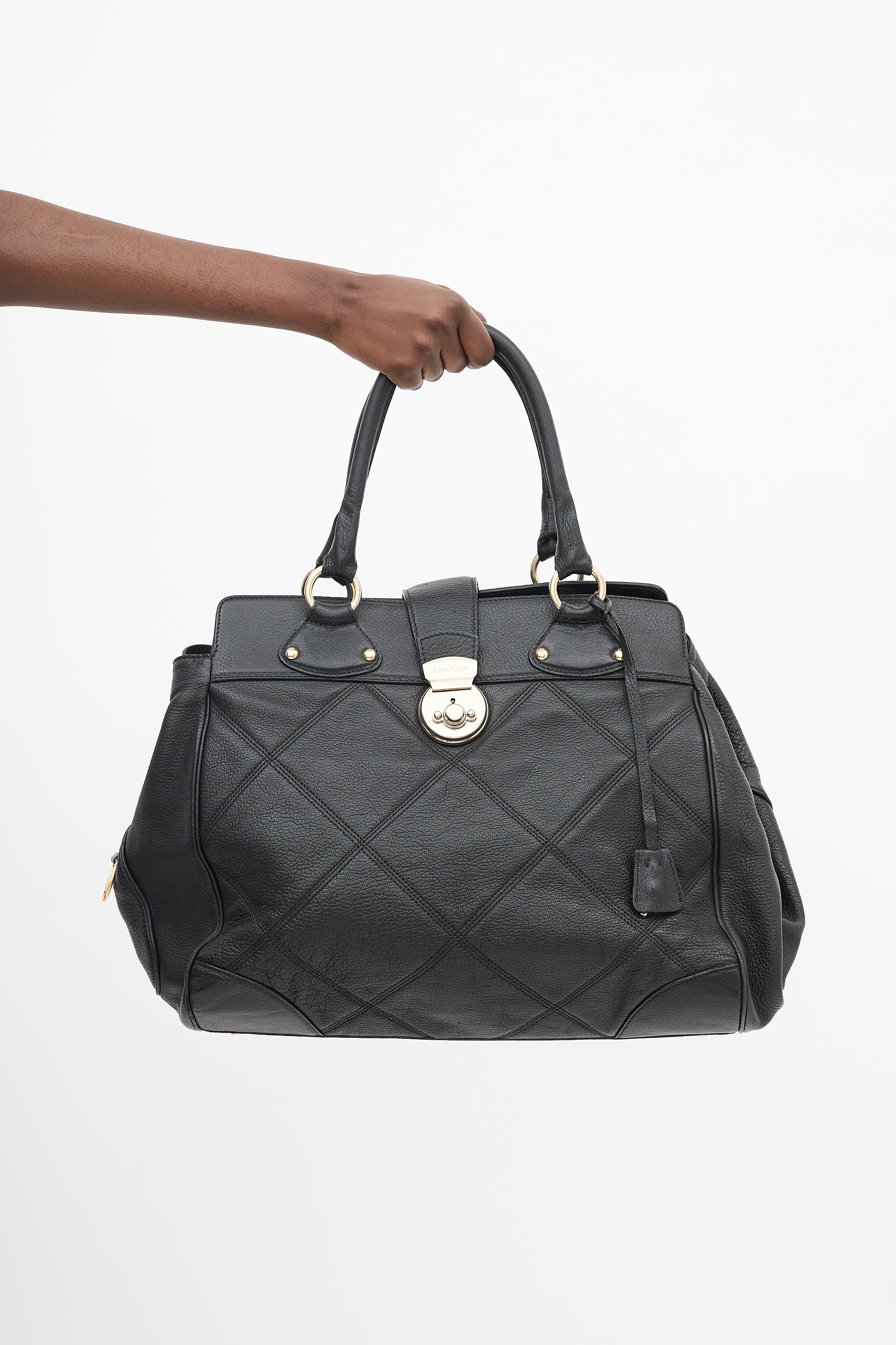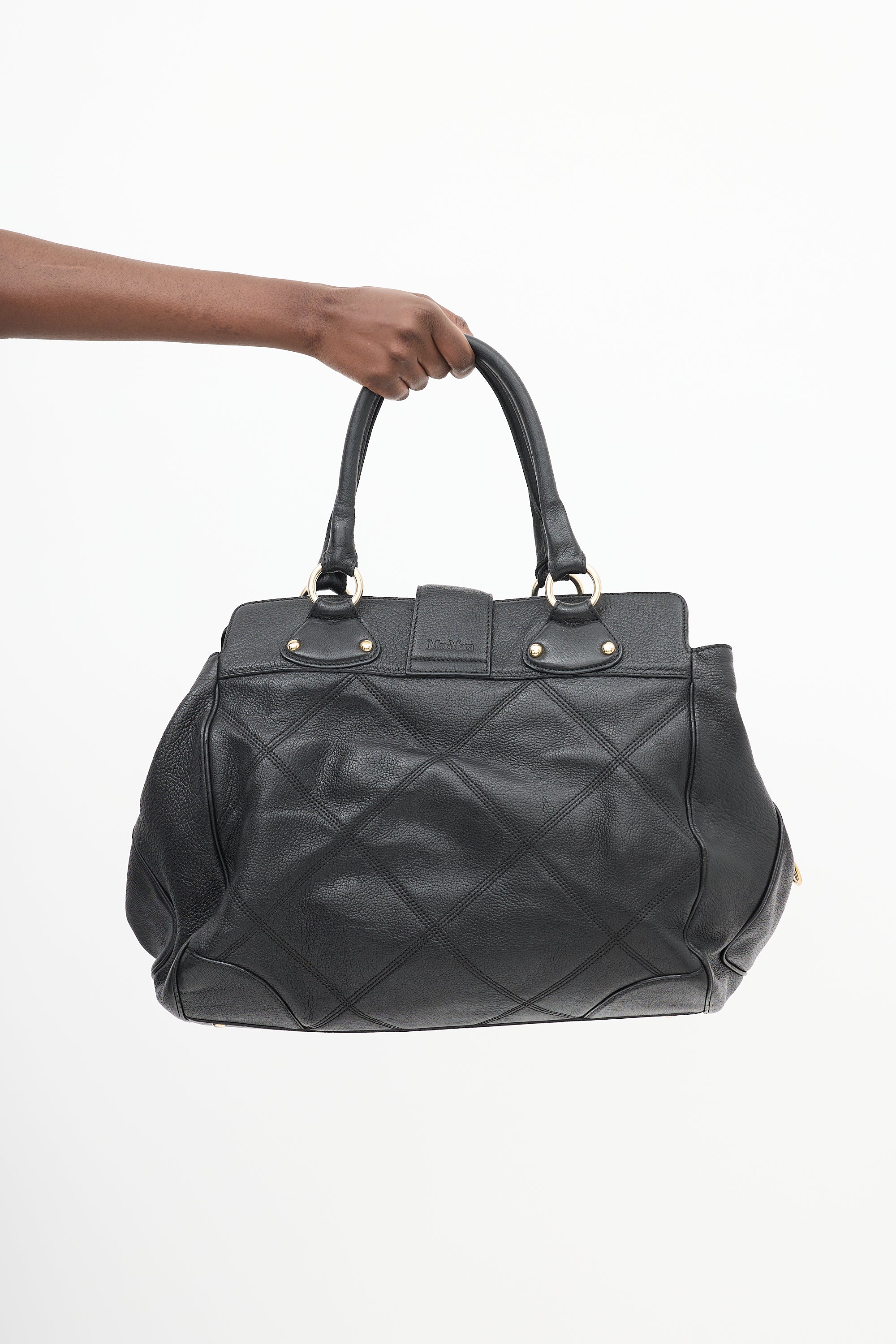 Pre-owned Max Mara black leather tote bag featuring tonal quilt stitching throughout body, silver tone hardware, four protective feet at base, top strap fastening with back stamped logo and front push lock closure, dual rolled top handles, removable clochette charm with key at handle, and two lined main compartments with zippered divider, one zip pocket, and one slip pocket.