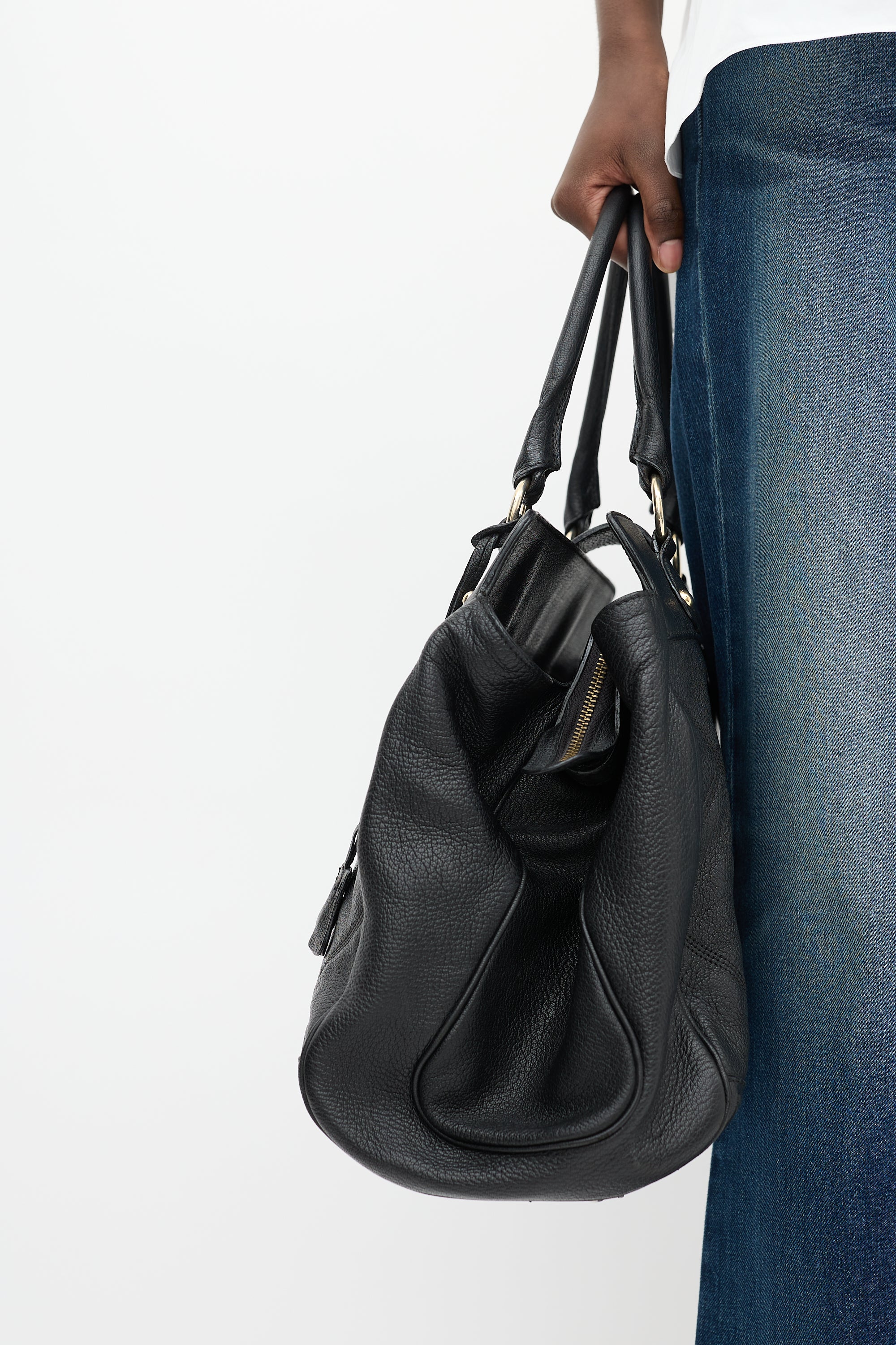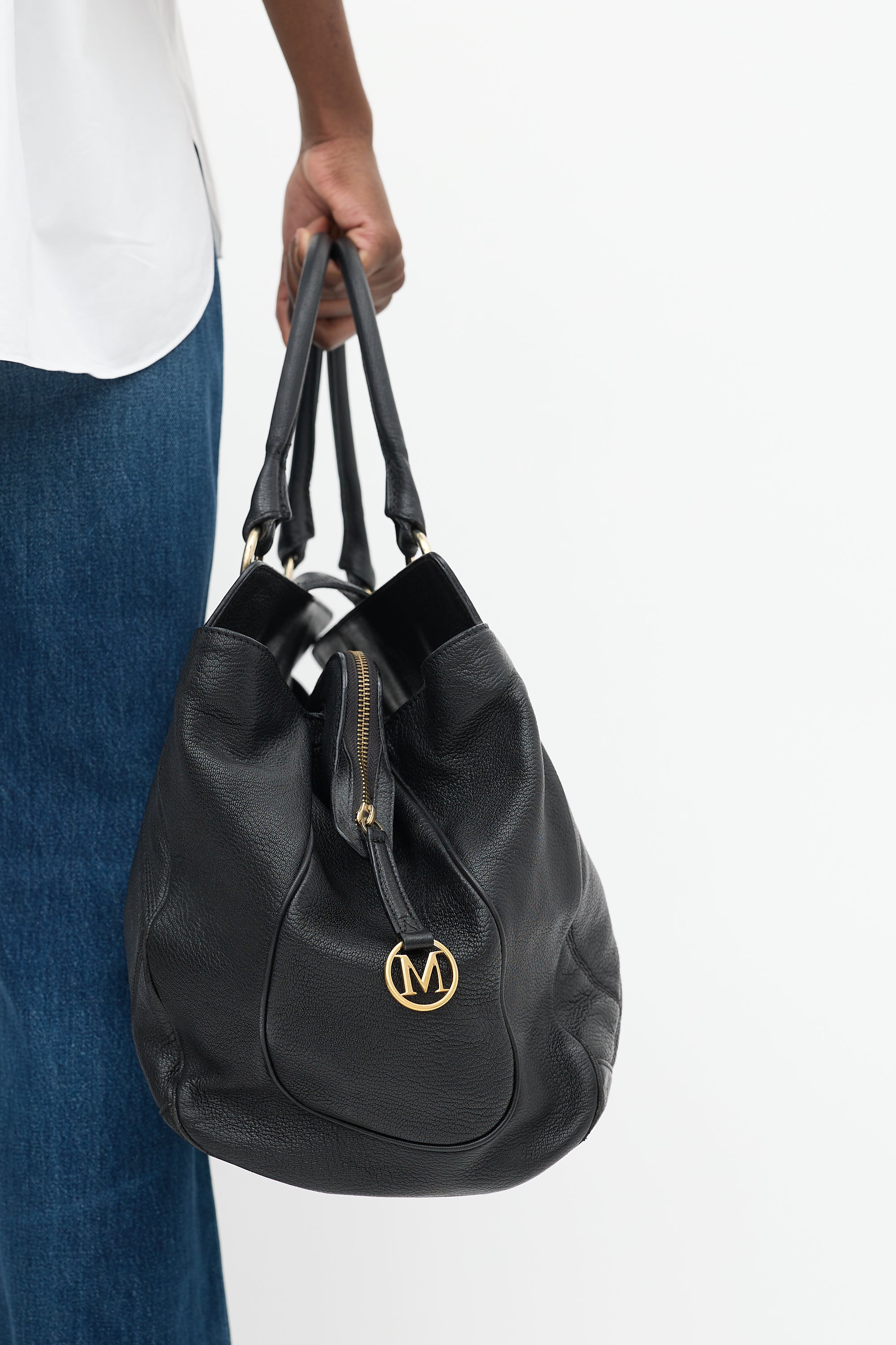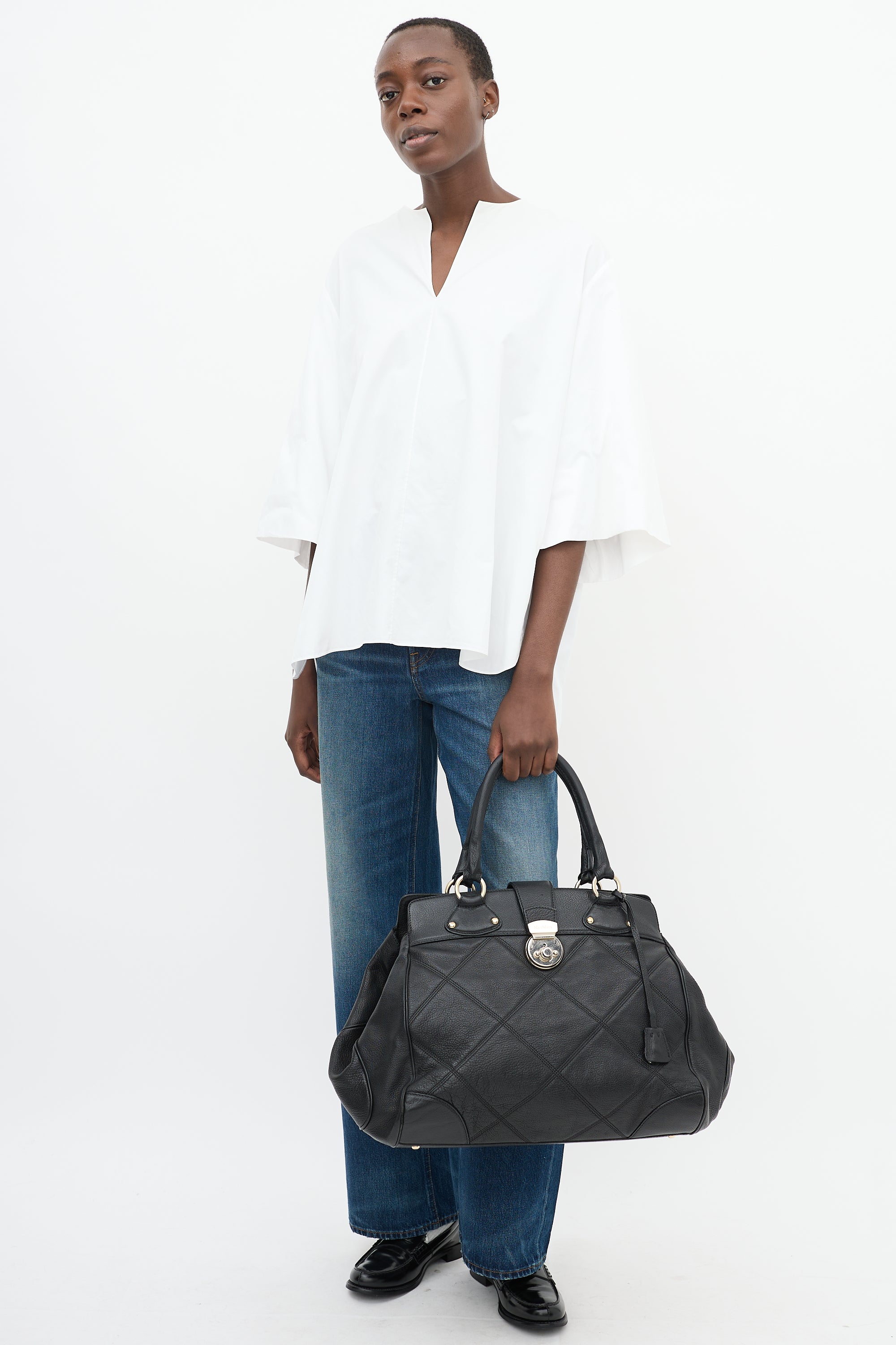 Pre-owned Max Mara black leather tote bag featuring tonal quilt stitching throughout body, silver tone hardware, four protective feet at base, top strap fastening with back stamped logo and front push lock closure, dual rolled top handles, removable clochette charm with key at handle, and two lined main compartments with zippered divider, one zip pocket, and one slip pocket.