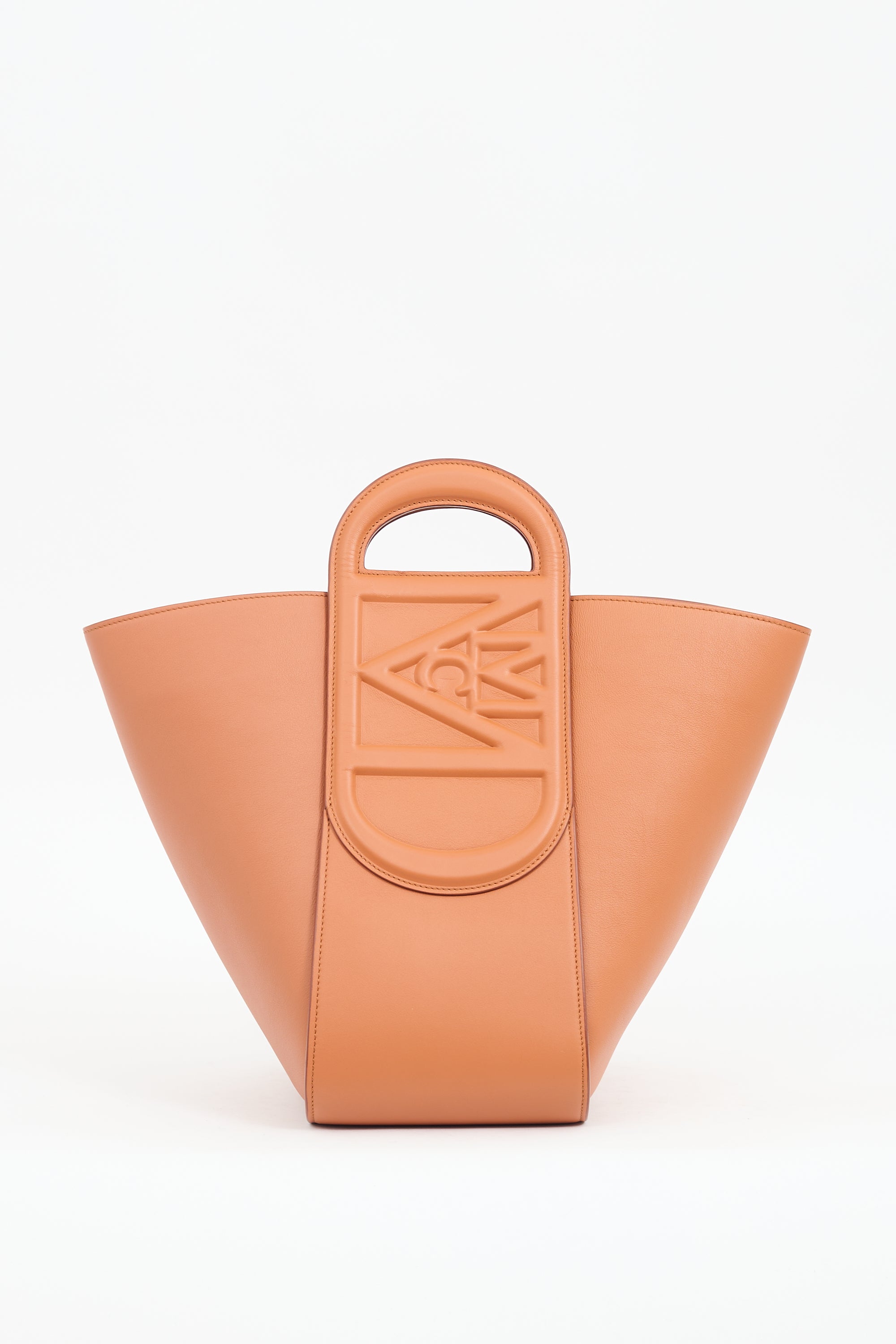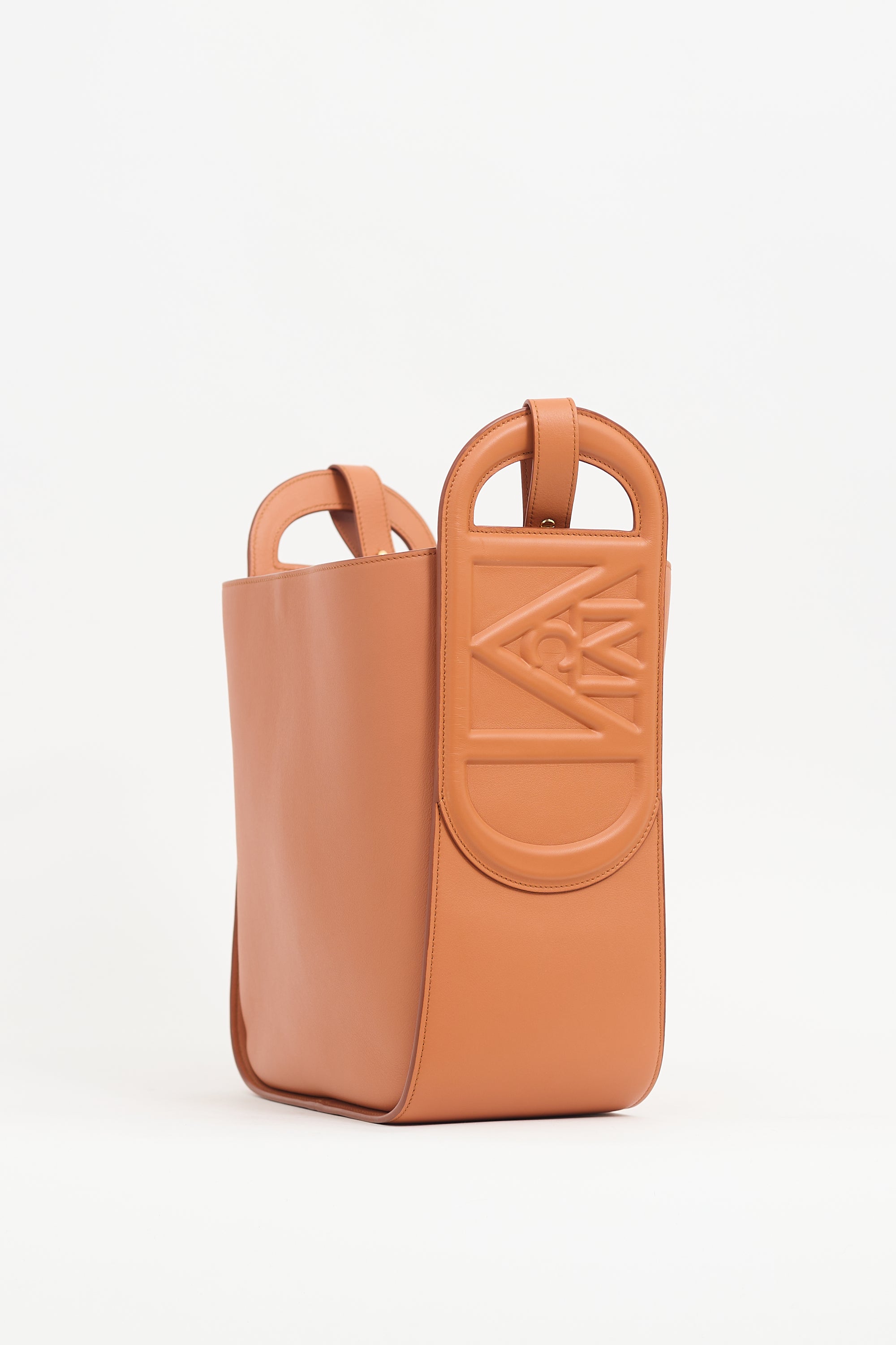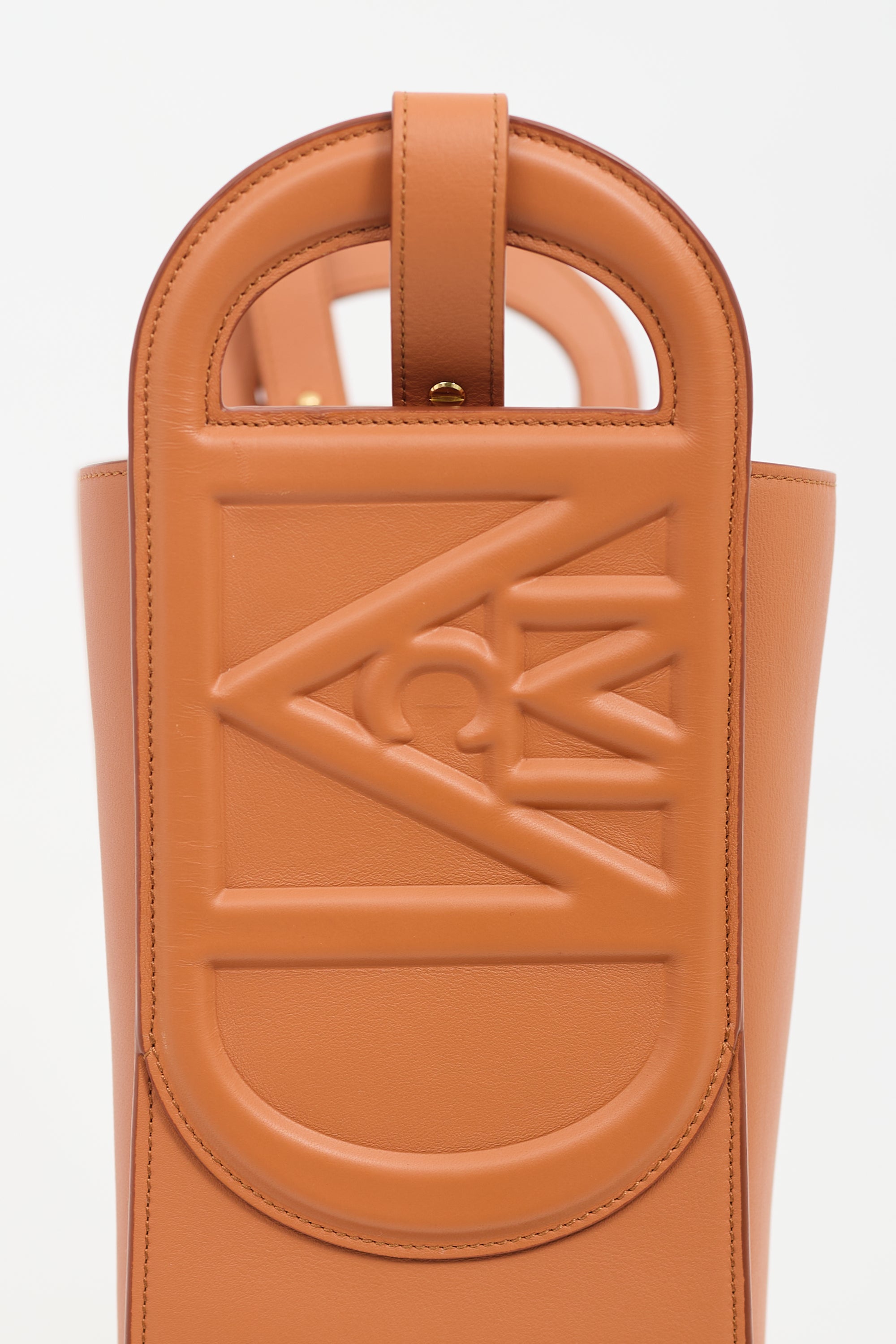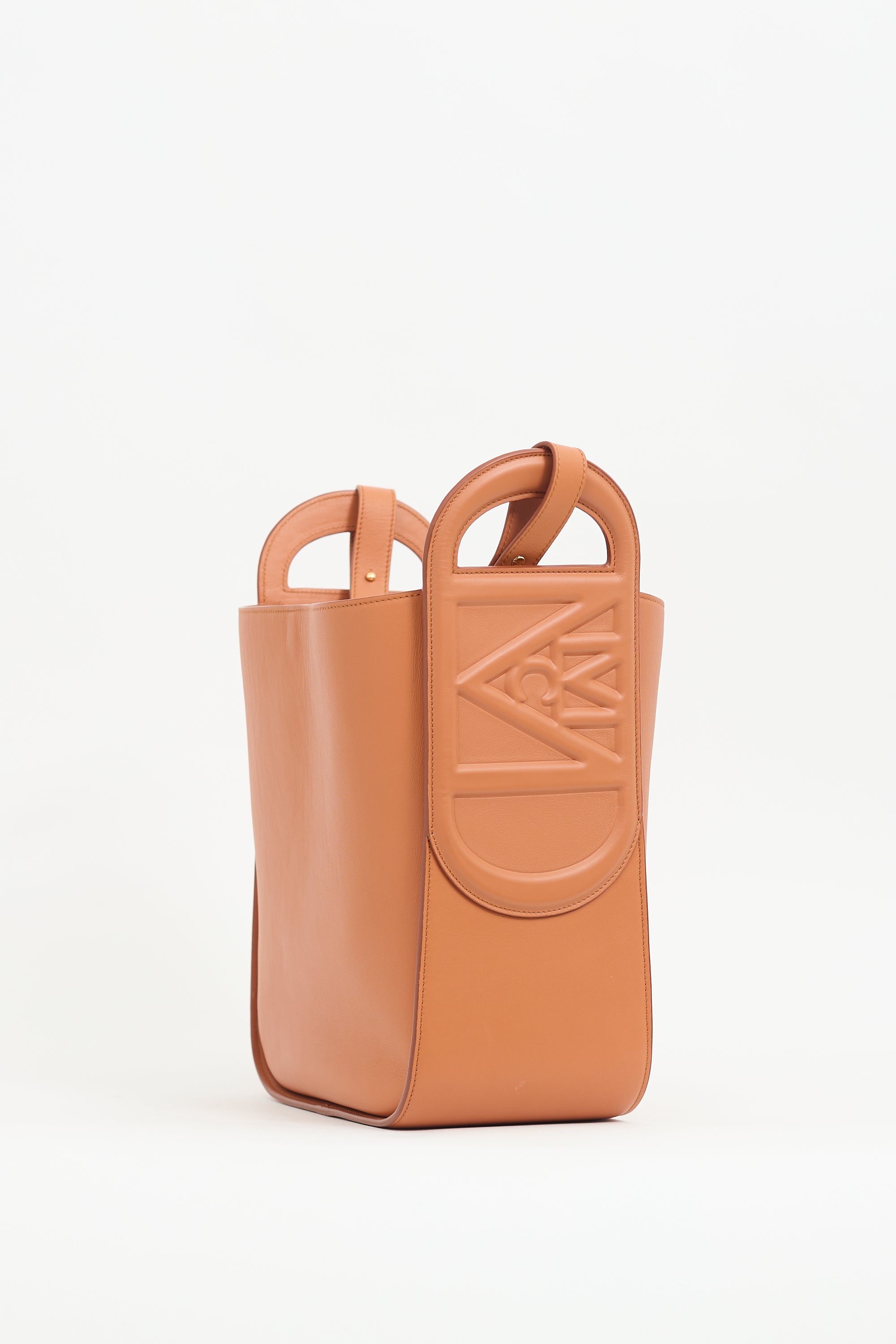 Pre-owned MCM brown leather Travia tote bag featuring embossed ringed logo at sides, two top handle, adjustable shoulder strap, convertible body, clasp and magnetic closure, and two phone pockets inside. Suede lined. Comes with original dust bag.