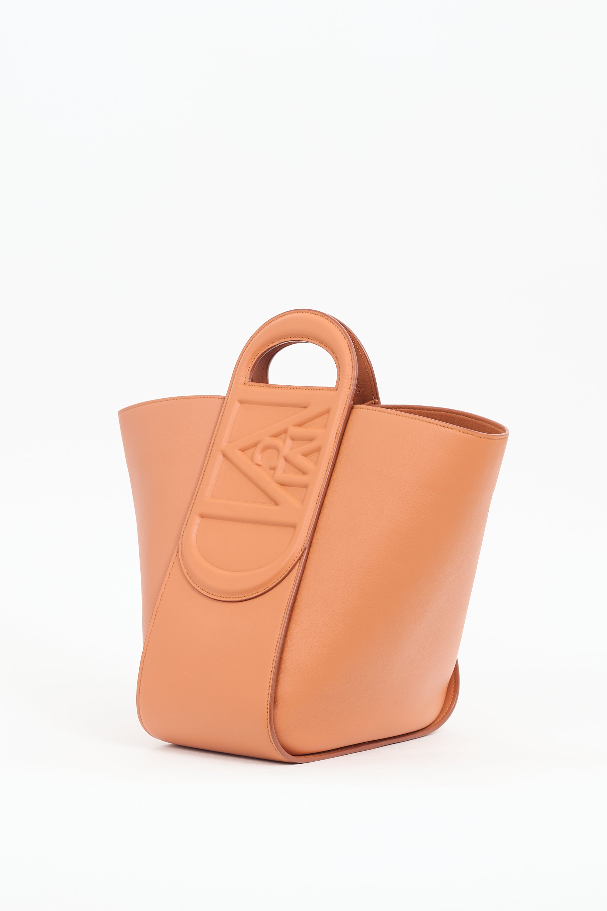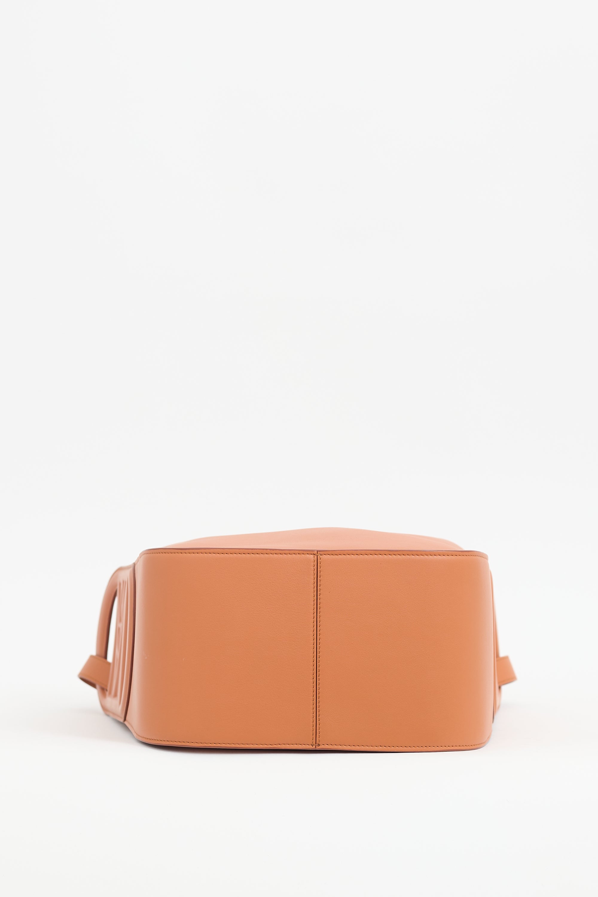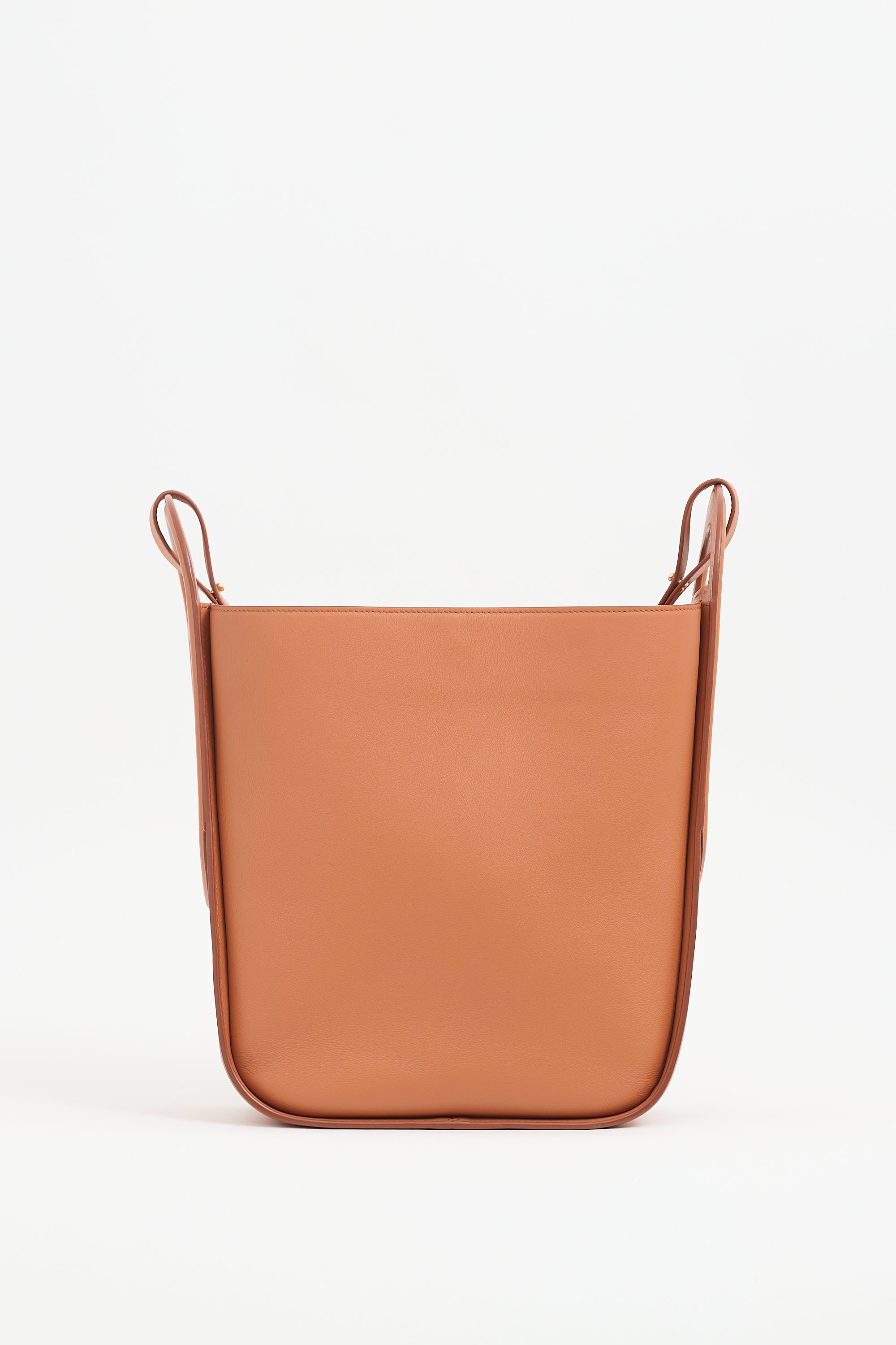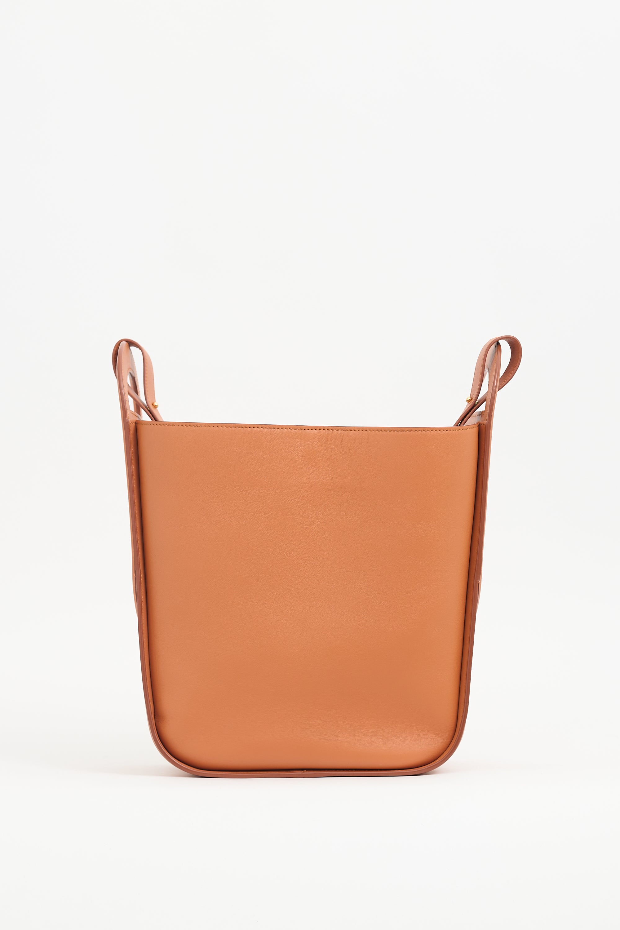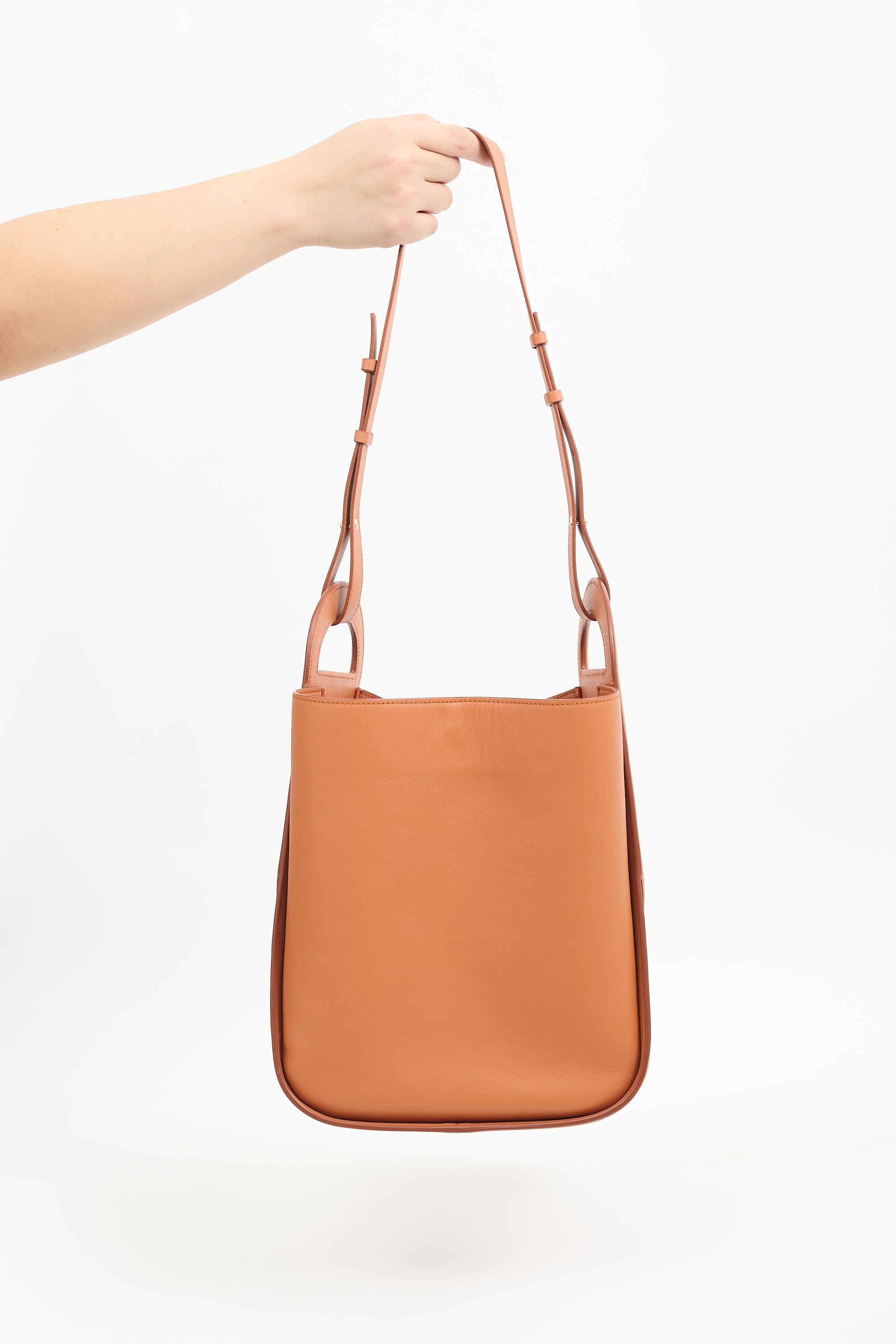 Pre-owned MCM brown leather Travia tote bag featuring embossed ringed logo at sides, two top handle, adjustable shoulder strap, convertible body, clasp and magnetic closure, and two phone pockets inside. Suede lined. Comes with original dust bag.