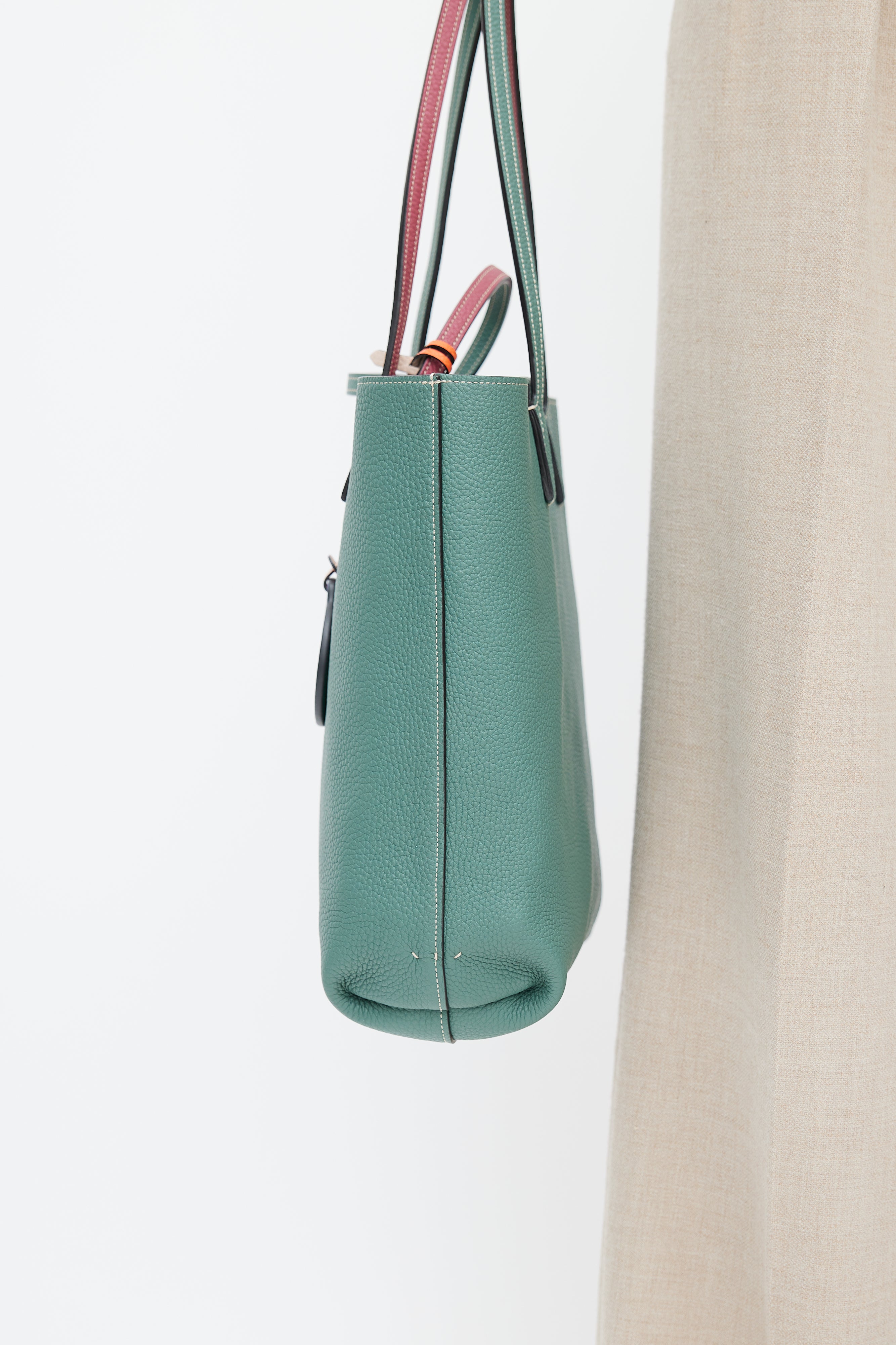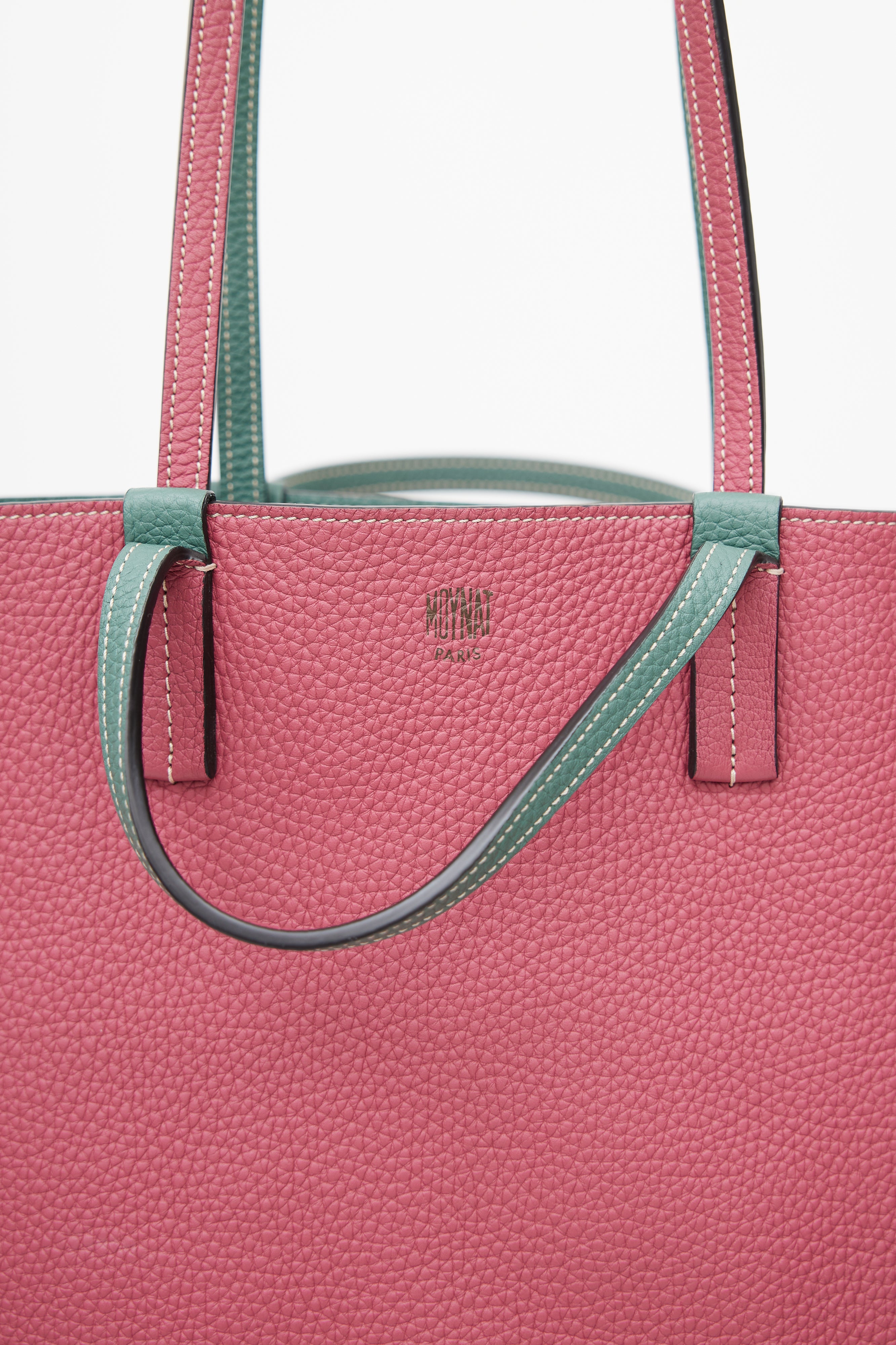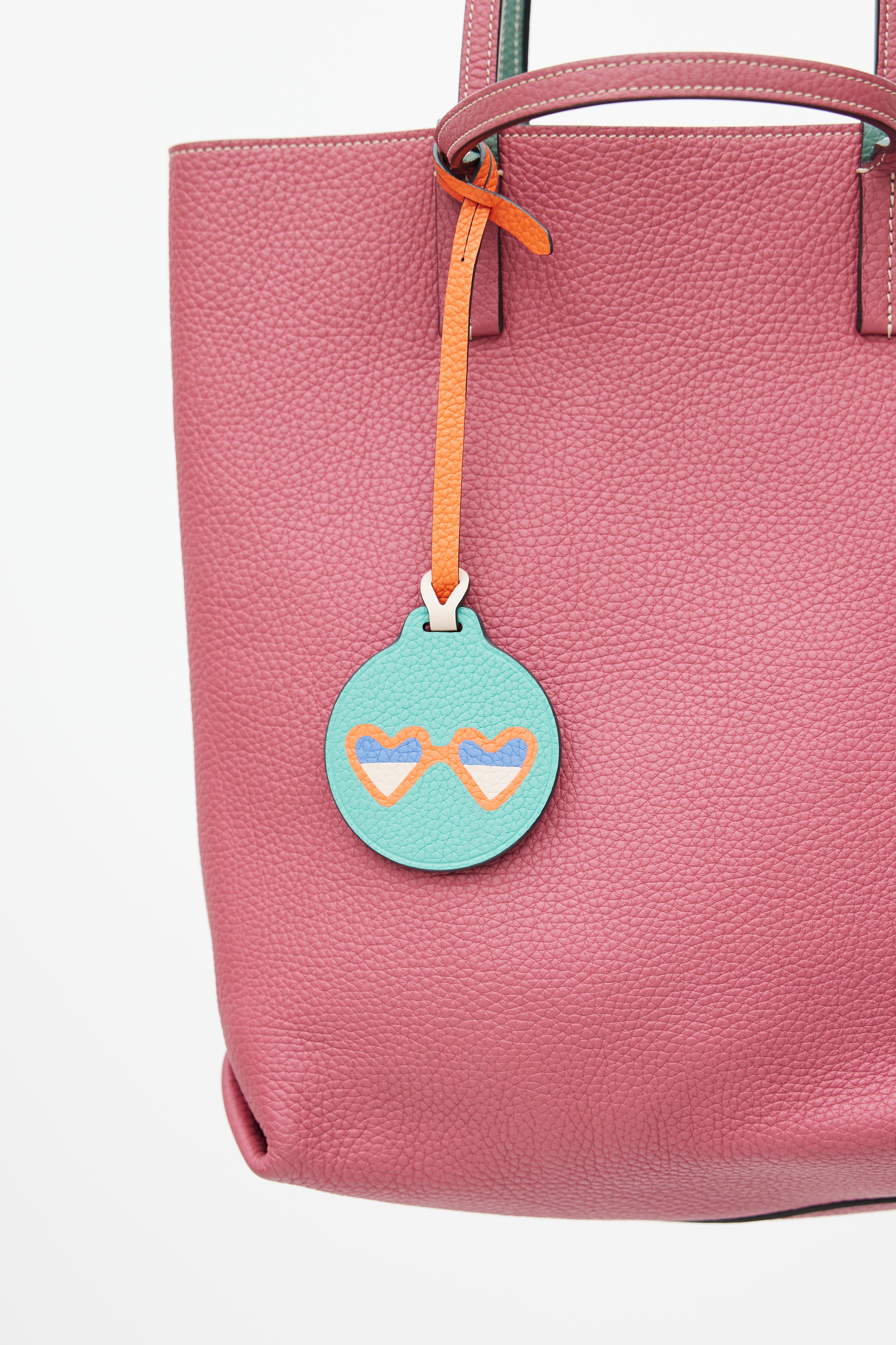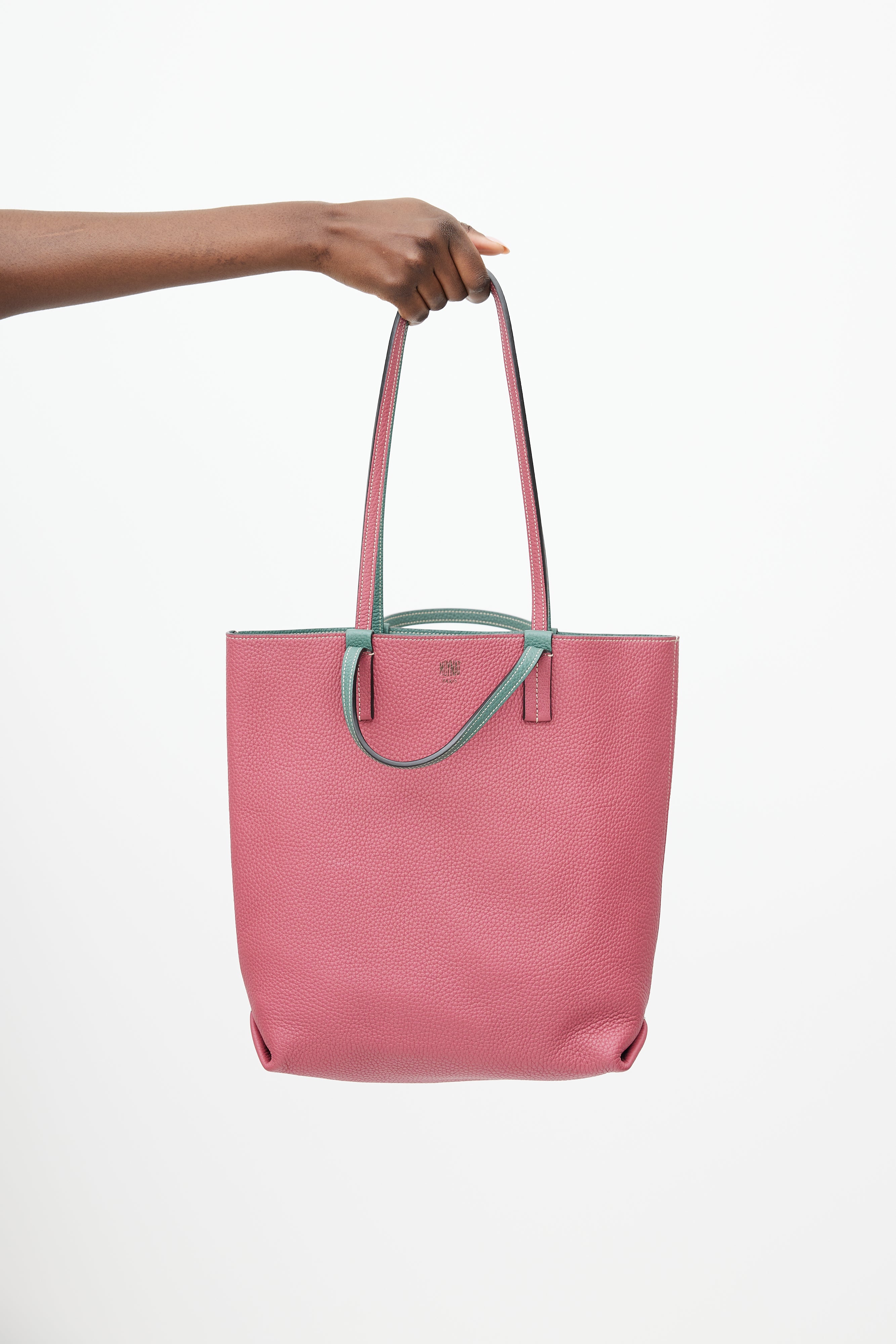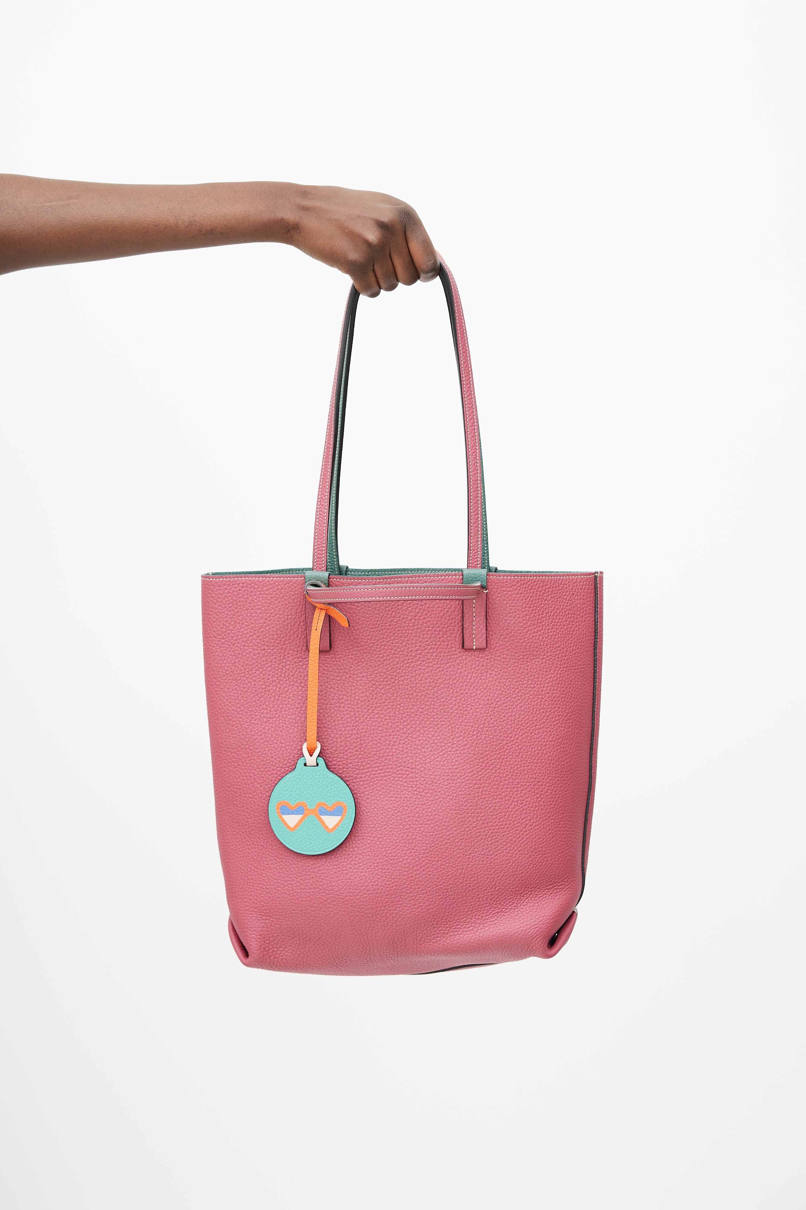 Pre-owned Moynat green and pink reversible leather tote featuring two top handles, printed logo at front, two shoulder straps, and removable face keychain.