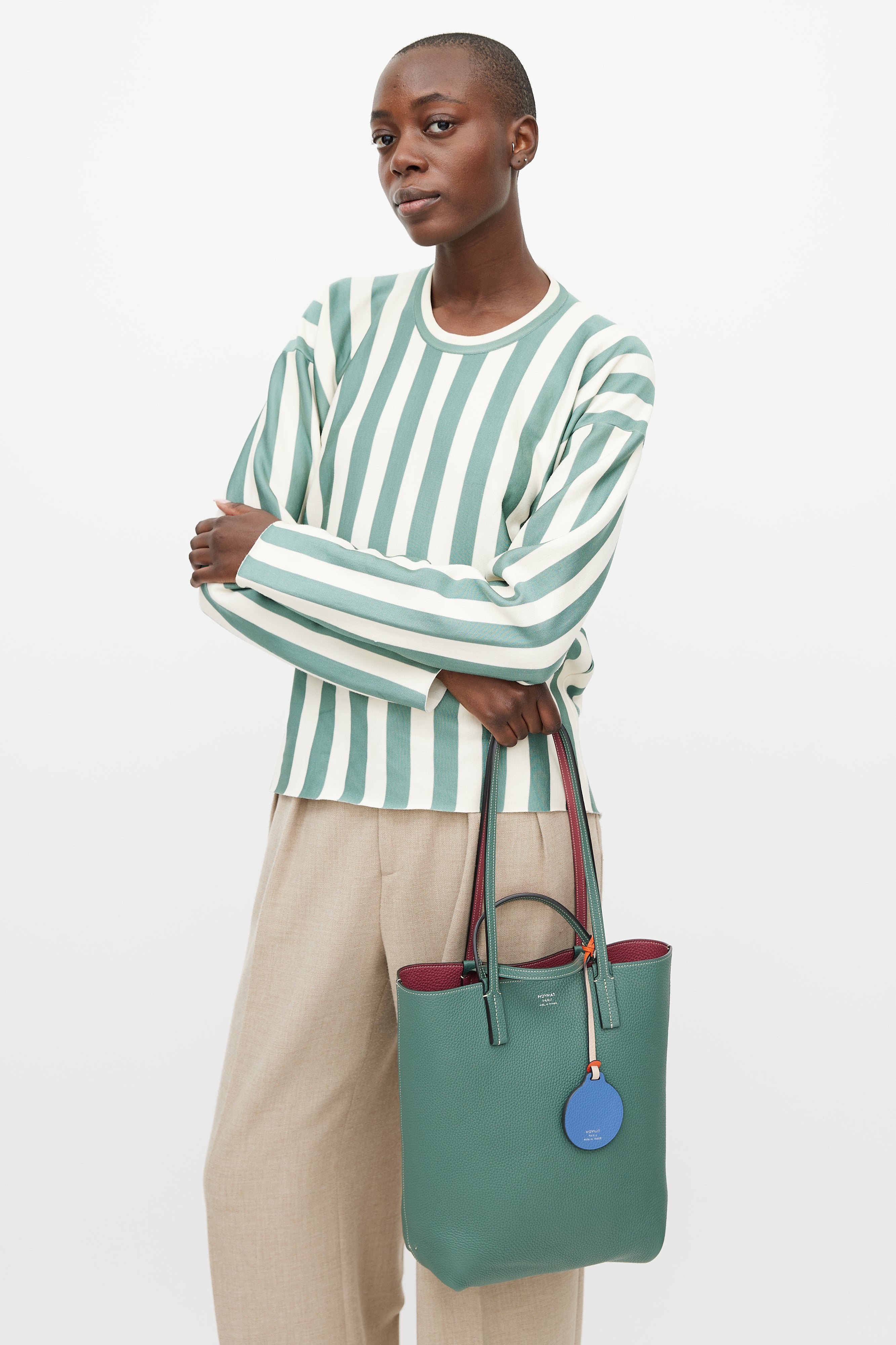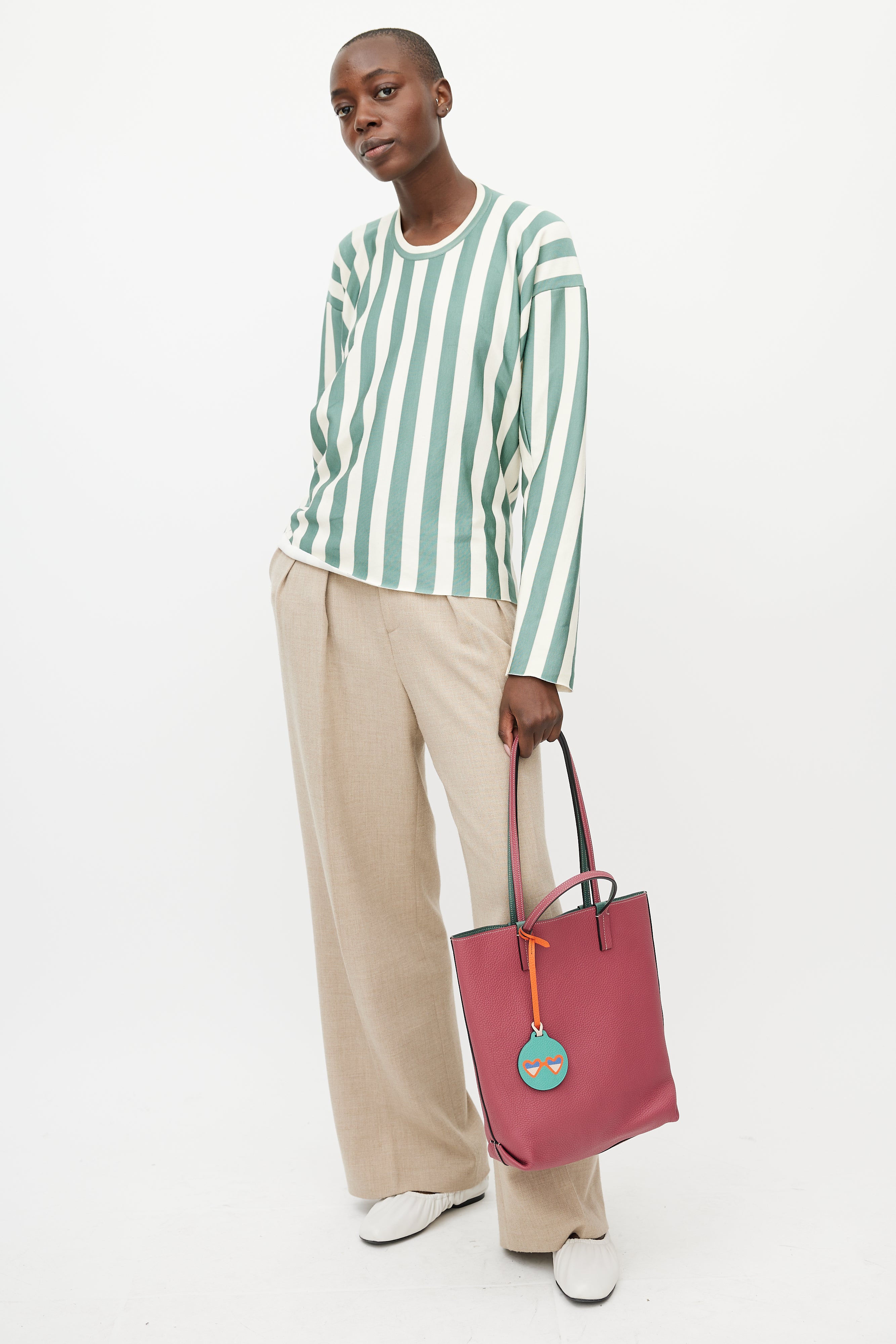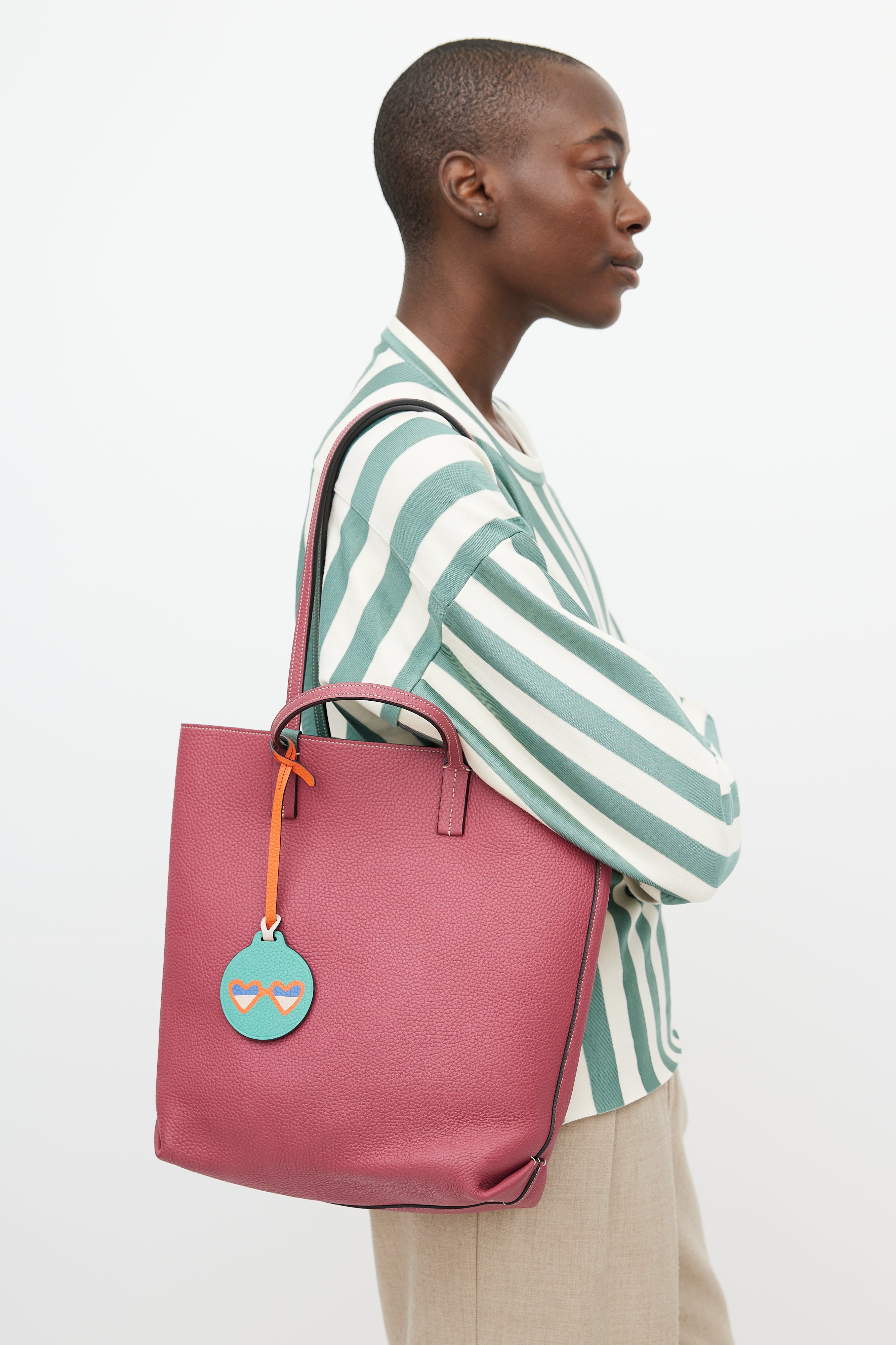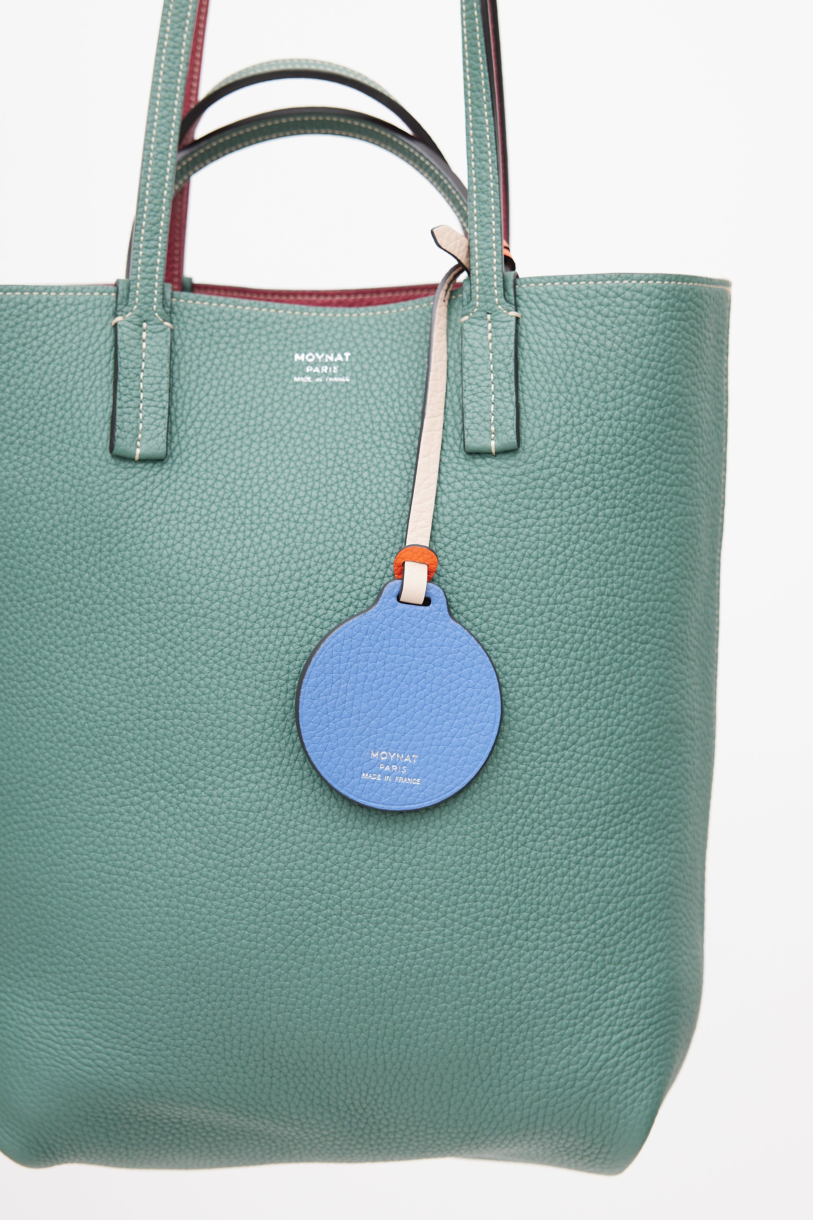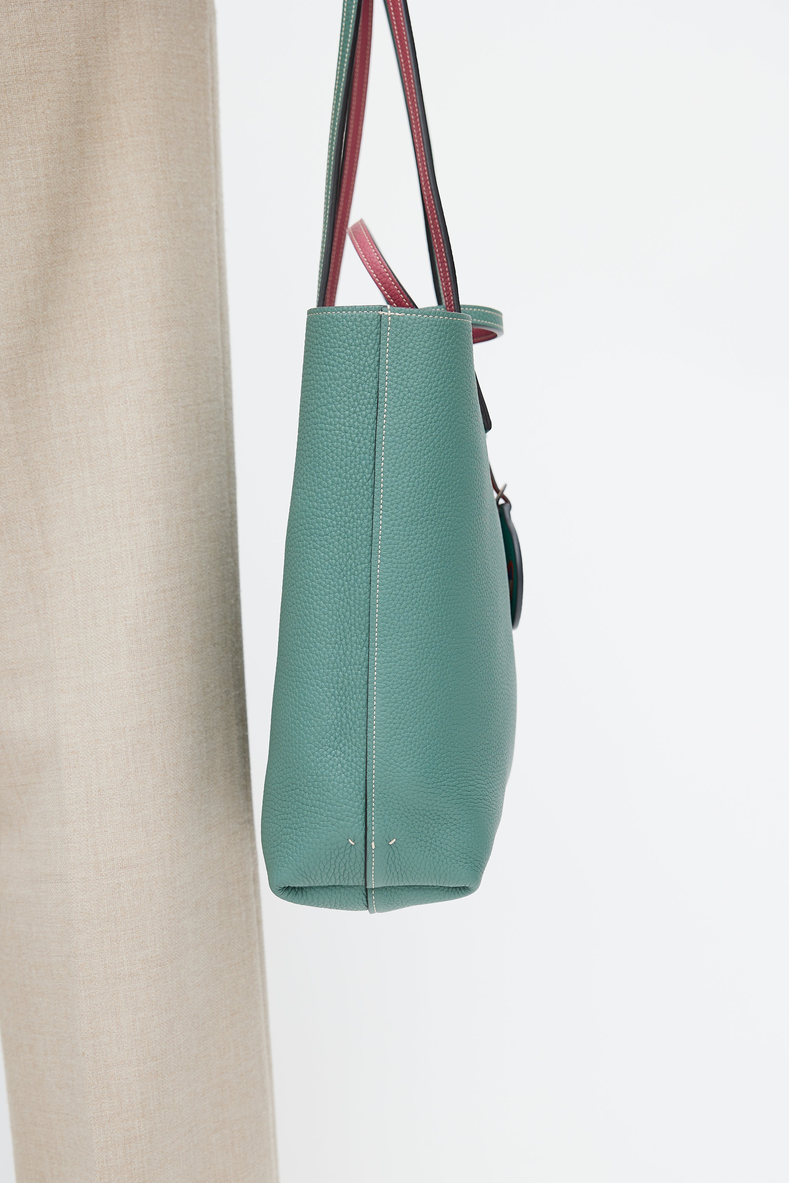 Pre-owned Moynat green and pink reversible leather tote featuring two top handles, printed logo at front, two shoulder straps, and removable face keychain.
