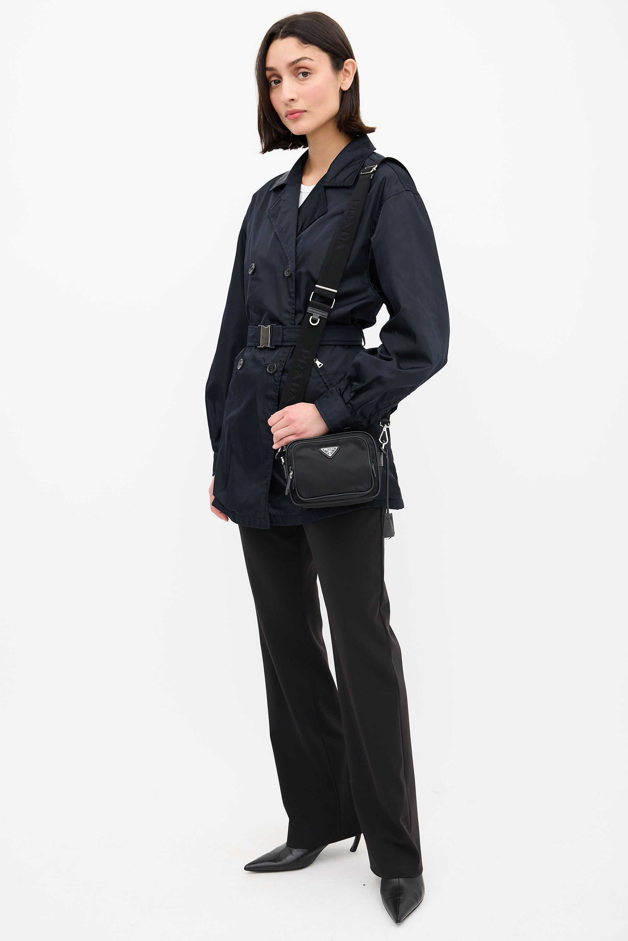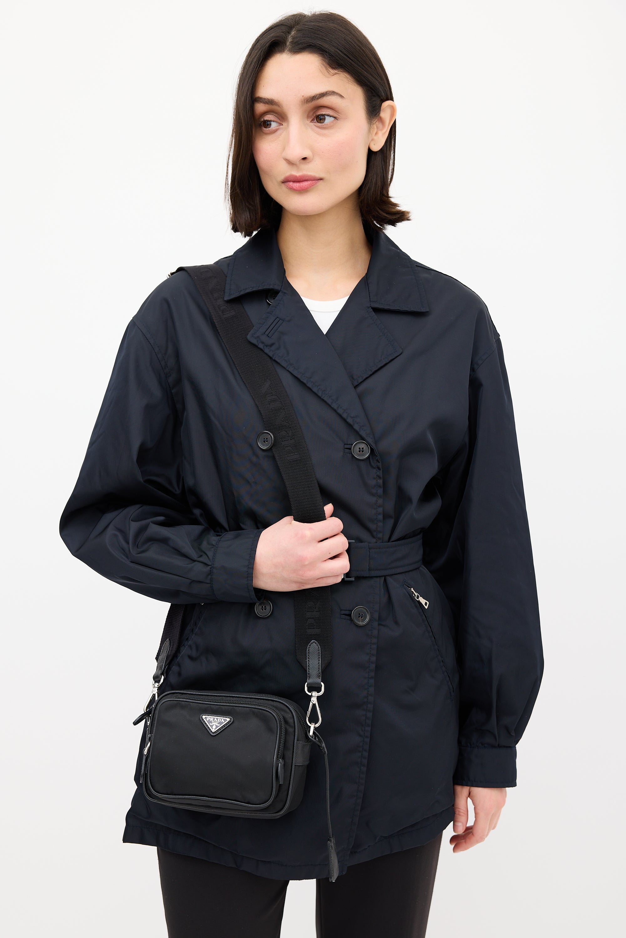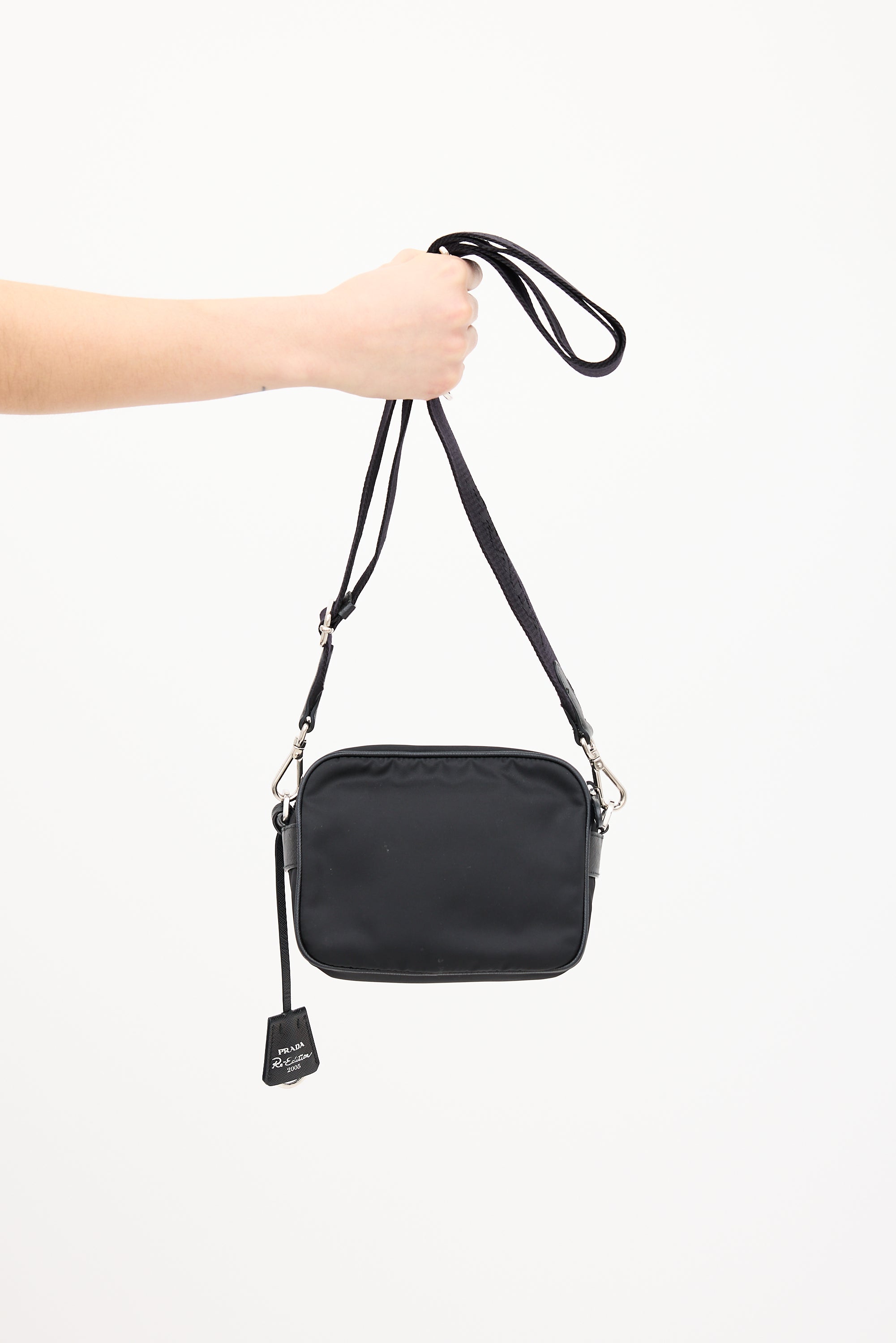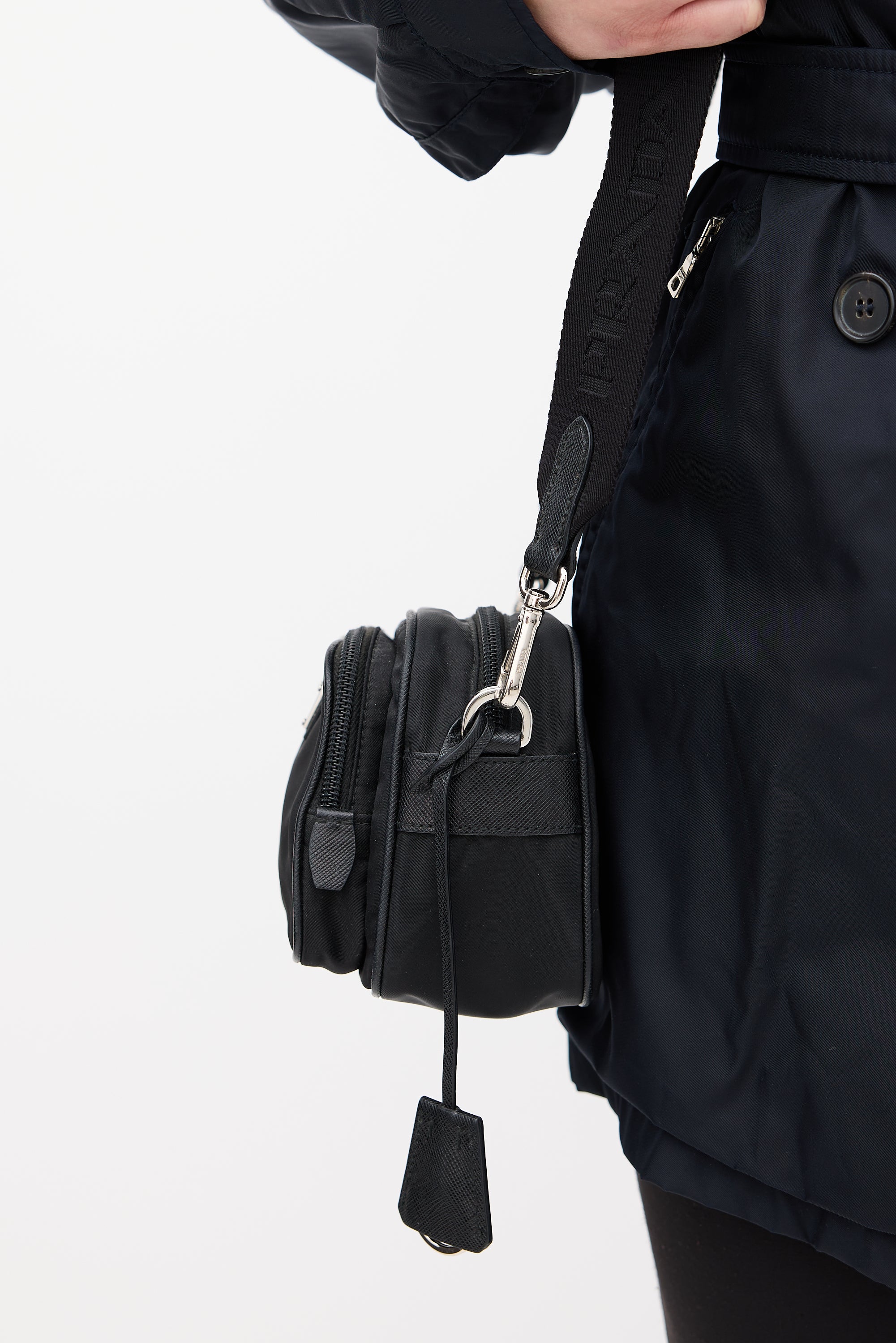 Pre-owned Prada black Re-Nylon belt bag featuring silver tone hardware, signature black enamelled triangle logo plaque at front, detachable and adjustable webbed logo strap, removable keyring clochette charm, one exterior zip pocket, top zip closure, and one lined main compartment with one slip pocket. Comes with original dust bag, care guide, and certificate of authenticity card.