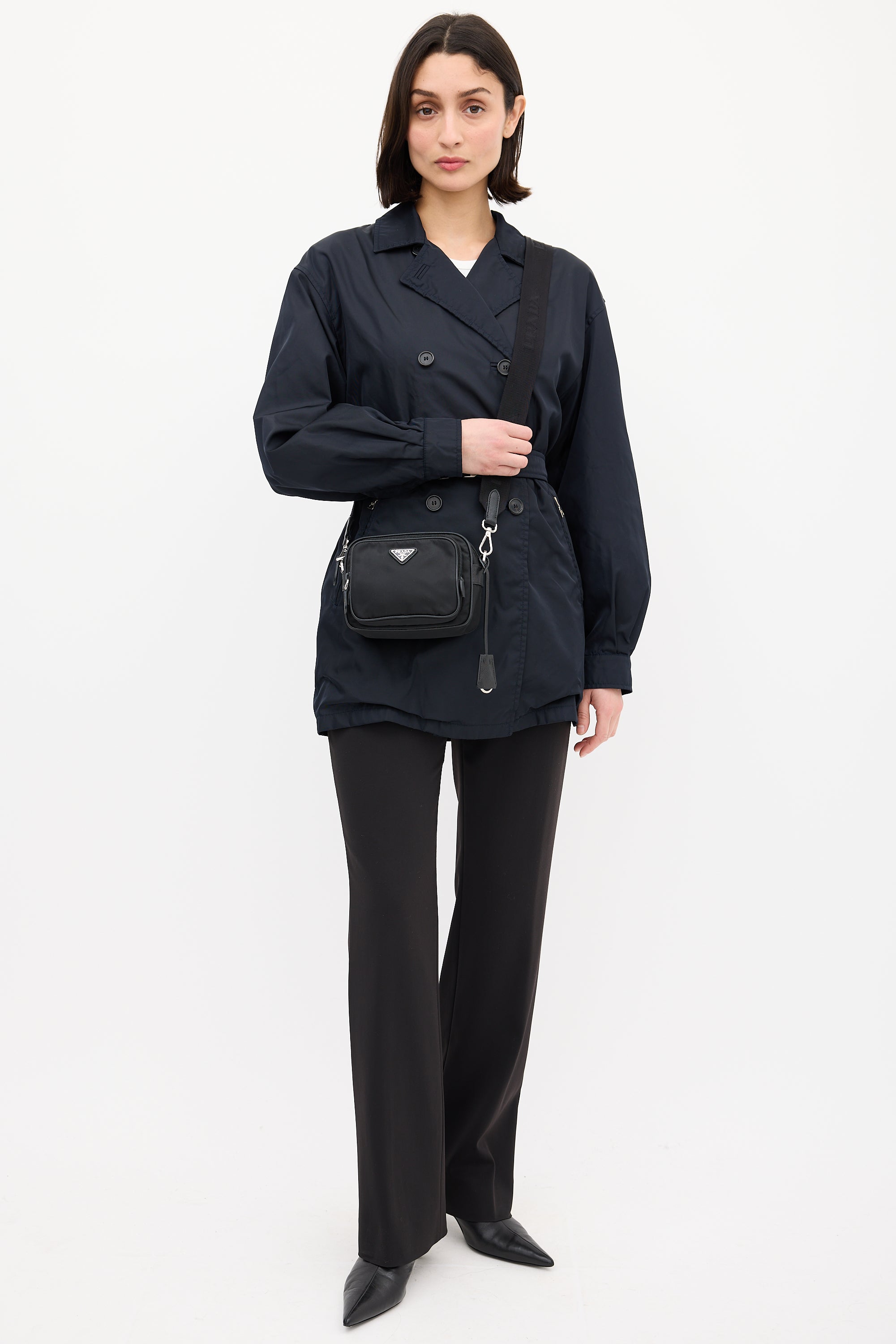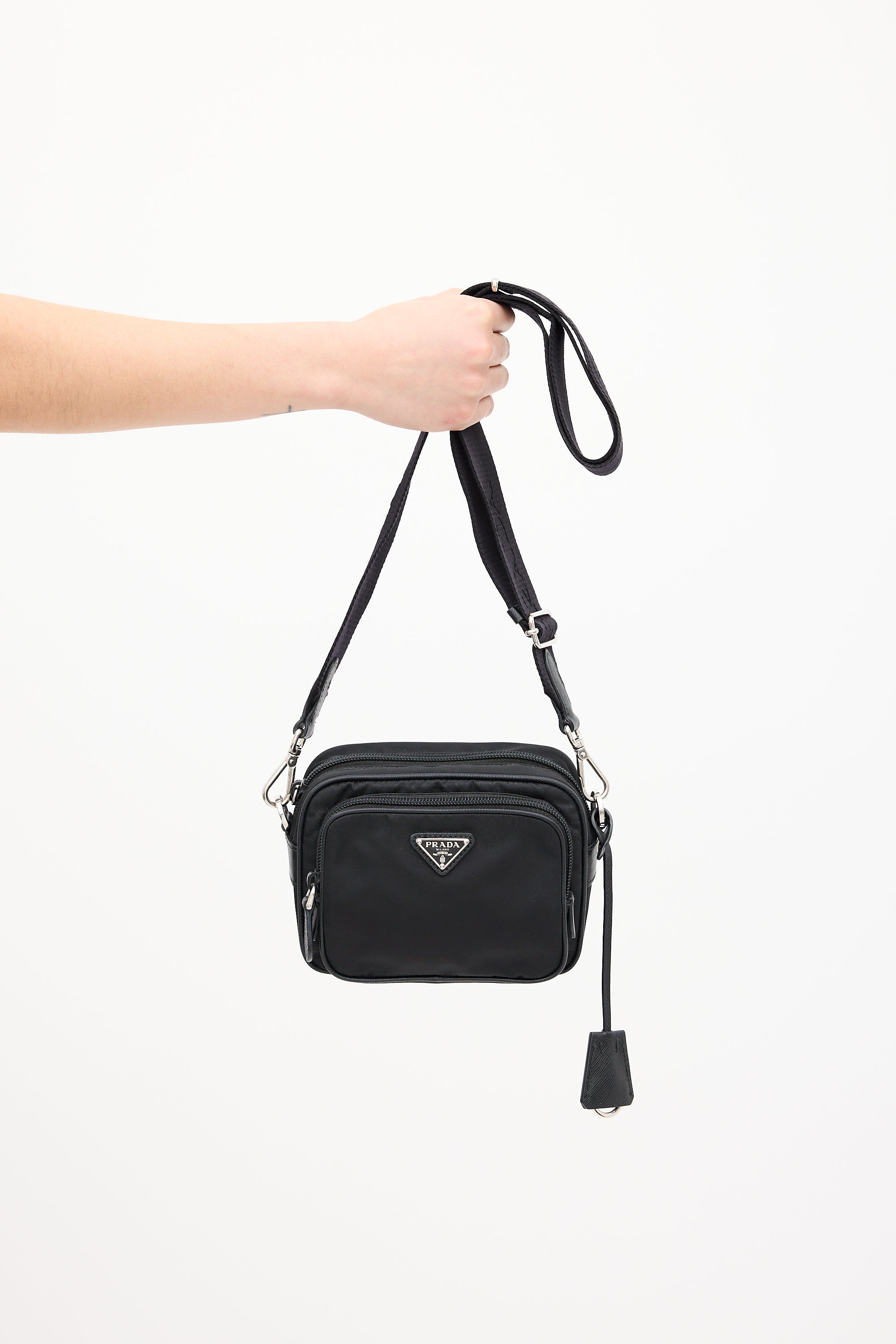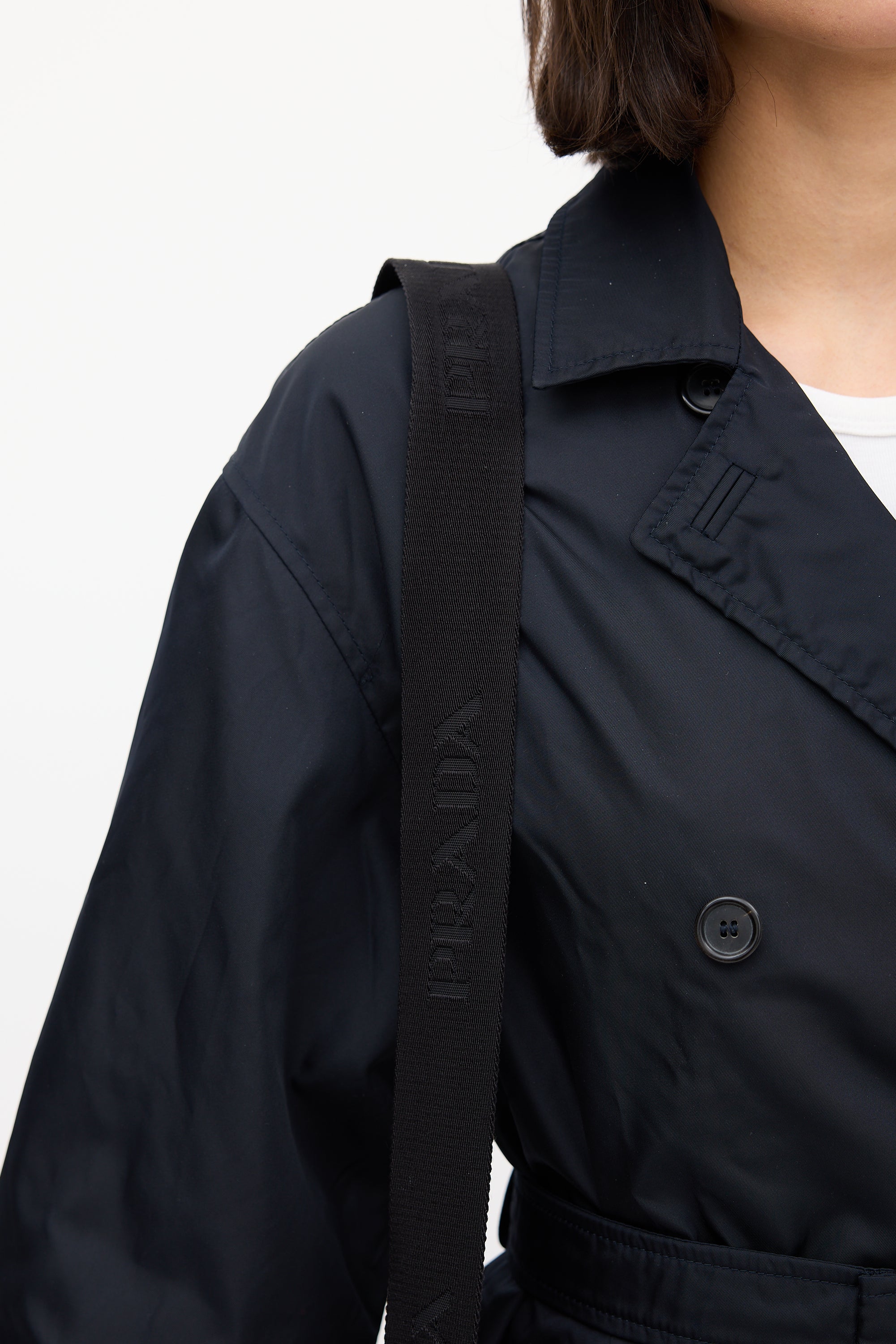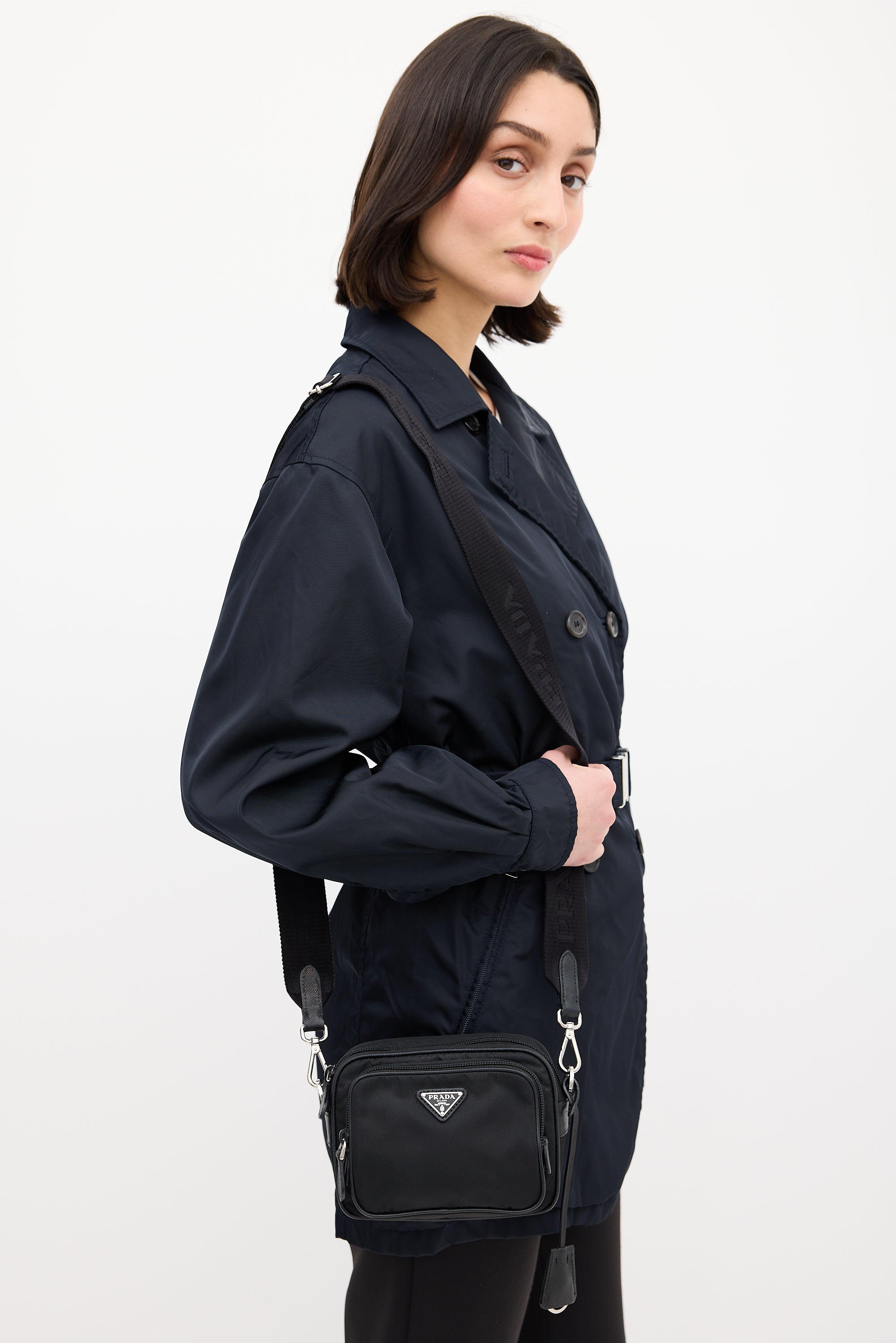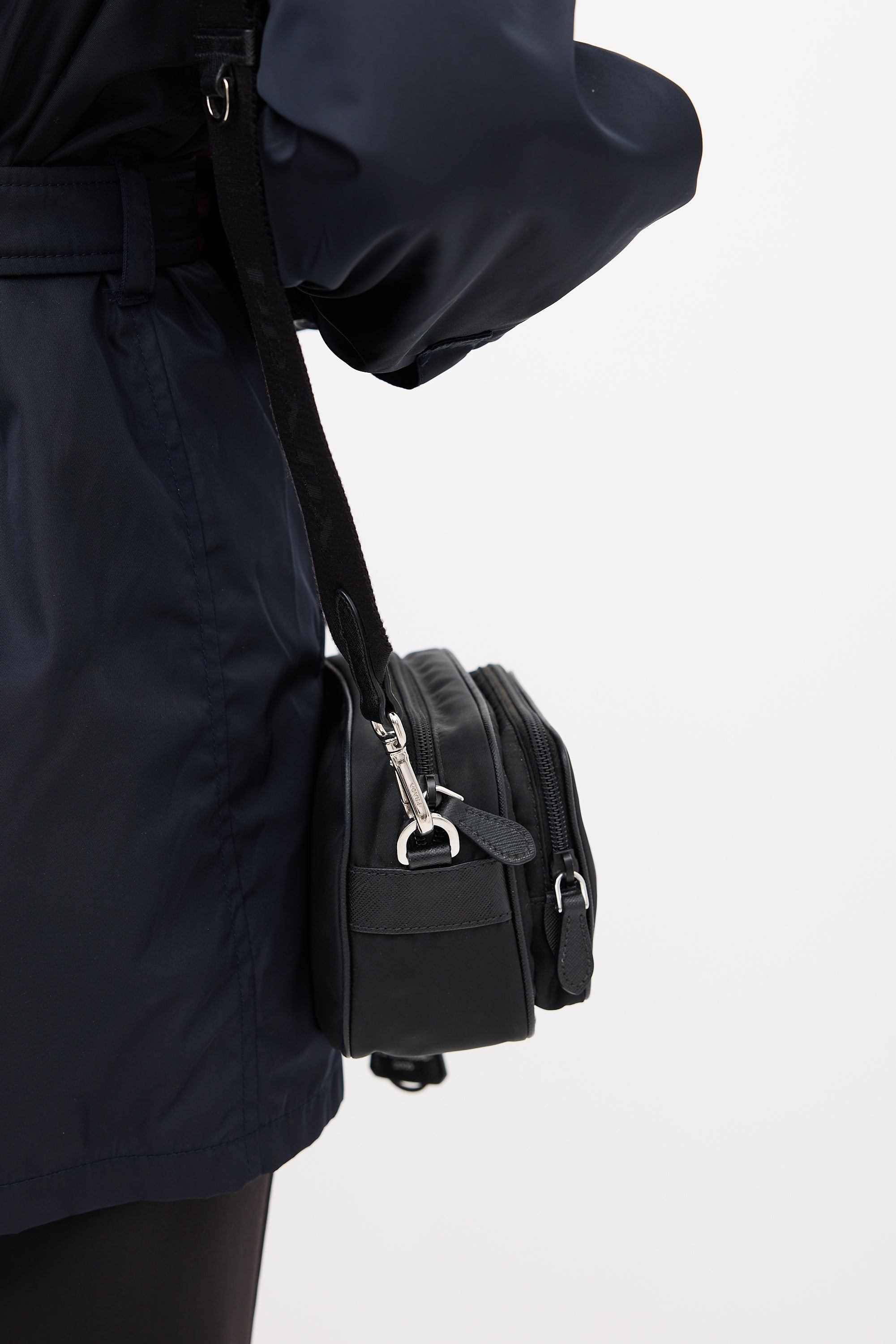 Pre-owned Prada black Re-Nylon belt bag featuring silver tone hardware, signature black enamelled triangle logo plaque at front, detachable and adjustable webbed logo strap, removable keyring clochette charm, one exterior zip pocket, top zip closure, and one lined main compartment with one slip pocket. Comes with original dust bag, care guide, and certificate of authenticity card.