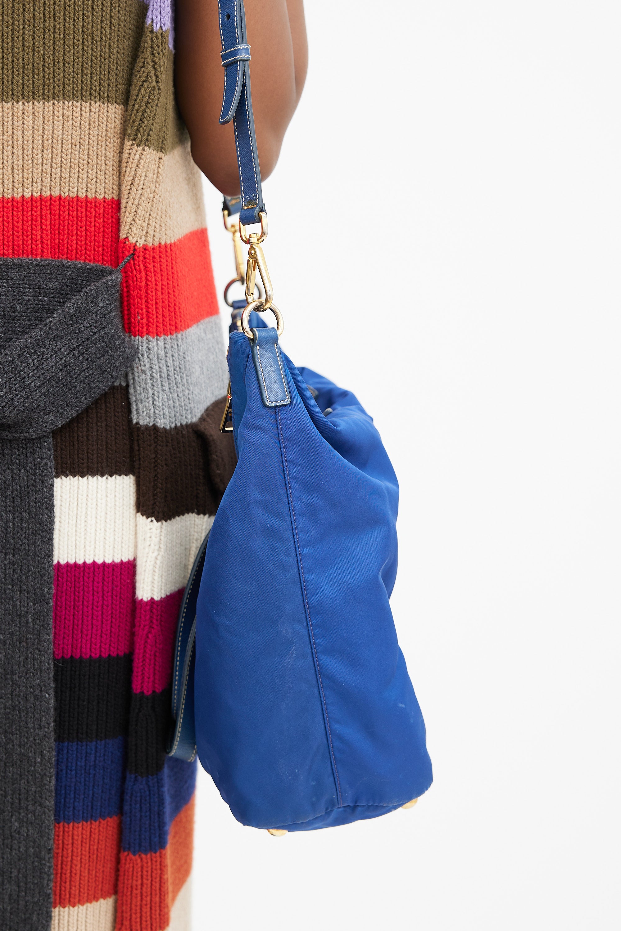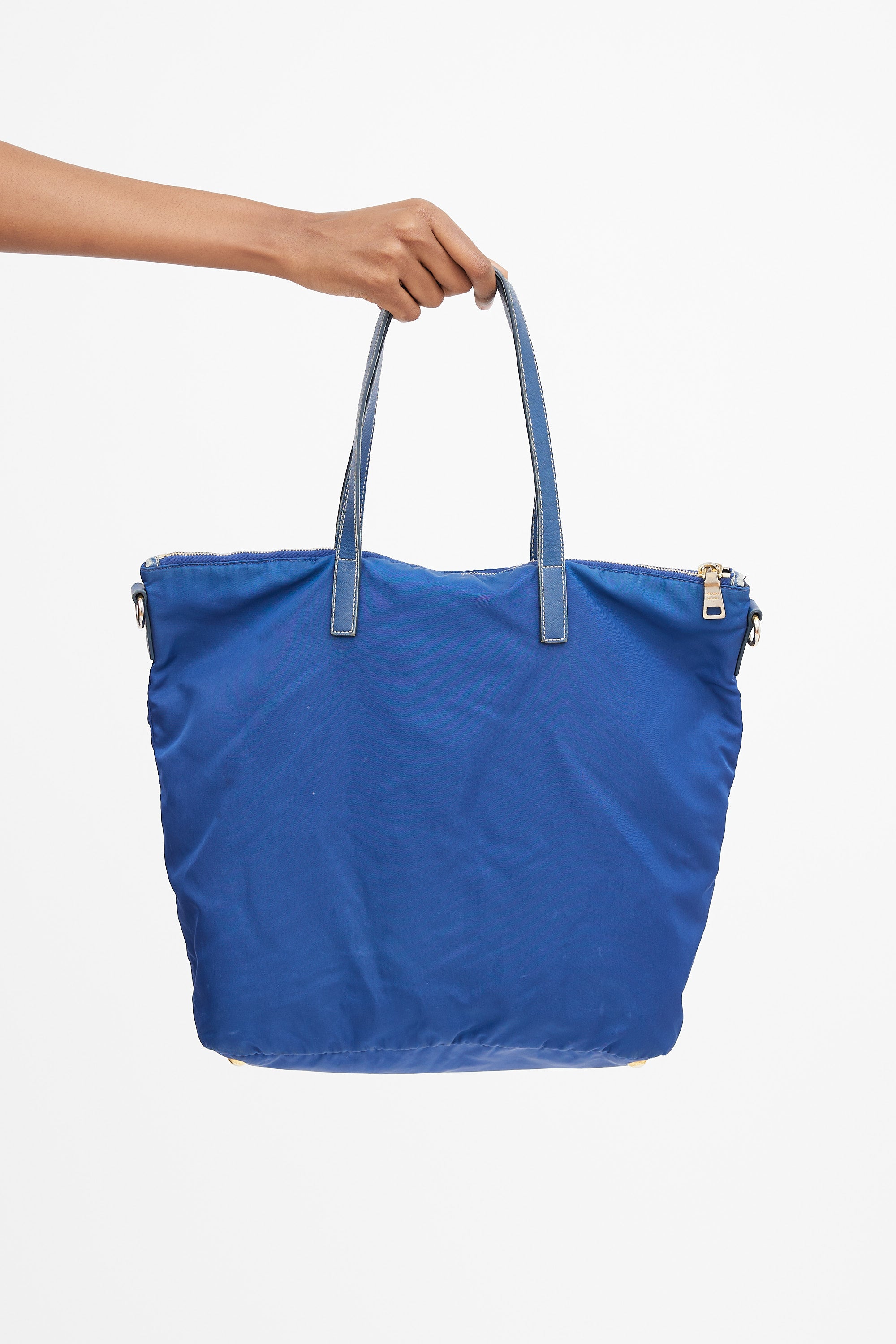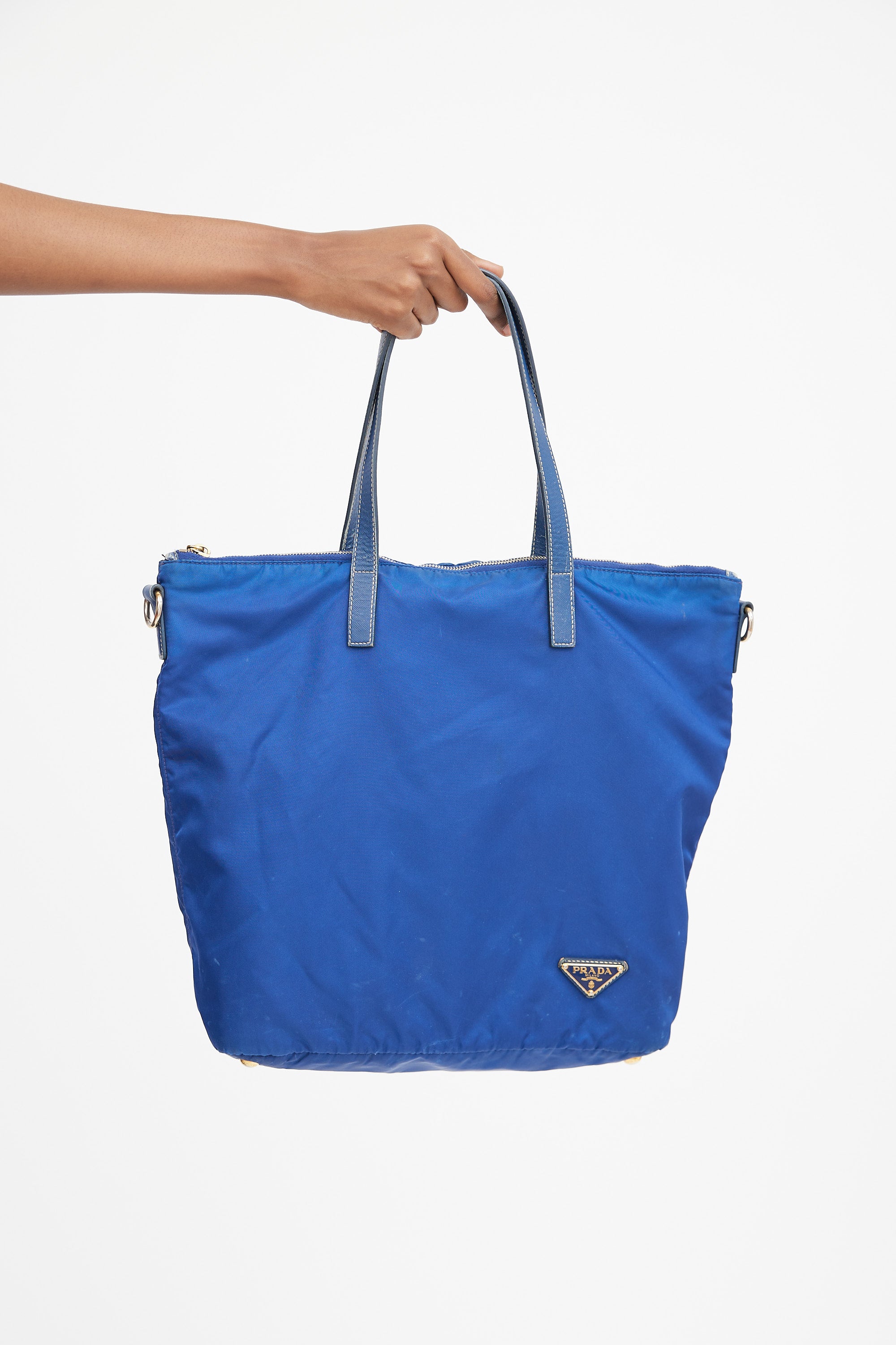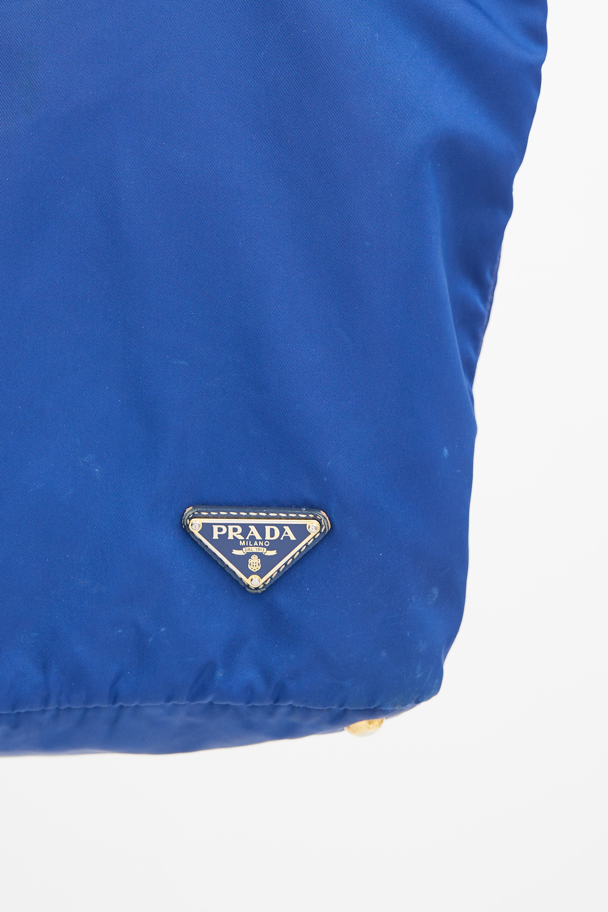 Pre-owned Prada blue tote bag featuring a nylon body, gold tone hardware, four protective feet at base, signature triangle logo plaque at front corner, dual flat handles with white contrast stitching, detachable and adjustable shoulder strap, top zip closure, and one lined main compartment with single zip pocket.