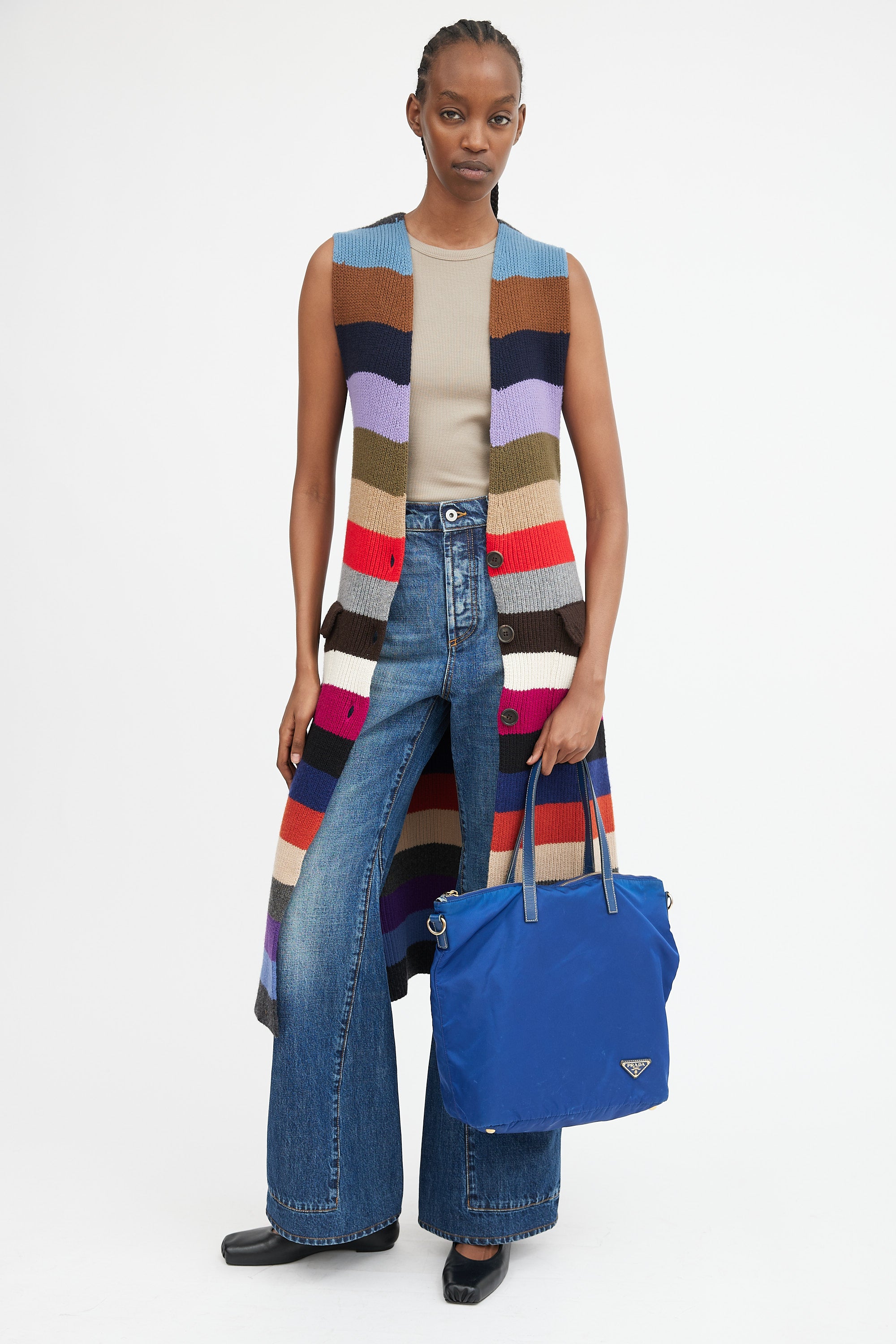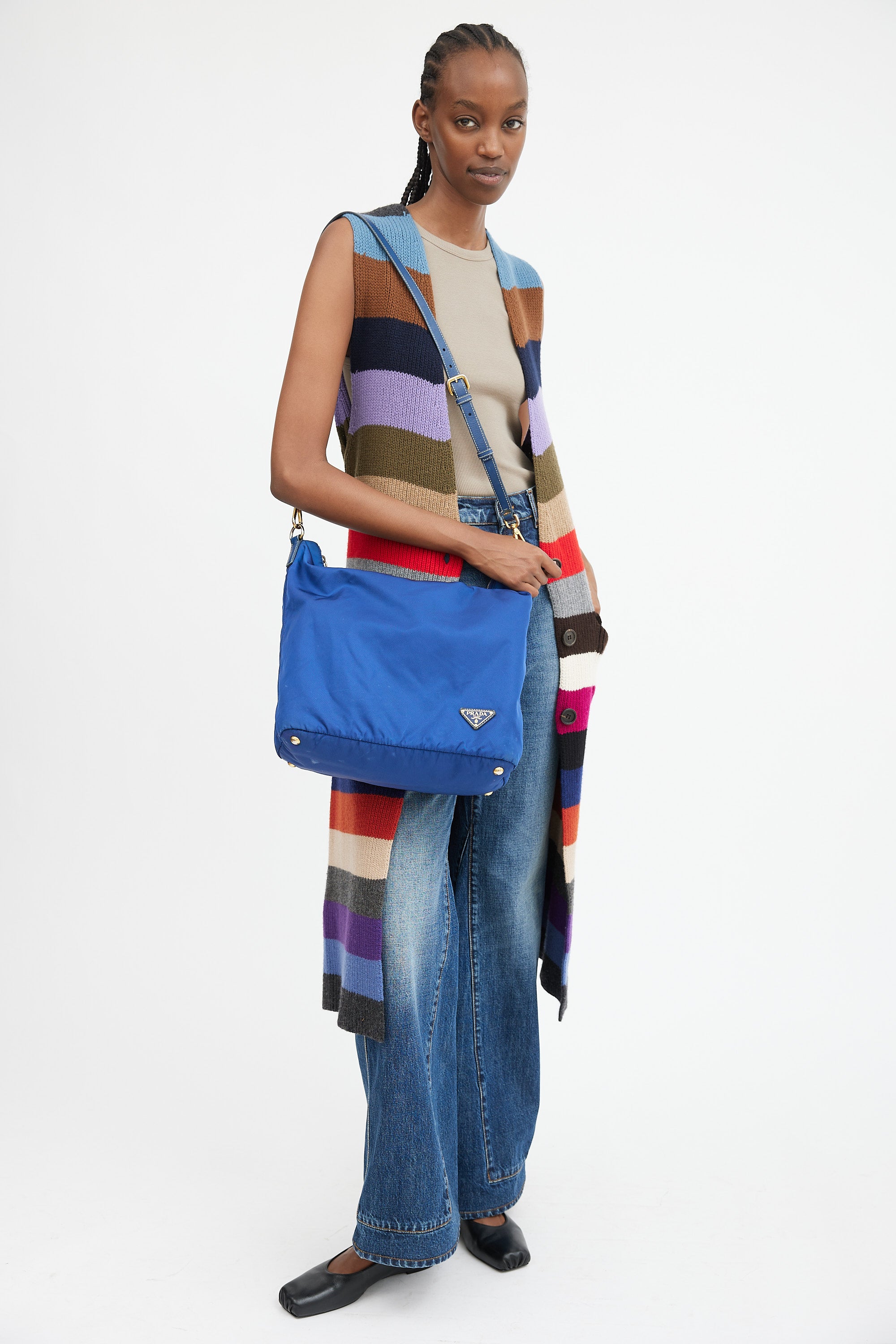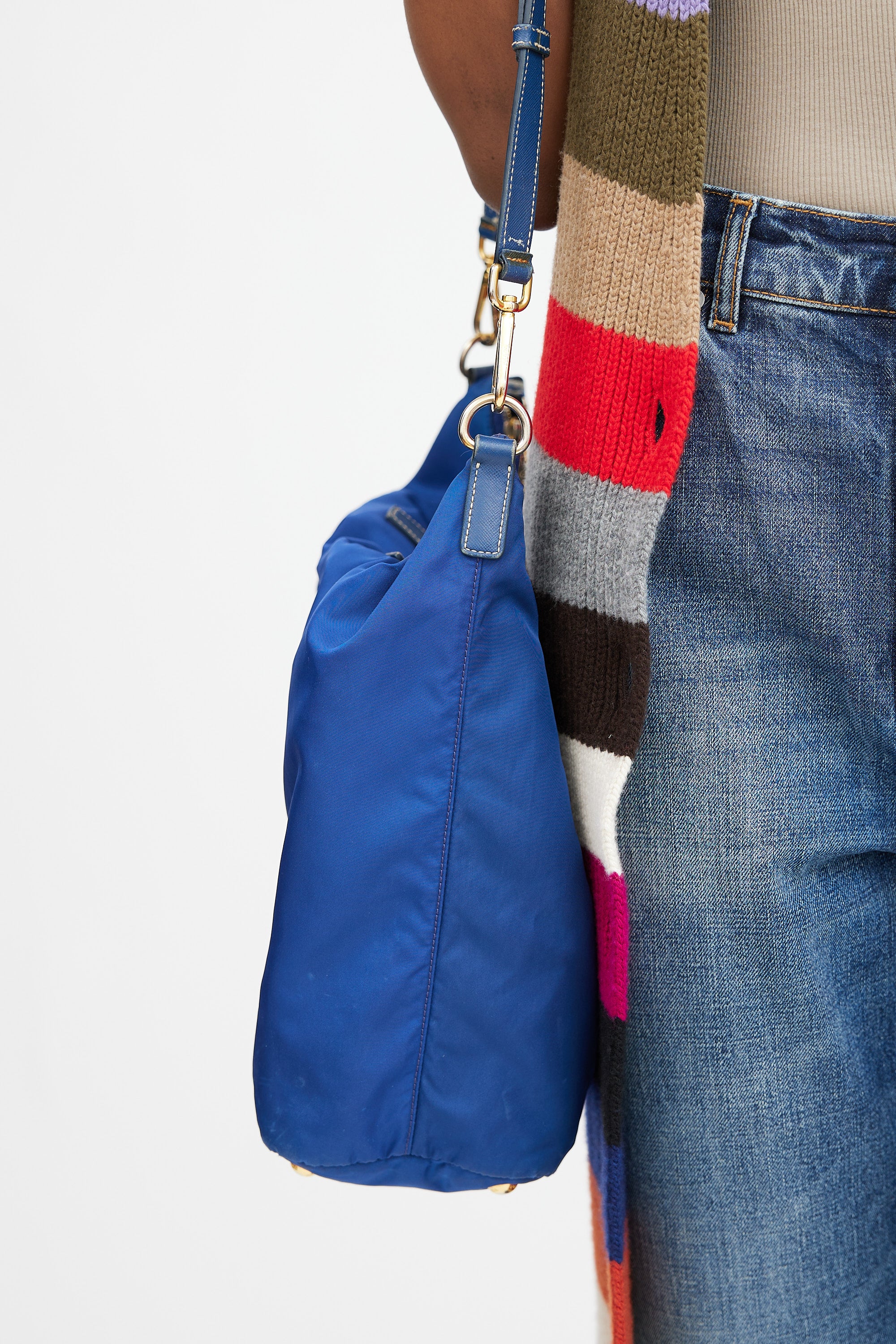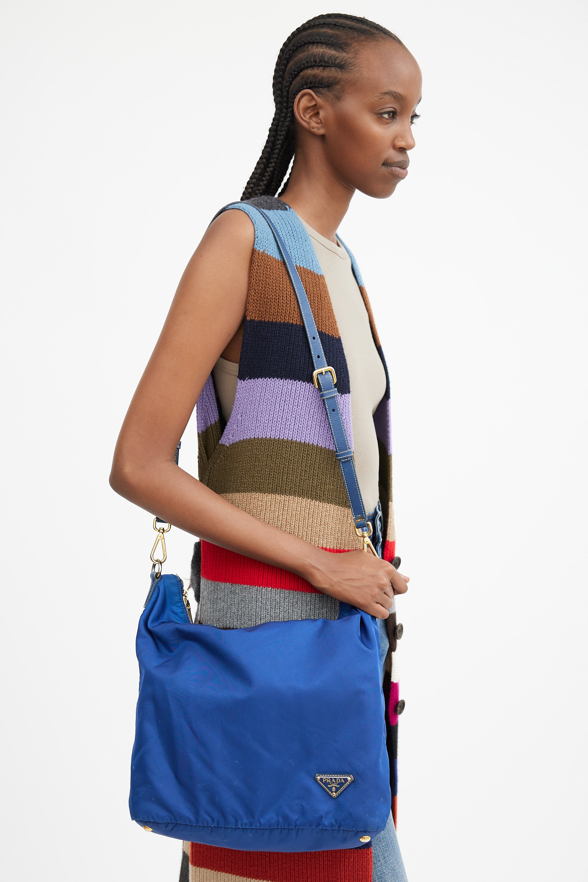 Pre-owned Prada blue tote bag featuring a nylon body, gold tone hardware, four protective feet at base, signature triangle logo plaque at front corner, dual flat handles with white contrast stitching, detachable and adjustable shoulder strap, top zip closure, and one lined main compartment with single zip pocket.