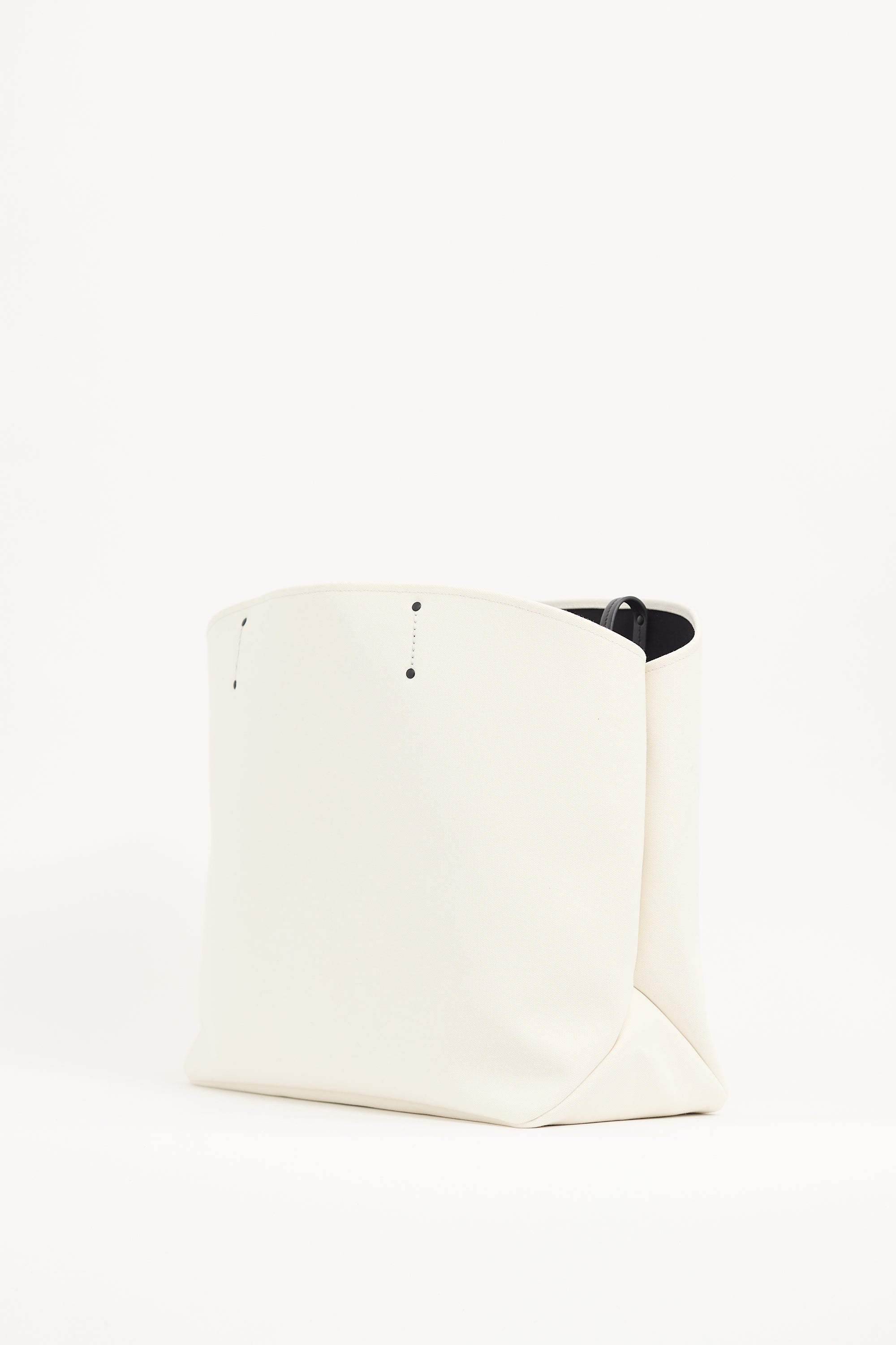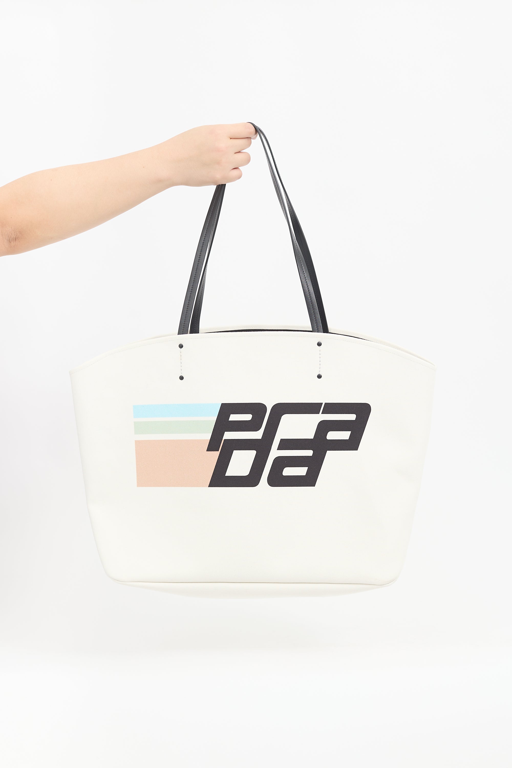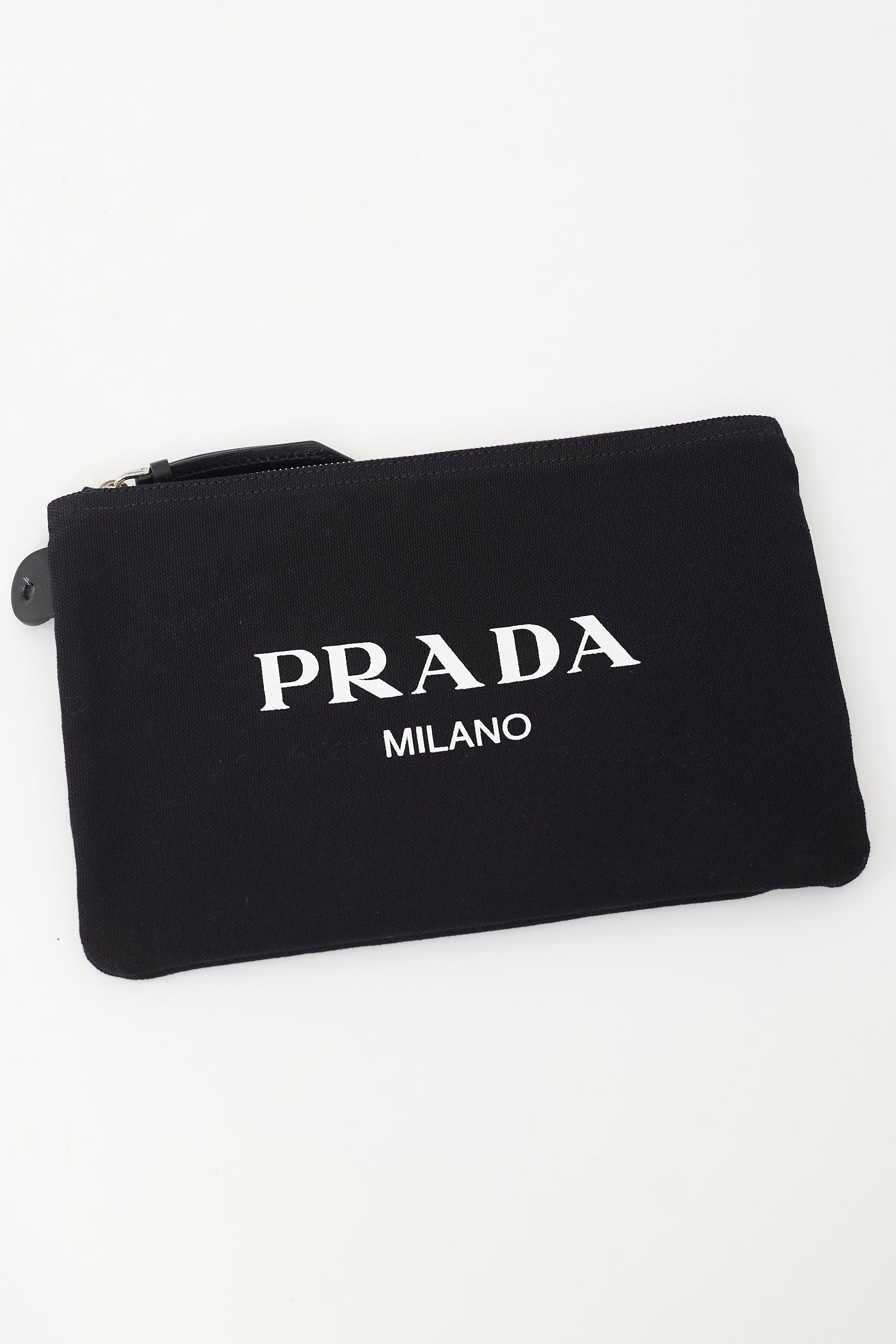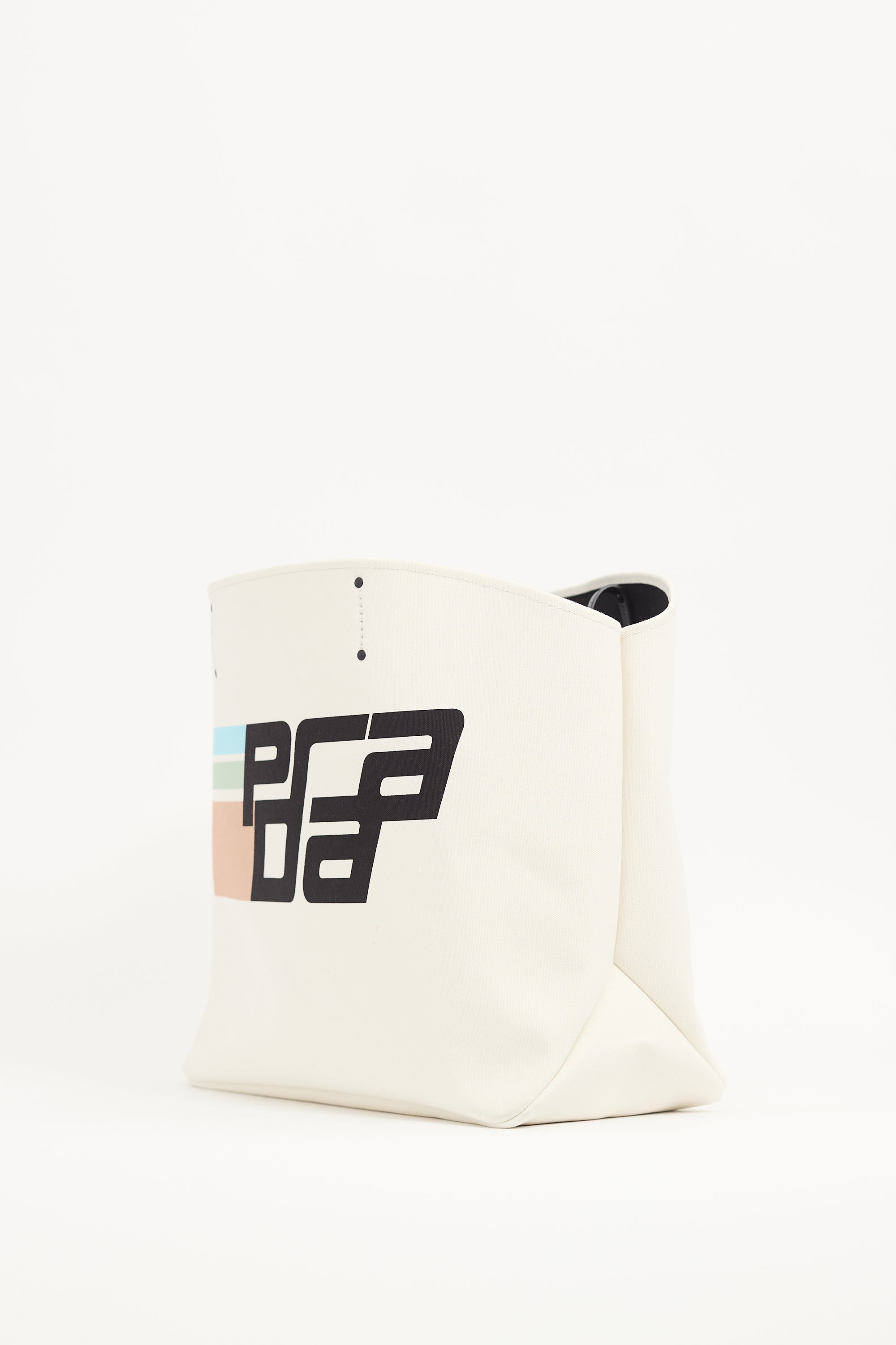 Pre-owned Prada white canvas Canapa Racing tote bag featuring black leather top handles, logo at front, open main compartment, key leash, and one zip pouch. Comes with original dust bag and brand authentication card.