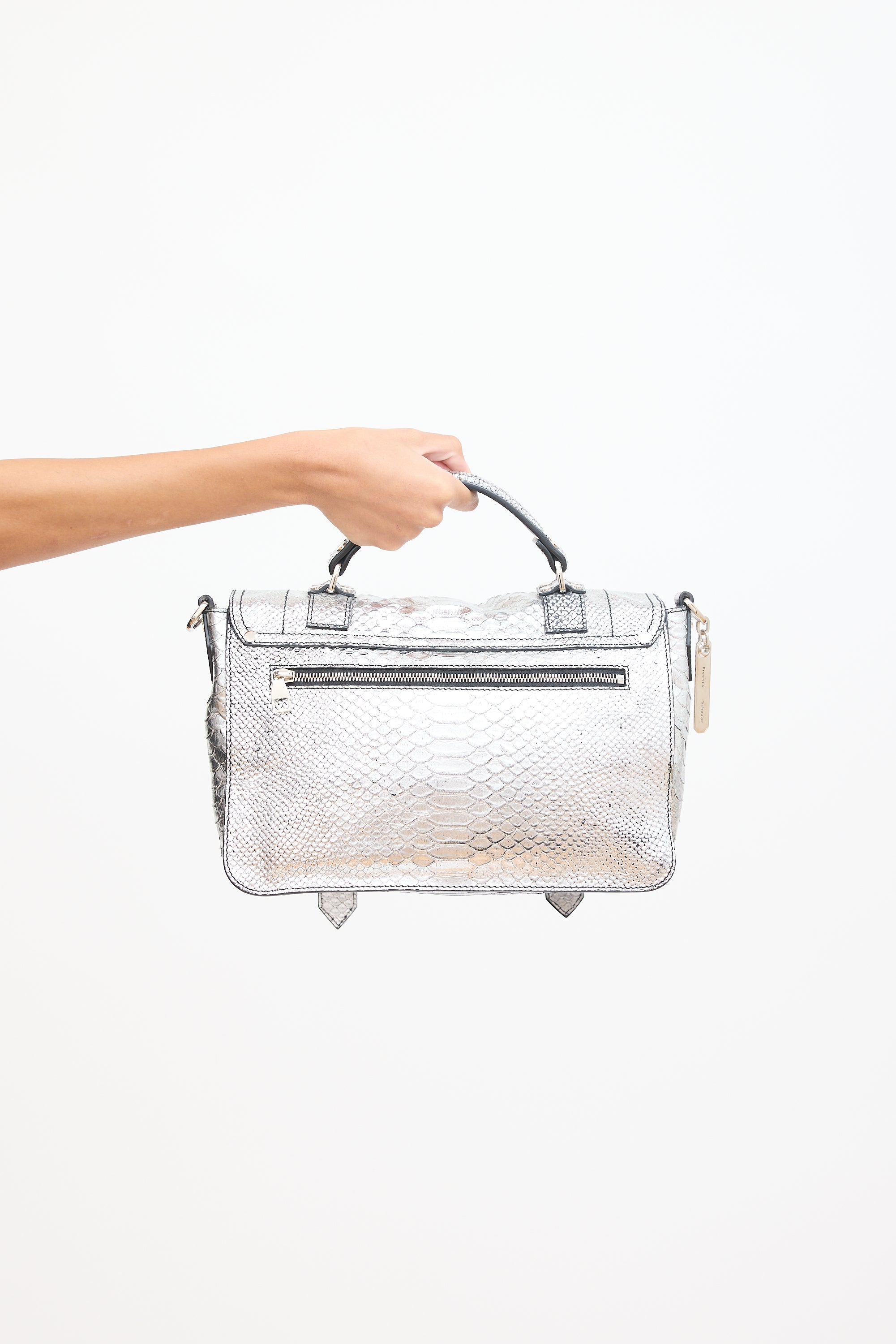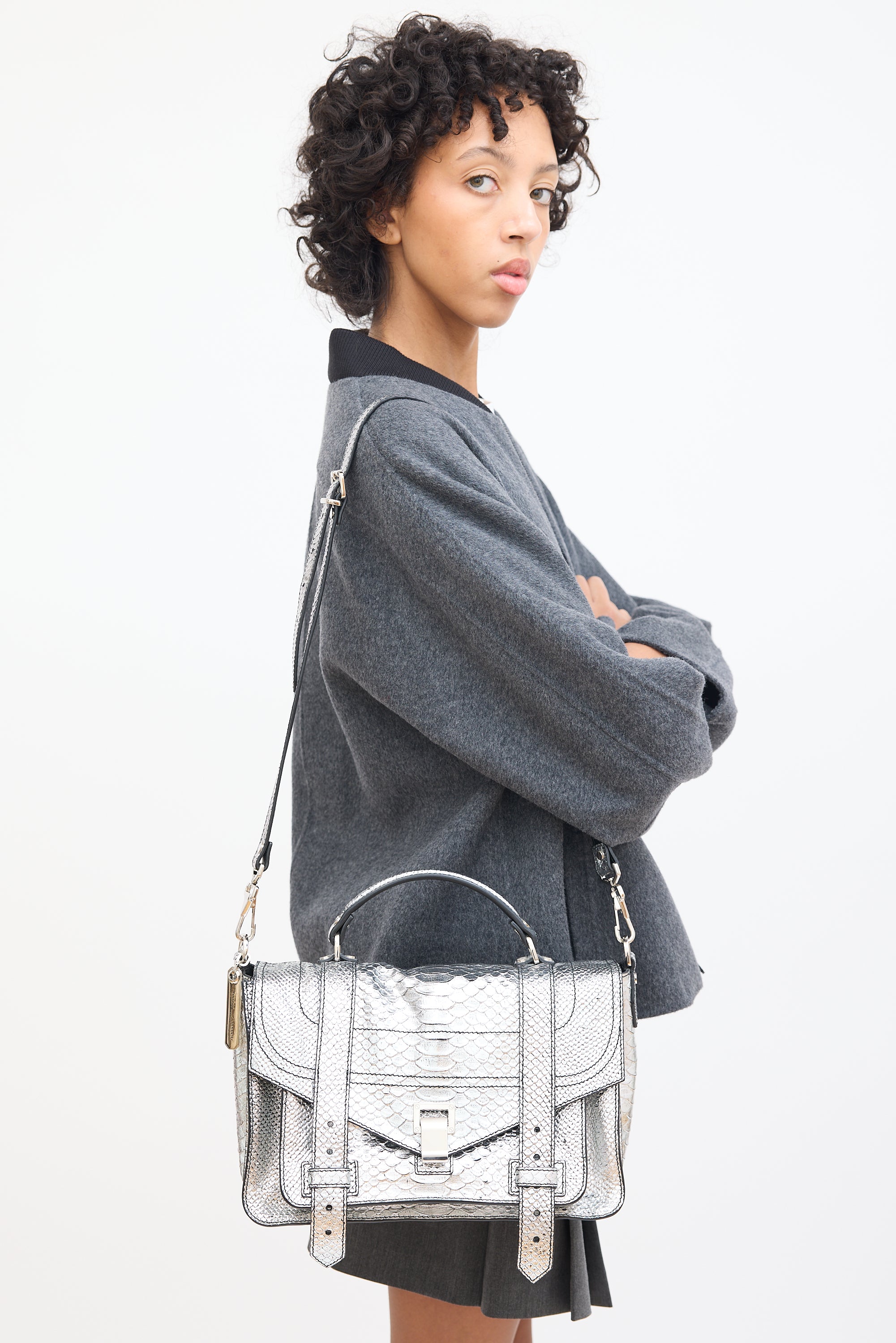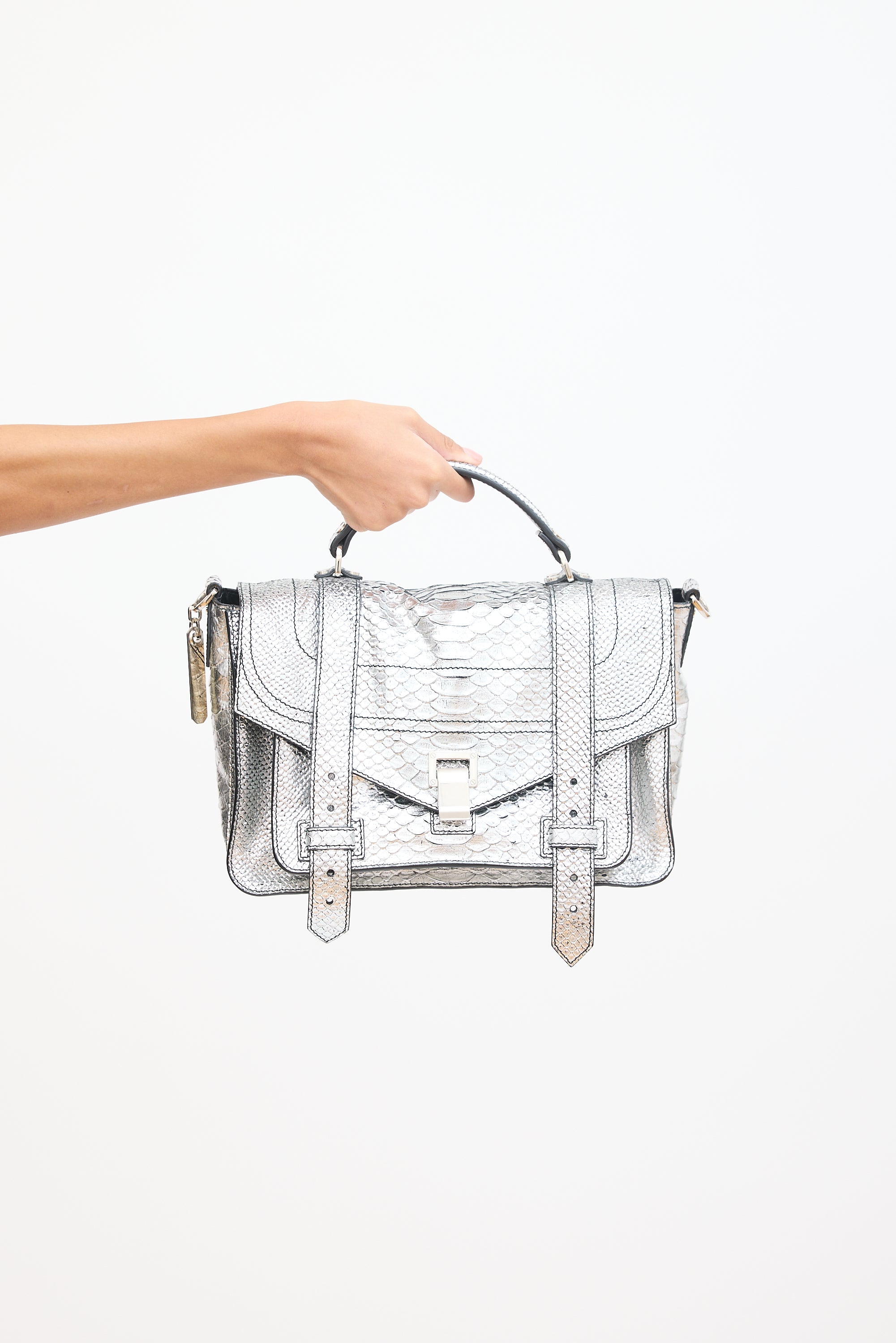 Pre-owned Proenza Schouler silver tone textured leather PS1 satchel bag featuring silver tone hardware, flat top handle, detachable and adjustable shoulder strap, engraved logo plaque at side D-ring, zip pocket at back, front flap with hinge closure and strap fastenings, one zip pocket and two slip pockets under top flap, and one lined main compartment with one zip pocket. Comes with certificate of authenticity card.