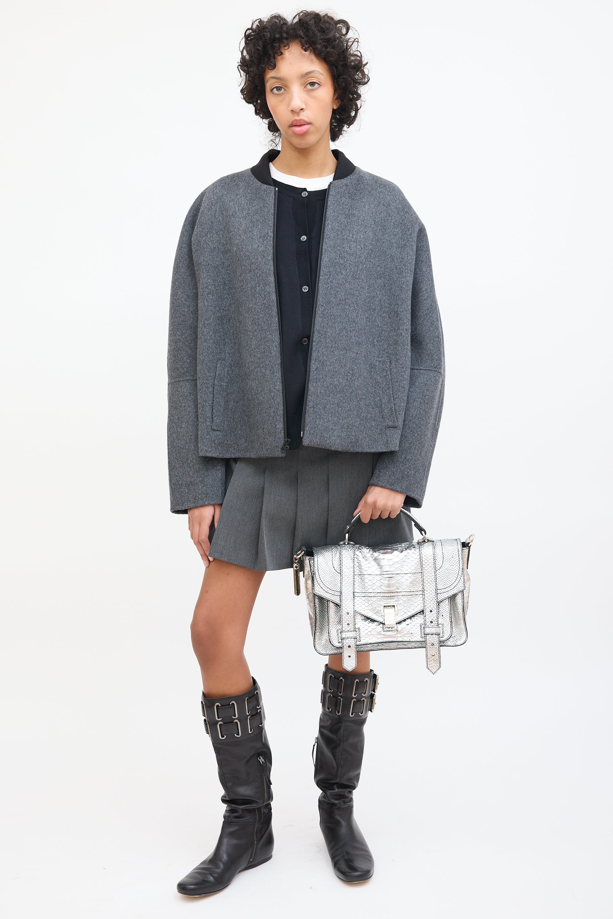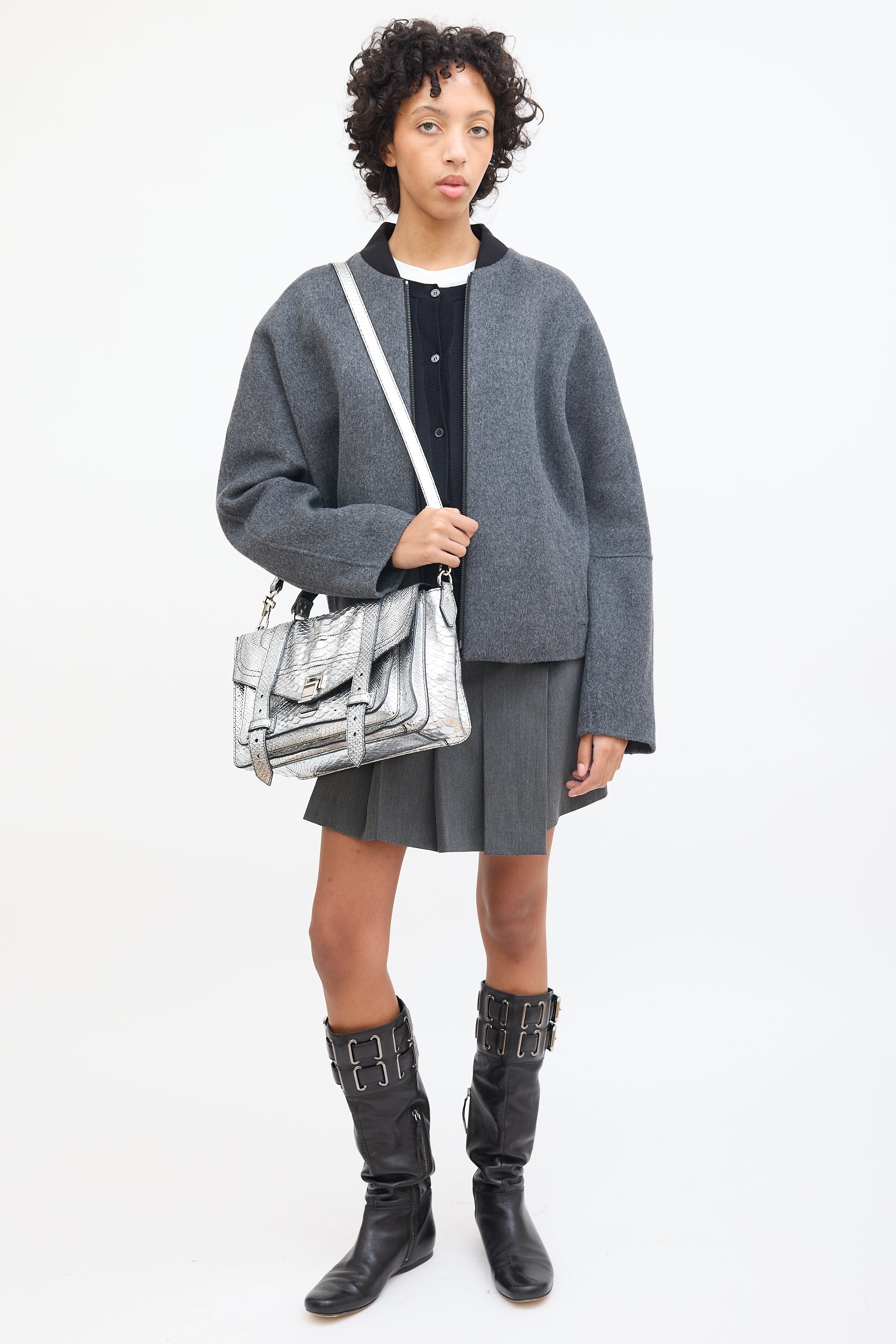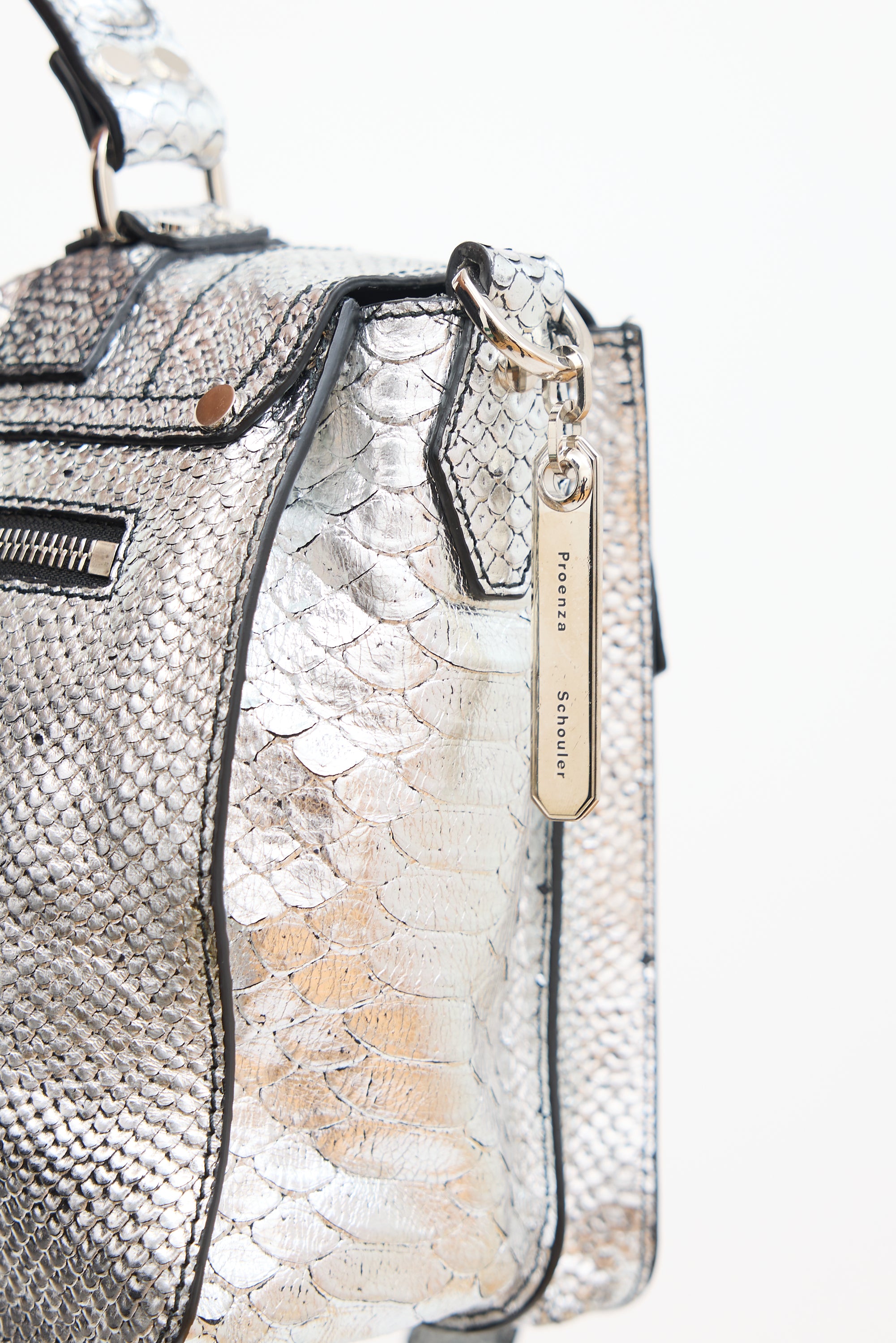Pre-owned Proenza Schouler silver tone textured leather PS1 satchel bag featuring silver tone hardware, flat top handle, detachable and adjustable shoulder strap, engraved logo plaque at side D-ring, zip pocket at back, front flap with hinge closure and strap fastenings, one zip pocket and two slip pockets under top flap, and one lined main compartment with one zip pocket. Comes with certificate of authenticity card.