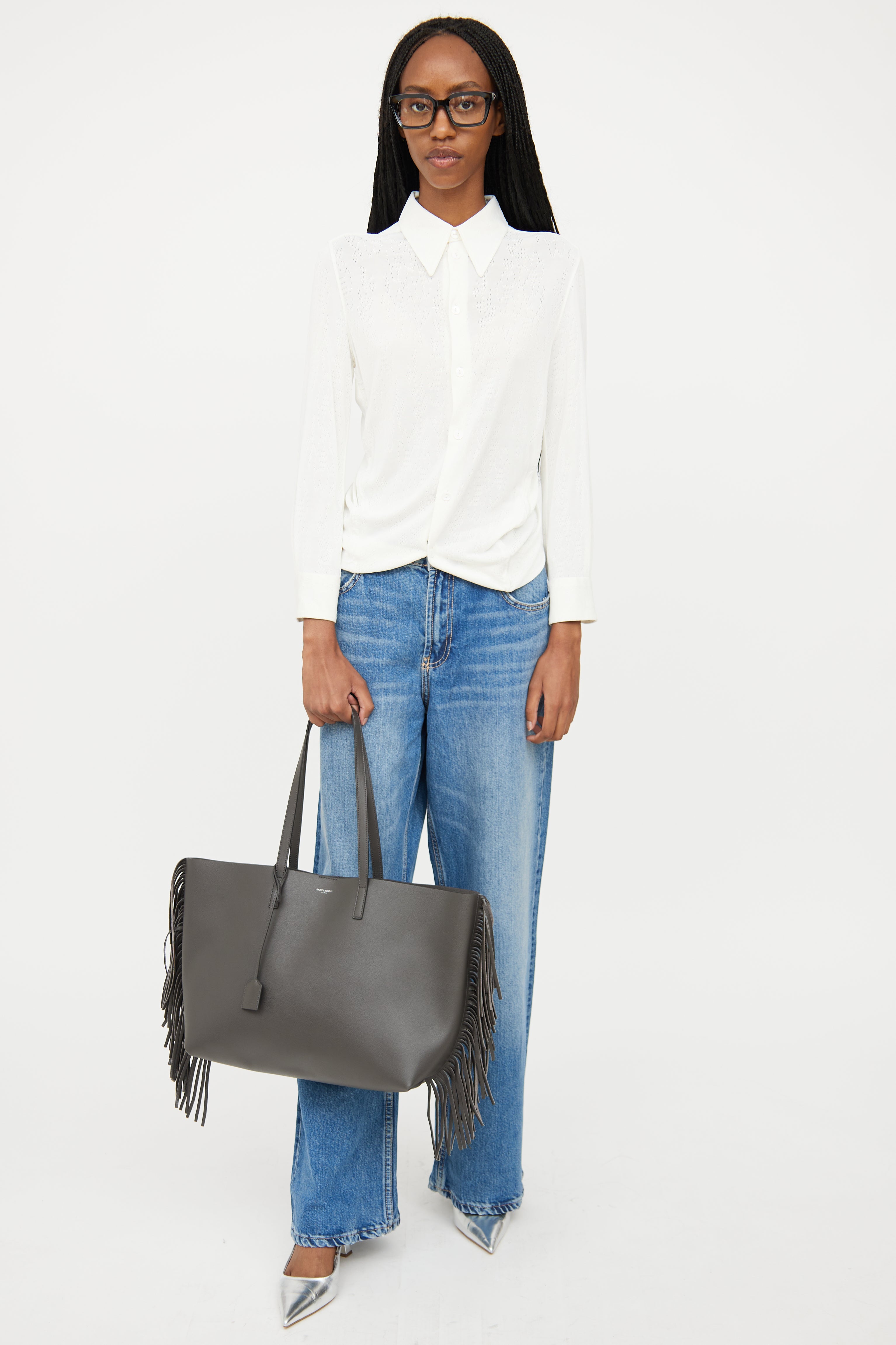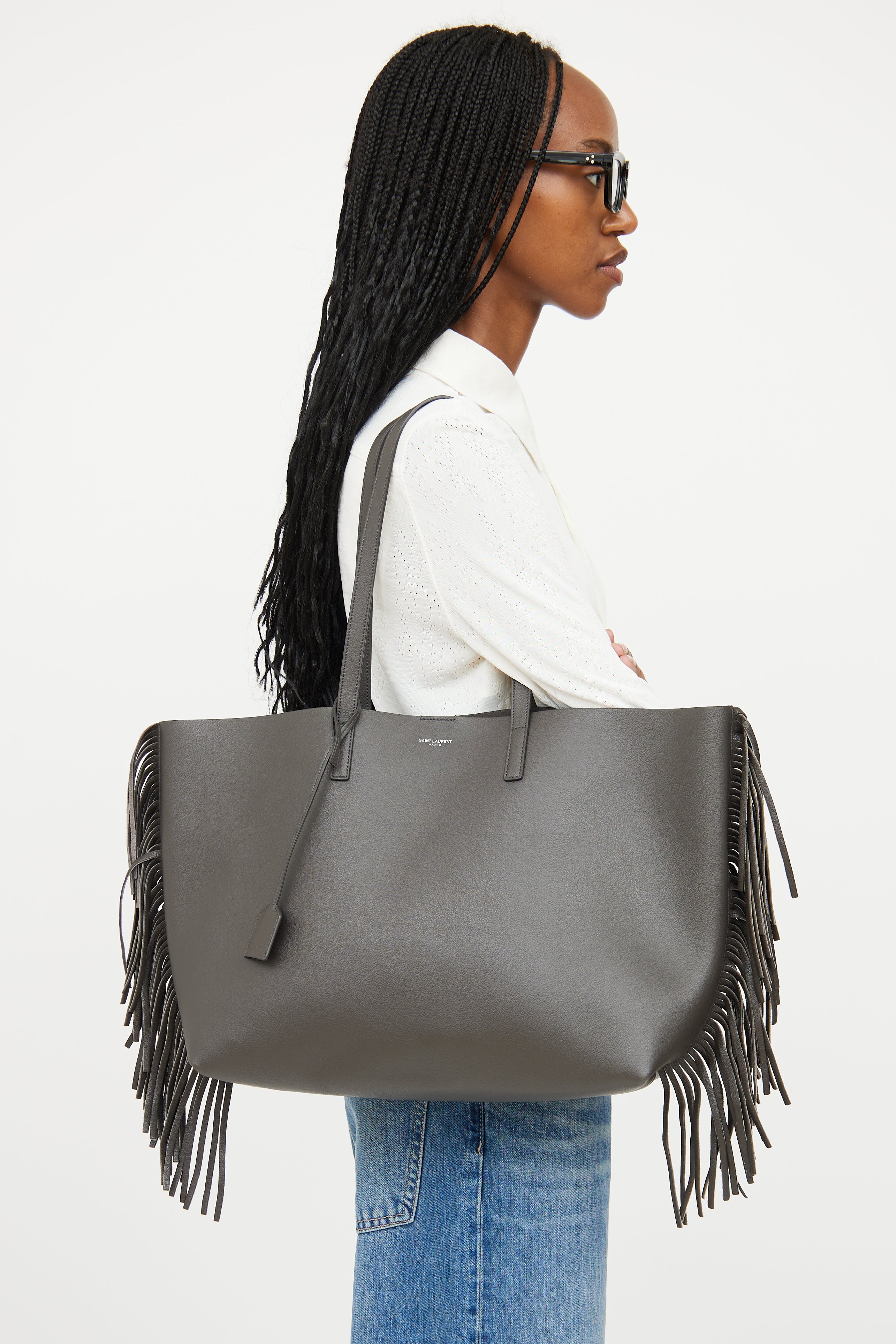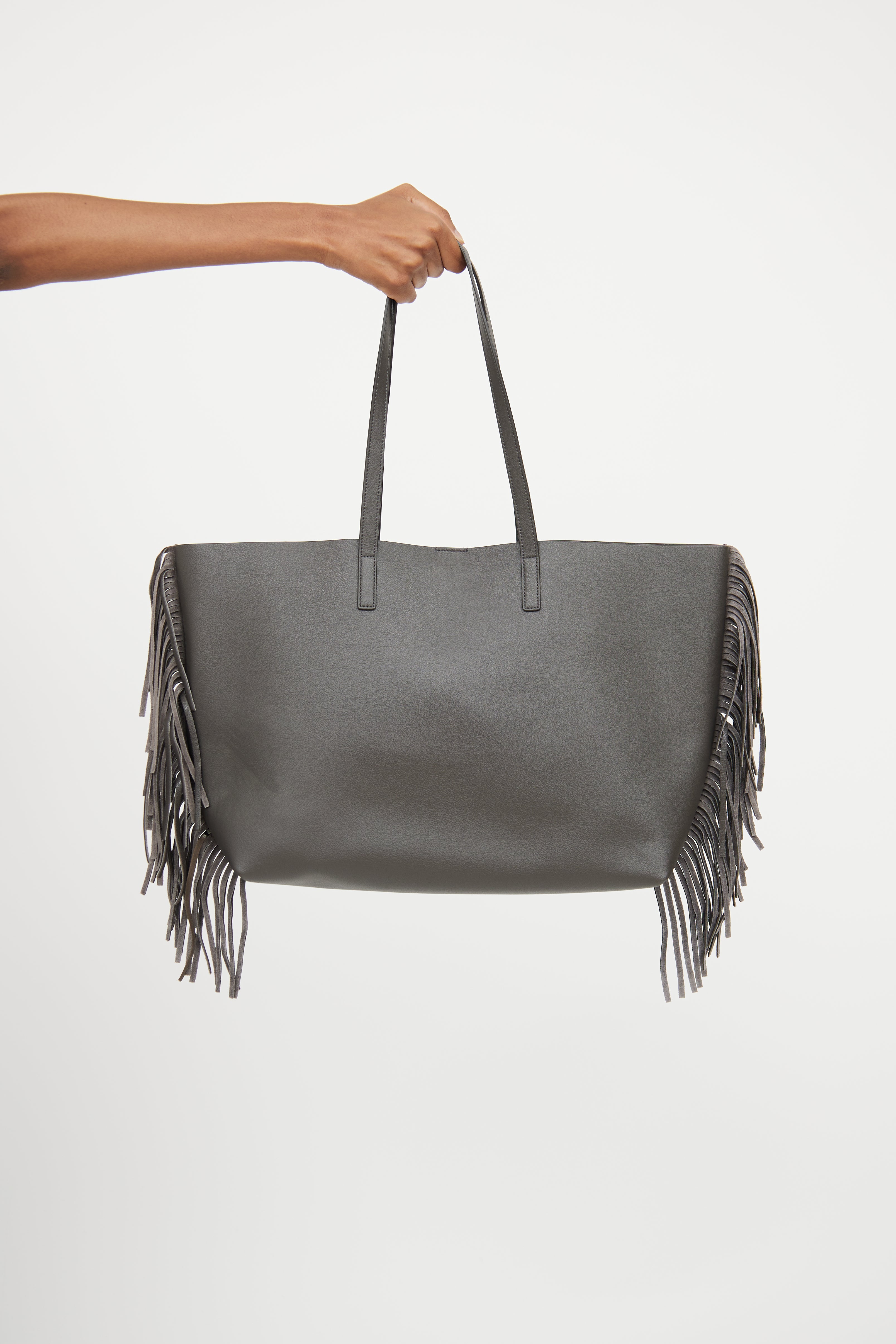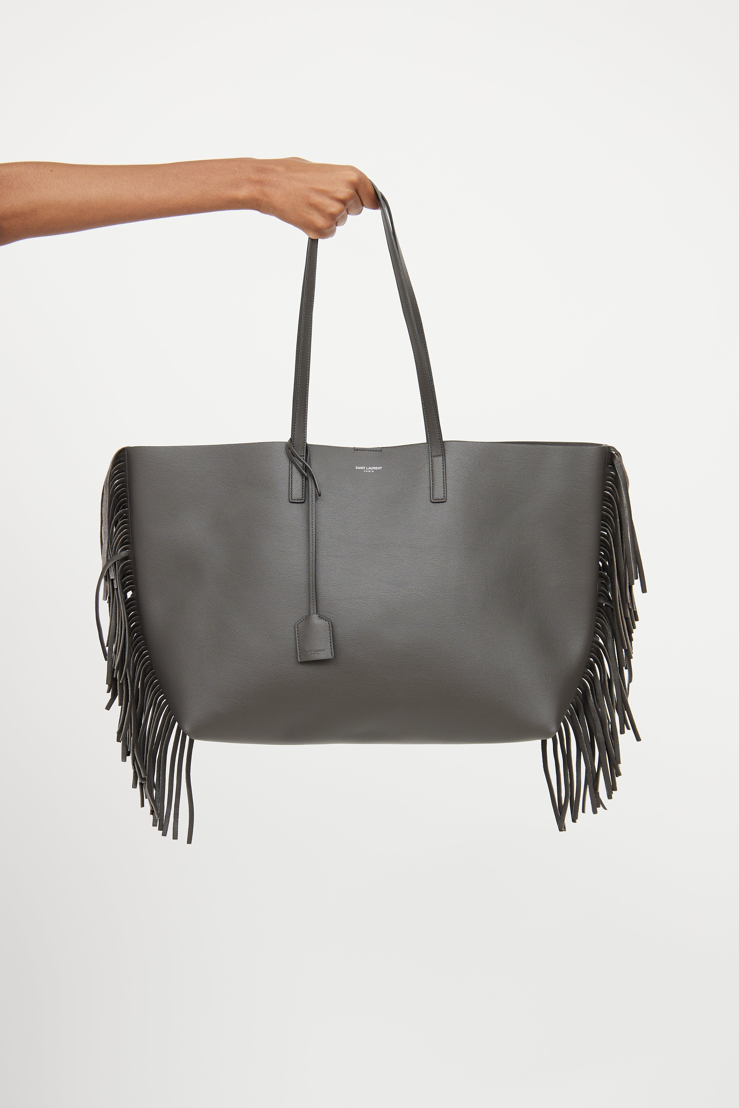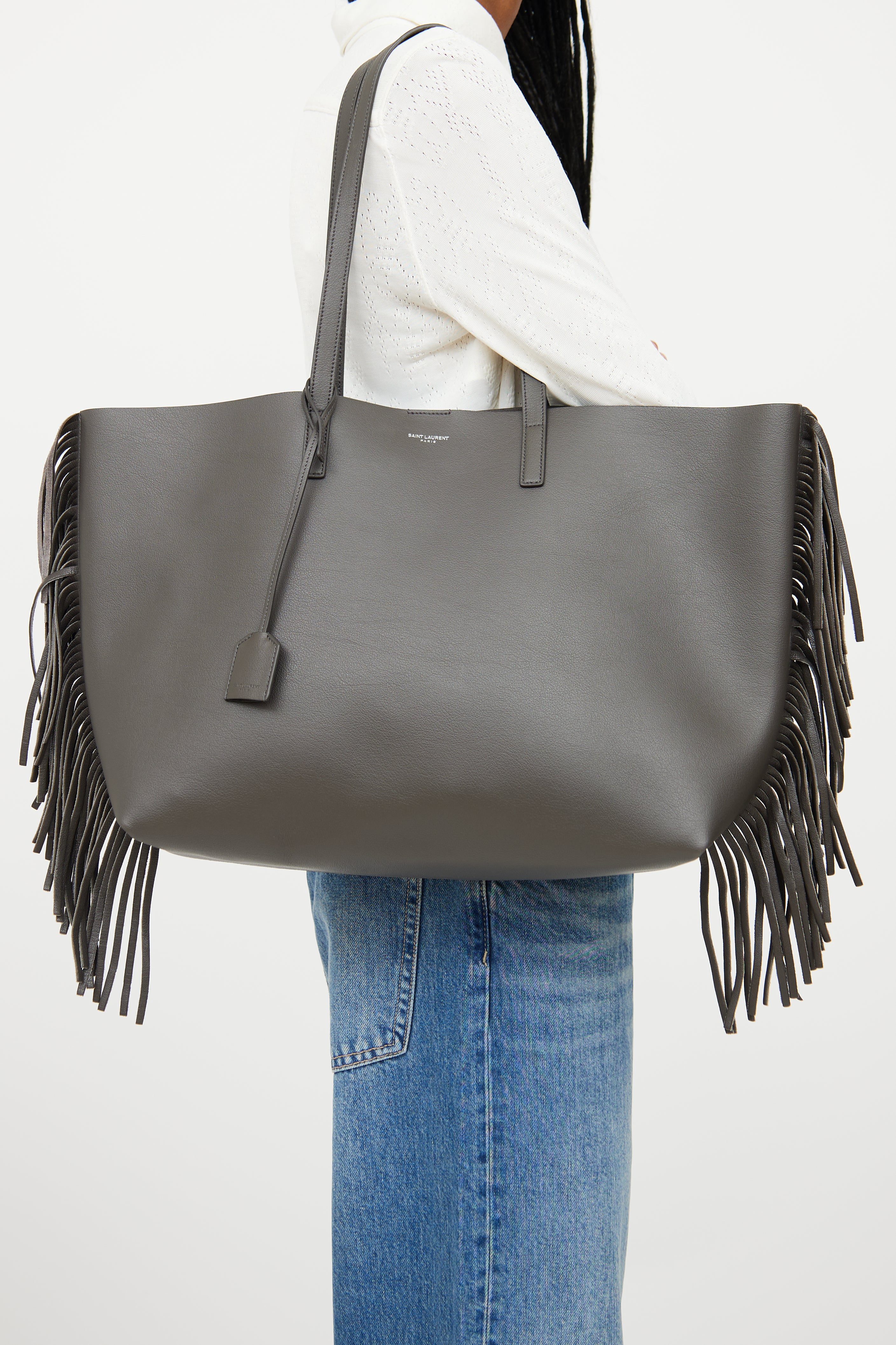Pre-owned Saint Laurent grey leather tote featuring two top handles, gold printed logo at front, key clochette at handle, fringe trim at sides, one main compartment, removable internal zip pouch, and top magnetic snap closure.