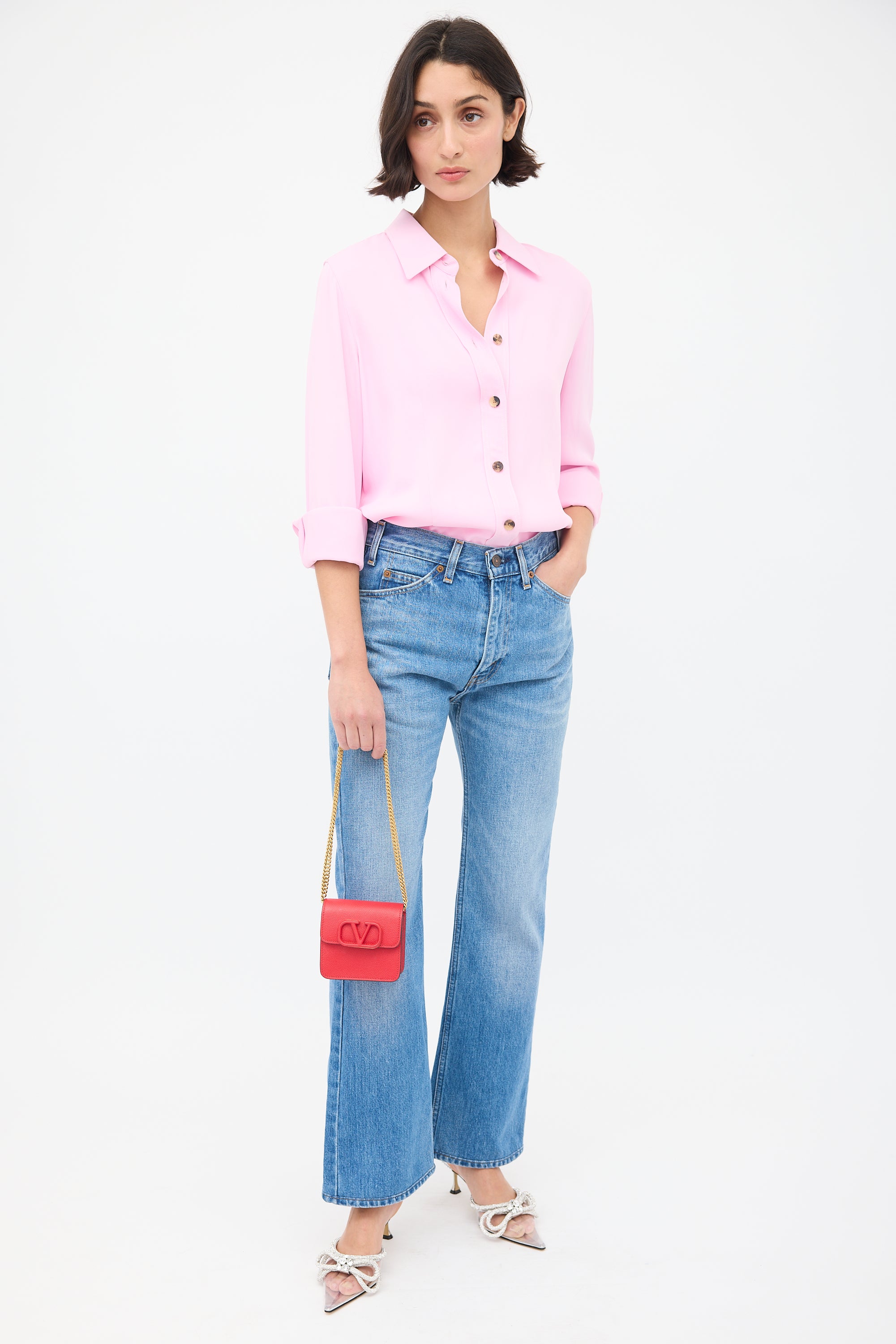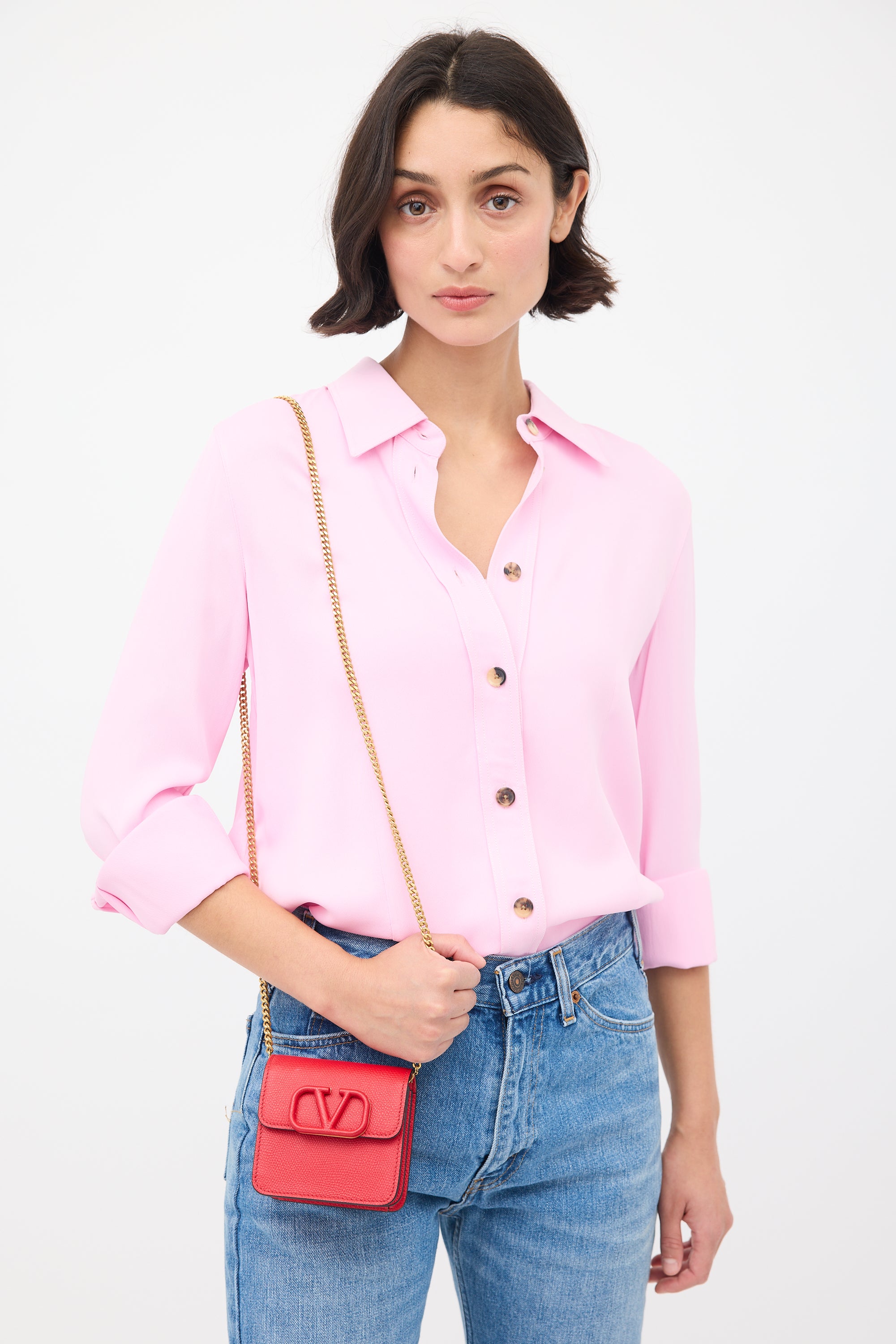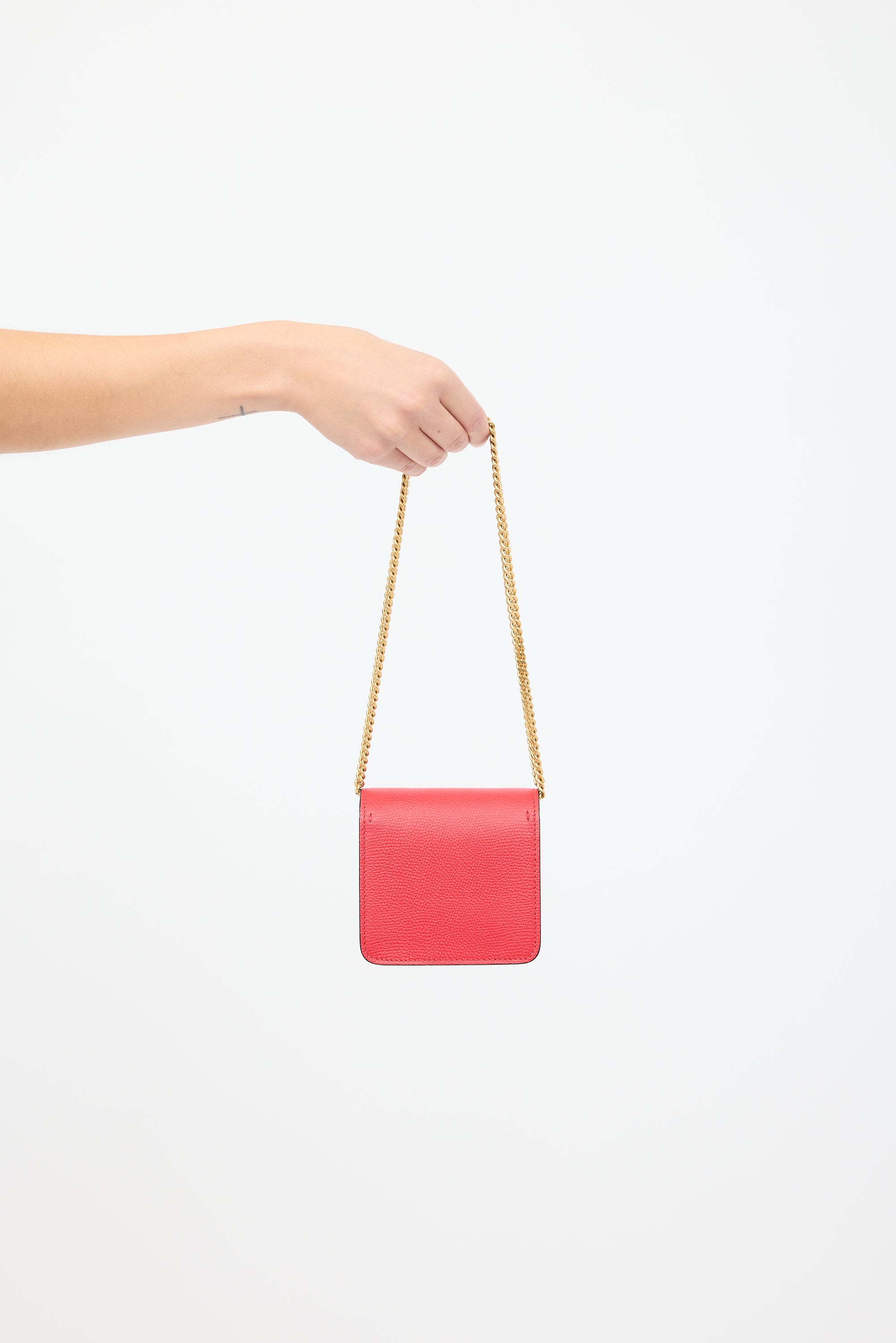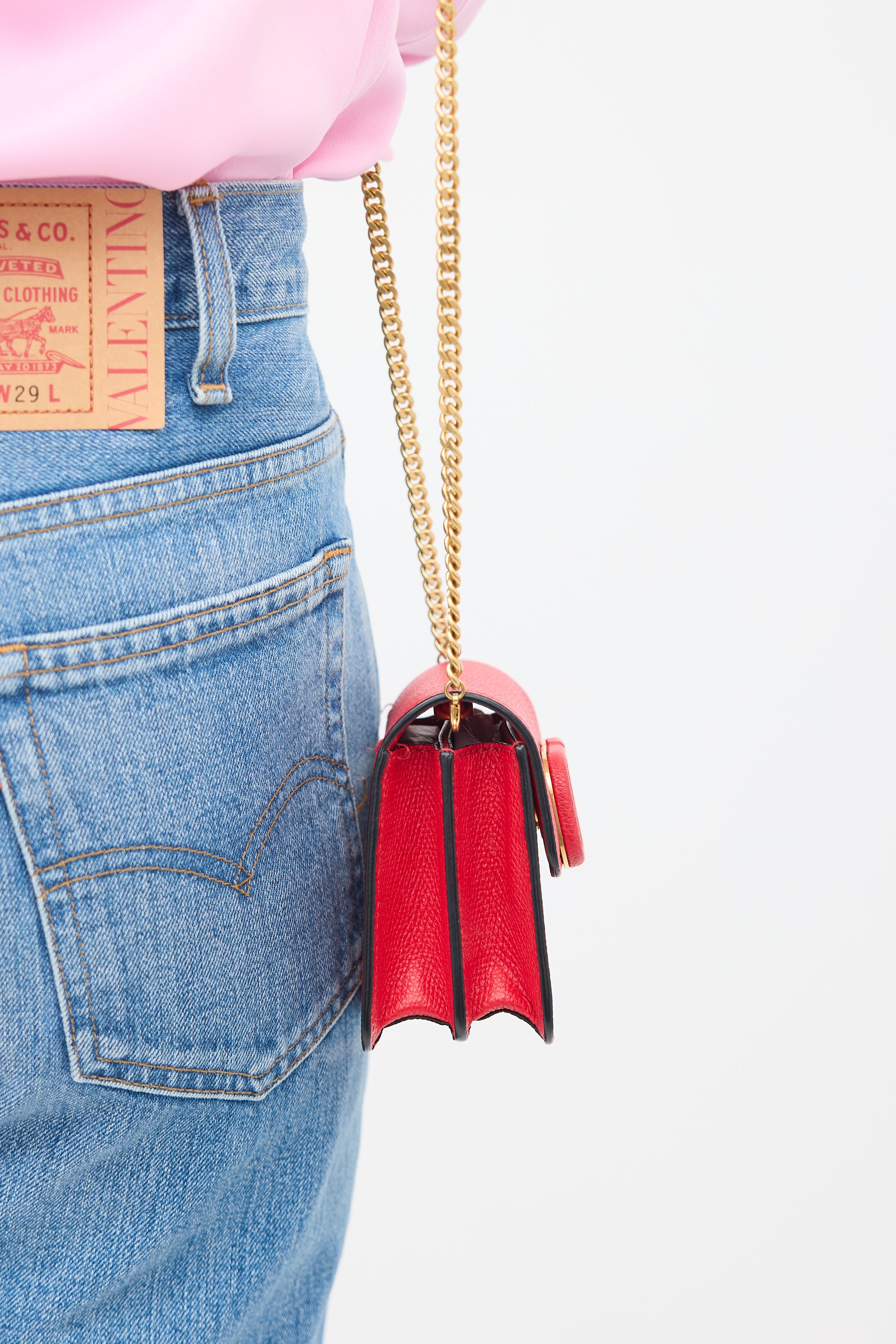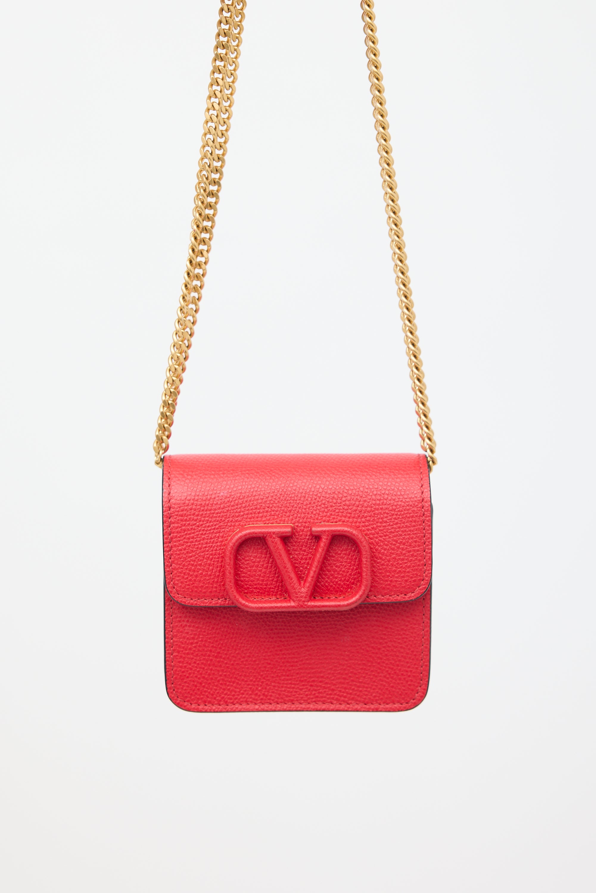 Pre-owned Valentino red leather wallet on chain featuring covered VLogo at front, magnetic button closure, detachable gold tone chain strap, two main compartments, and four card slots. Comes with original dust bag and box.