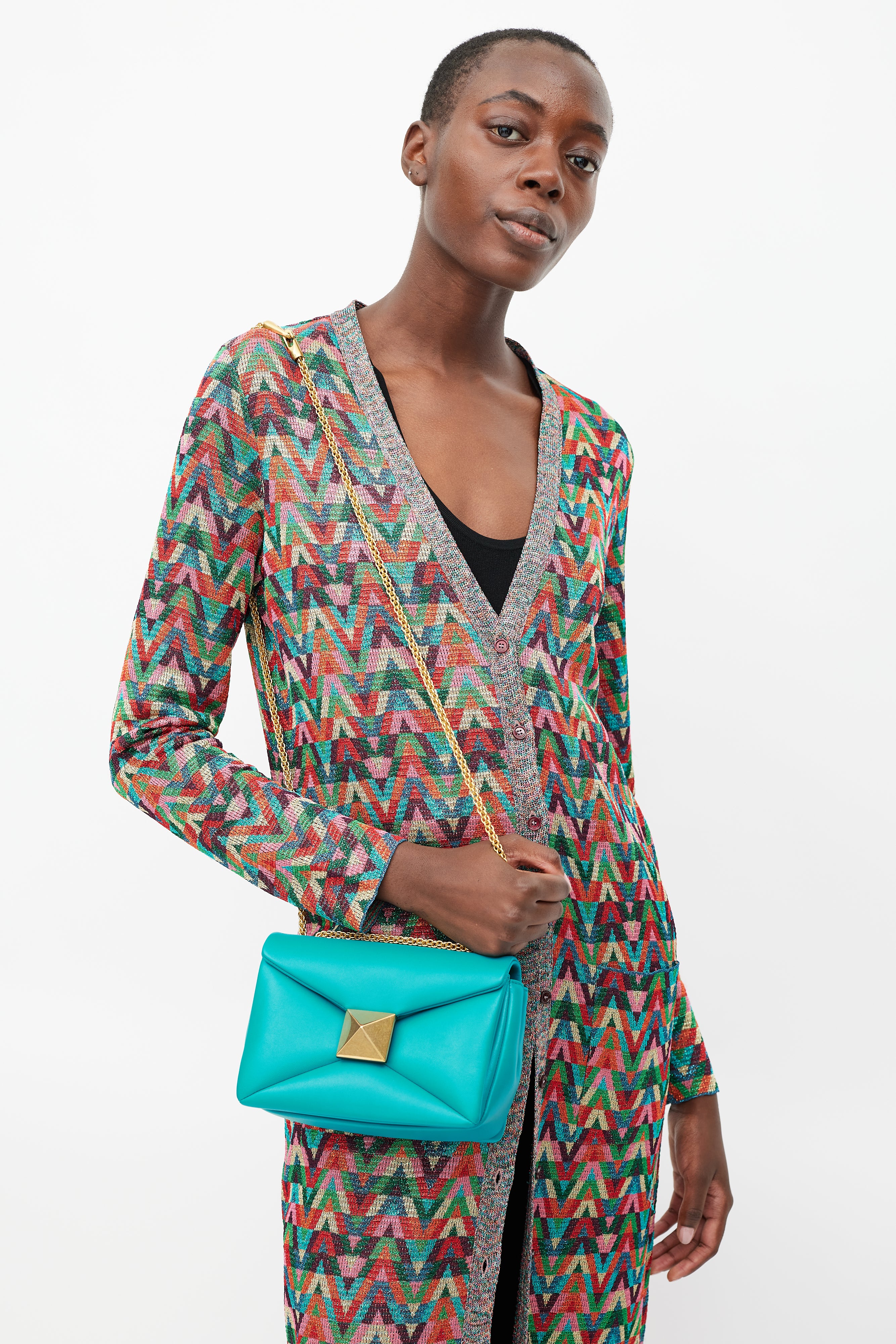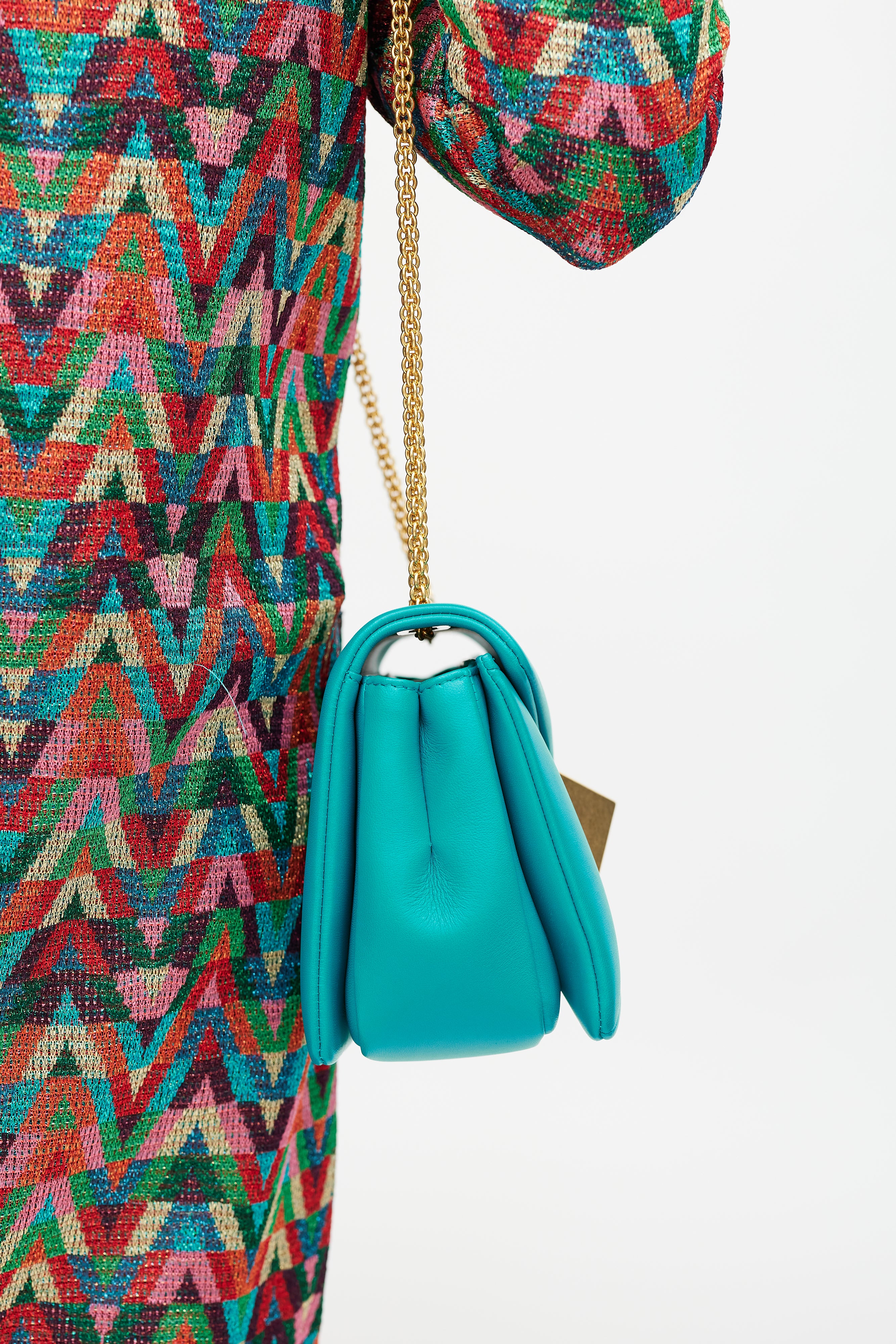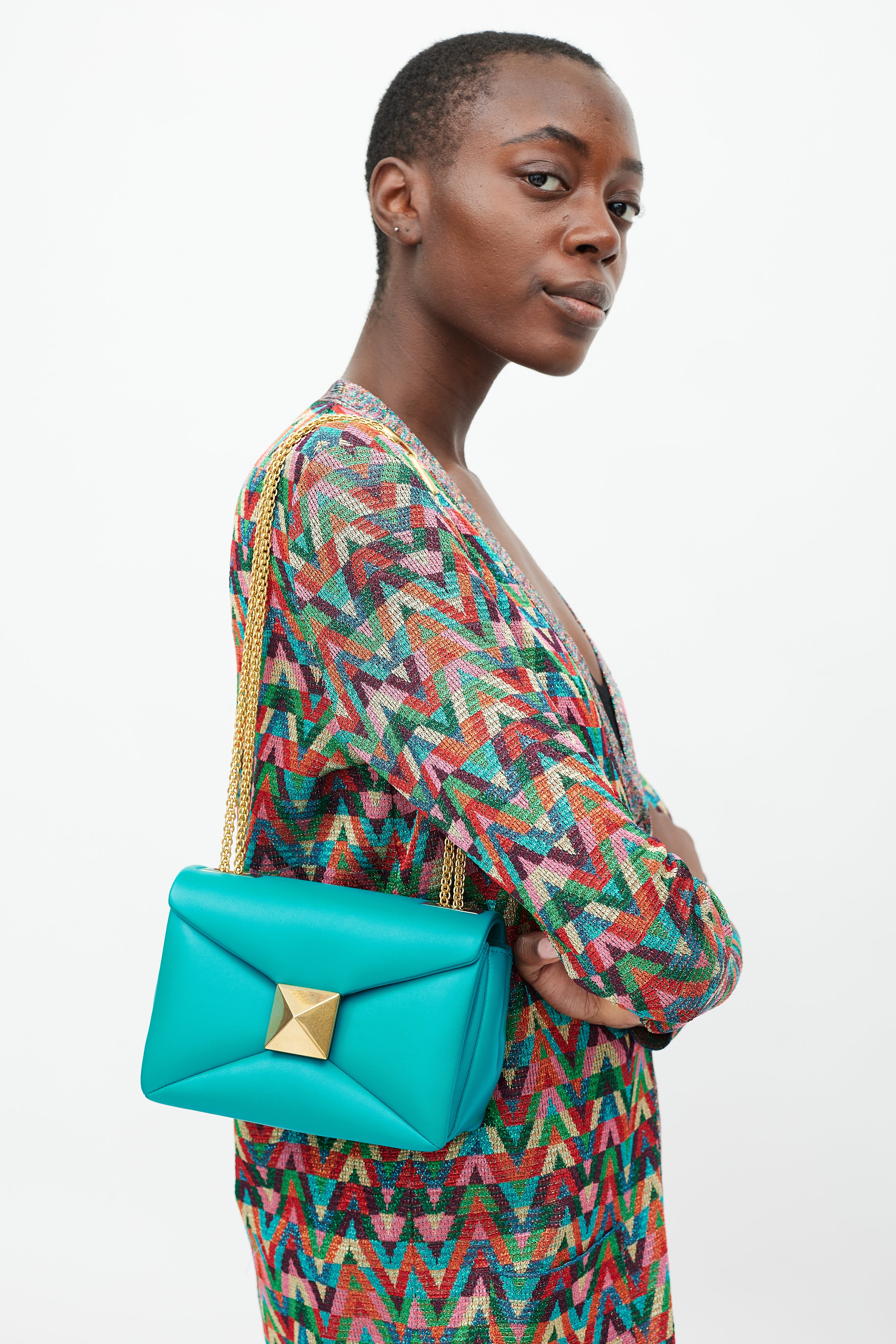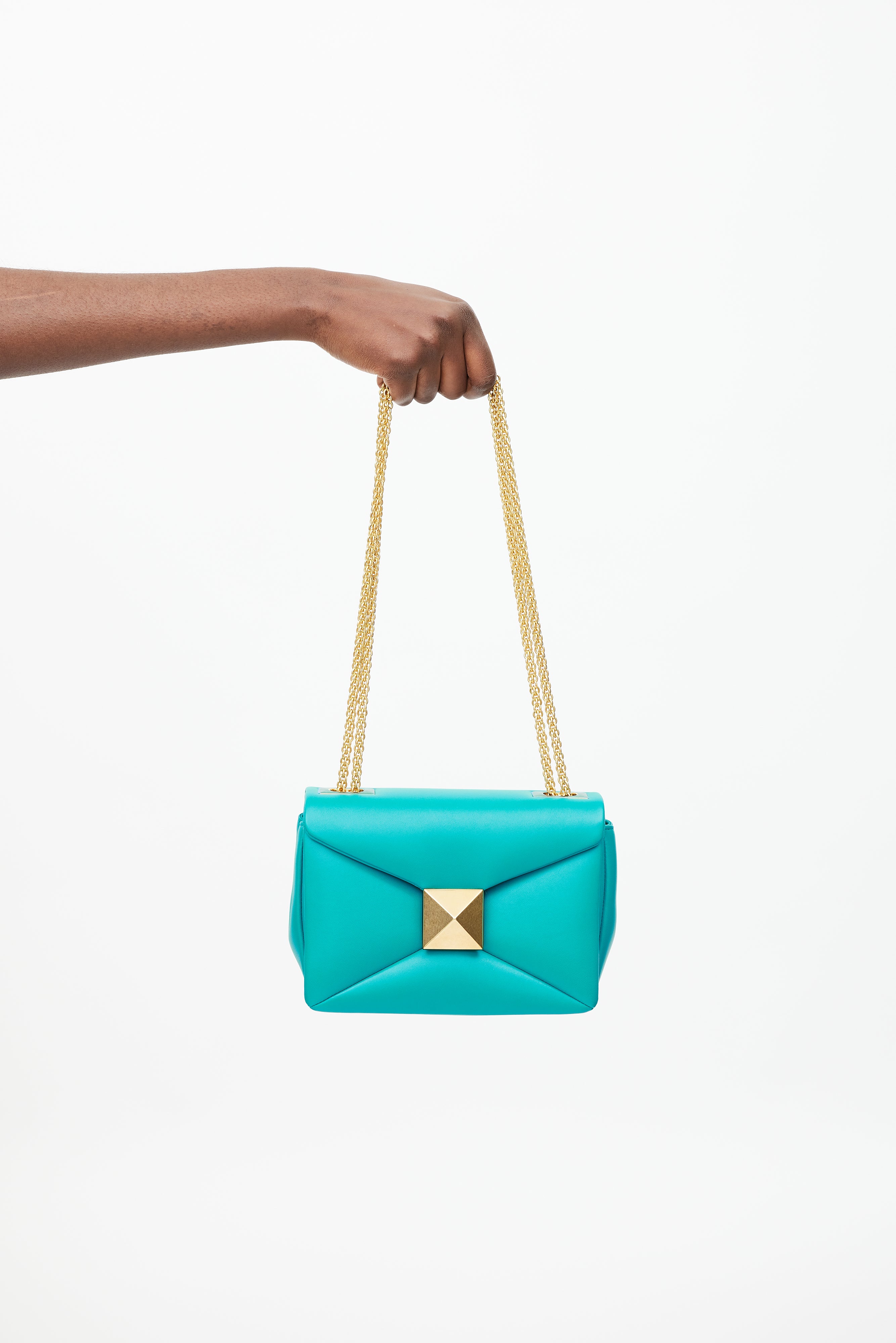 Pre-owned Valentino Garavani turquoise One Stud bag featuring gold tone oversized Roman stud clasp, adjustable gold tone chain strap, flap closure, large interior compartment with slip pocket. Comes with original dust bag and box.