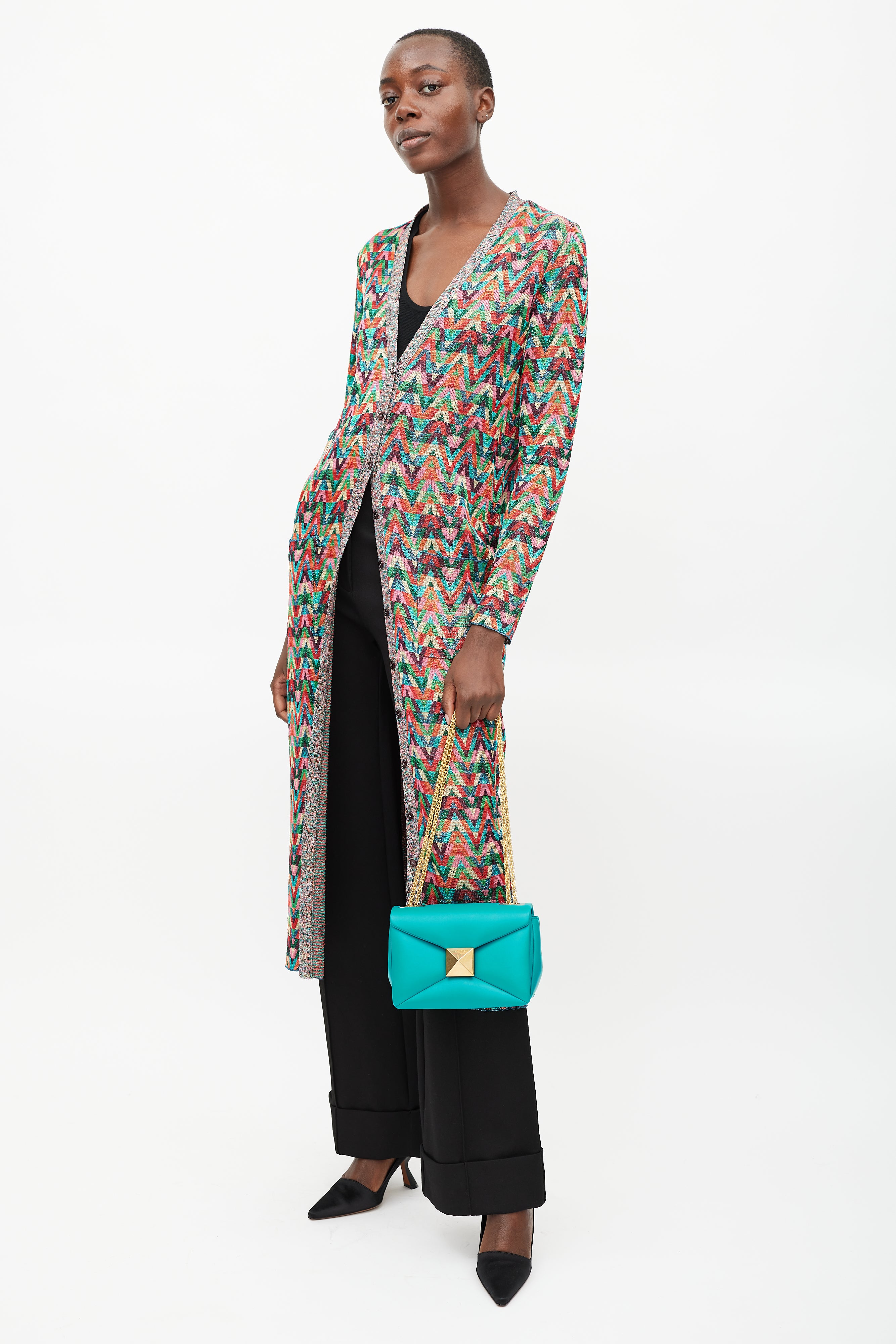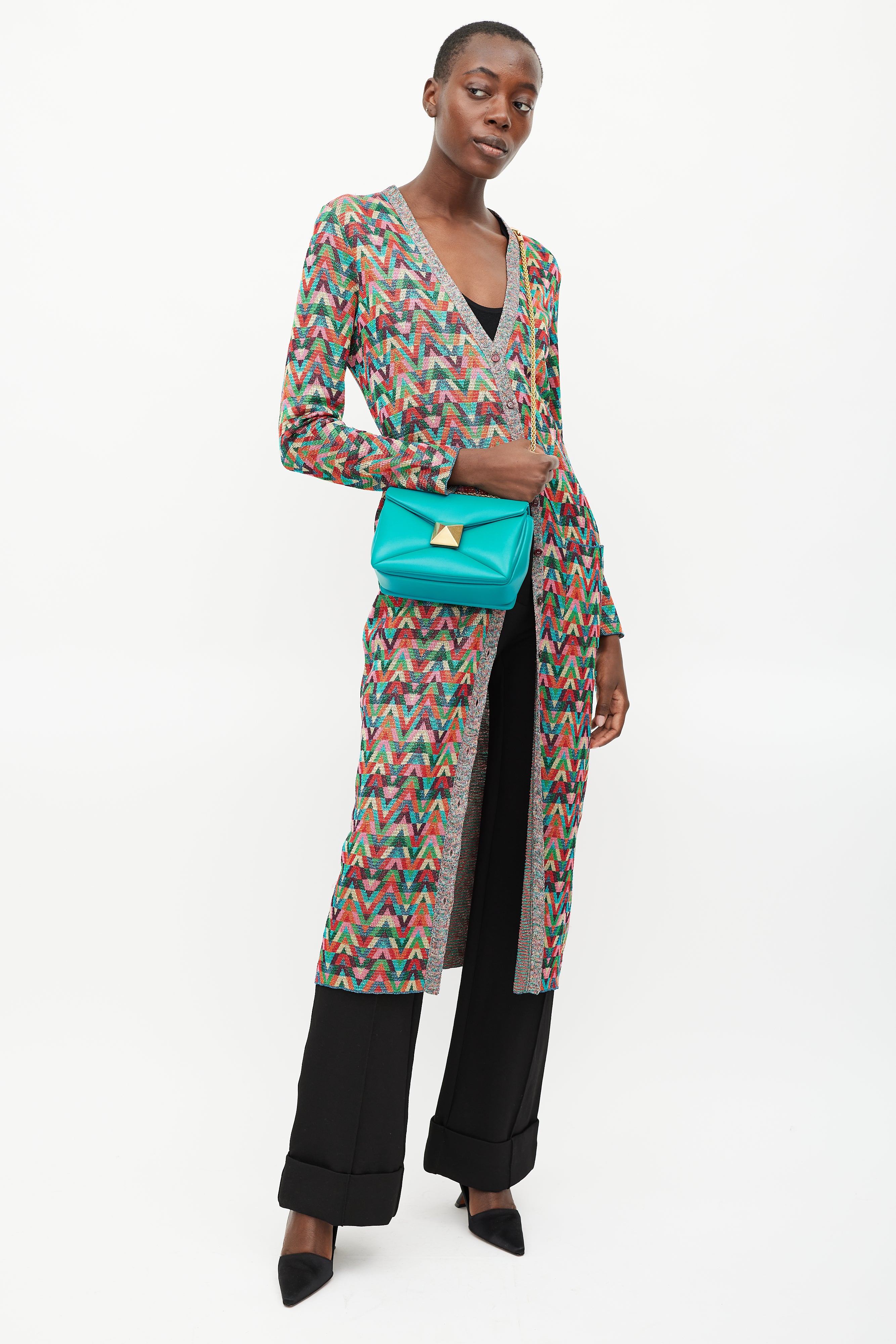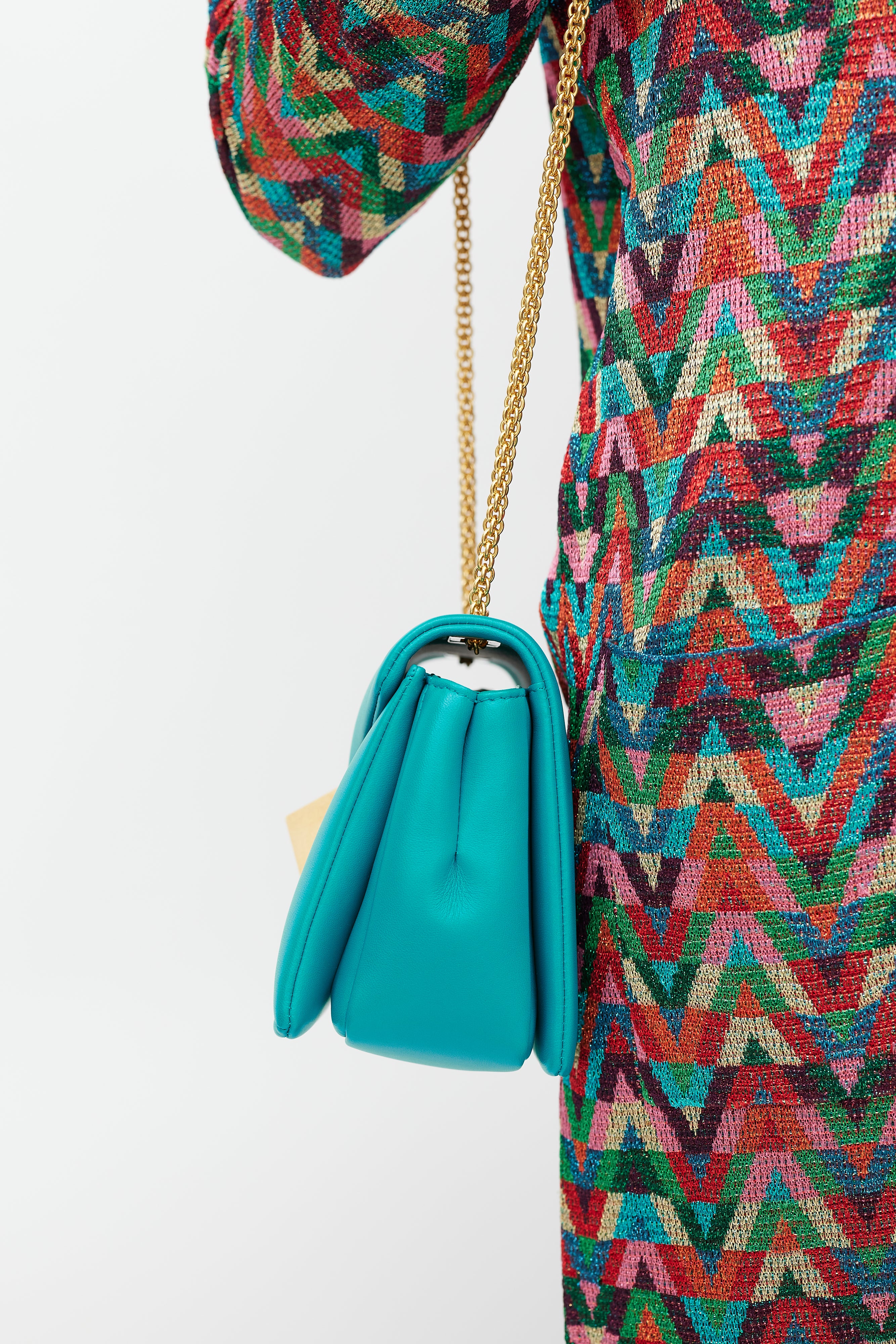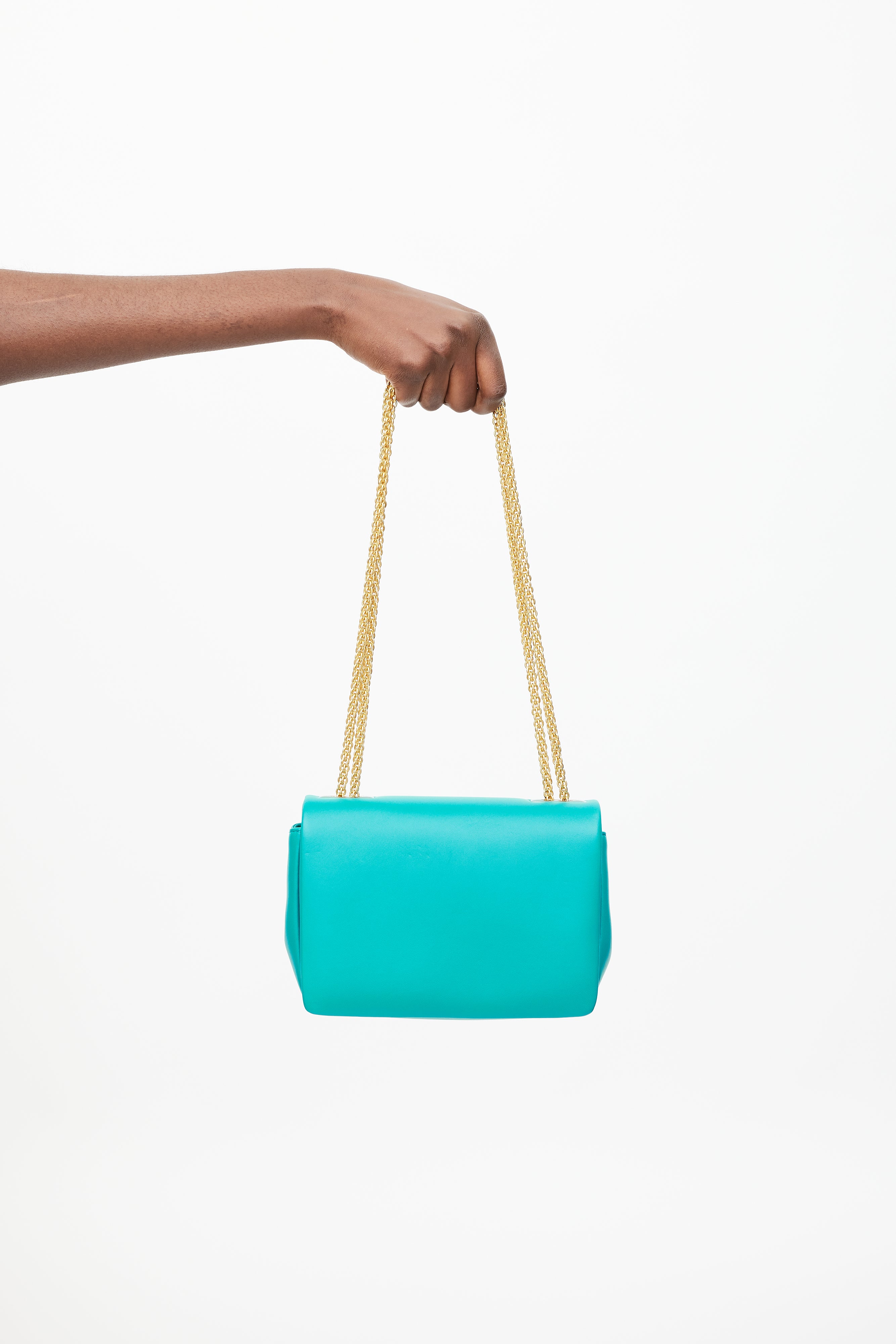 Pre-owned Valentino Garavani turquoise One Stud bag featuring gold tone oversized Roman stud clasp, adjustable gold tone chain strap, flap closure, large interior compartment with slip pocket. Comes with original dust bag and box.