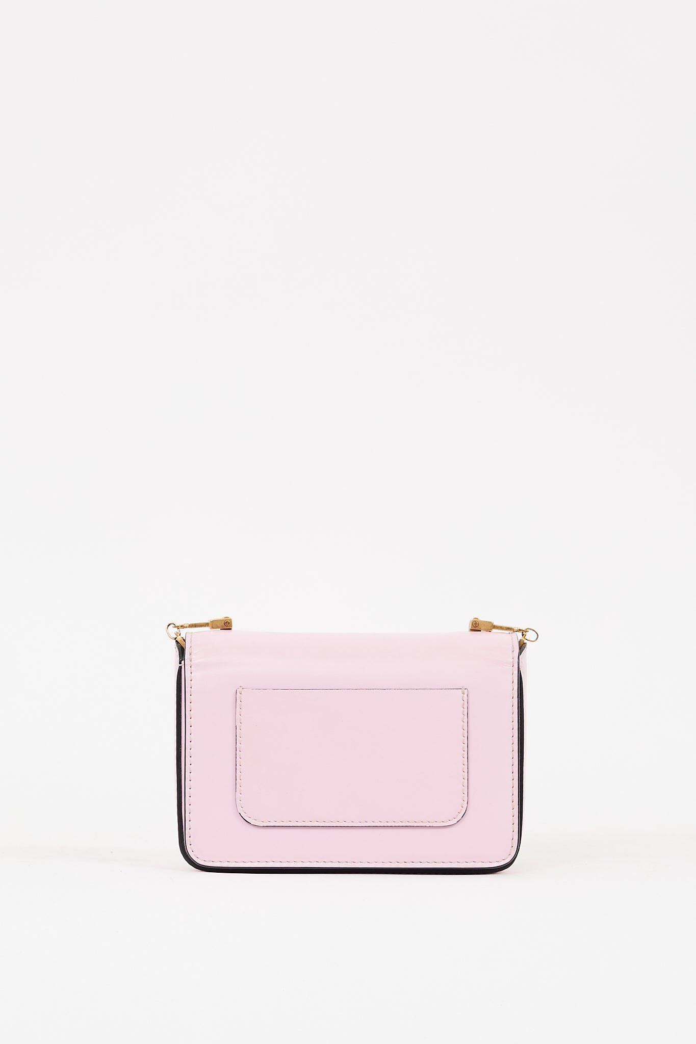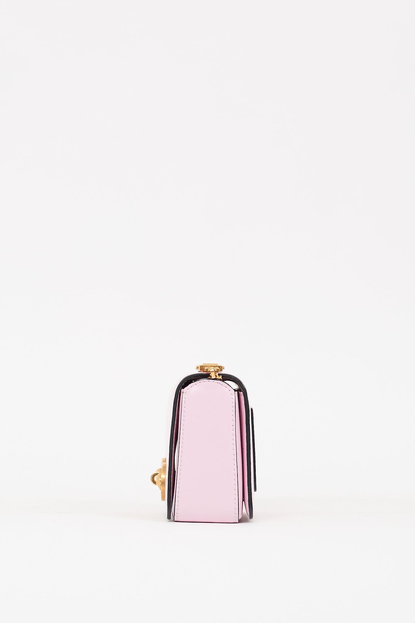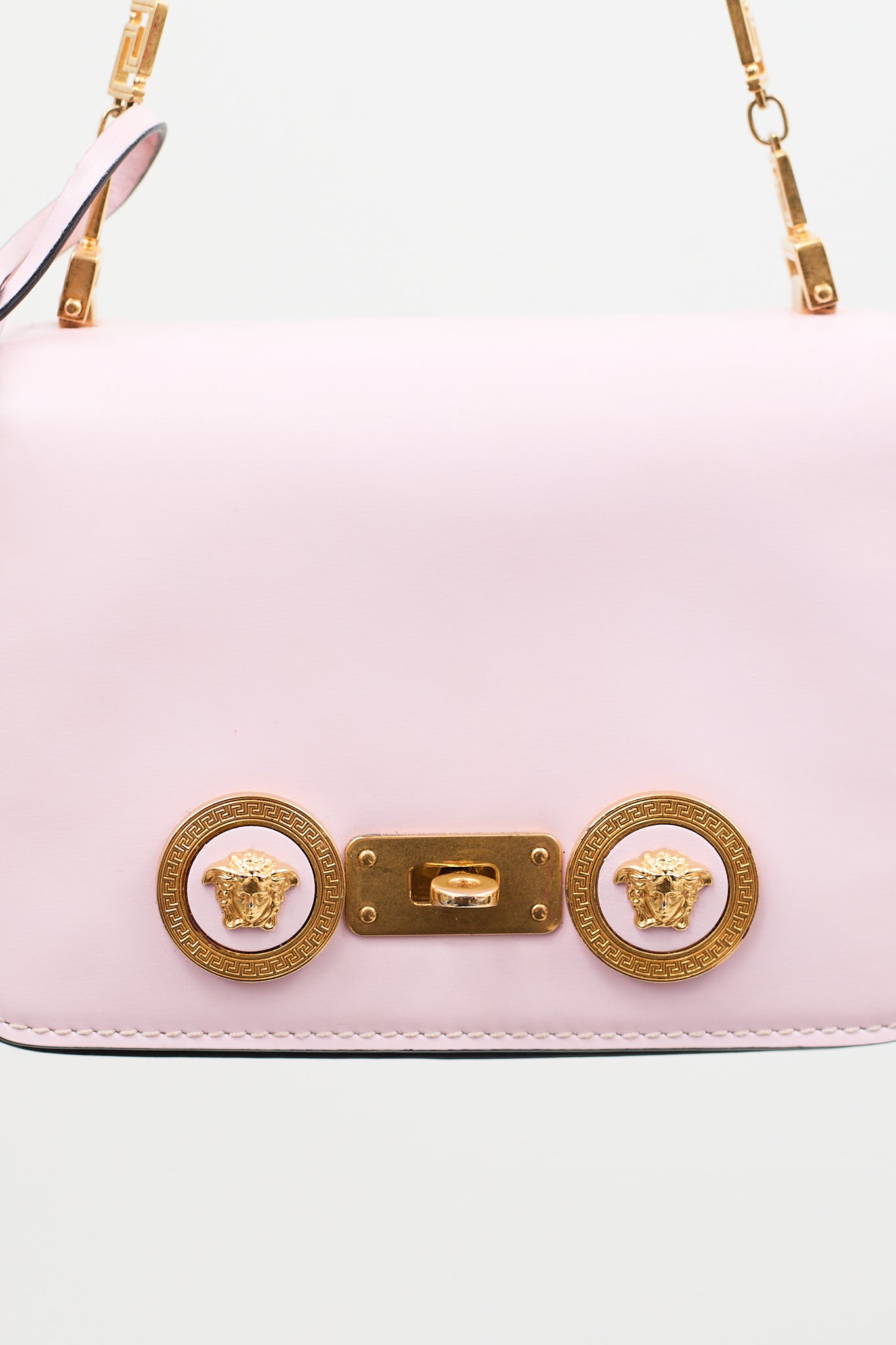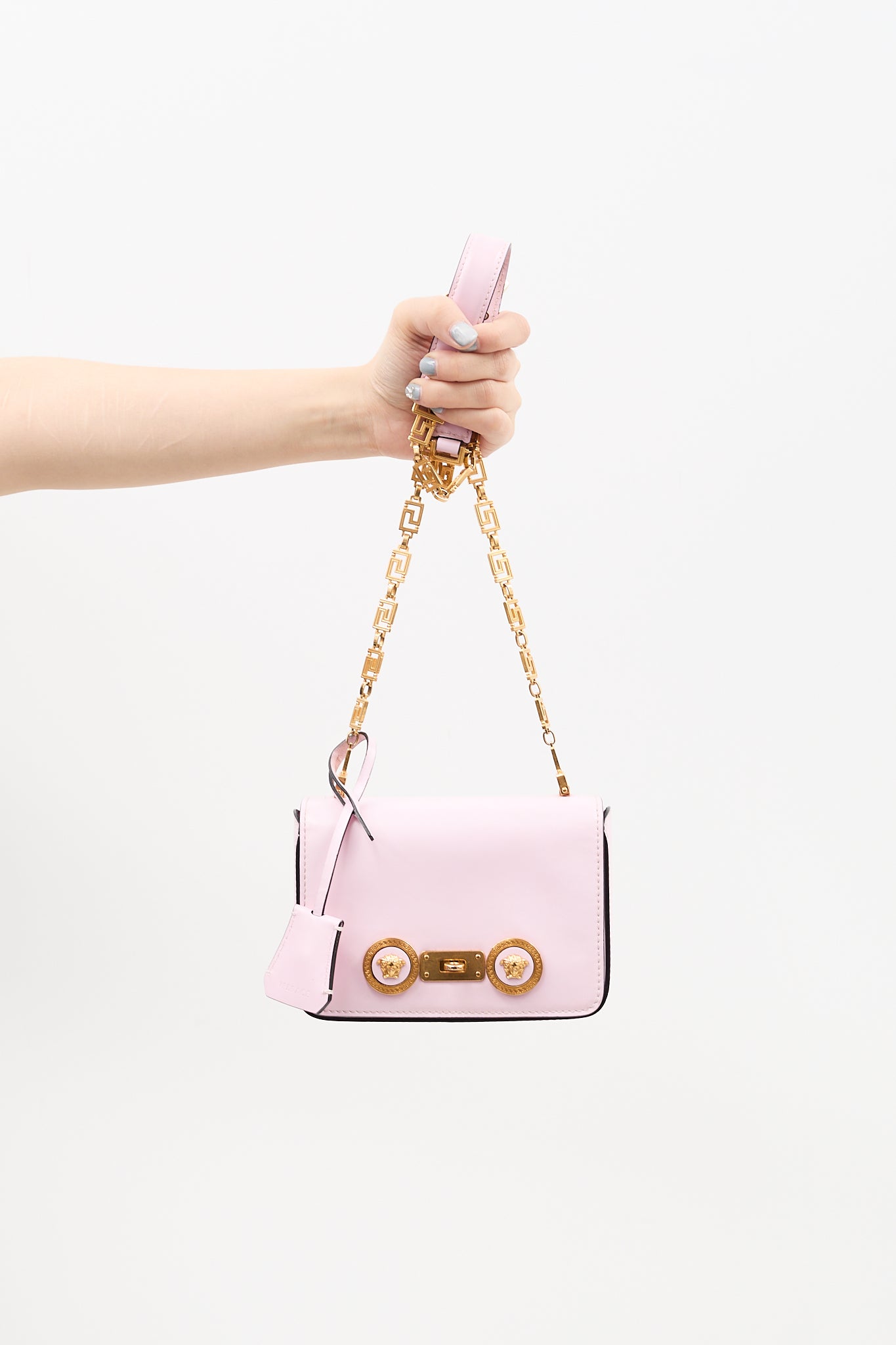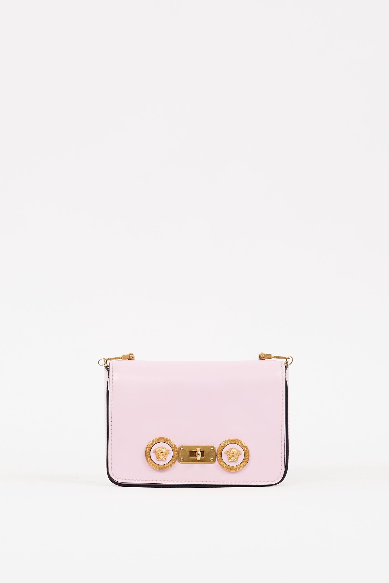 Pre-owned Versace pink leather Mini Icon bag featuring front flap, turn lock closure, gold tone padlock and enclosed key, two medusa medallion hardware at front, one lined main compartment with two slip pockets, back slip pocket, and attached Greca chain cross body strap. Comes with dust bag.