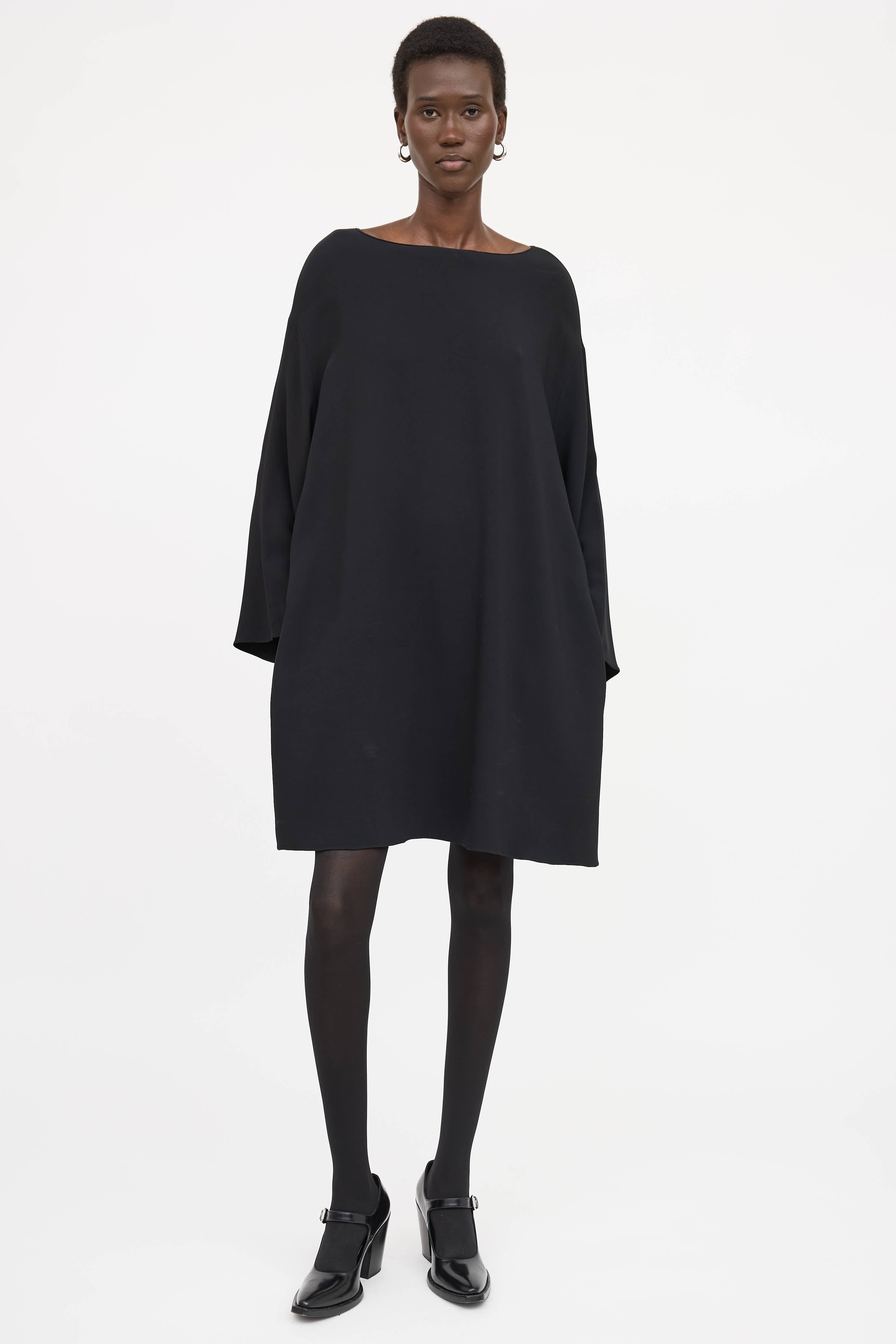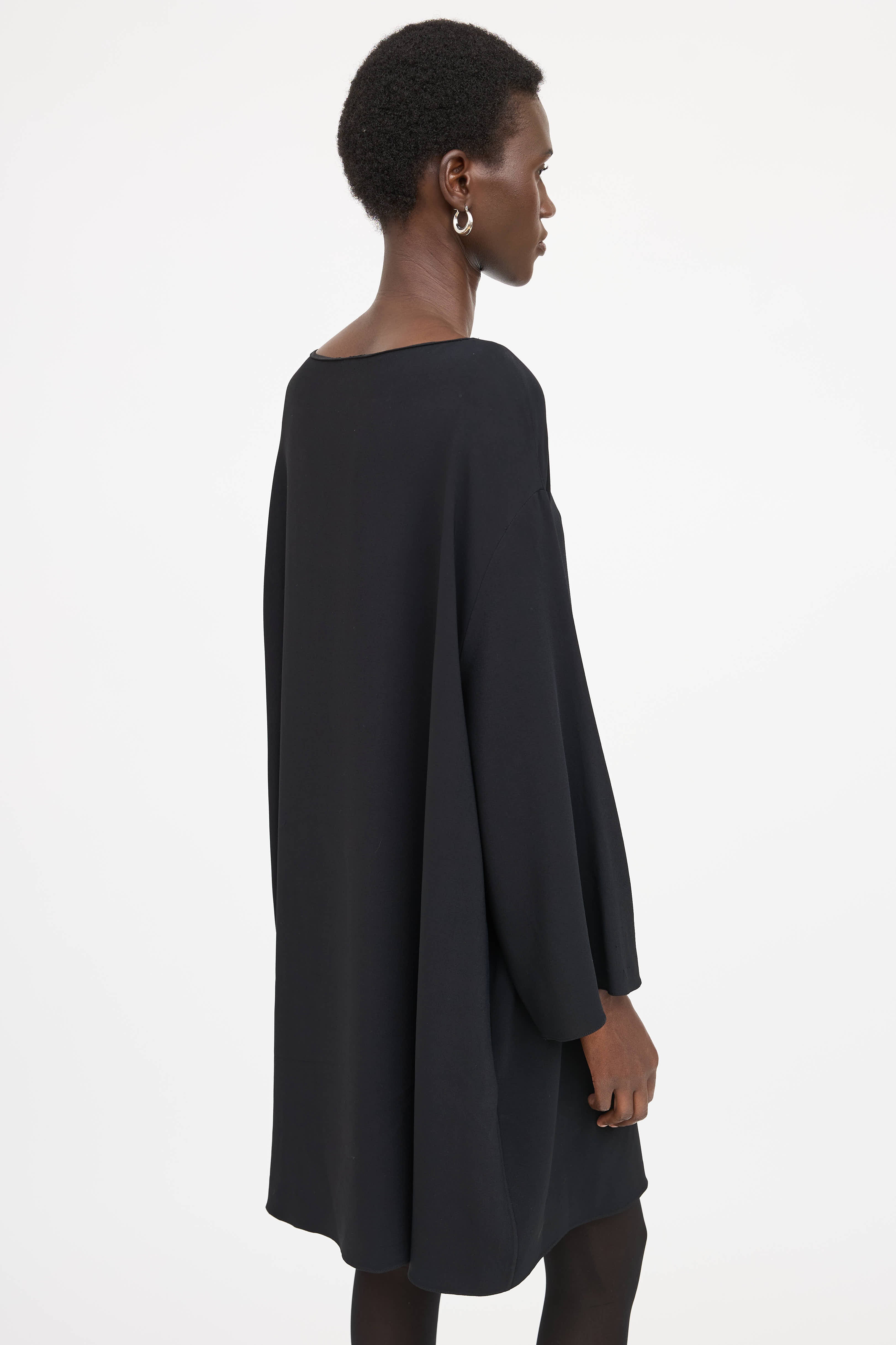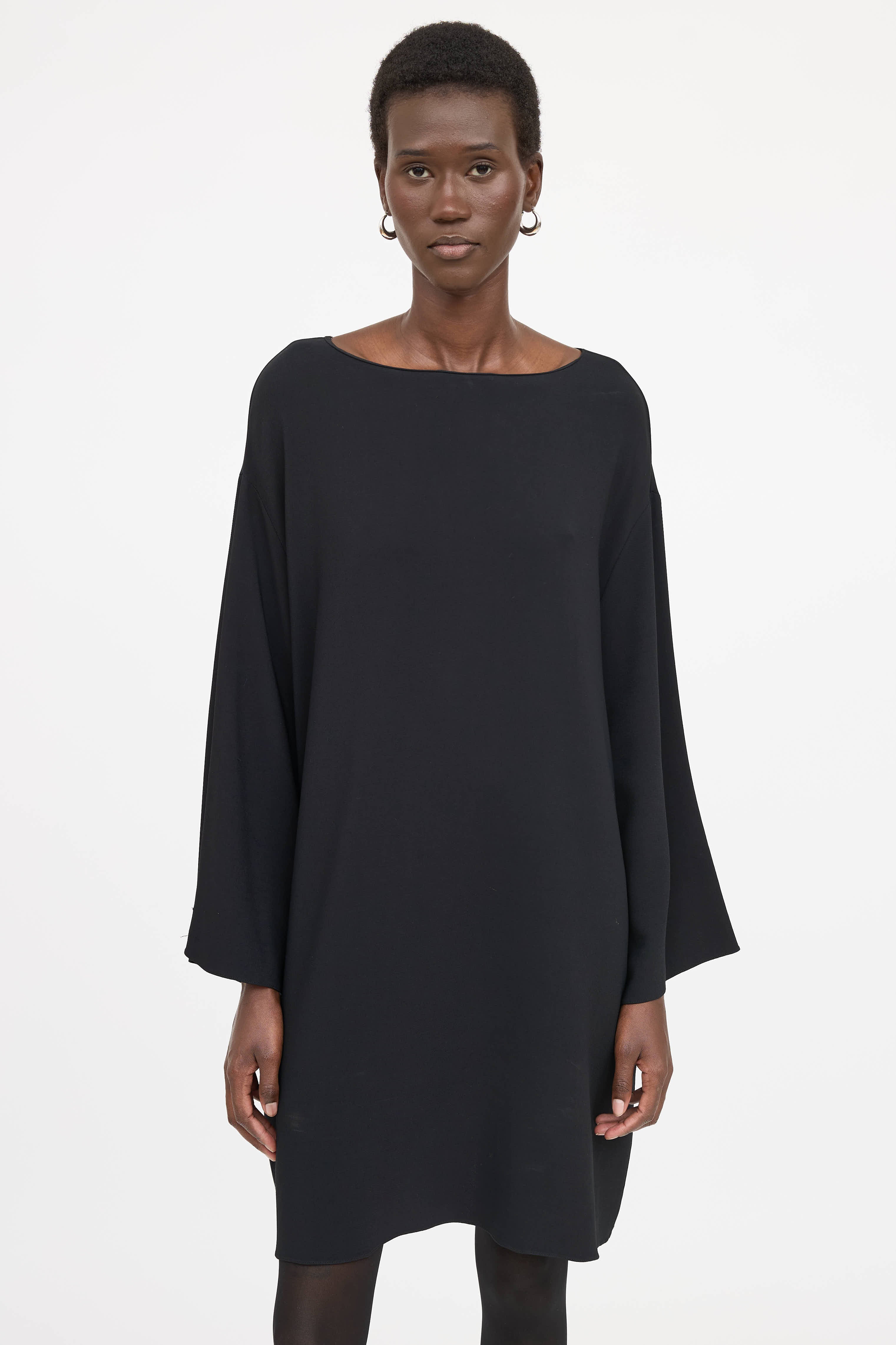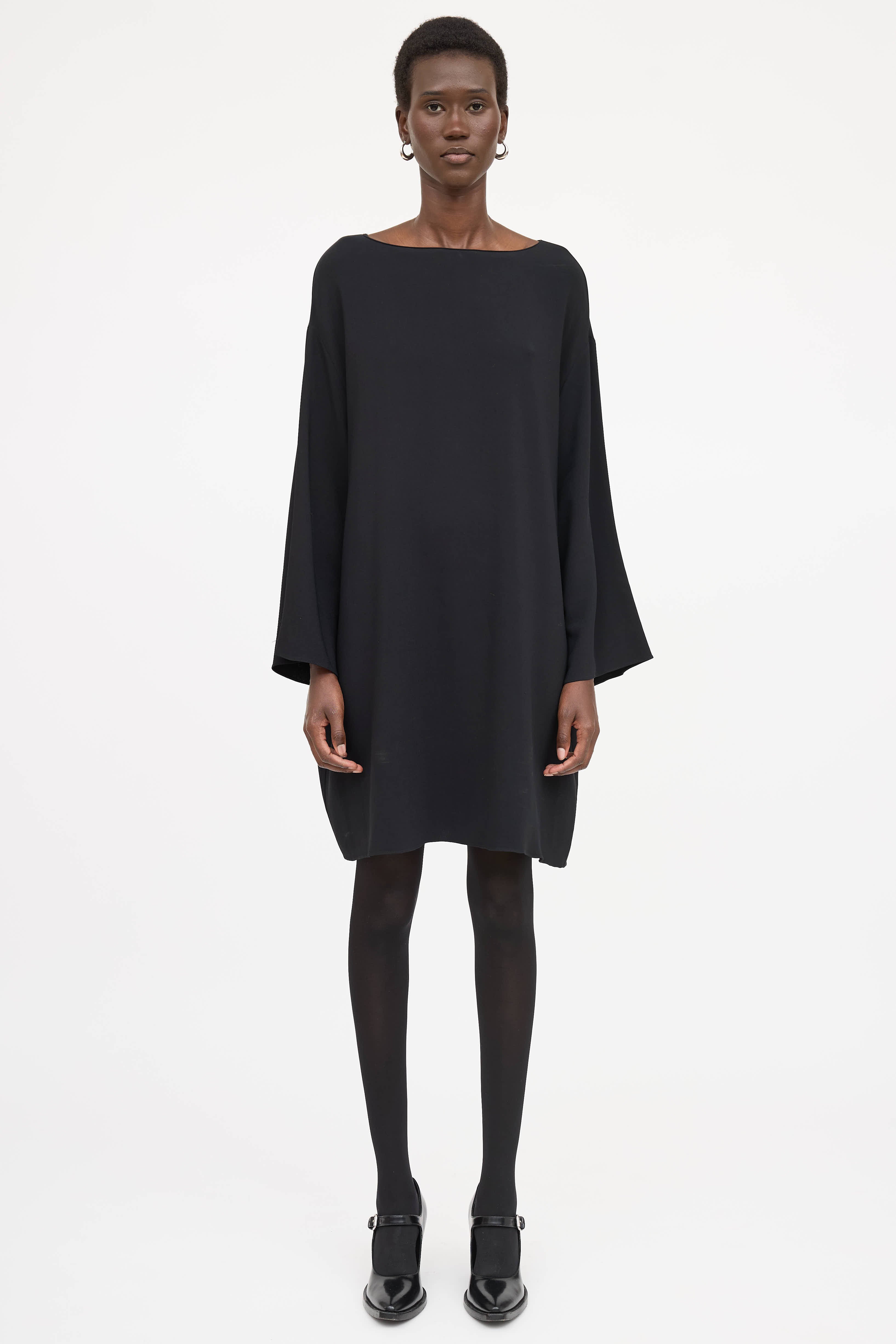 Pre-owned The Row black dress featuring boat neckline, drop shoulders, wide sleeves and slip pockets at hips.