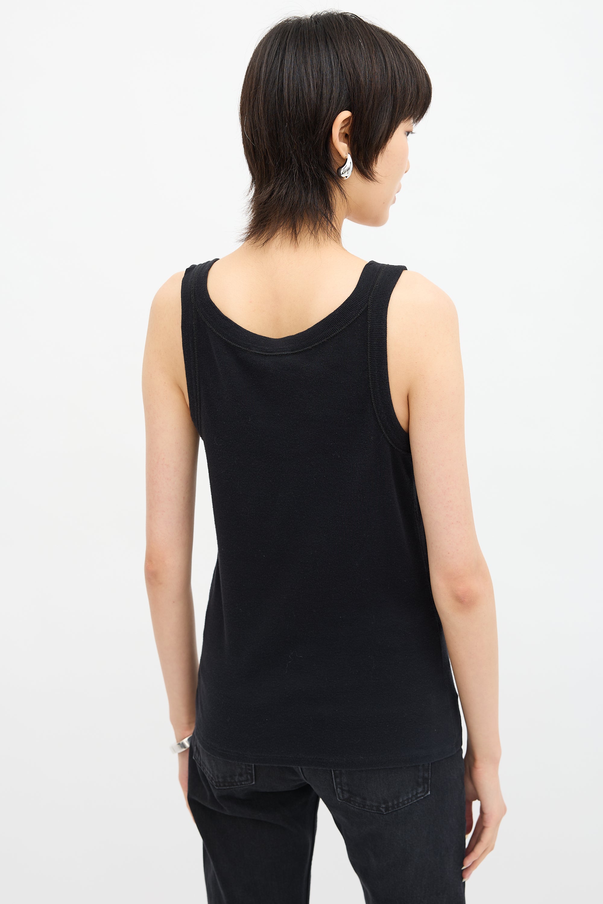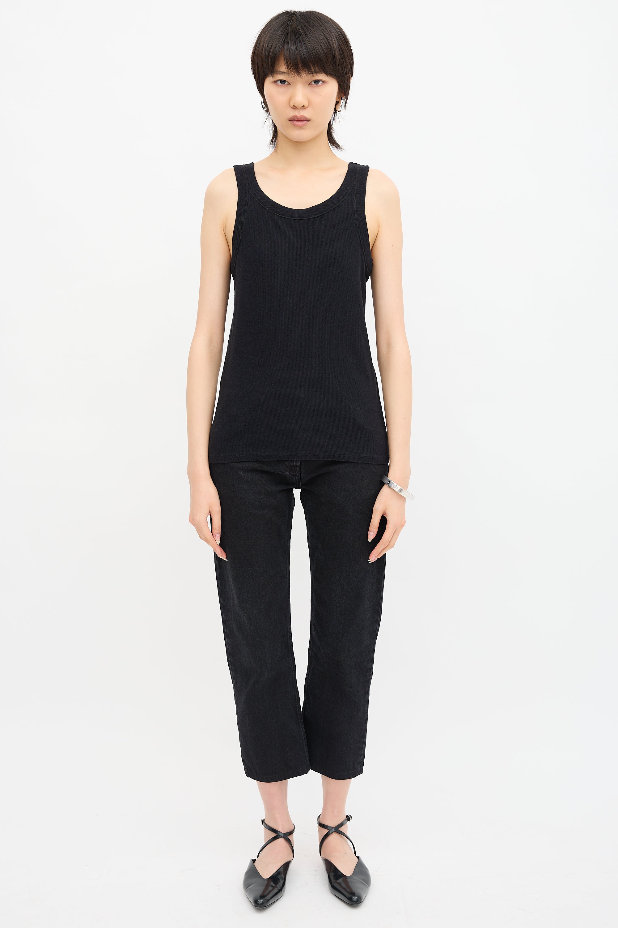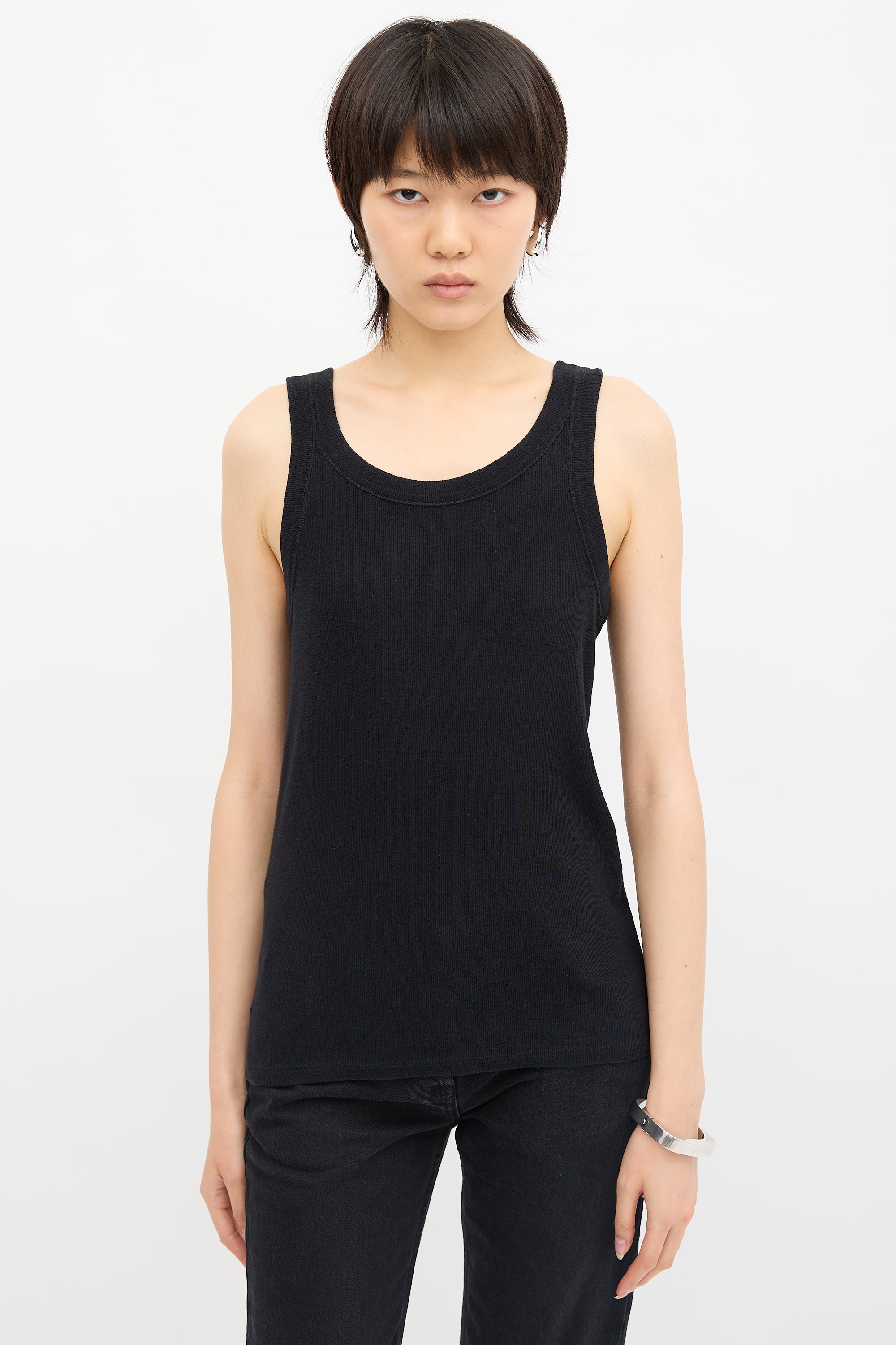 Pre-owned The Row black ribbed Firala tank top featuring a round neckline and back, and tonal stitching.