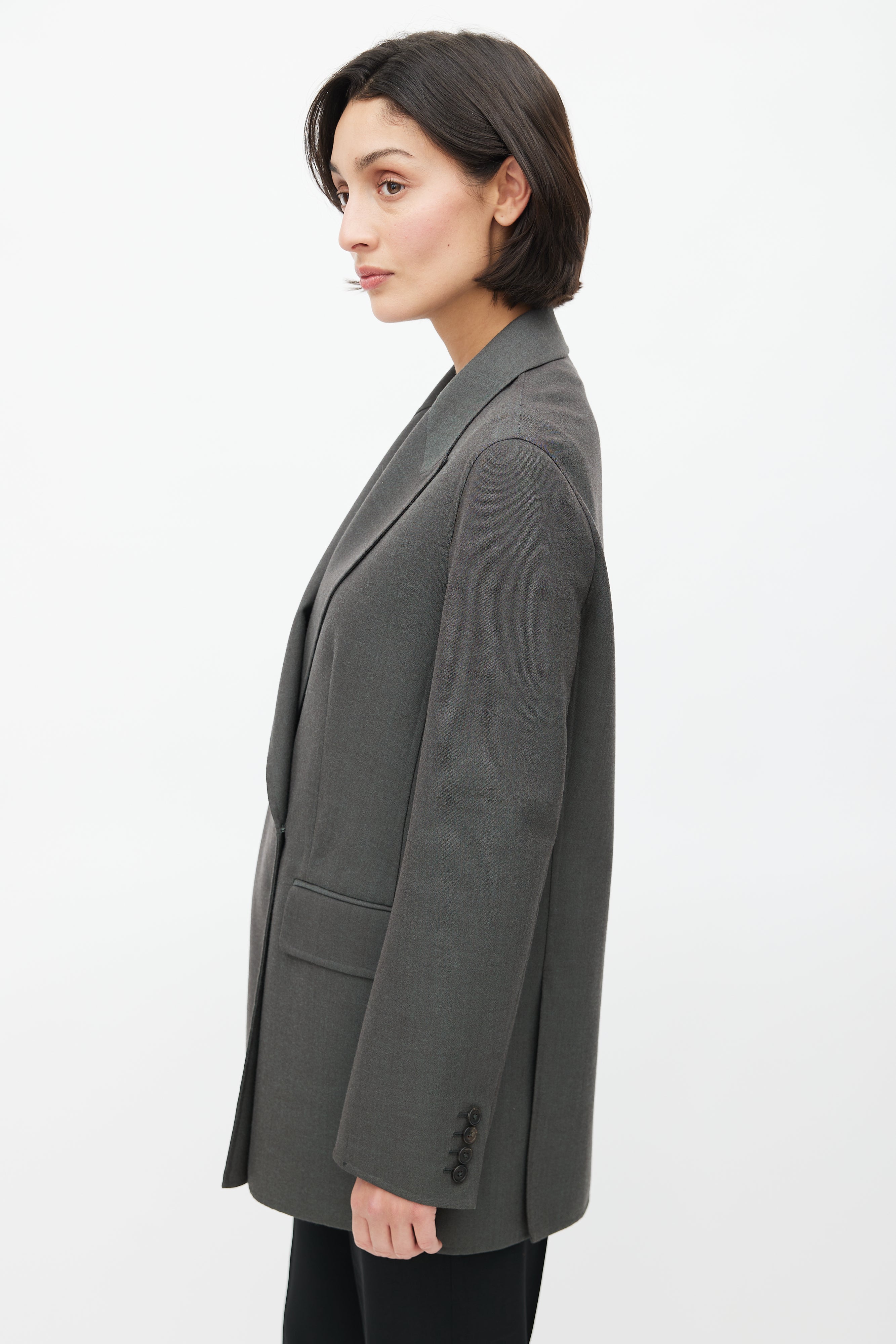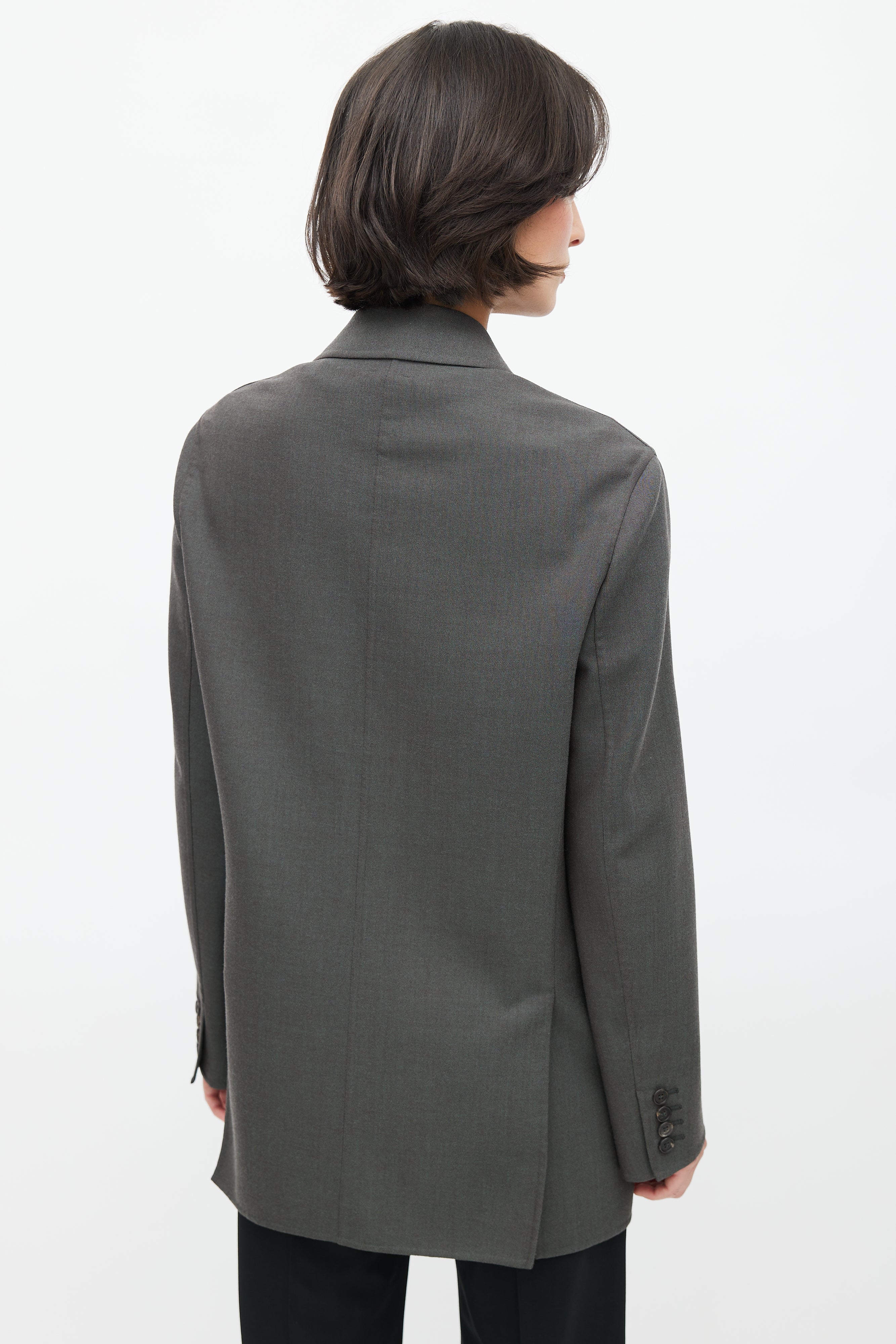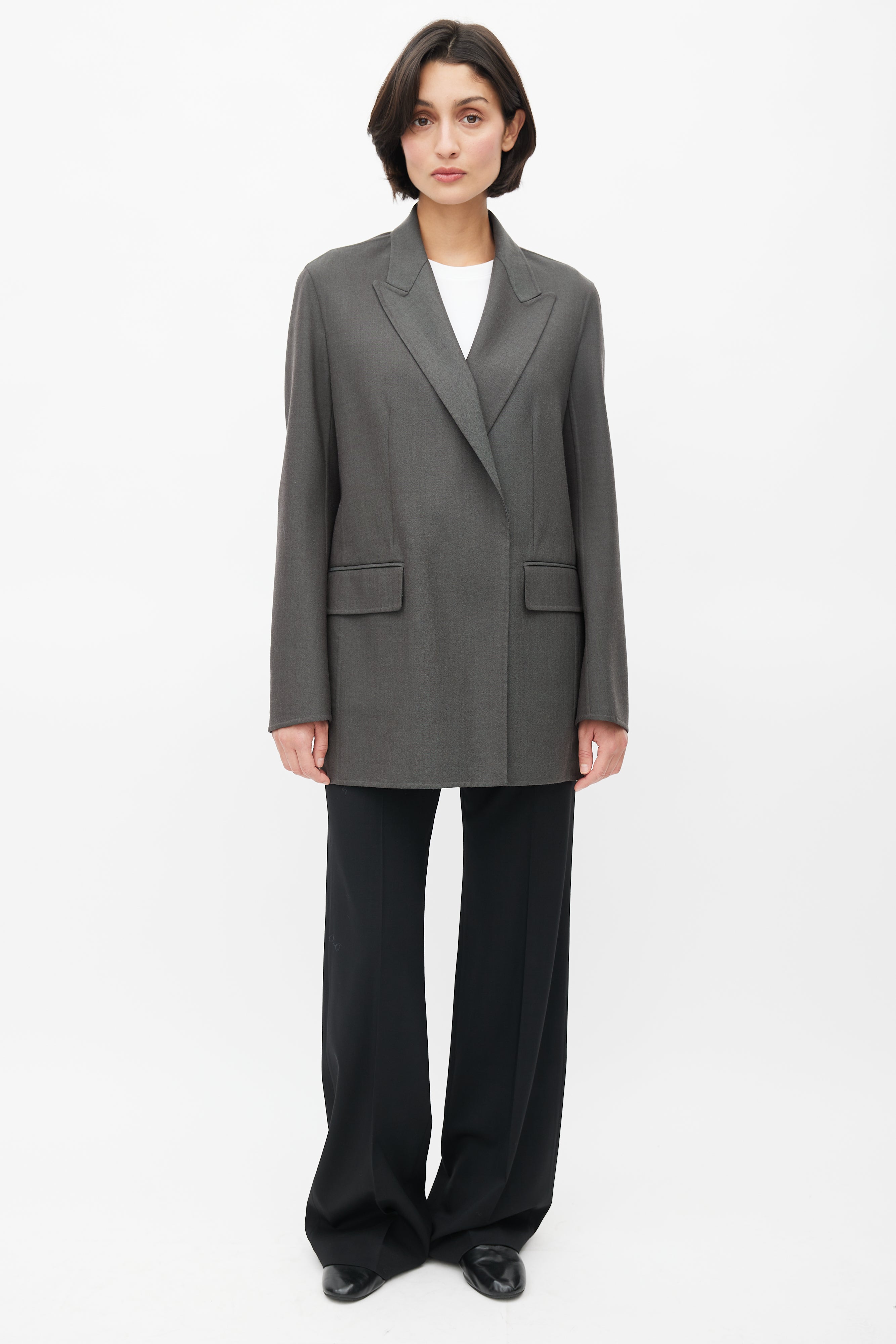 Pre-owned The Row grey wool blazer featuring a peak lapel, long sleeves with buttoned cuffs, two flap pockets at hip, and button up front with hook and eye closure. Lined.