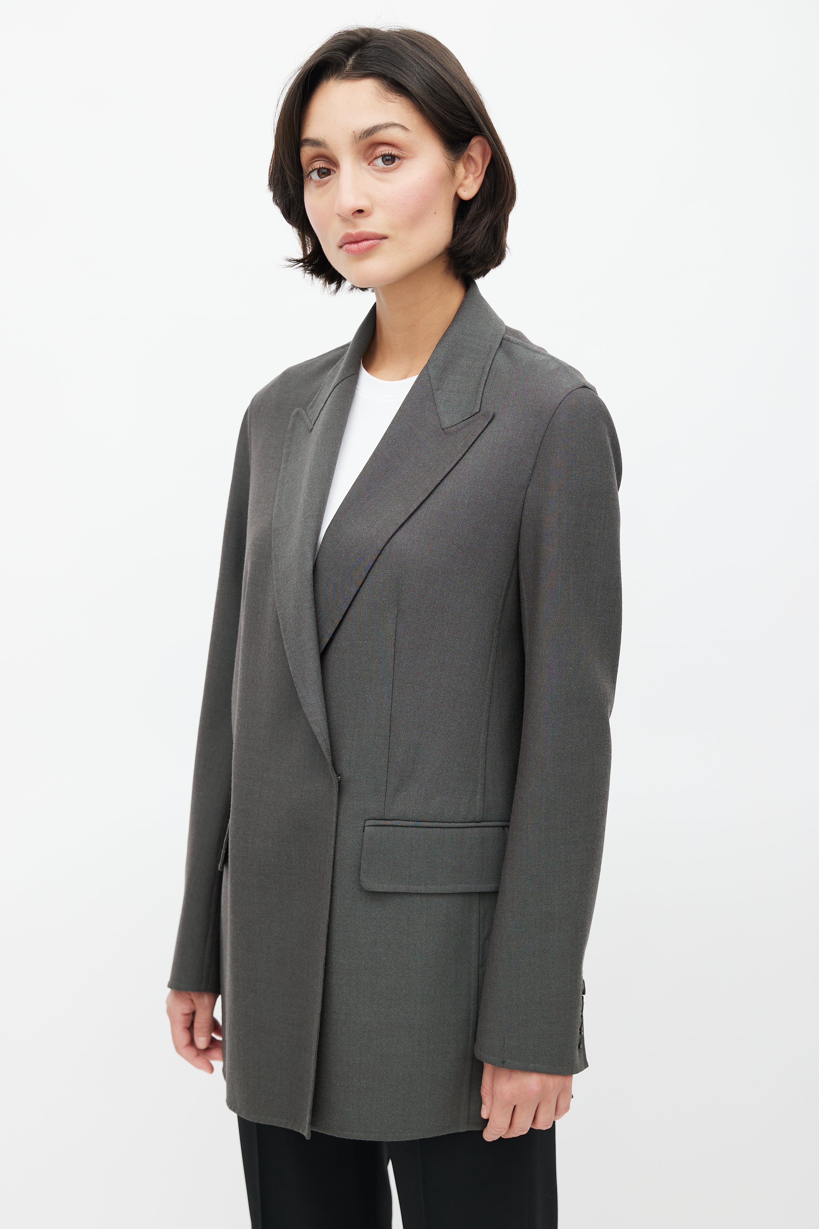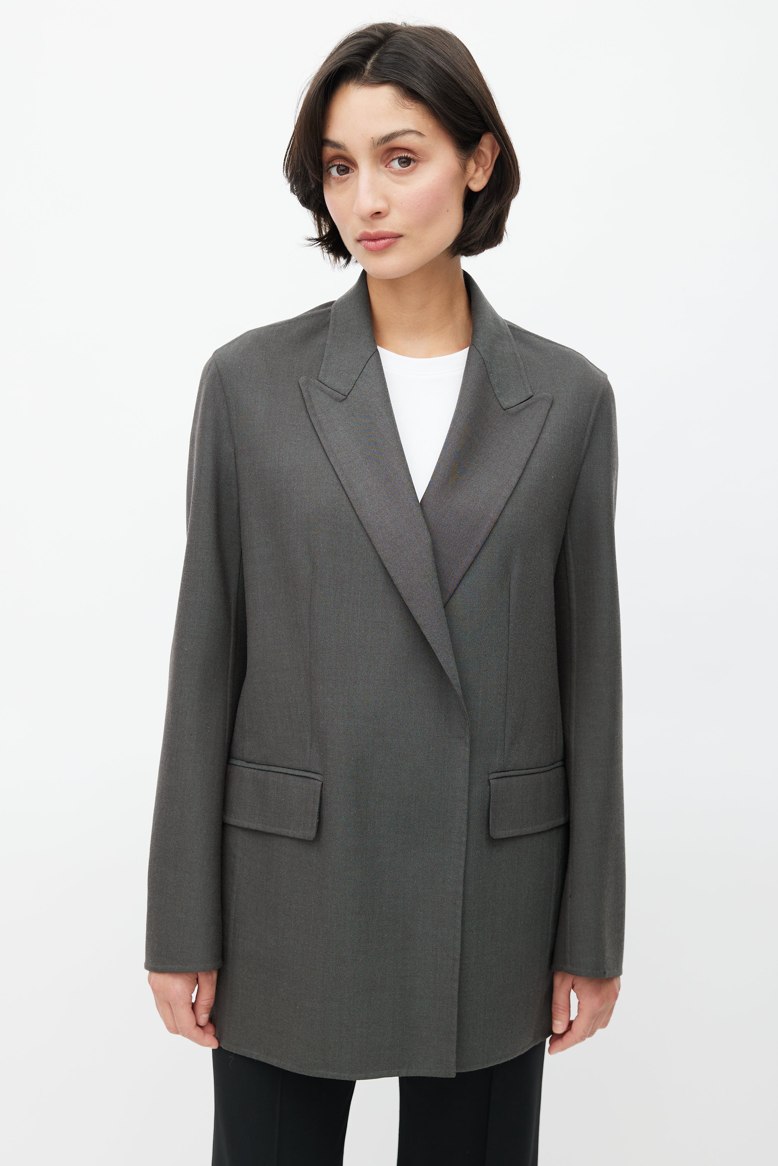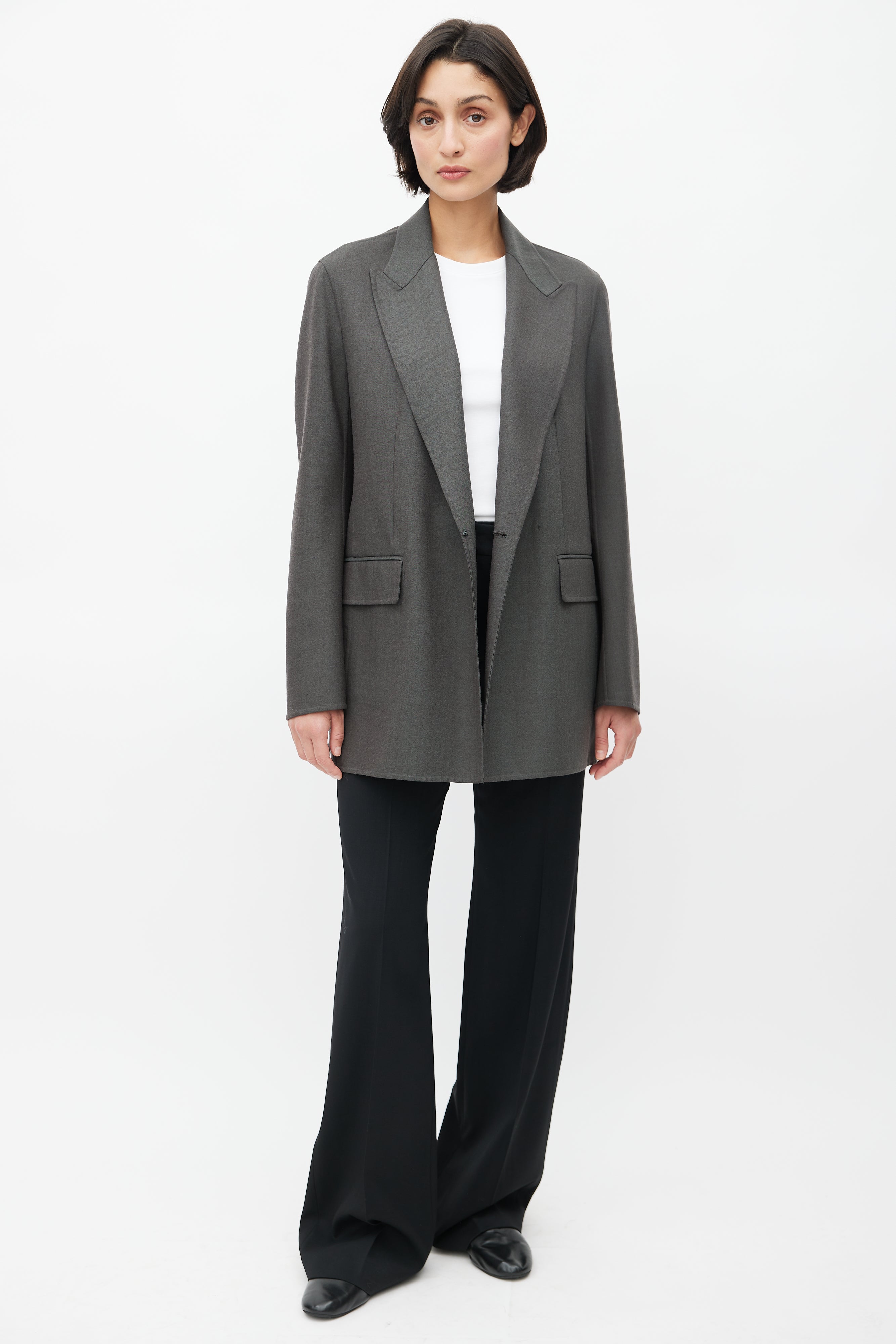 Pre-owned The Row grey wool blazer featuring a peak lapel, long sleeves with buttoned cuffs, two flap pockets at hip, and button up front with hook and eye closure. Lined.