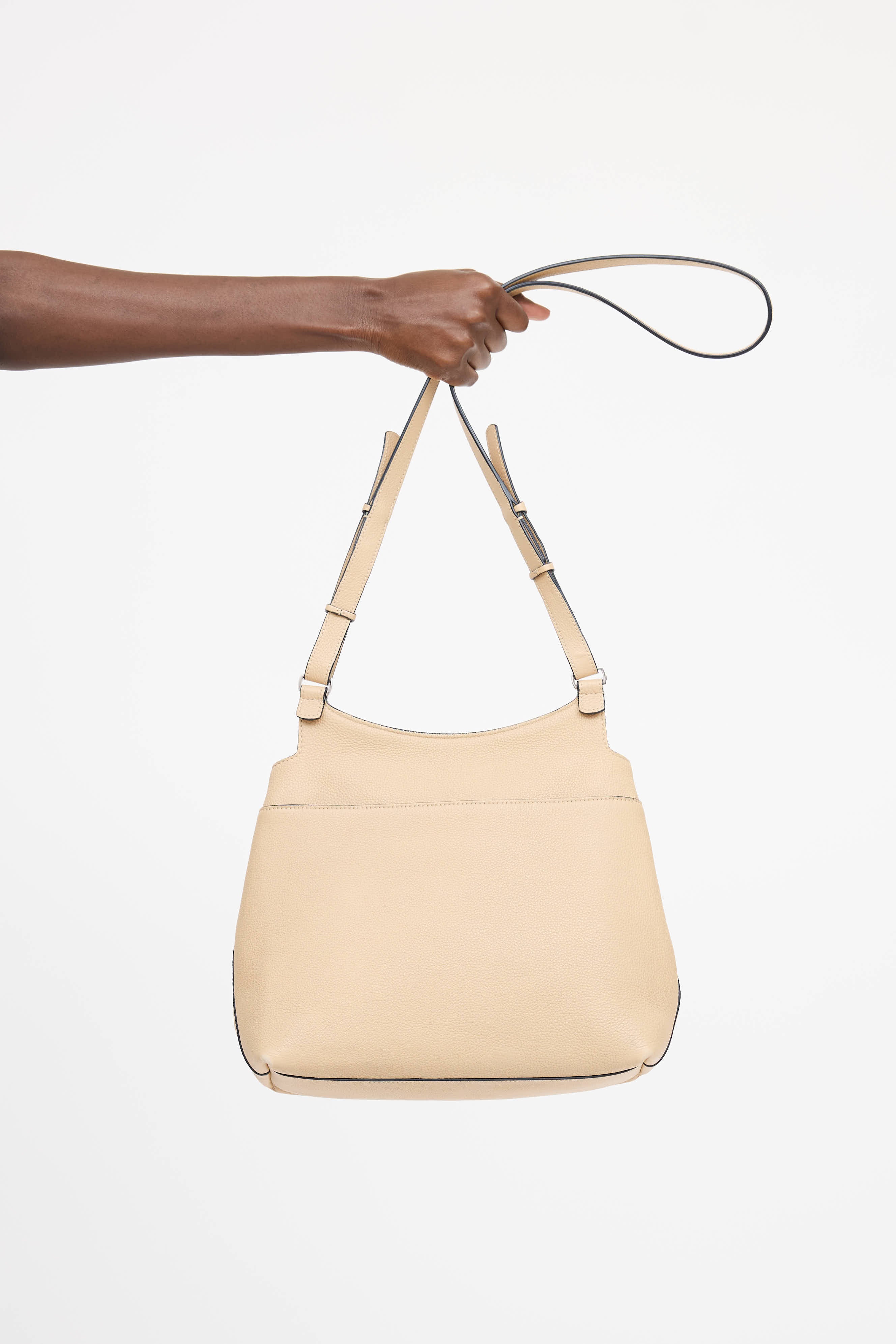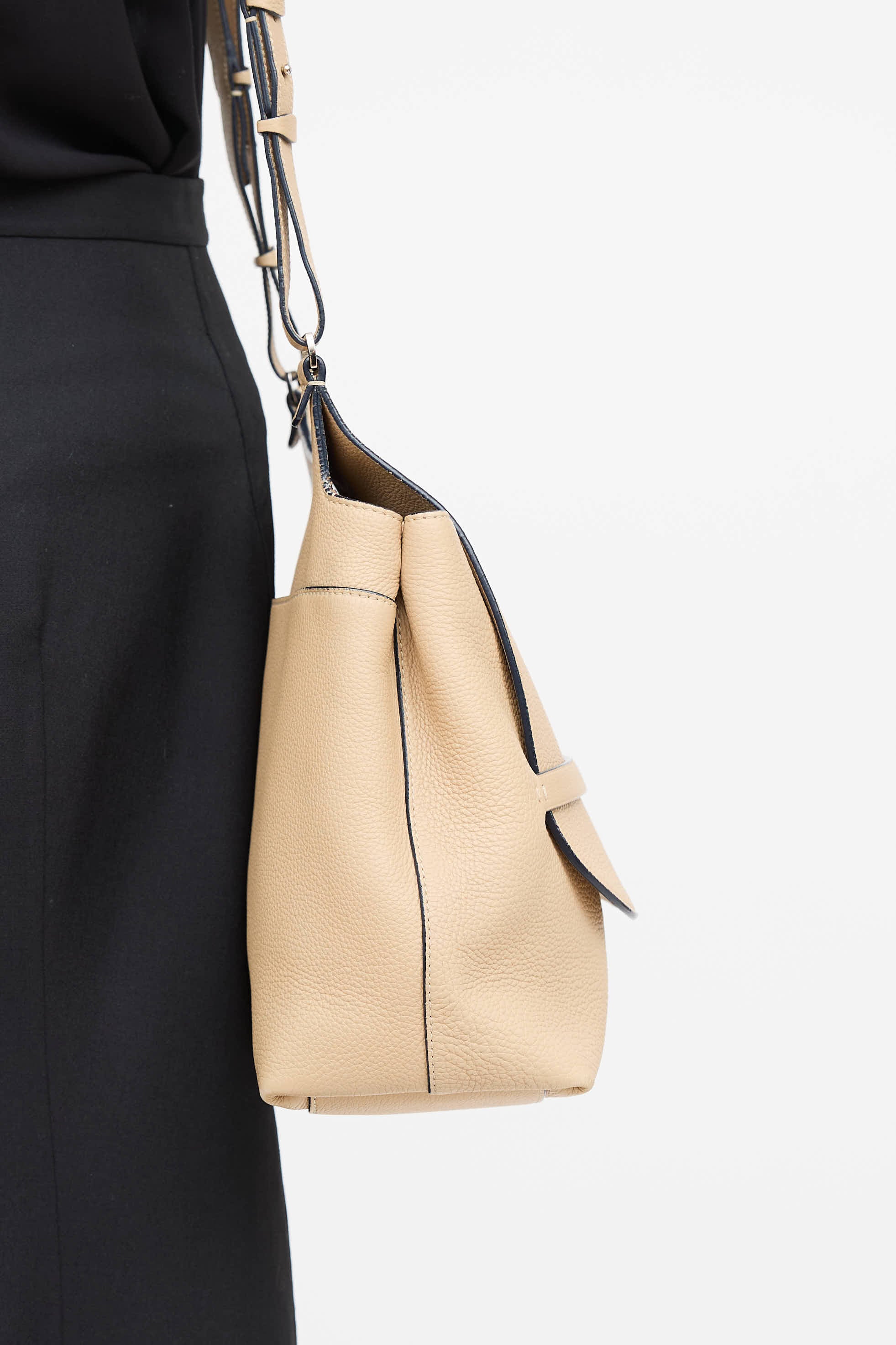 Pre-owned The Row Sideby shoulder bag in beige leather featuring adjustable shoulder strap, exterior slip pocket, front slip flap closure, multiple interior slip pockets, lined interior, and interior zip pocket.