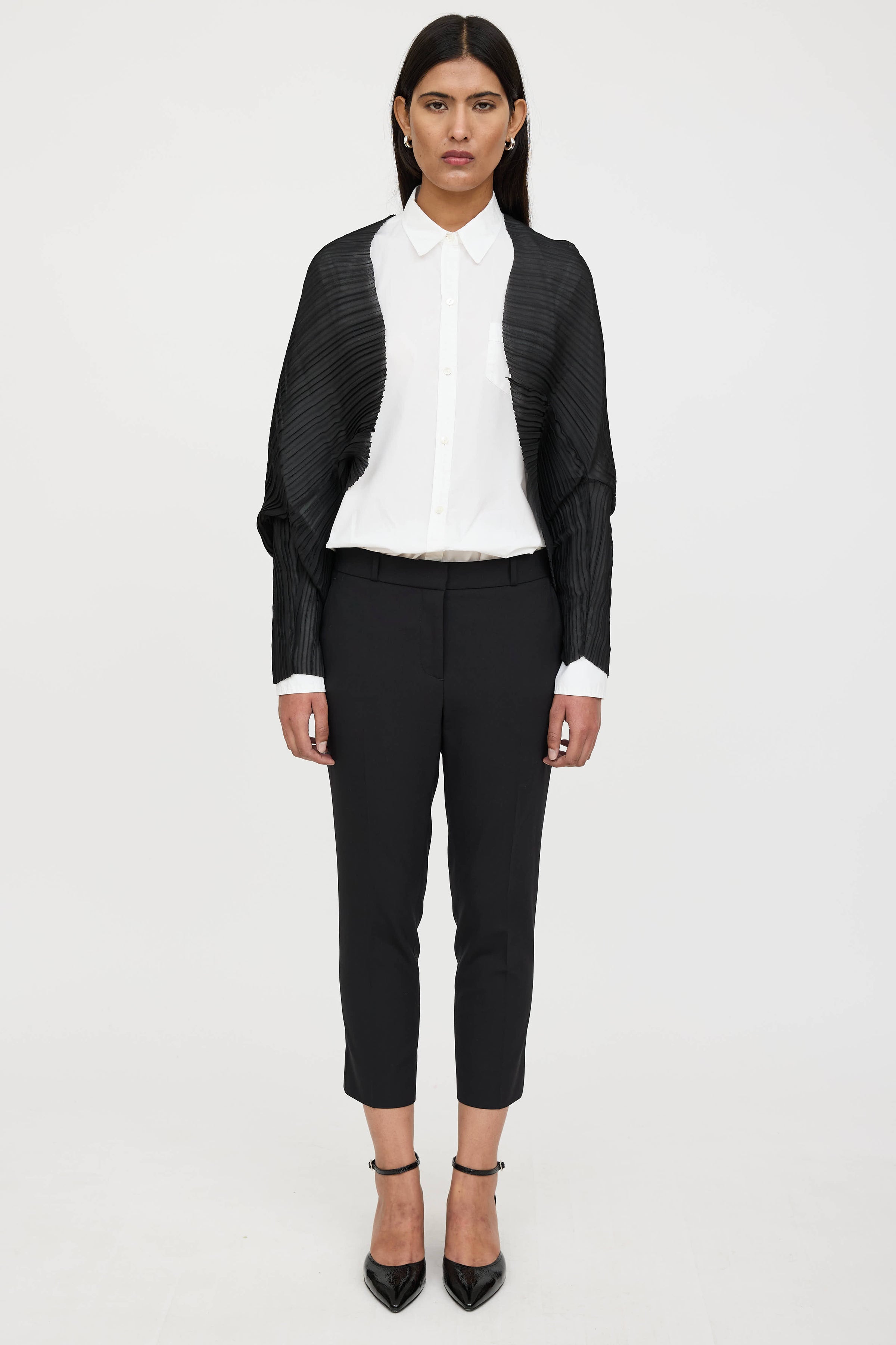 Pre-owned The Row black wool trousers featuring two slip pockets at hip, two welt pockets at back, slim cropped leg, and zip fly with hook and eye closure. Lined.