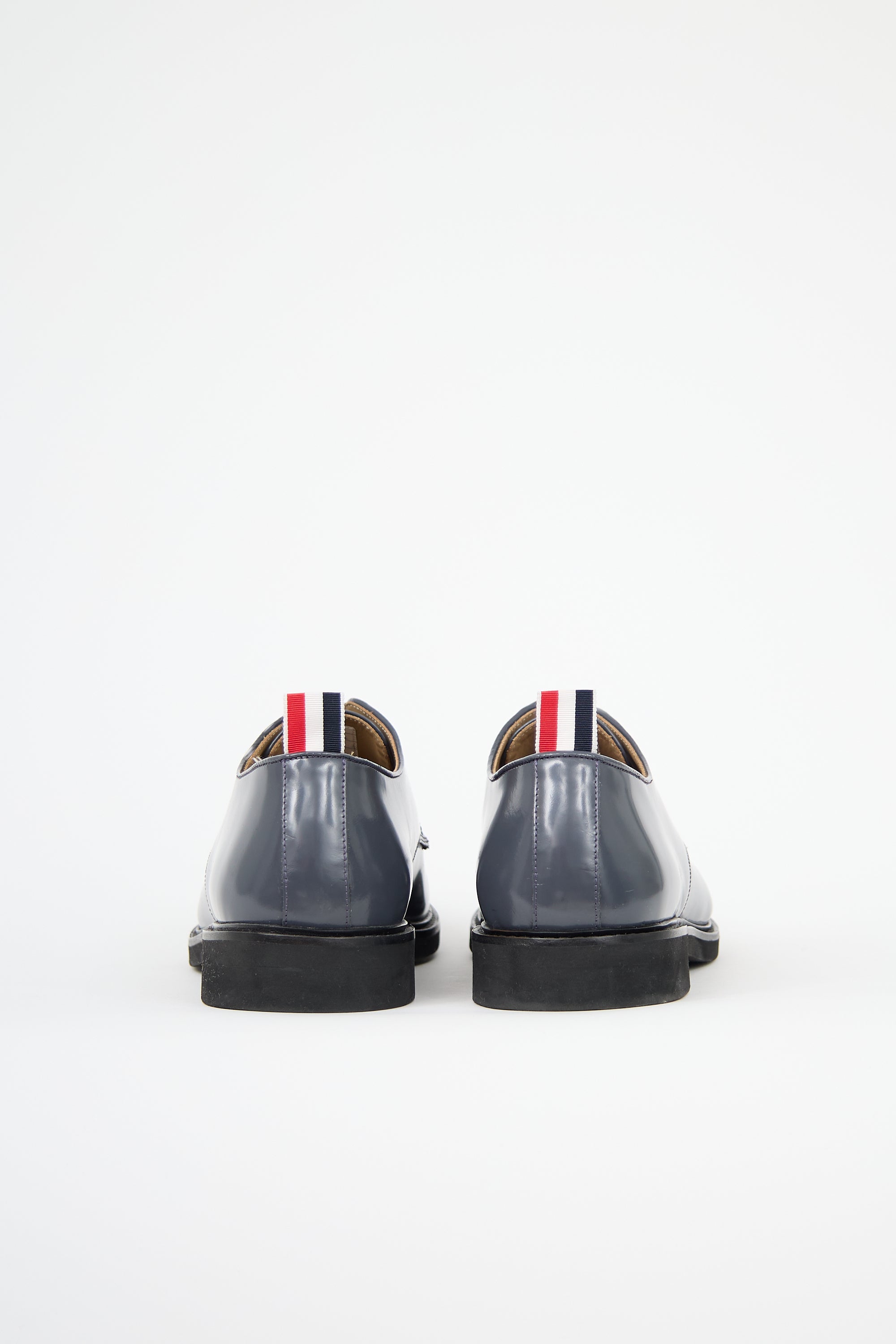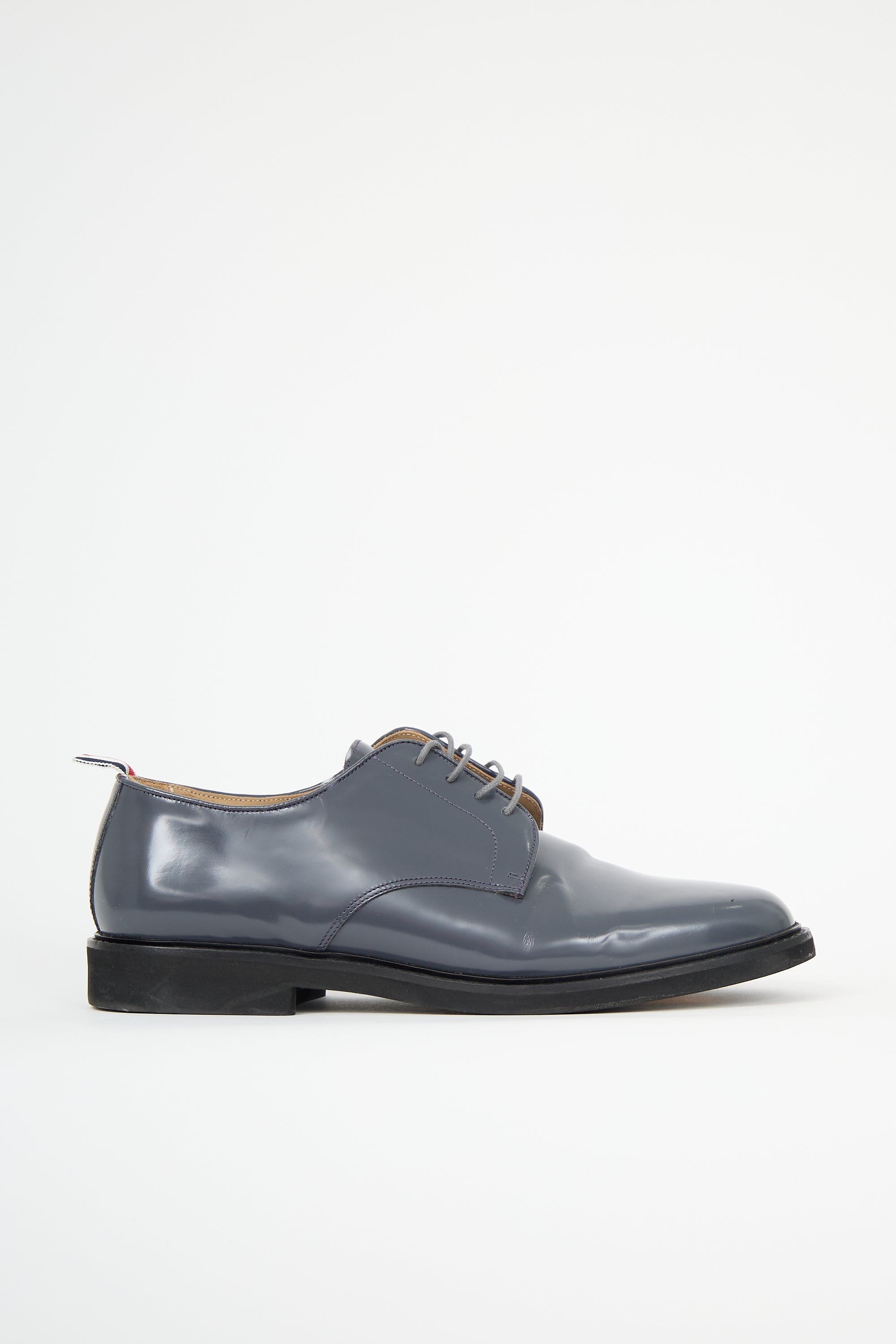 Pre-owned Thom Browne dark grey patent leather derbies featuring rounded toe, tonal stitching, lace up vamp, and signature striped pull tab at counter.