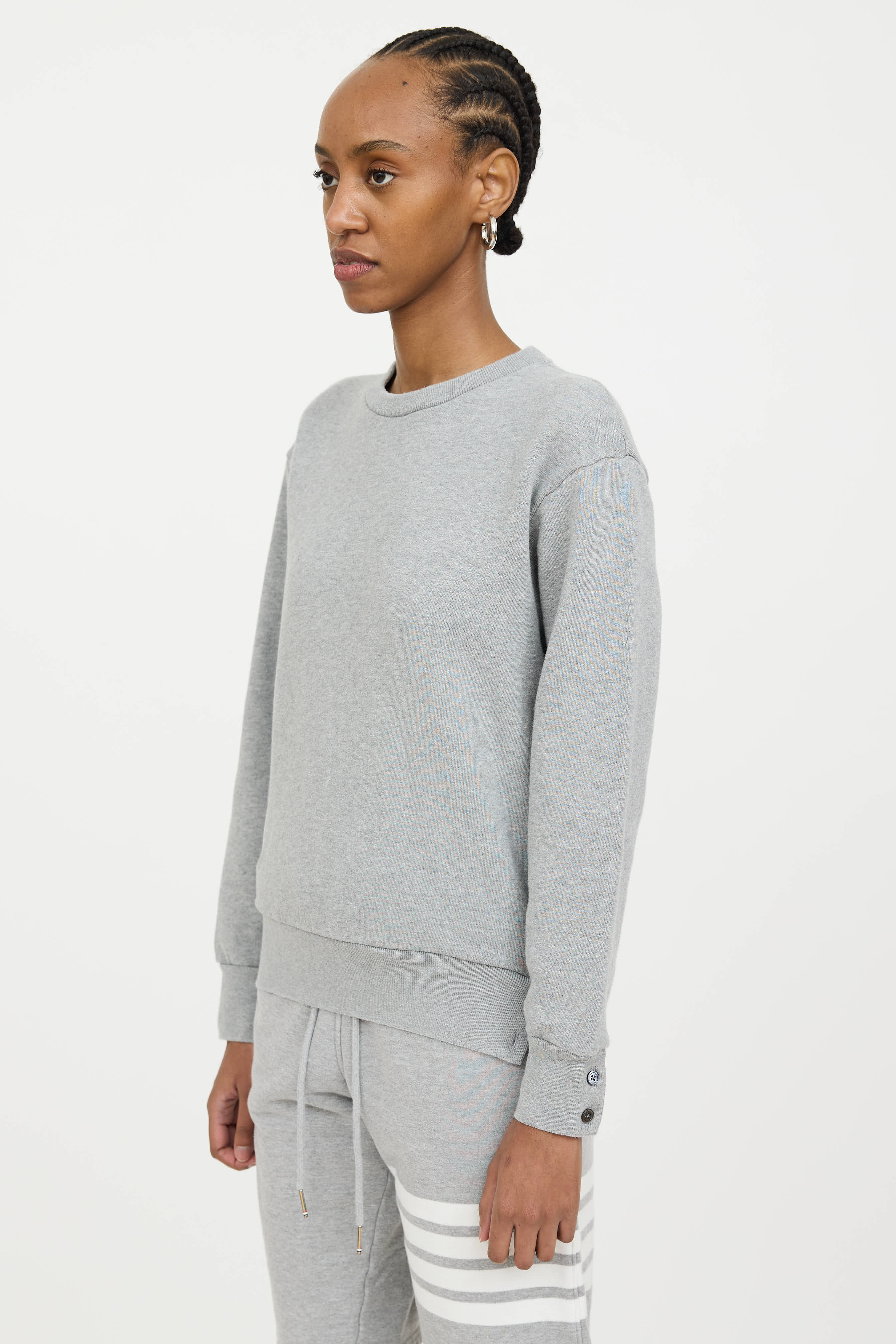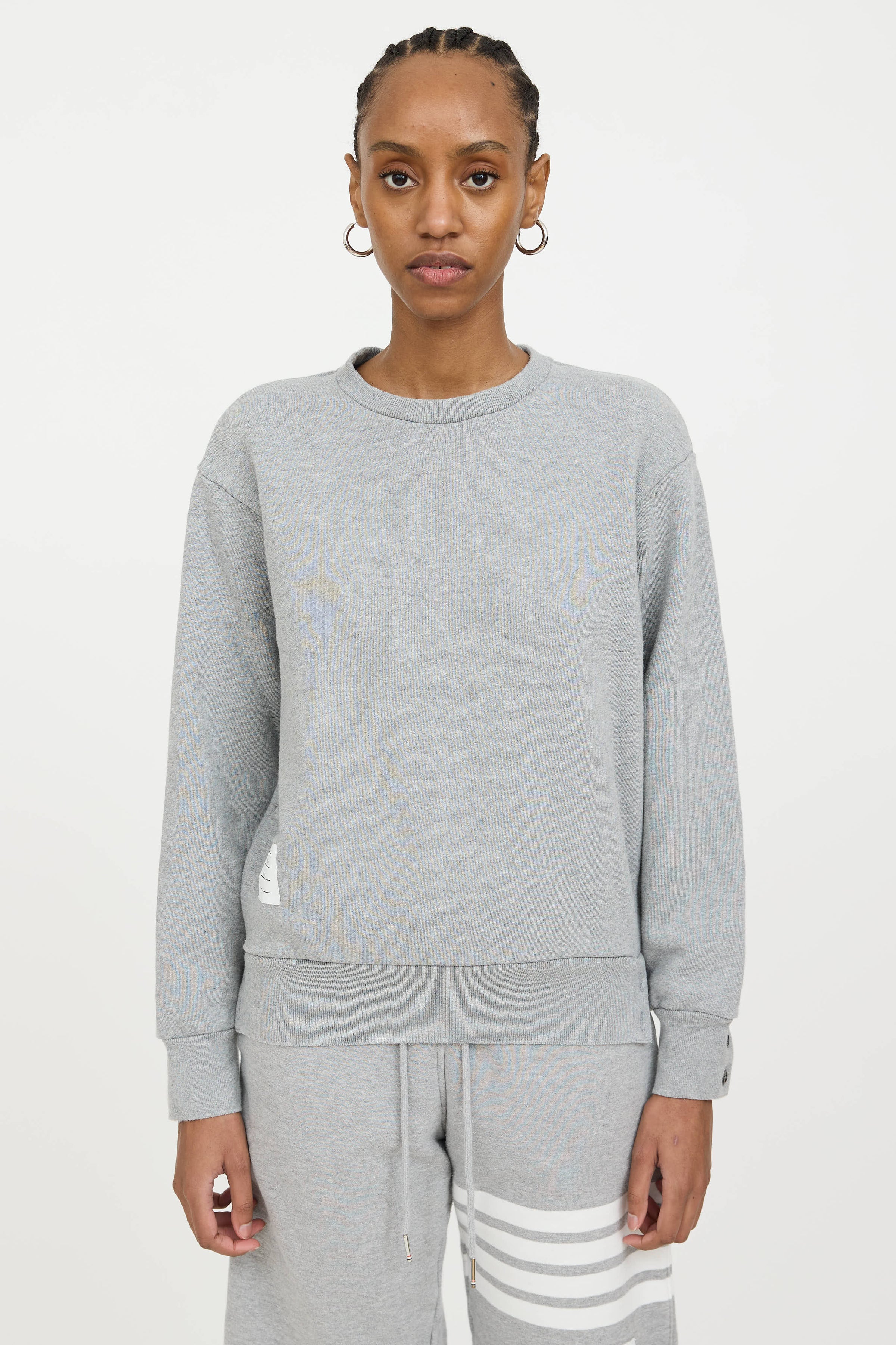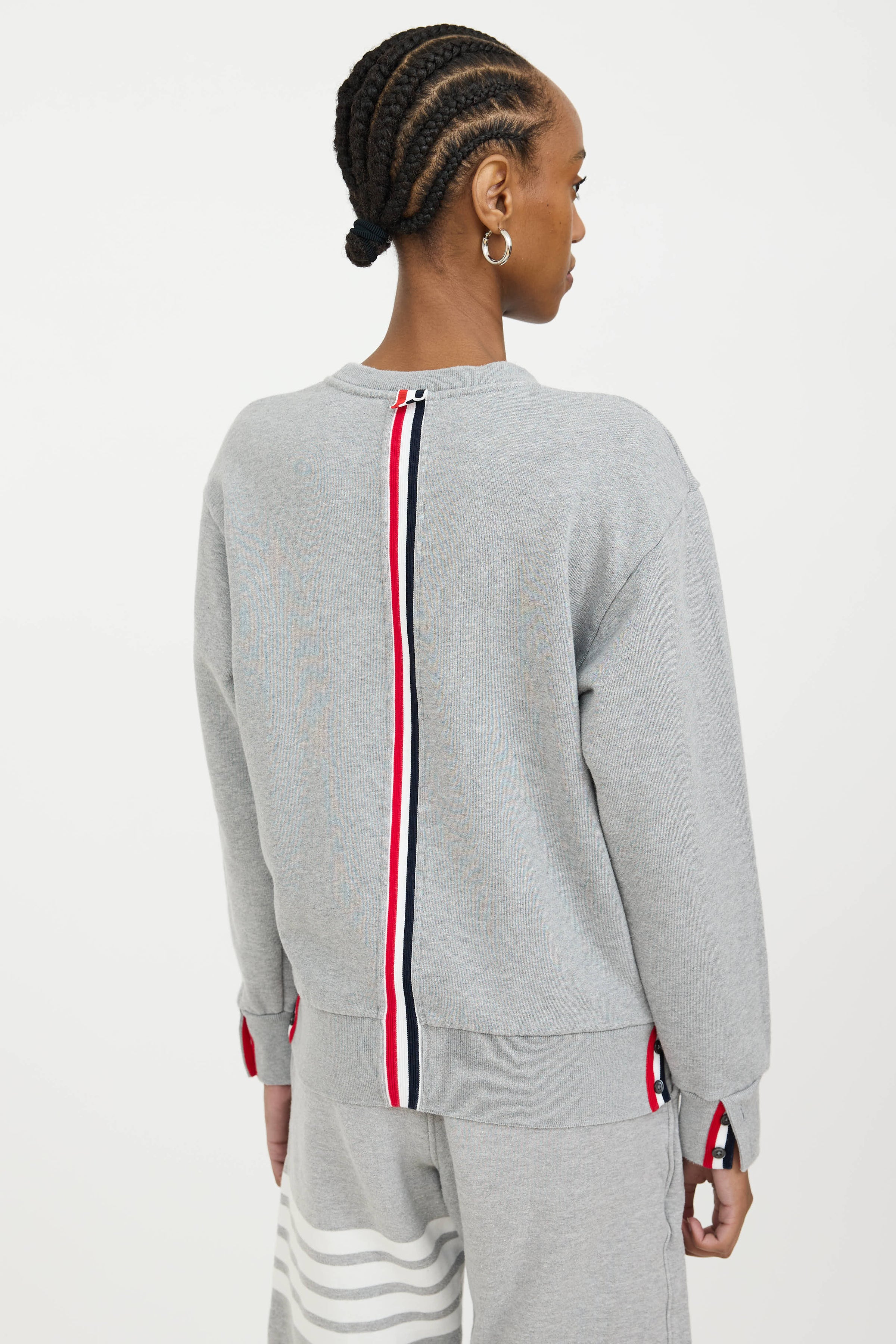 Pre-owned Thom Browne grey sweatshirt featuring a crew neckline, long sleeves with buttoned cuffs, logo patch at hip, signature tricolour webbed stripe at back, and ribbed hem.
