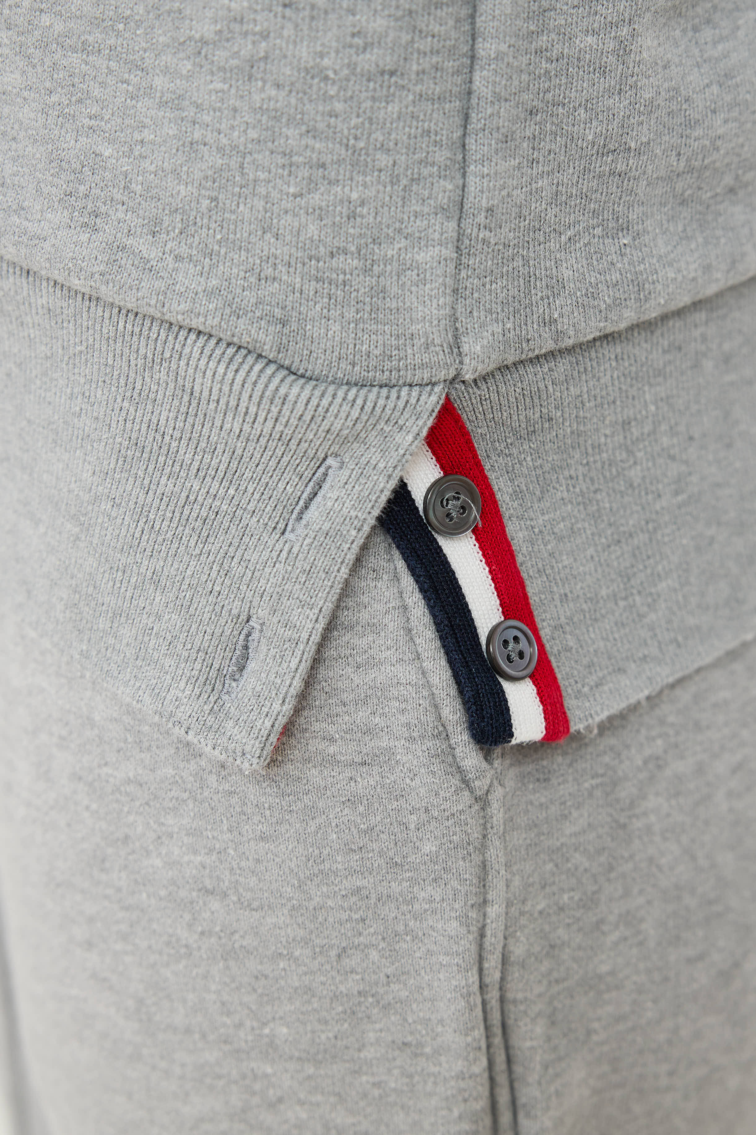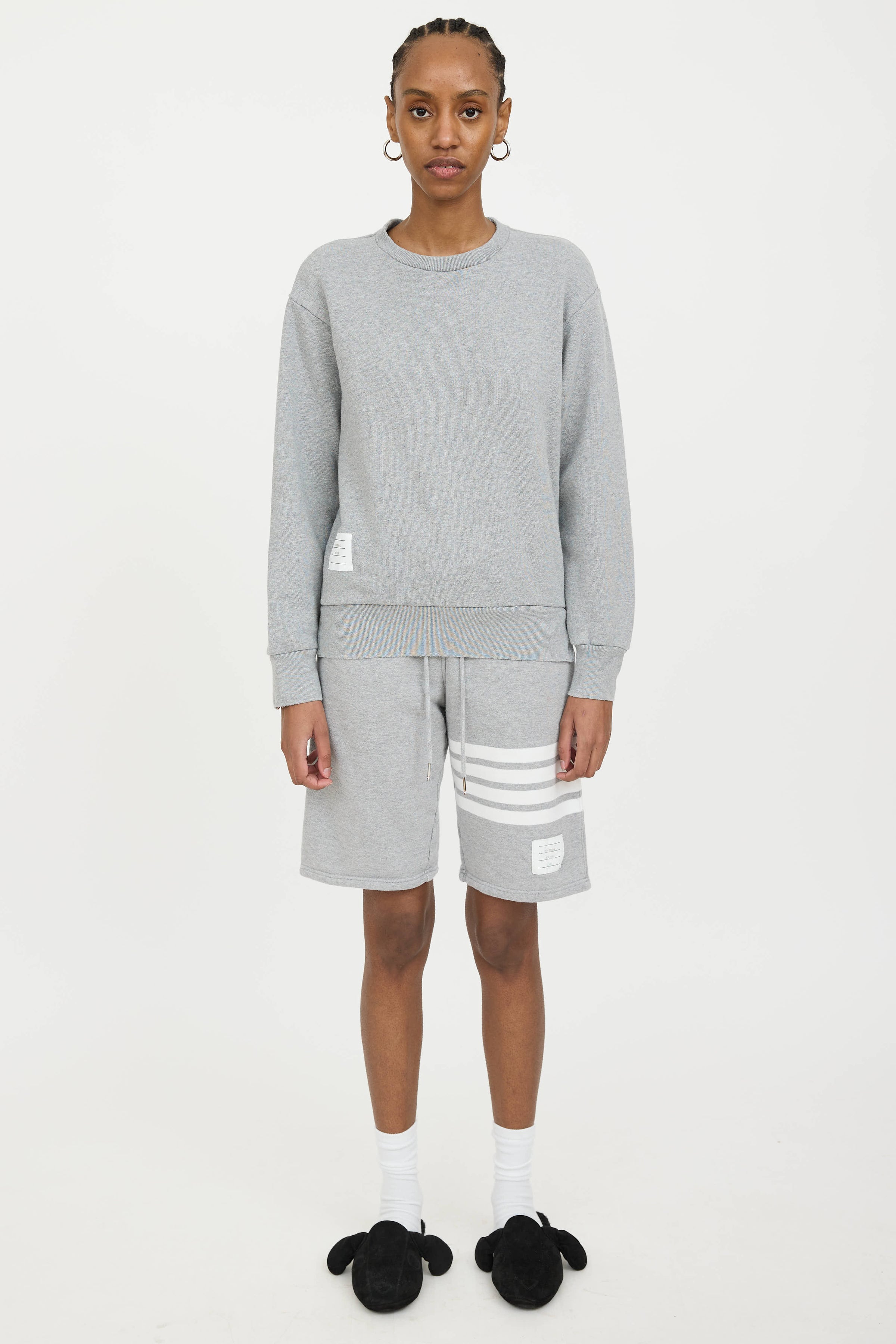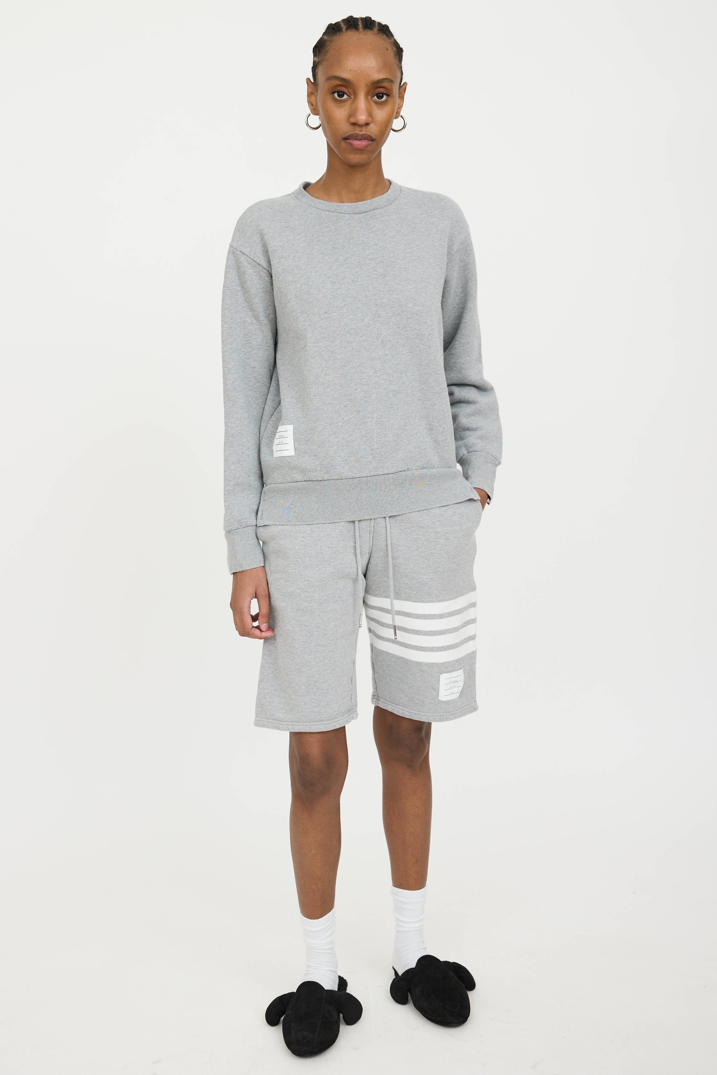Pre-owned Thom Browne grey sweatshirt featuring a crew neckline, long sleeves with buttoned cuffs, logo patch at hip, signature tricolour webbed stripe at back, and ribbed hem.