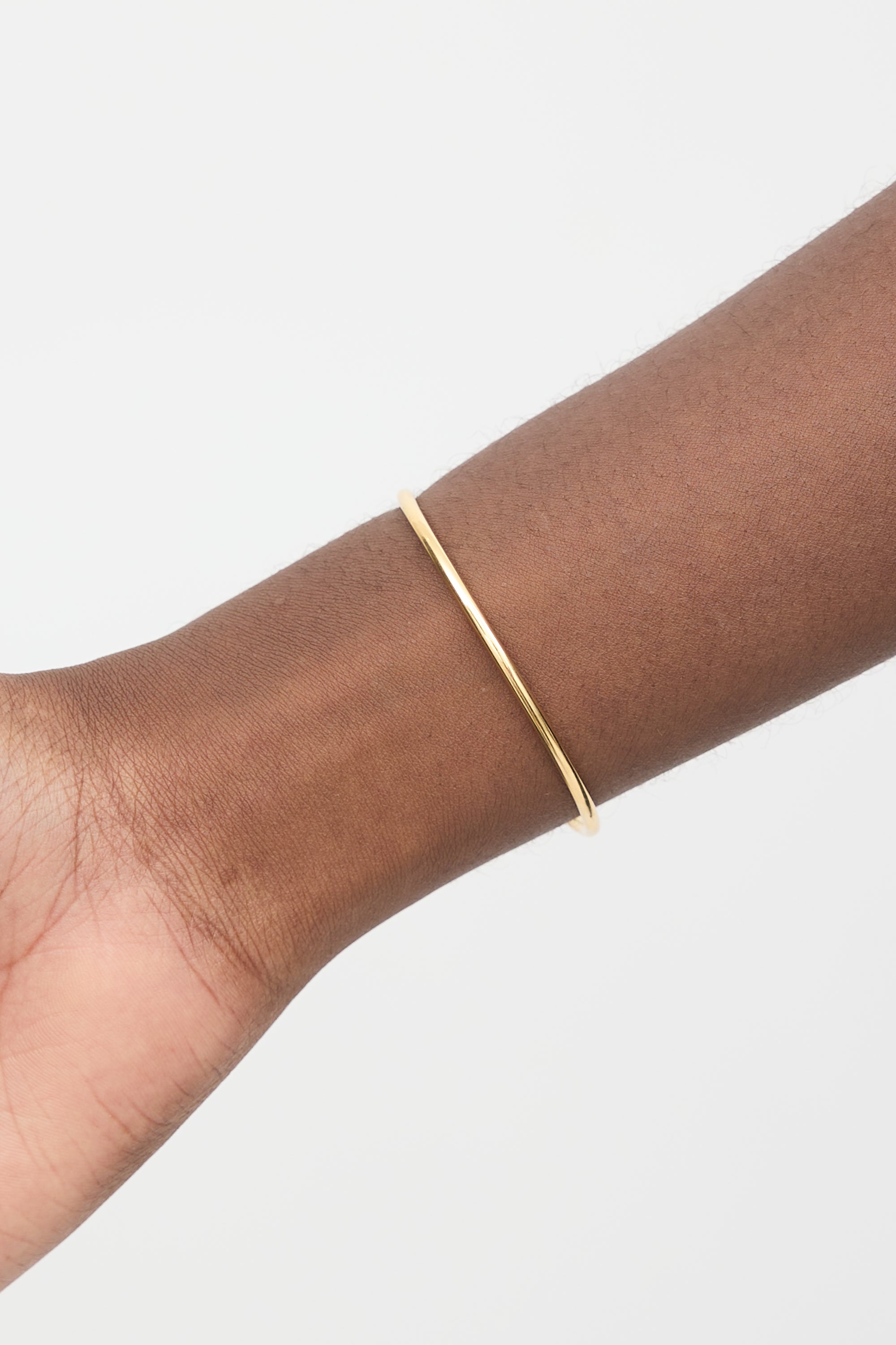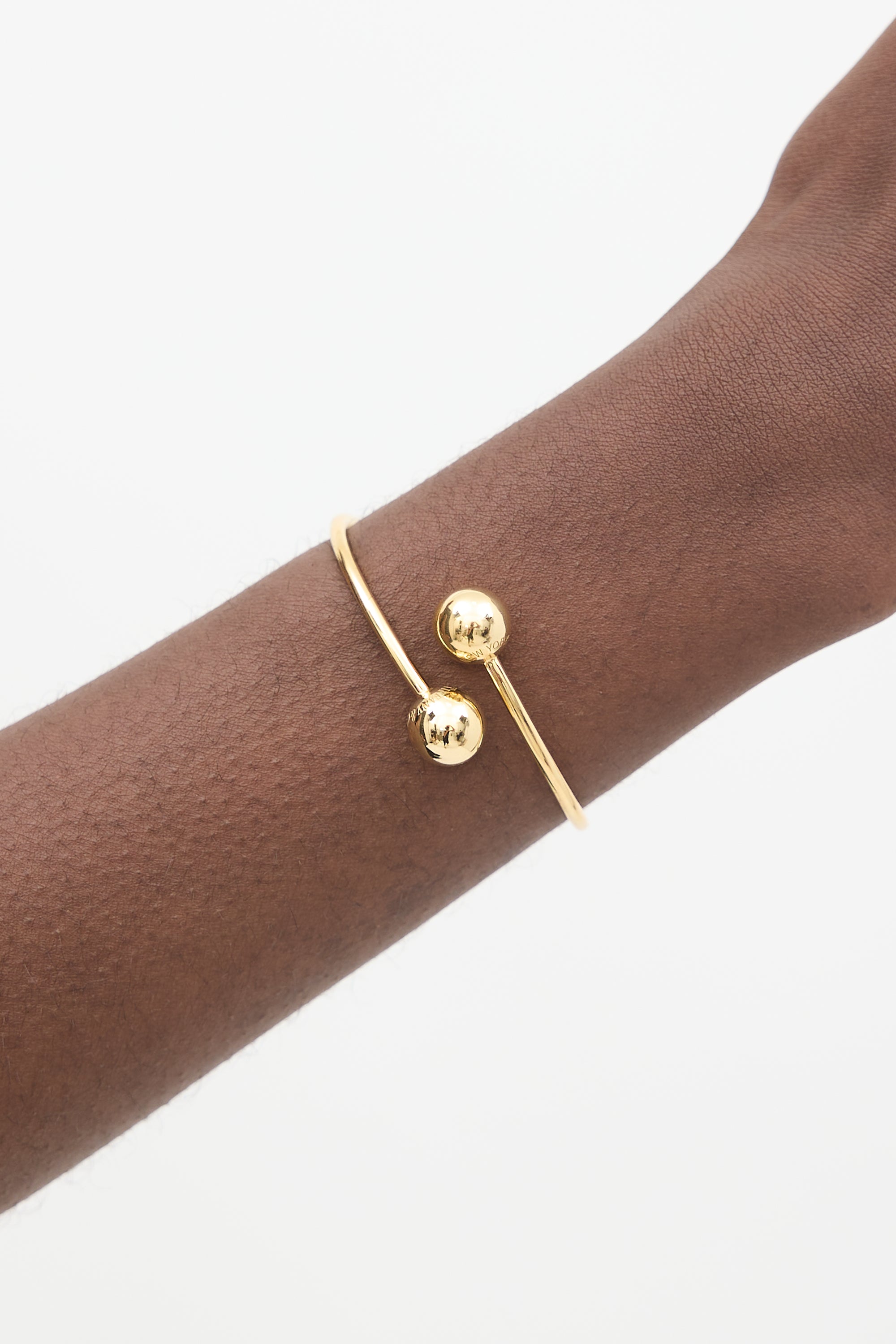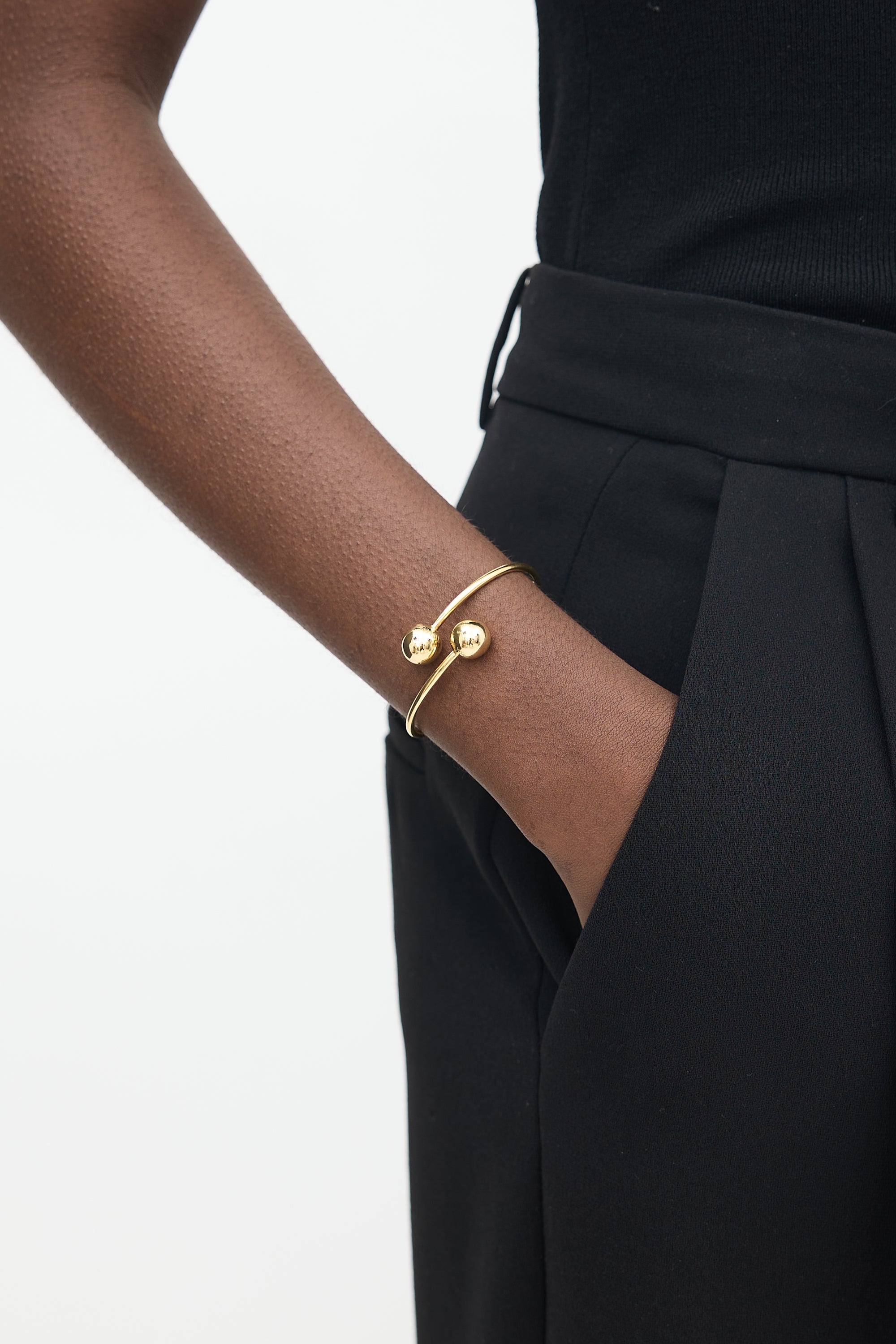 Pre-owned Tiffany & Co. 18k gold HardWear Ball Bypass bangle featuring thin band, two ball charm, and engraved logo. Comes with original dust bag.