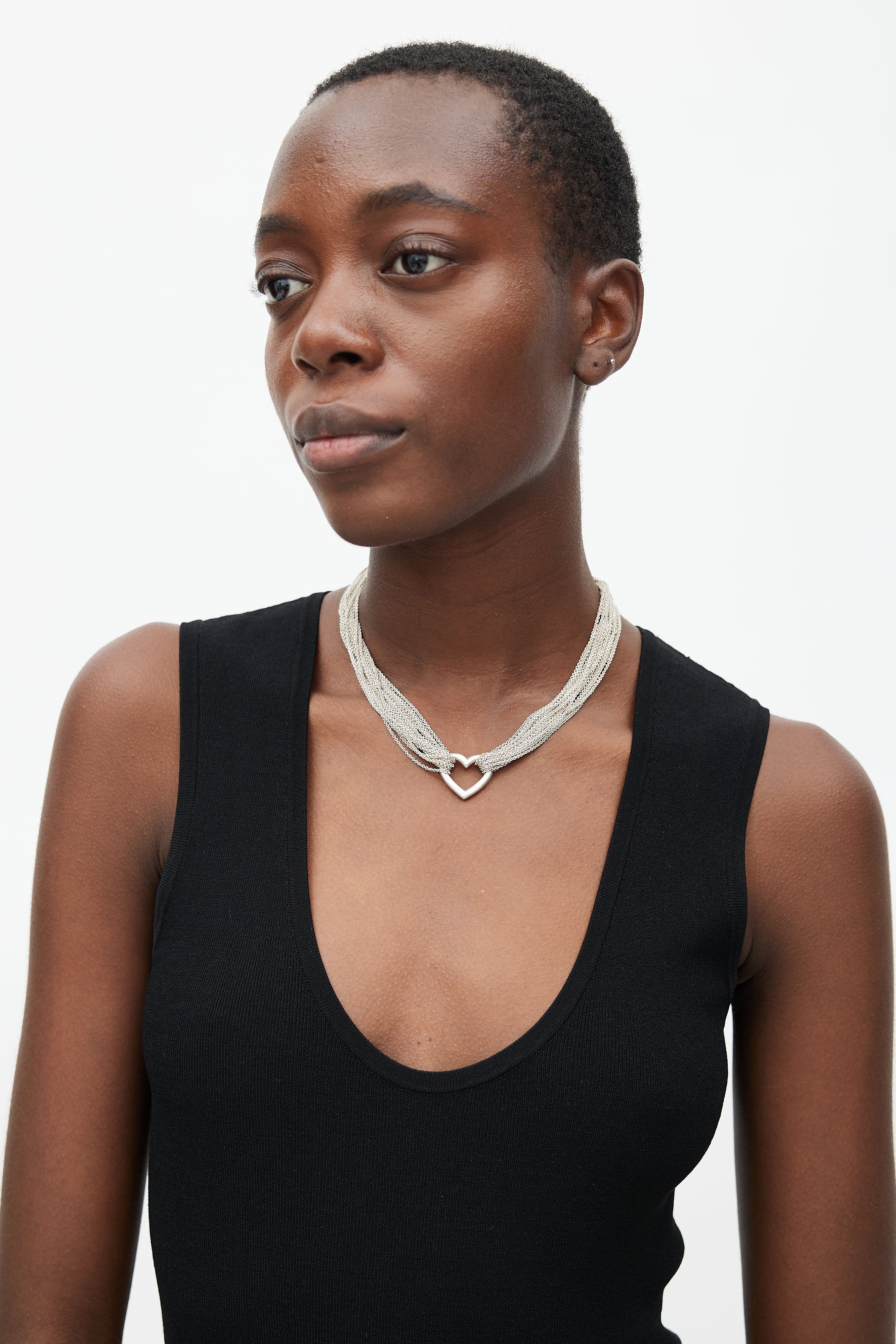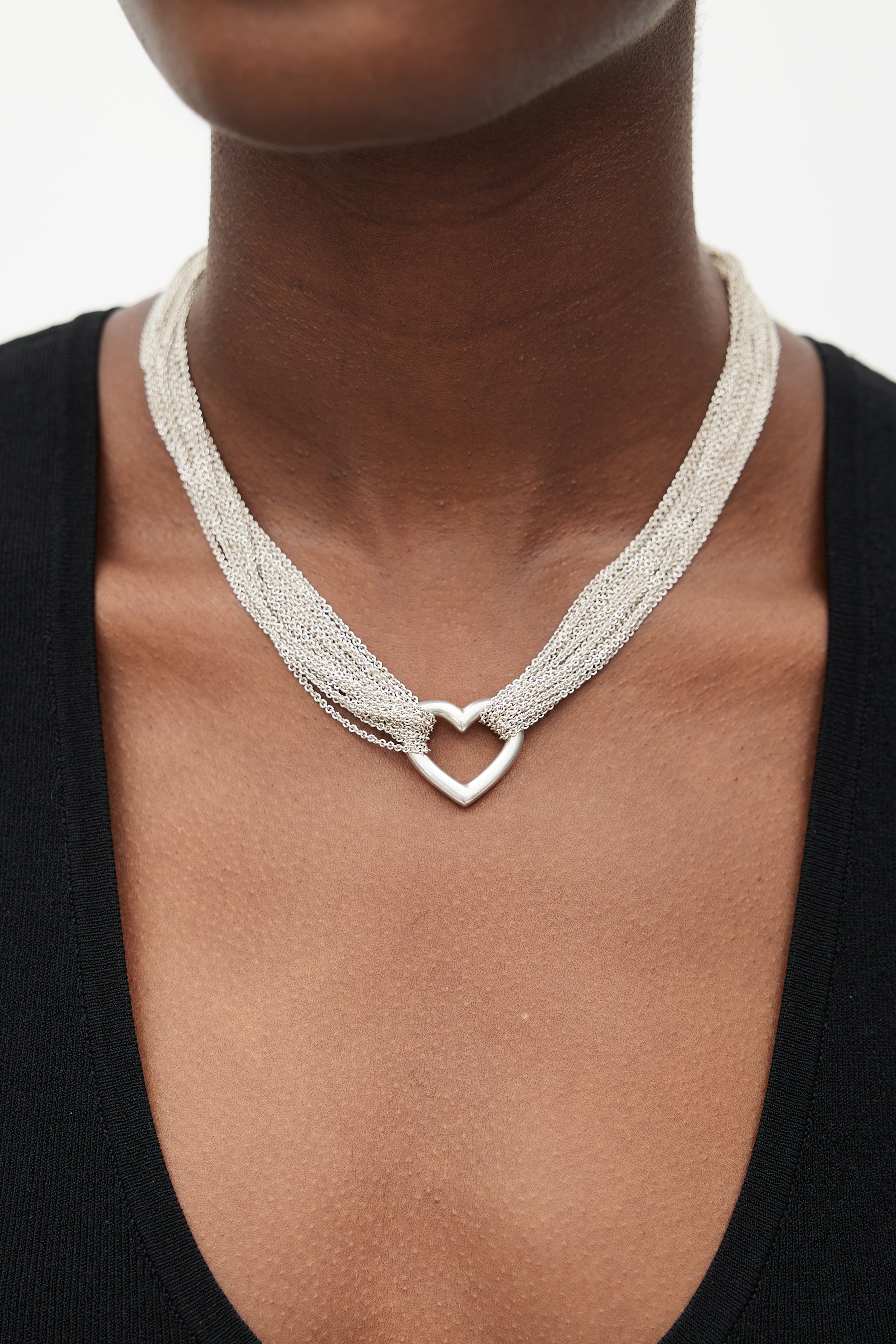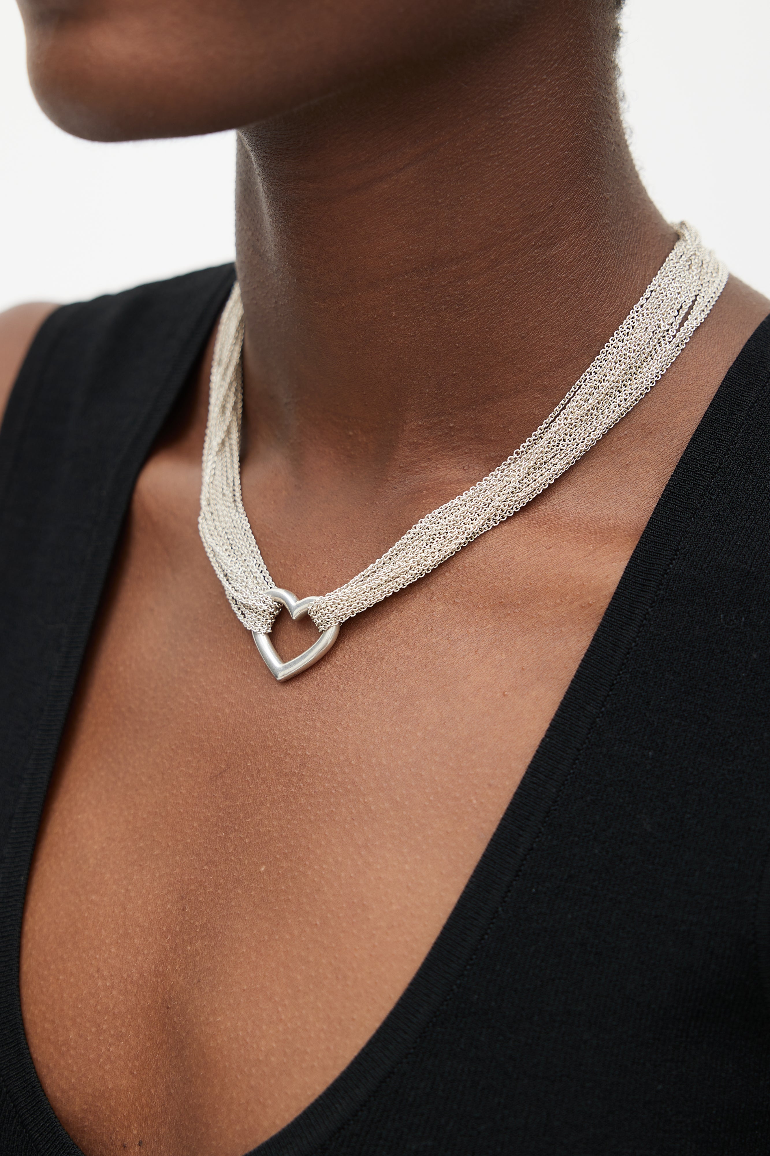 Pre-owned Tiffany & Co. silver necklace featuring stacked mesh sterling silver cable link chains, cut out heart pendant, and toggle clasp closure.