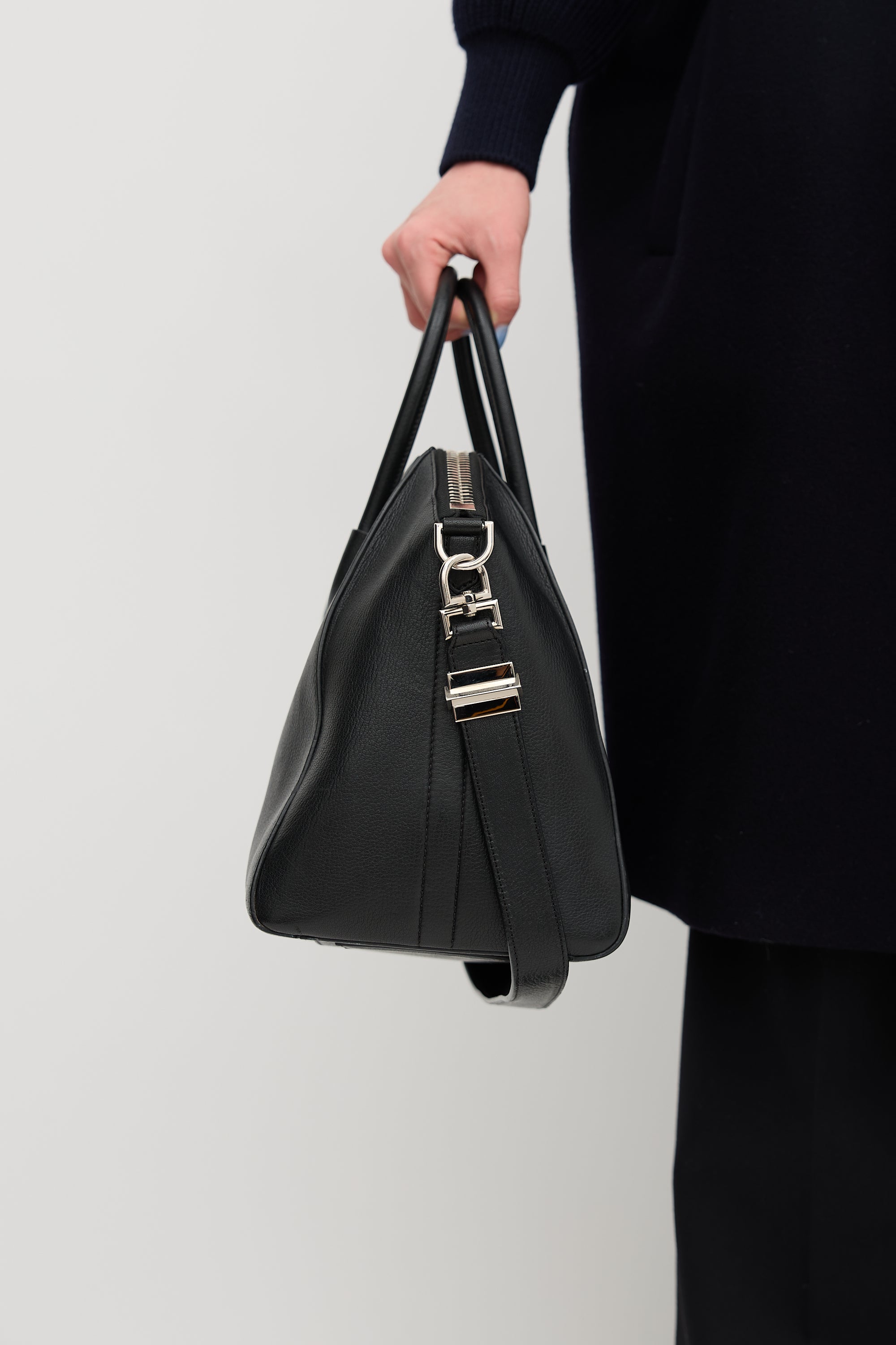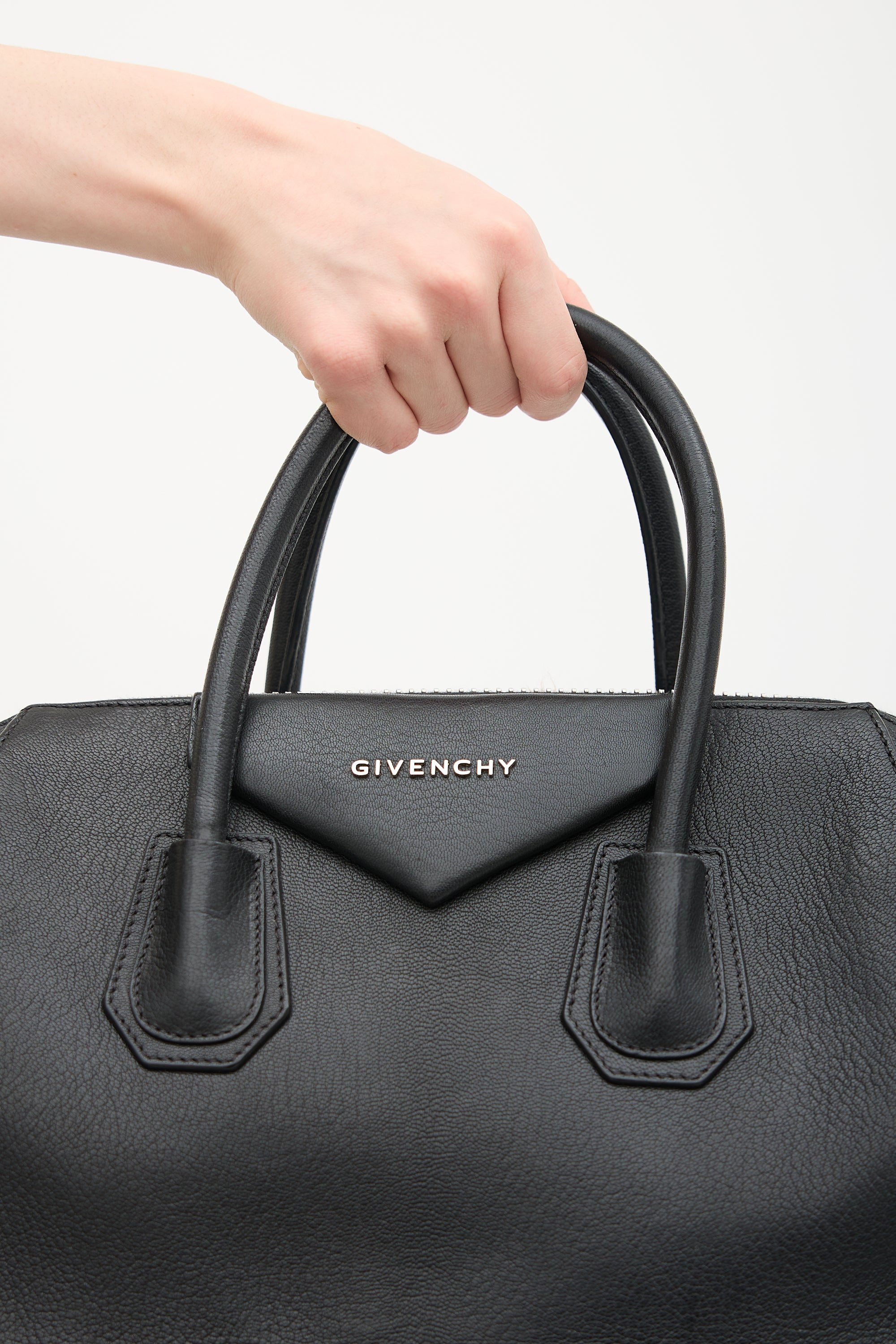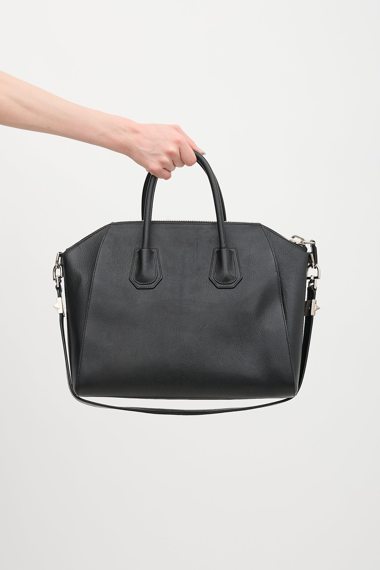Pre-owned Givenchy black leather medium Antigona bag featuring dual rolled top handles, detachable shoulder strap with stud detail, silver tone hardware, logo hardware at face, top zip closure, one main compartment, two interior slip pockets, and one interior zip pocket.