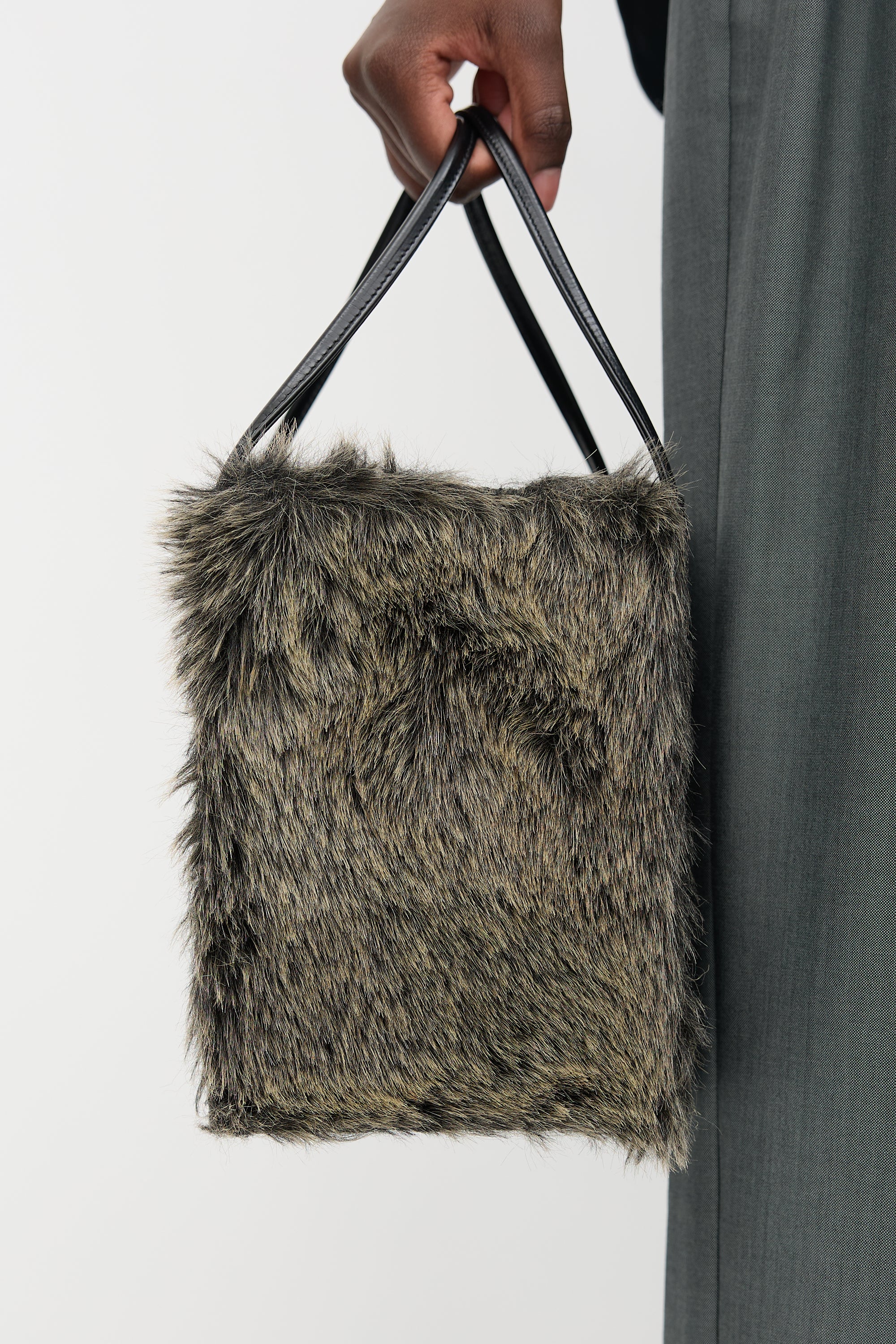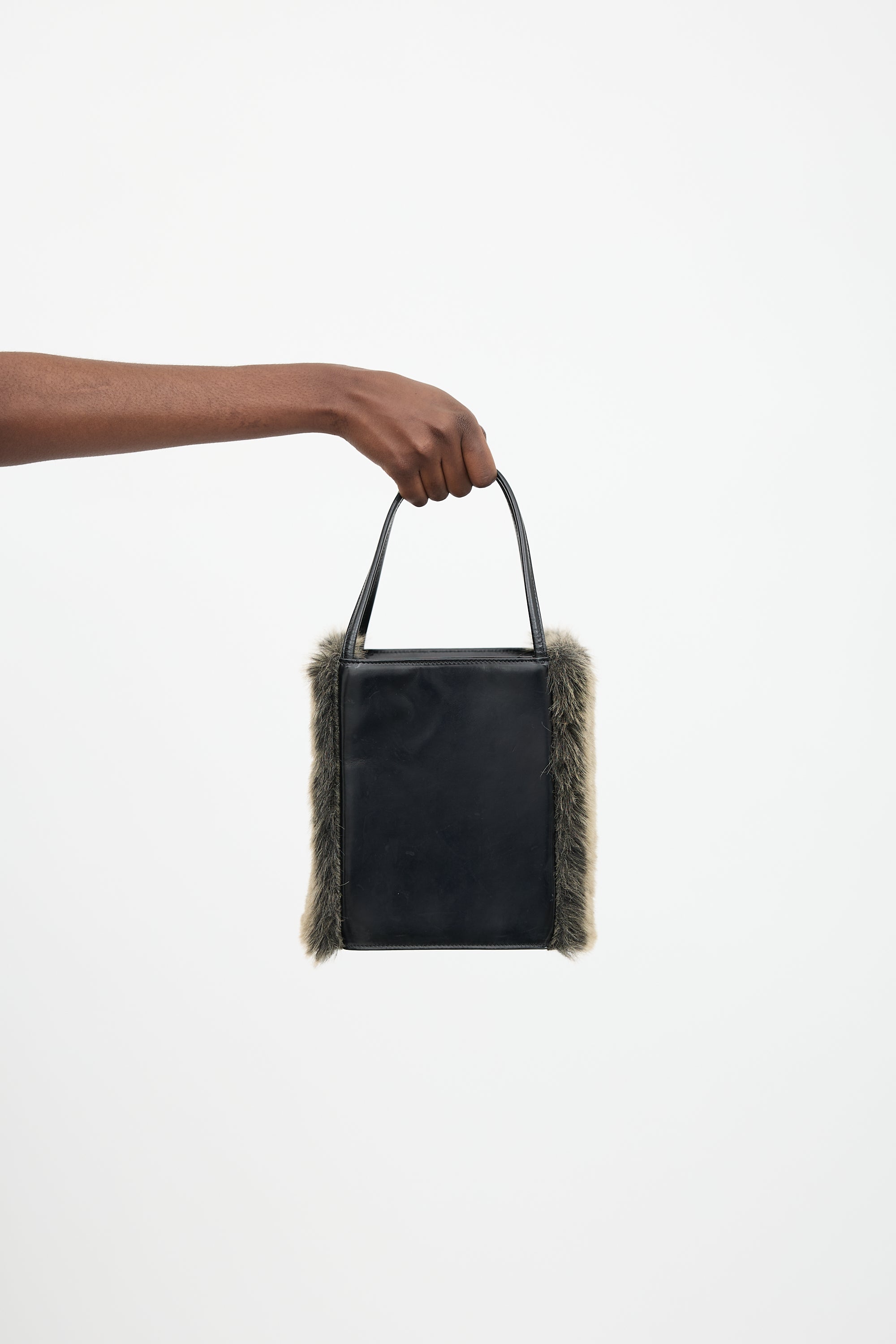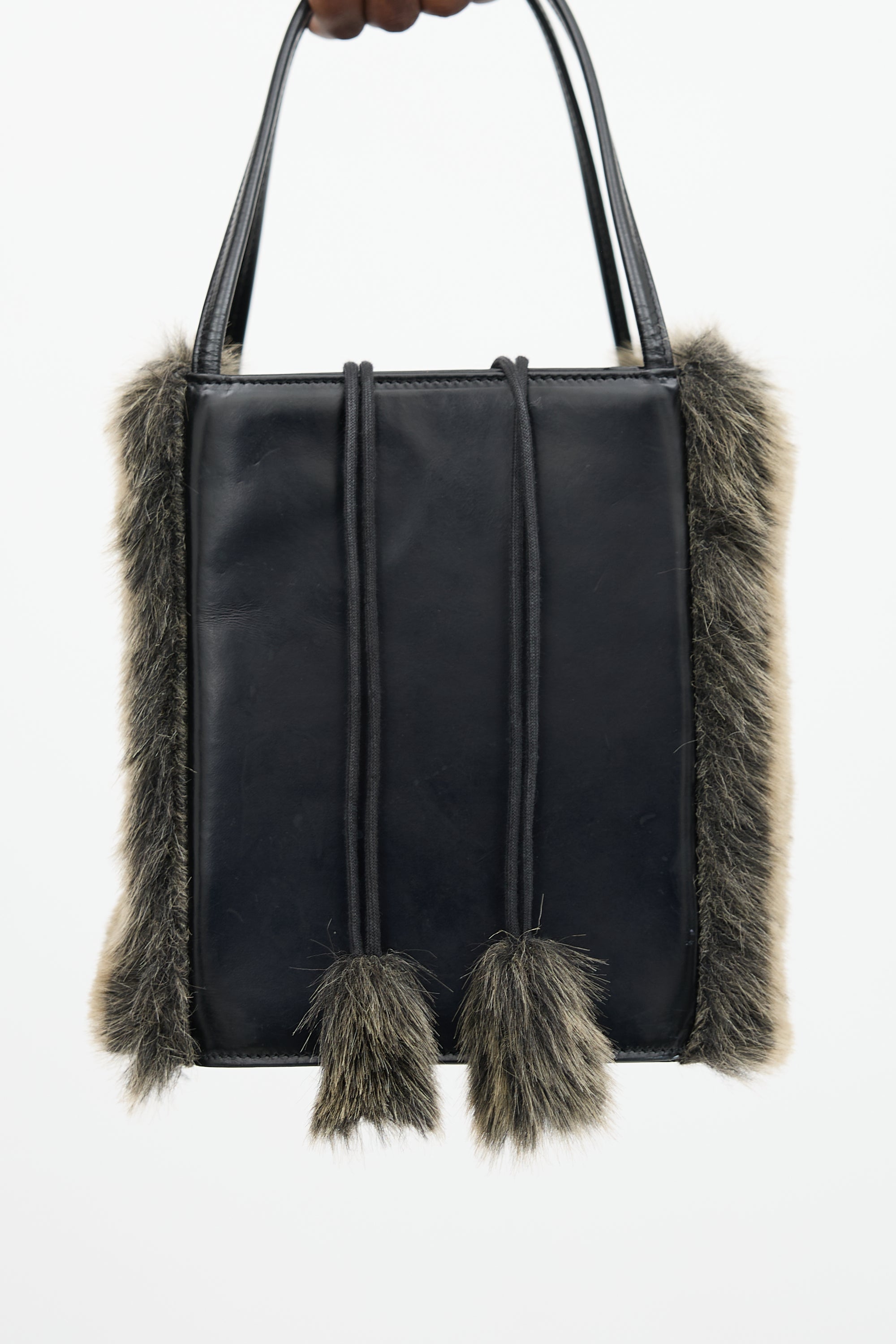 Pre-owned Issey Miyake black leather and grey faux fur box bag featuring dual top handles, inset drawstring top closure part with fur pom poms, and one lined main compartment with one slip pocket.