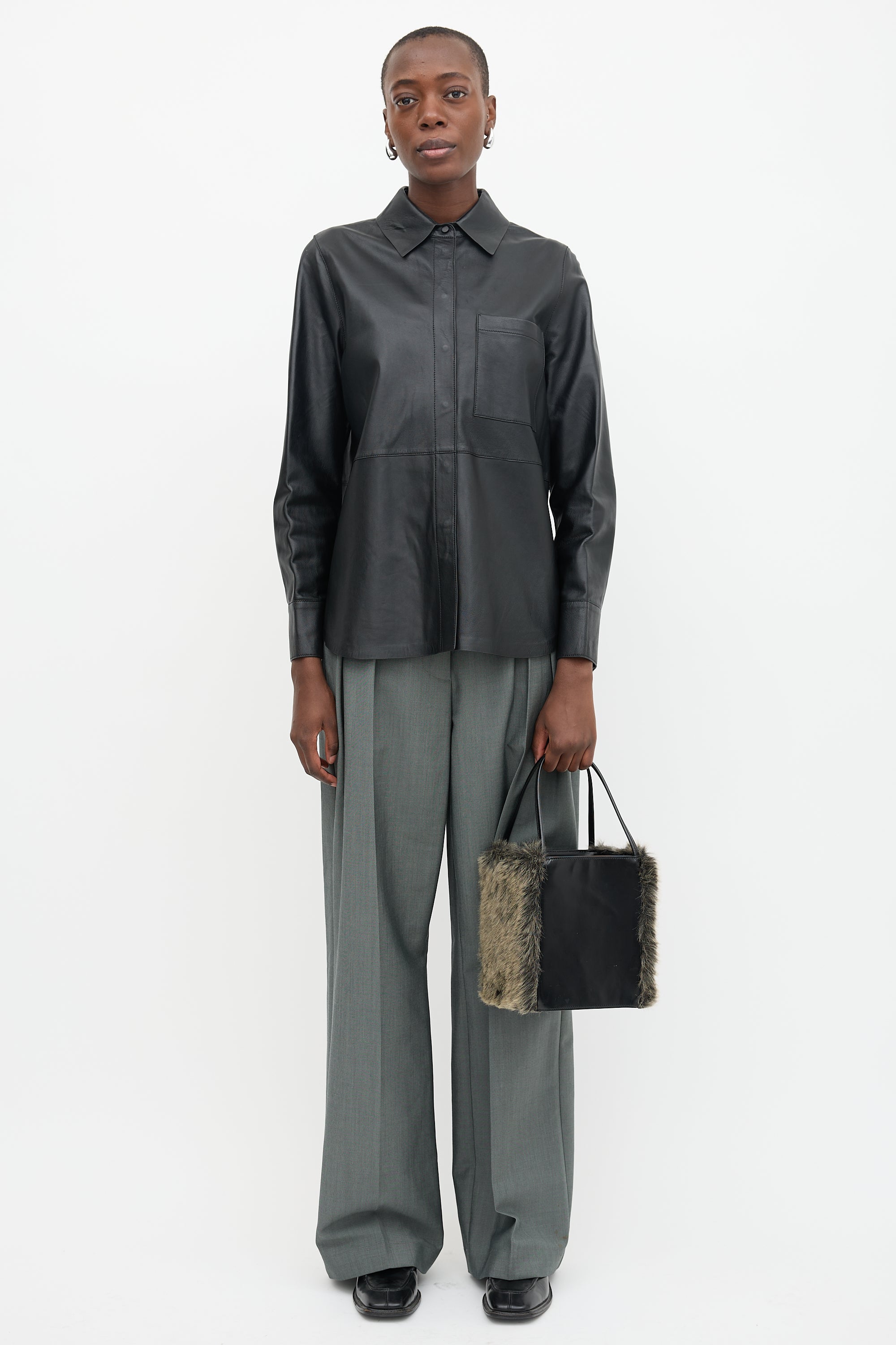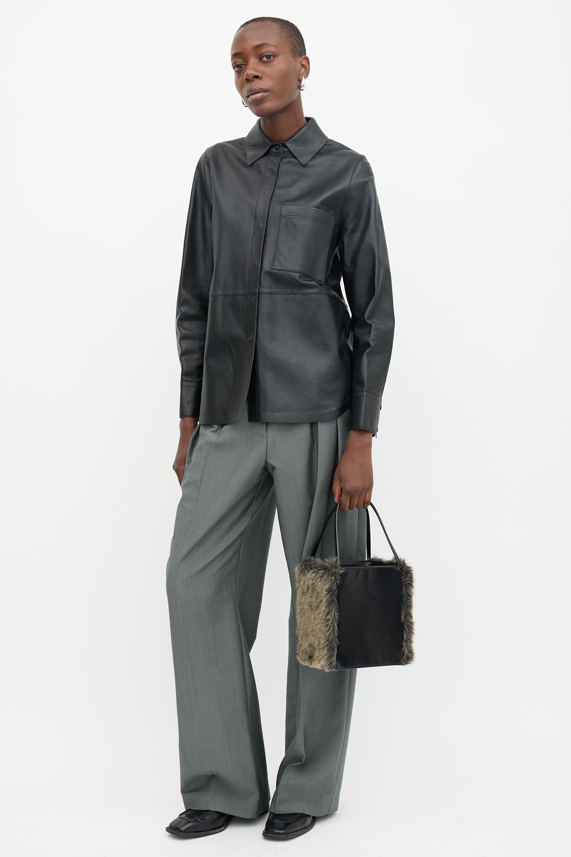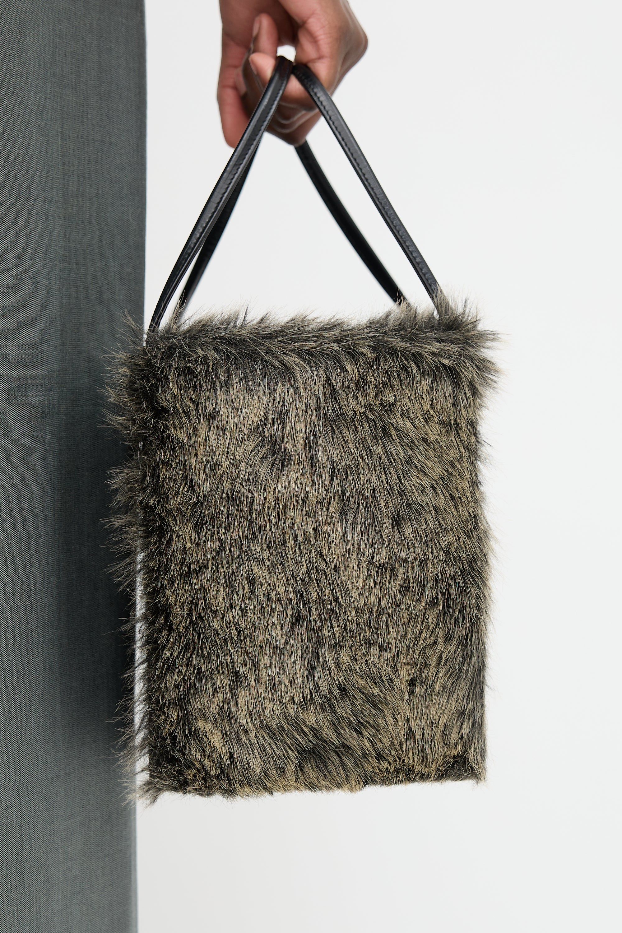 Pre-owned Issey Miyake black leather and grey faux fur box bag featuring dual top handles, inset drawstring top closure part with fur pom poms, and one lined main compartment with one slip pocket.