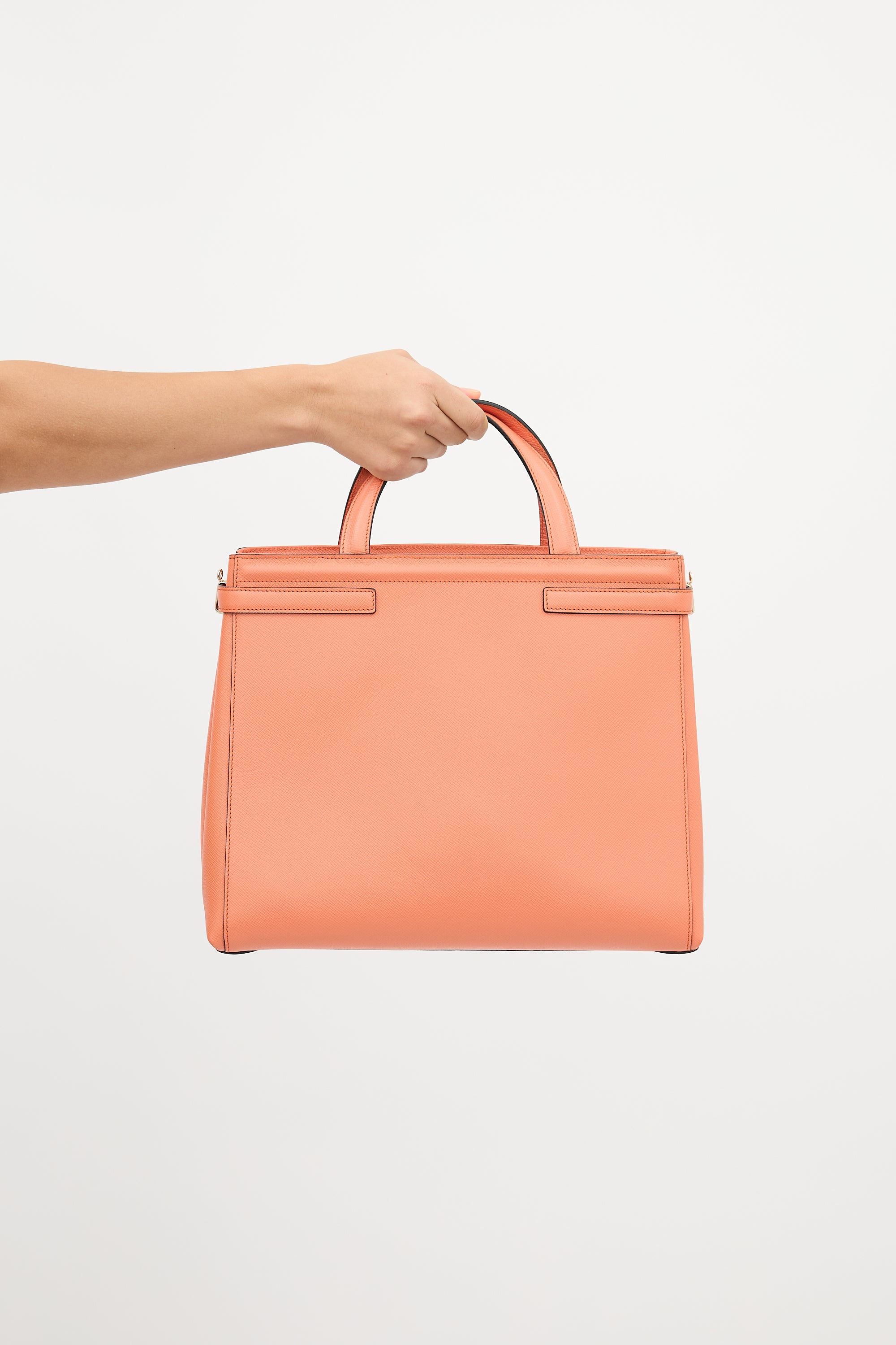 Pre-owned Serapian orange grained leather large bag featuring two fixed top handles, gold tone hardware, stamped logo at front, cinchable sides with straps and turn lock front fastening, four protective feet, adjustable and detachable strap, open top with two main compartments, interior zip top partition, two zip pockets, and two slip pockets. Comes with original dust bag.