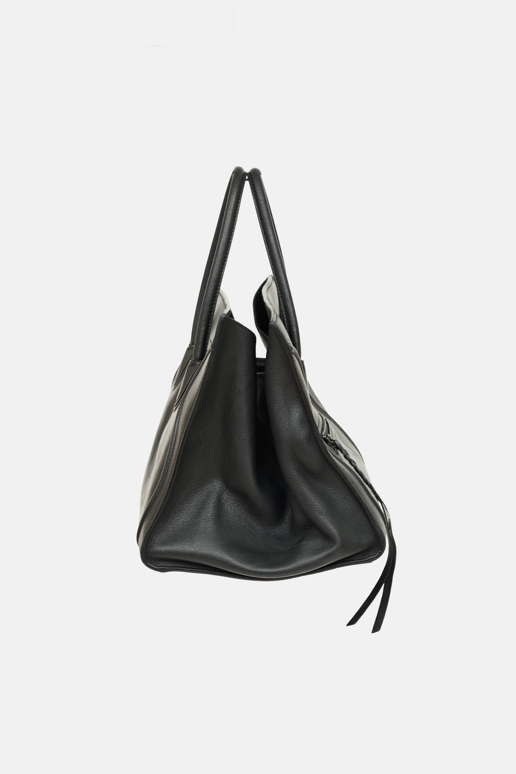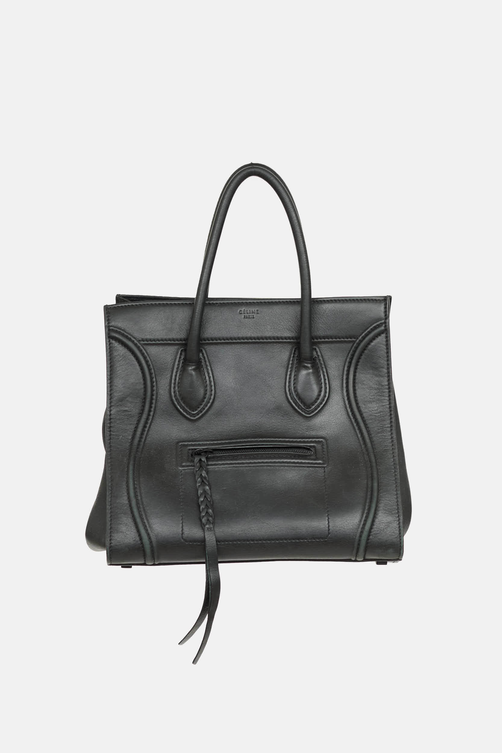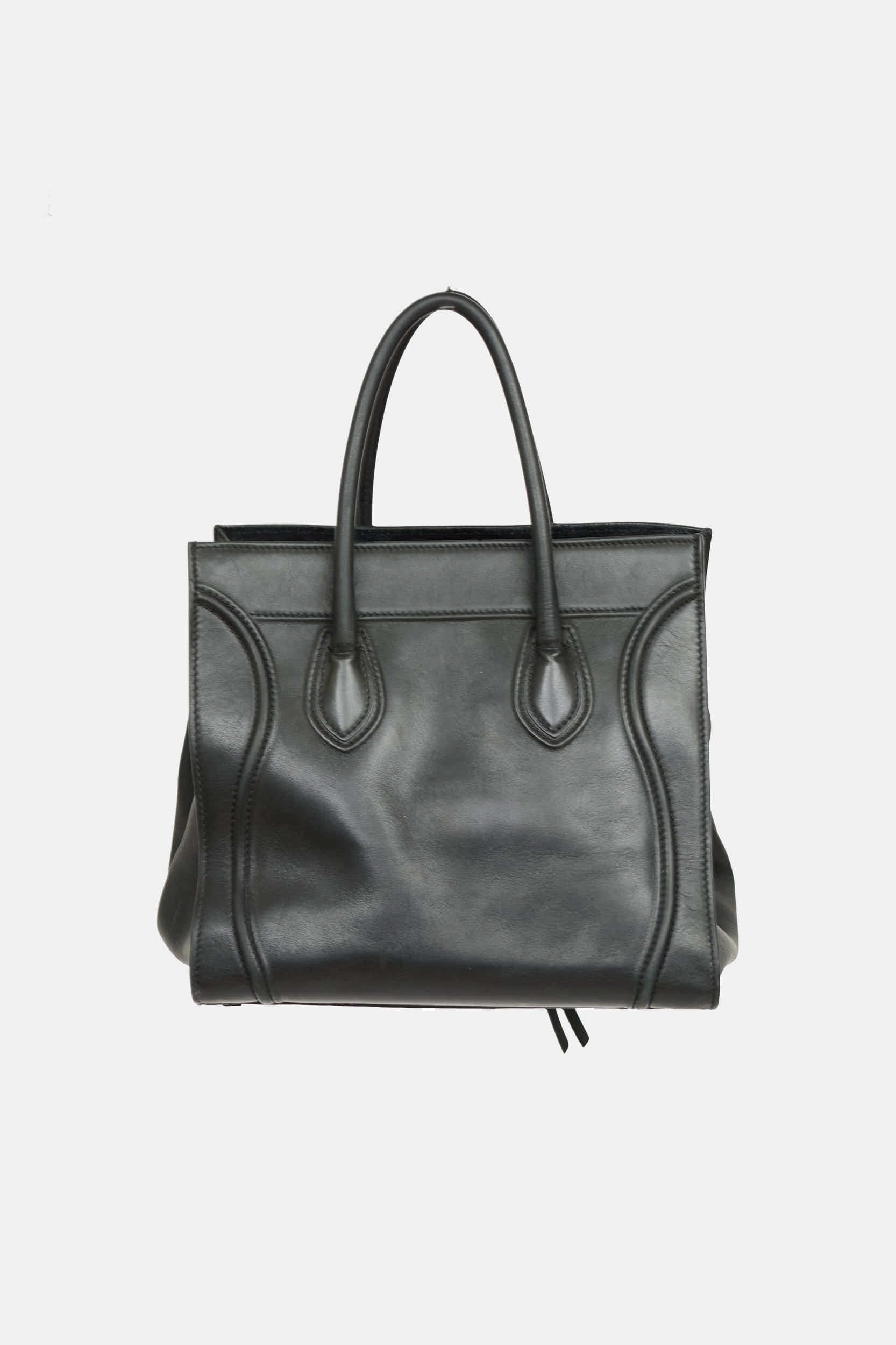 Pre-owned Celine 2013 black Phantom leather tote featuring an embossed logo at front, two wrapped top handles, one zip pocket at front, four protective feet at base, one main compartment with one zip pocket and two slip pockets, and top zip closure. Pheobe Philo era design.