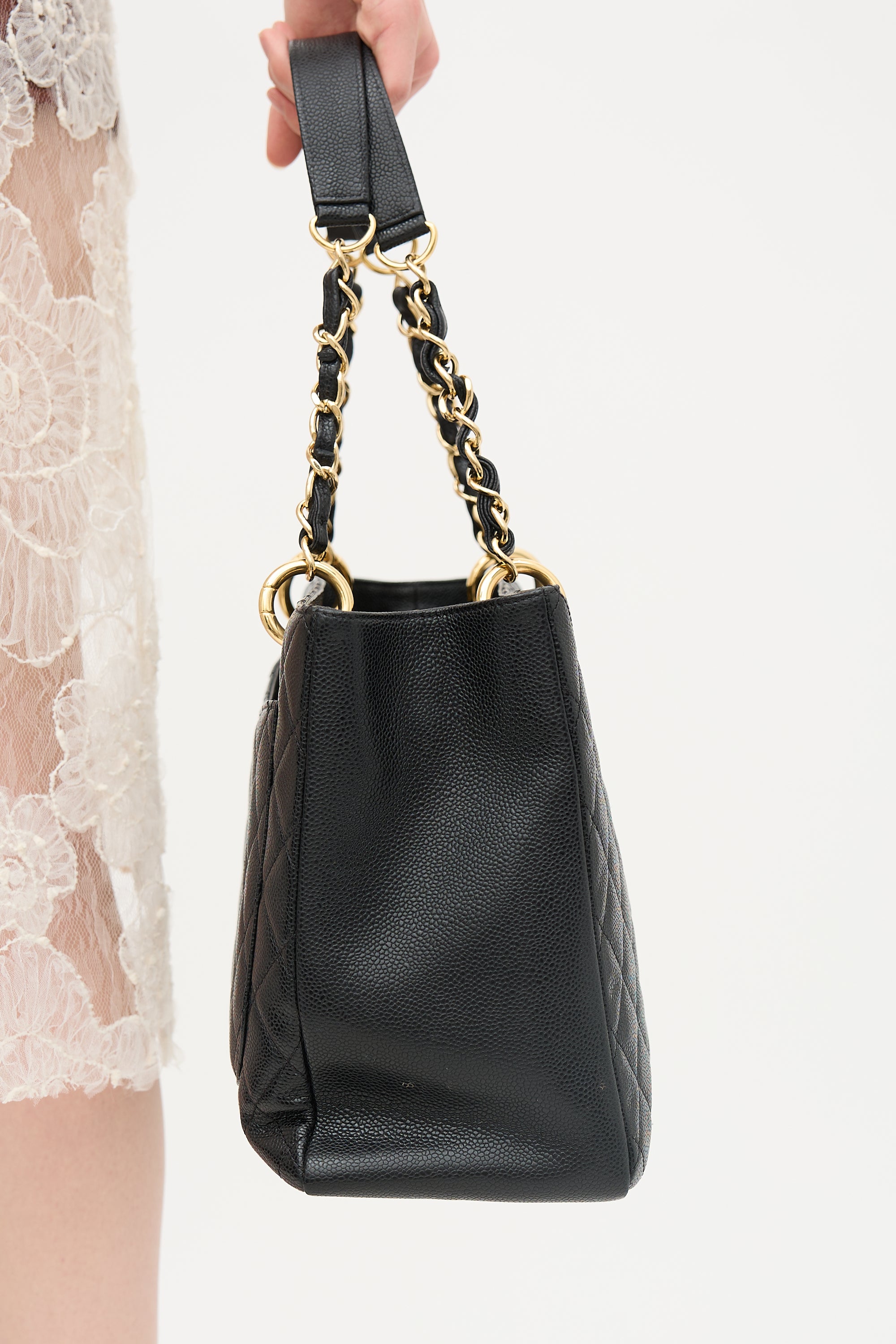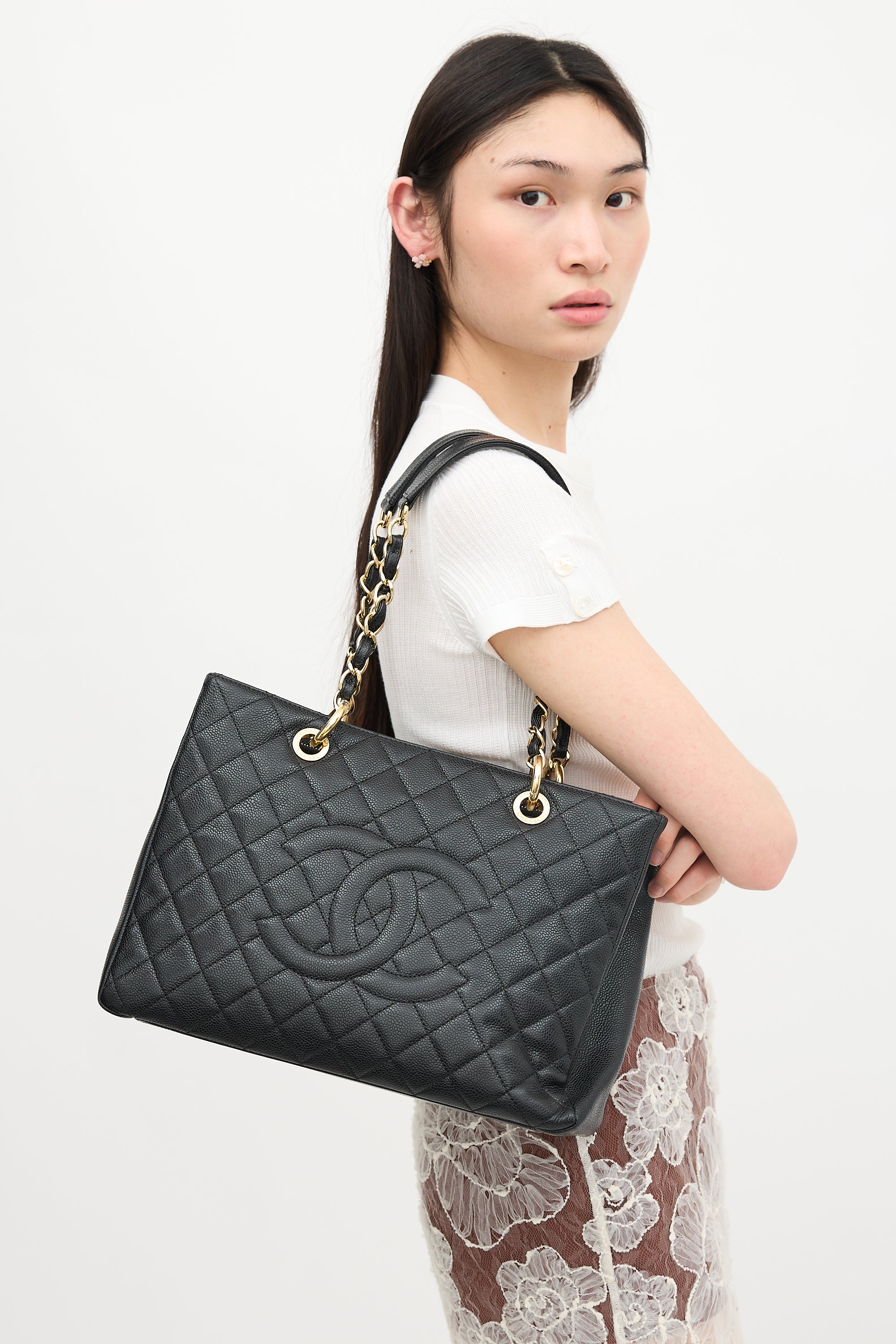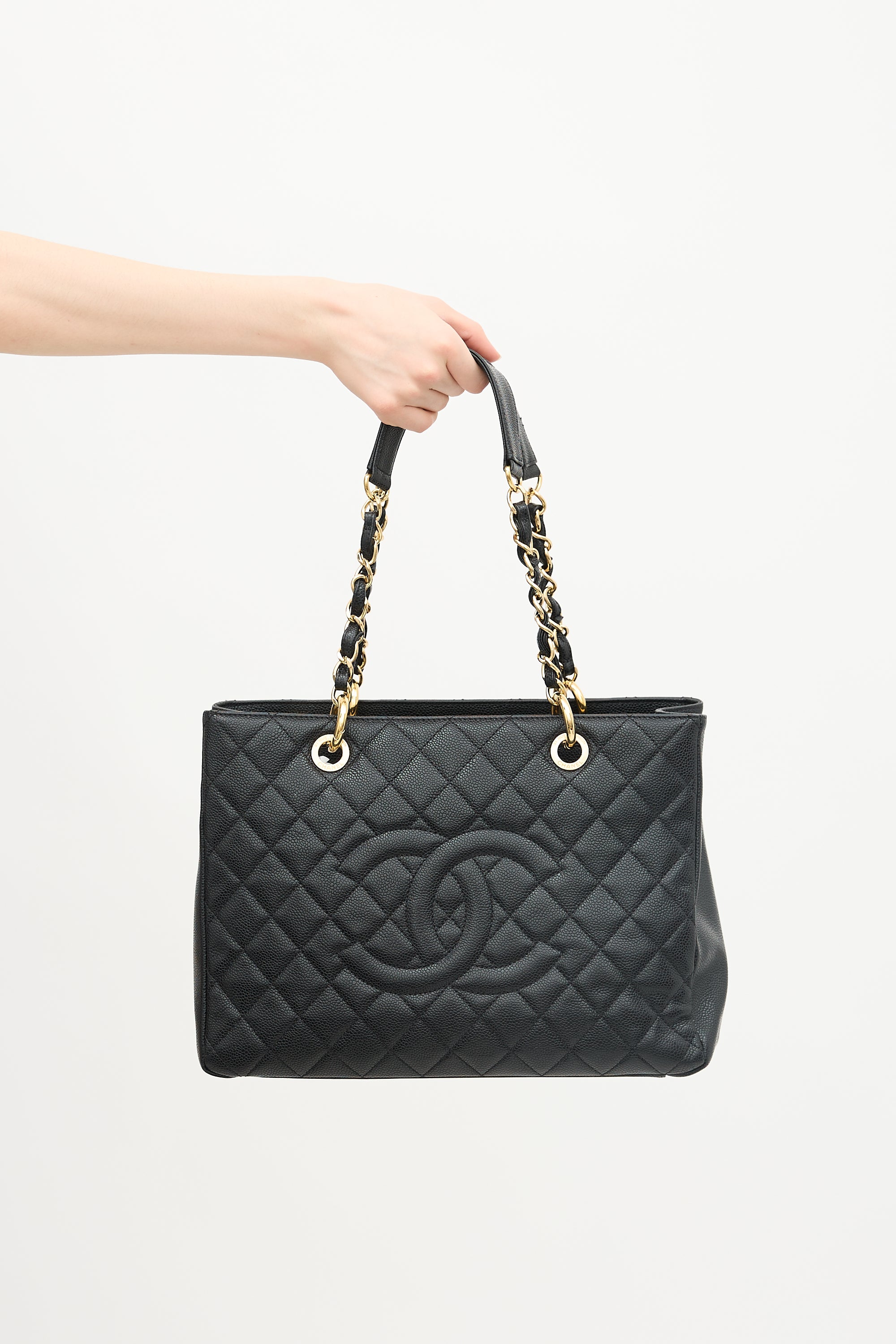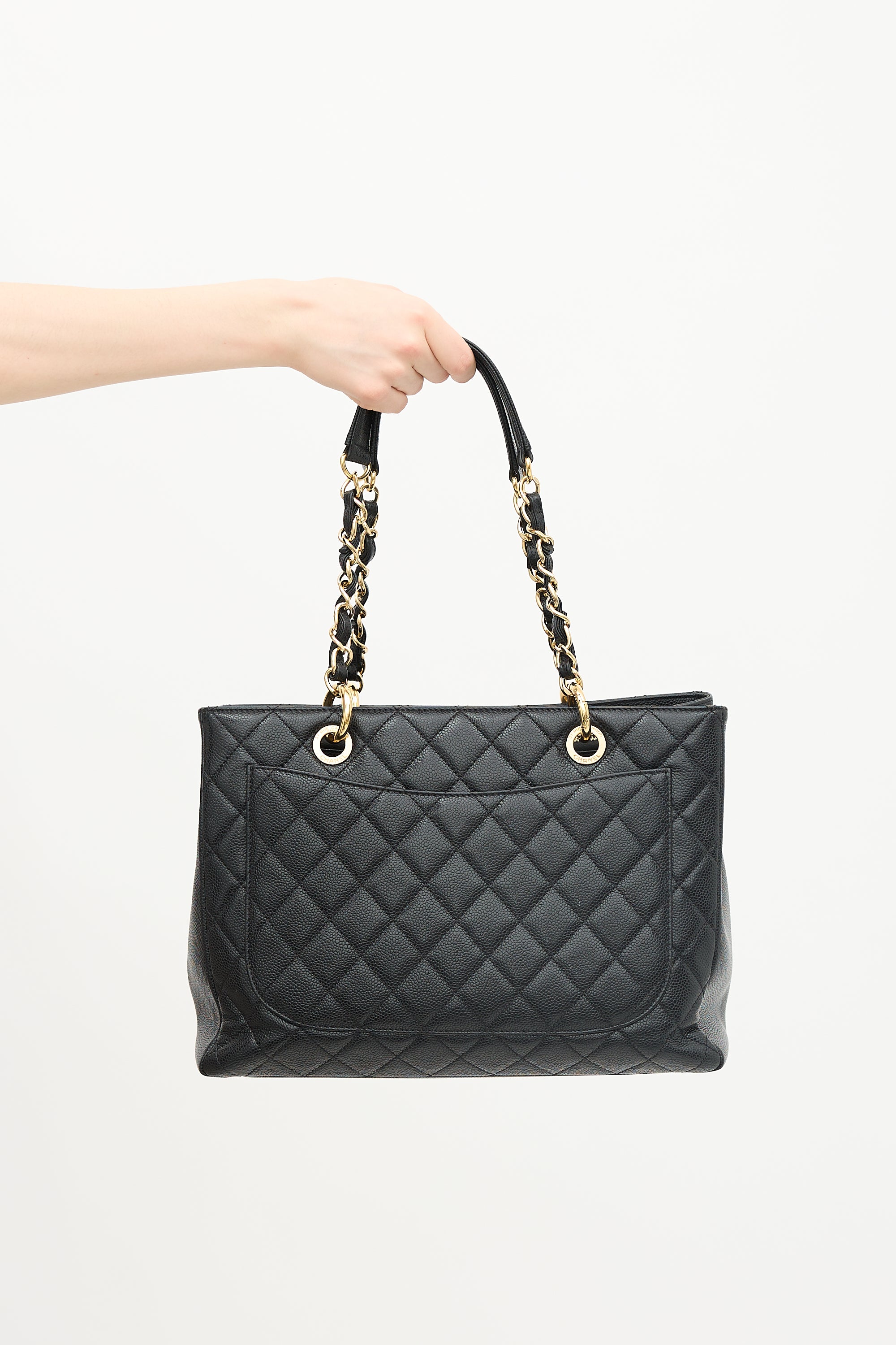 Pre-owned Chanel 2012-2013 black quilted Caviar leather Grand Shopping Tote bag featuring gold tone hardware, stitched CC motif at front, back slip pocket, two braided leather and chain top handles, open top, two lined main compartments with zipper divider, one interior zip pocket, and one interior slip pocket. Comes with original dust bag.