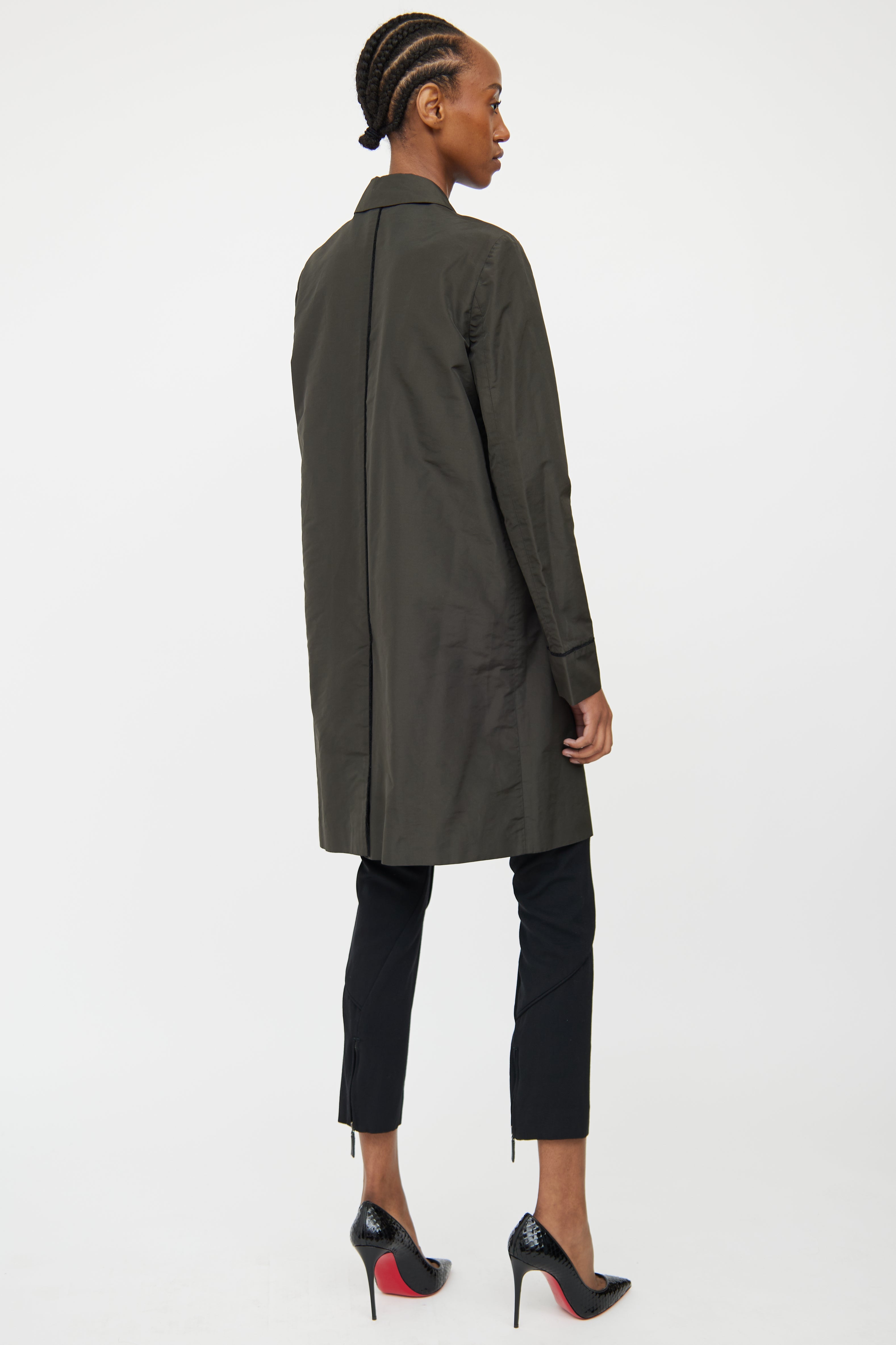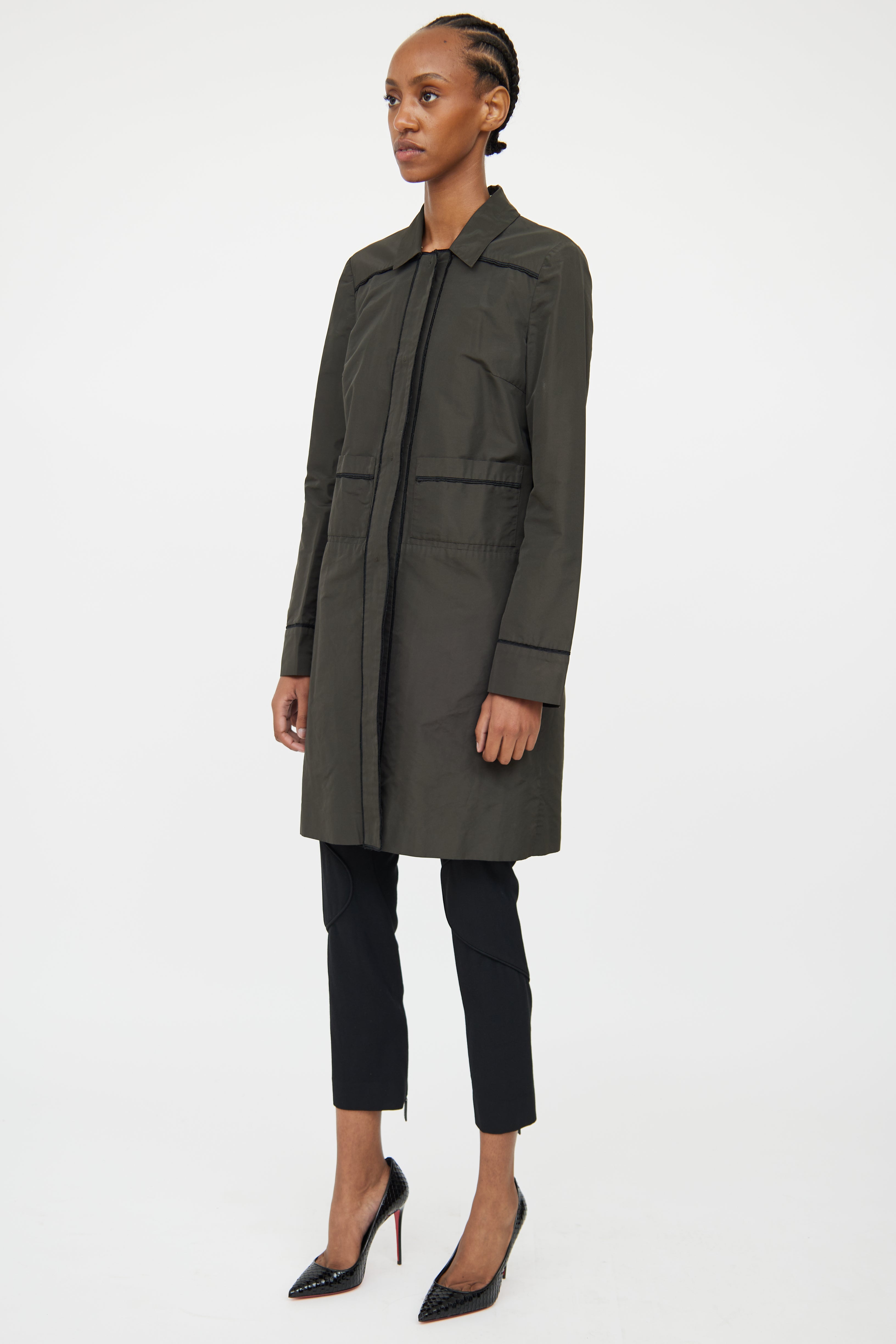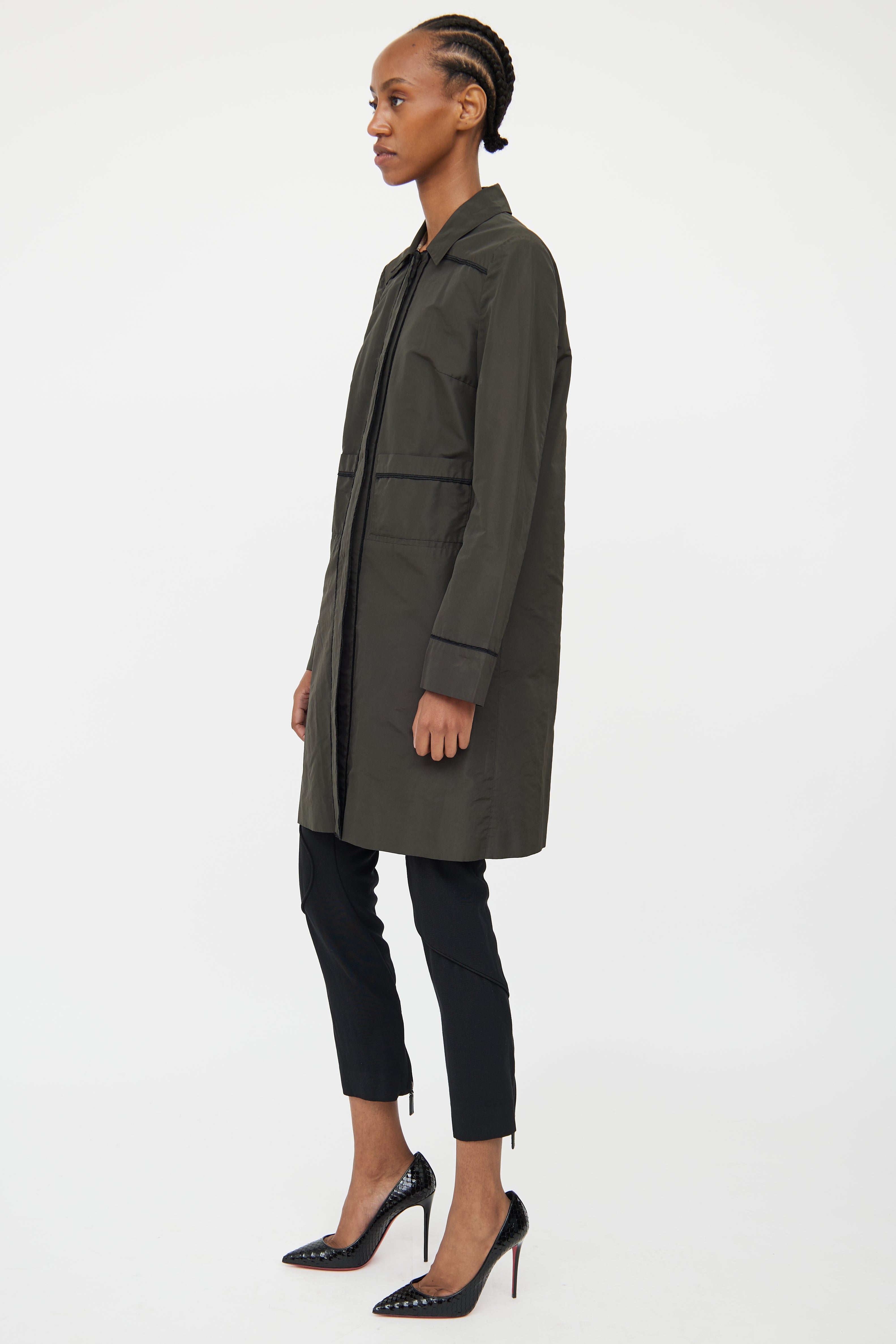 Pre-owned Miu Miu deep green trench coat featuring point collar, concealed snap front closure, long sleeves, two front patch pockets, vent at back and seam detailing throughout. Unlined.