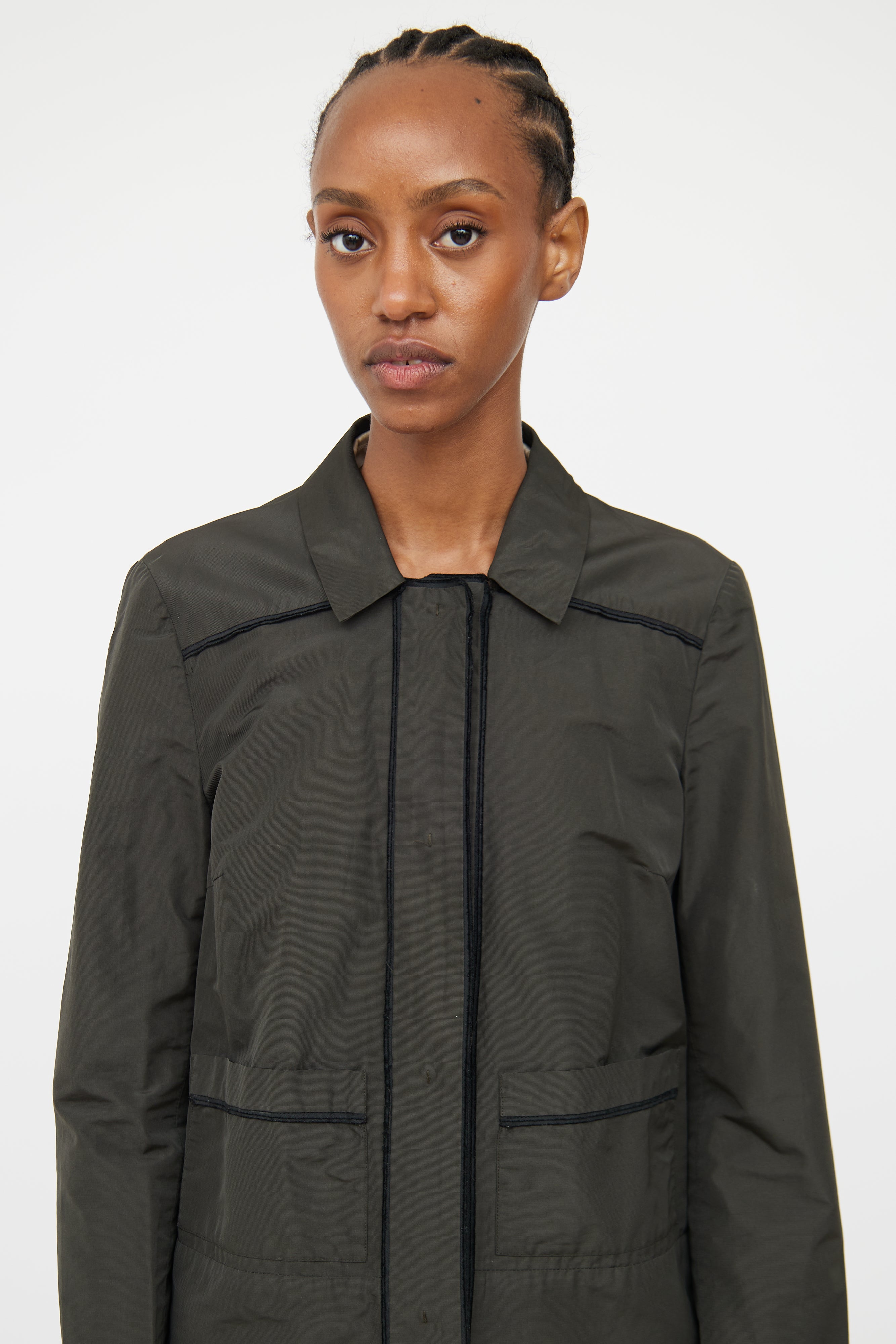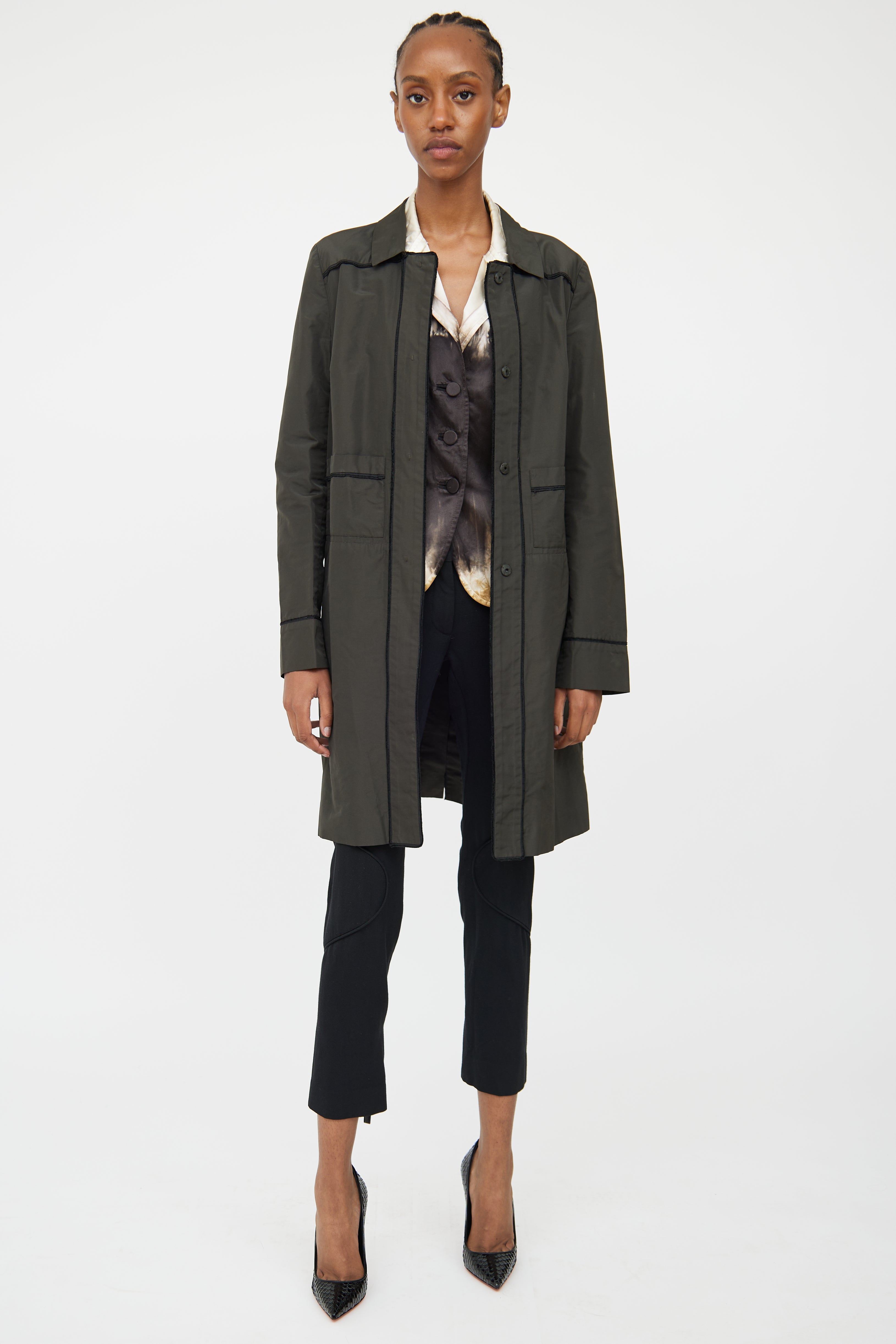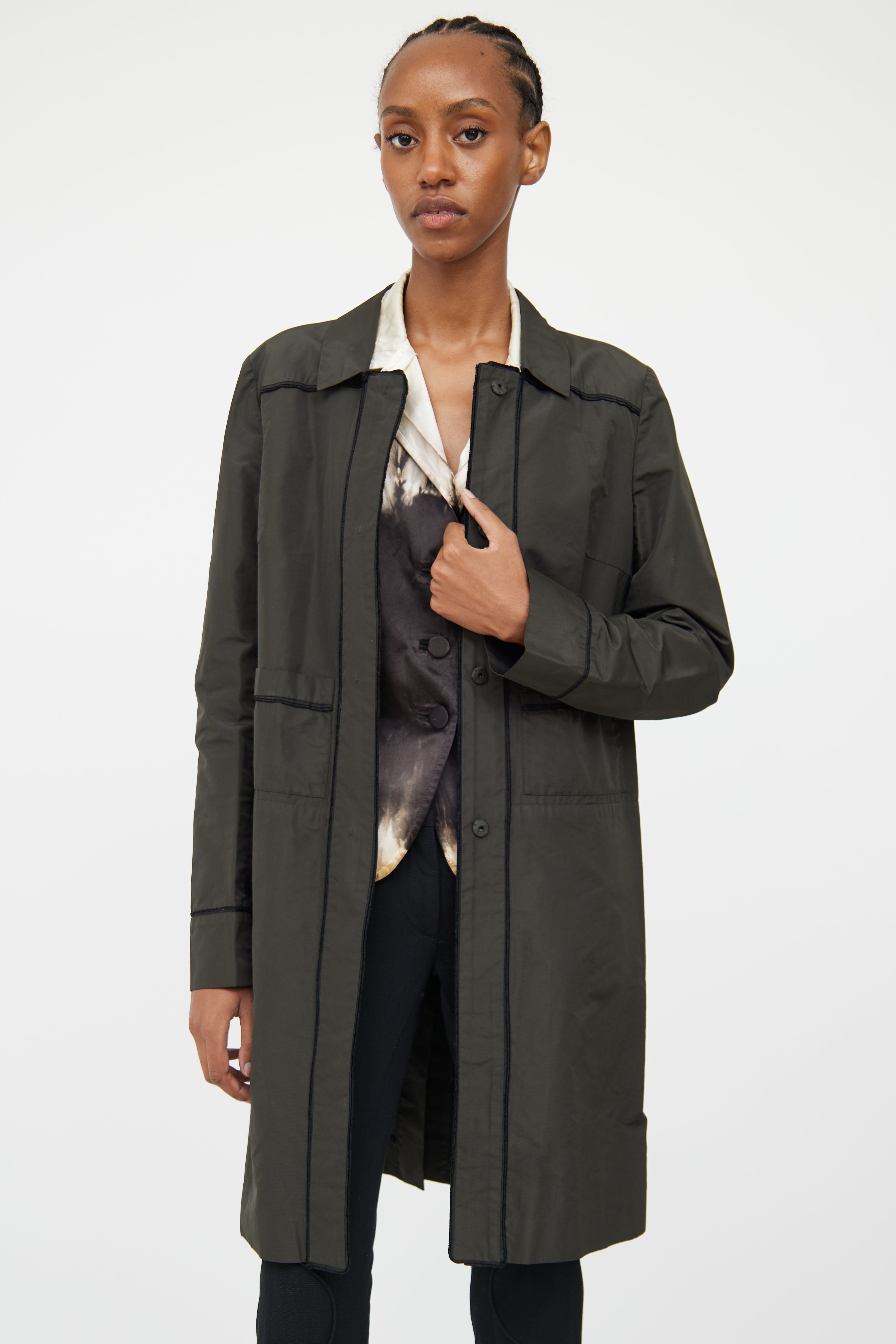 Pre-owned Miu Miu deep green trench coat featuring point collar, concealed snap front closure, long sleeves, two front patch pockets, vent at back and seam detailing throughout. Unlined.