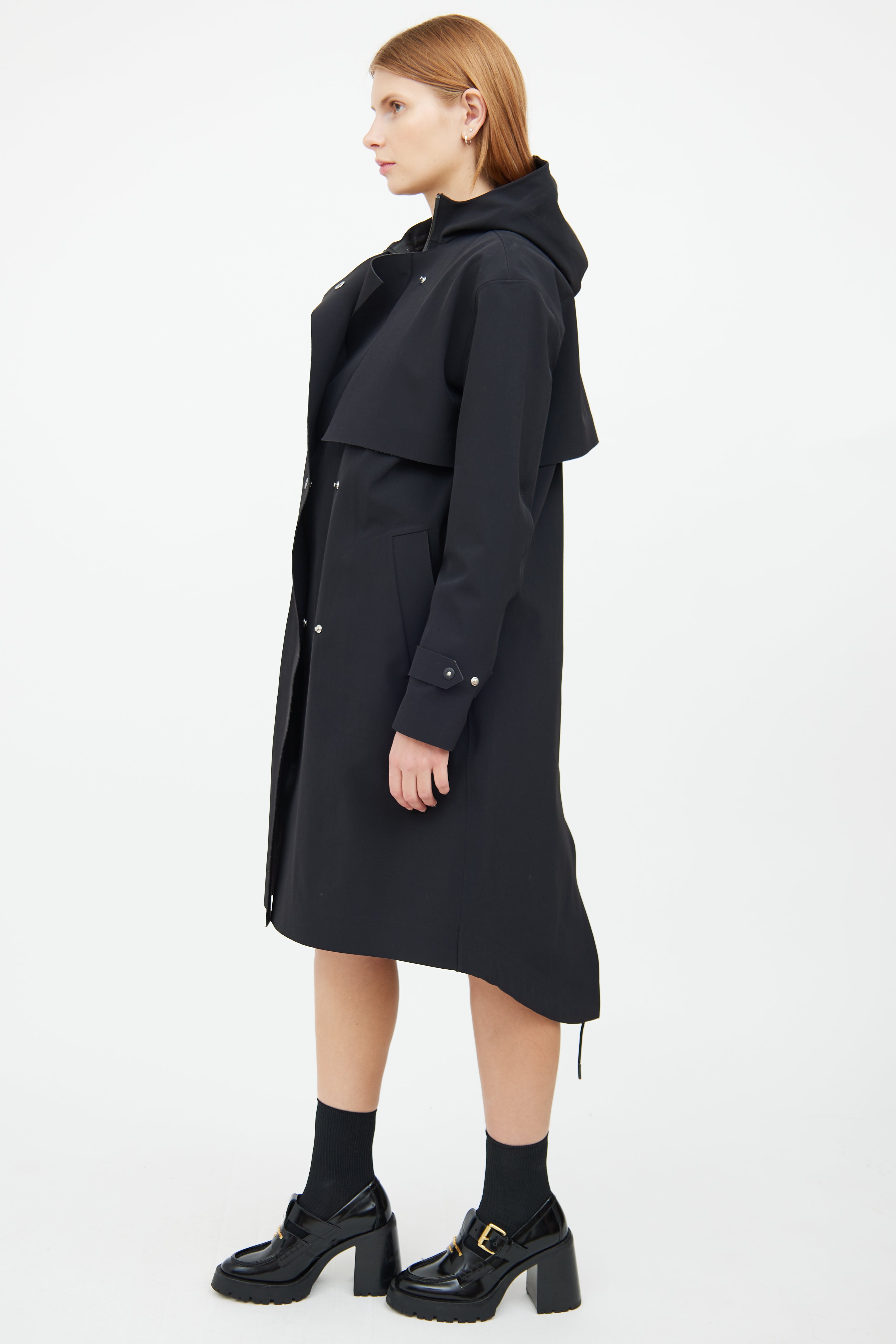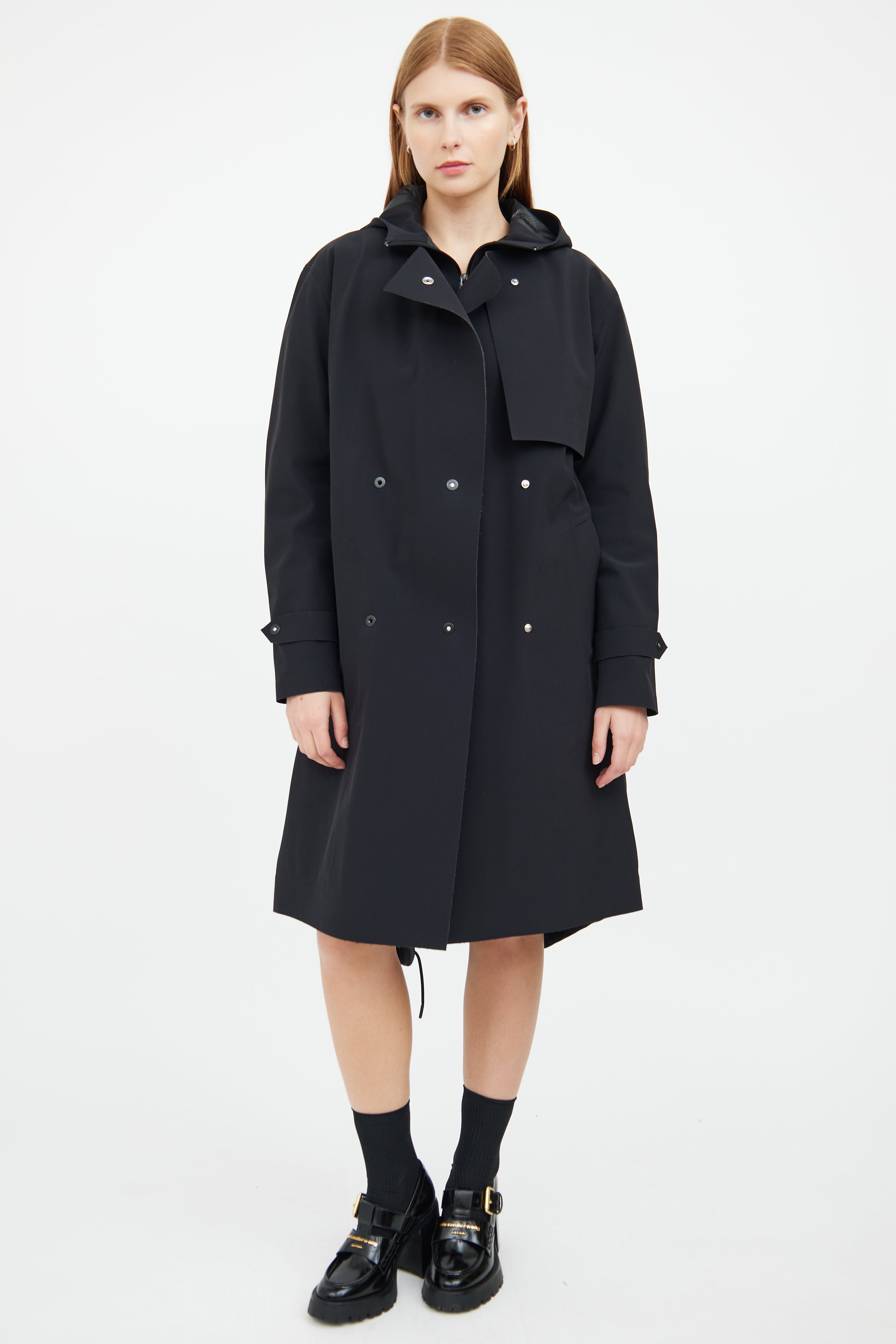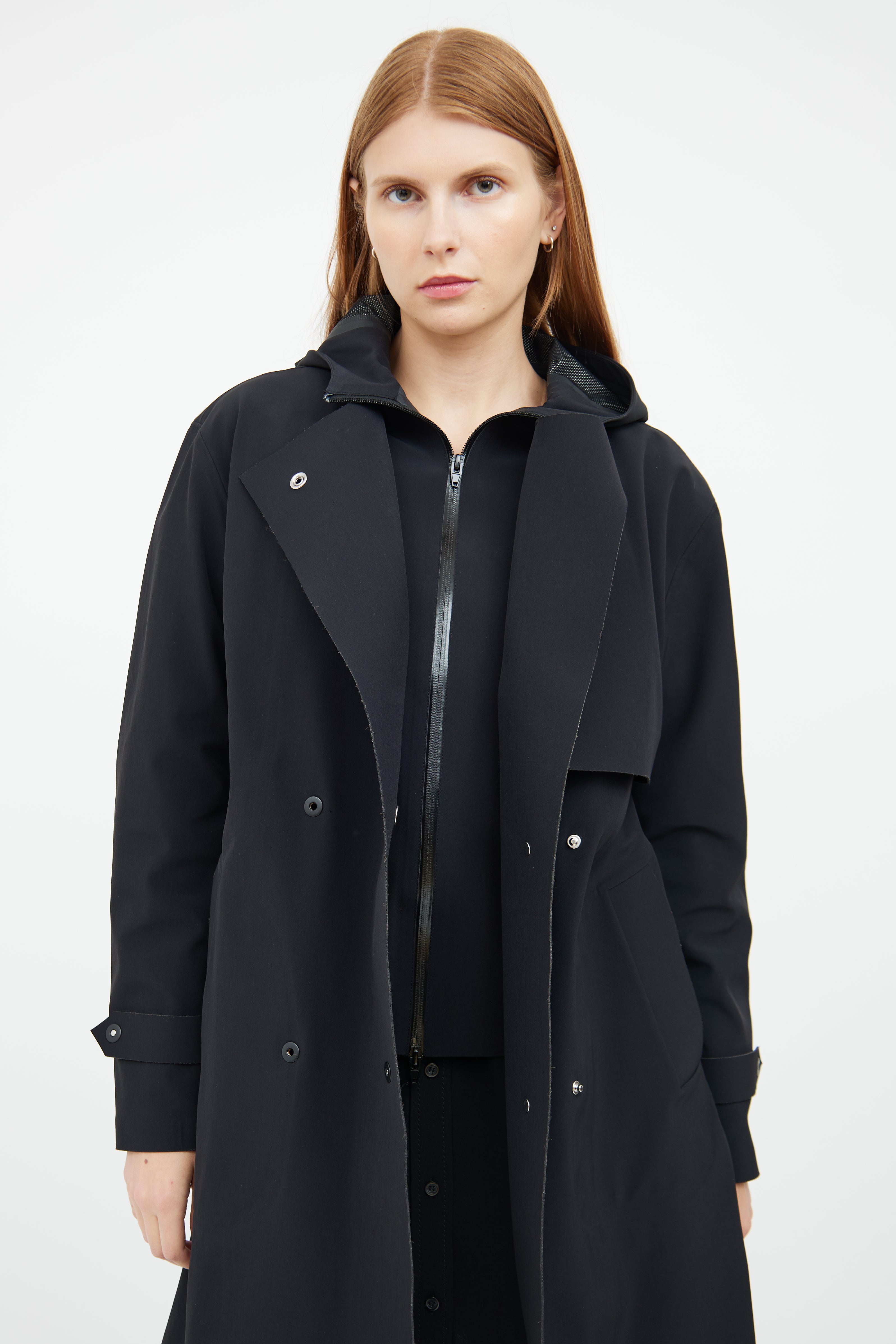 Pre-owned T by Alexander Wang black long trench coat featuring long sleeves with buttoned cuff straps, gun flap, storm shield at back, interior layer with two way zip closure, double breasted snap button closure, dual storm pockets, attached hood, low hem with drawstring at rear.