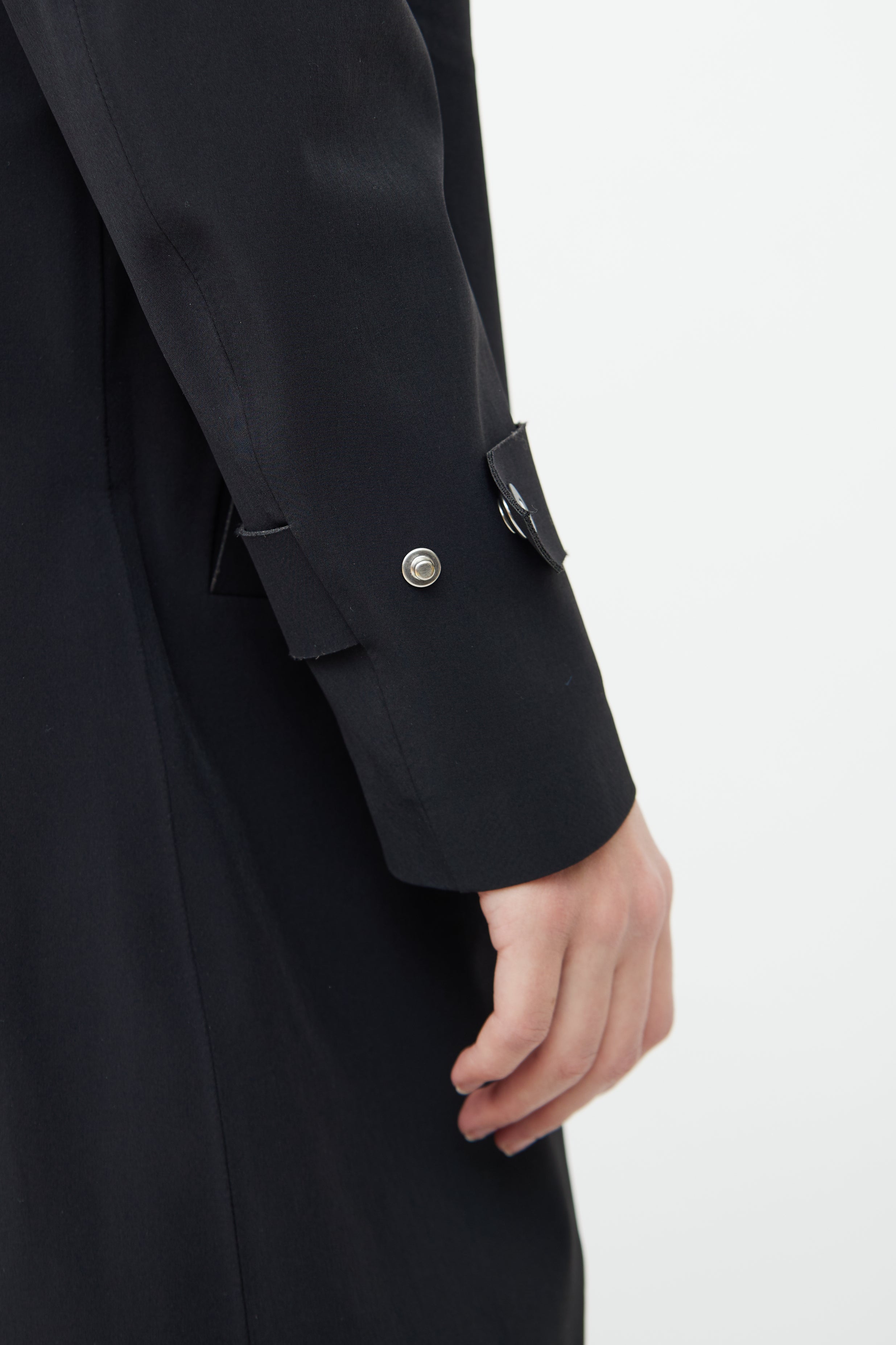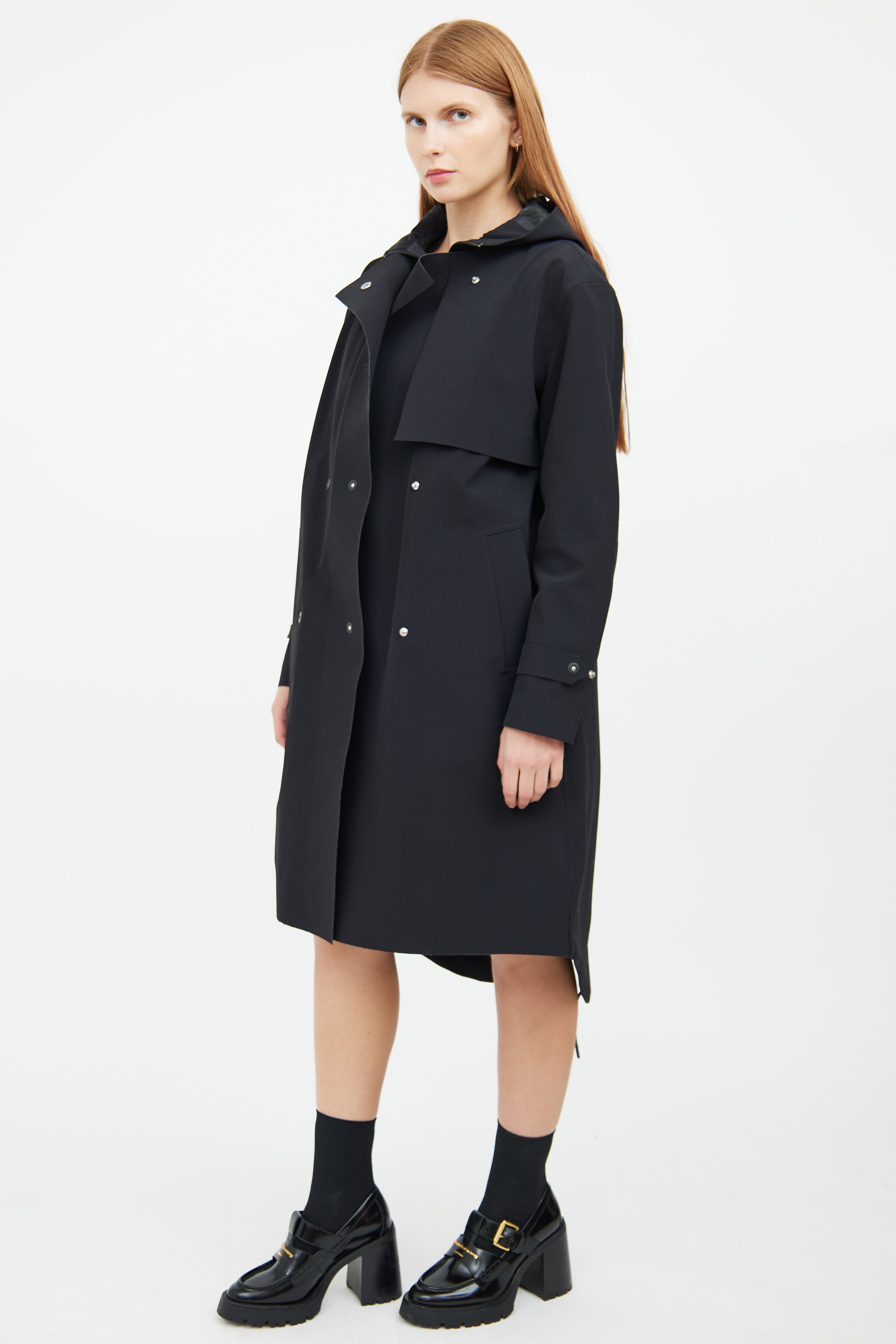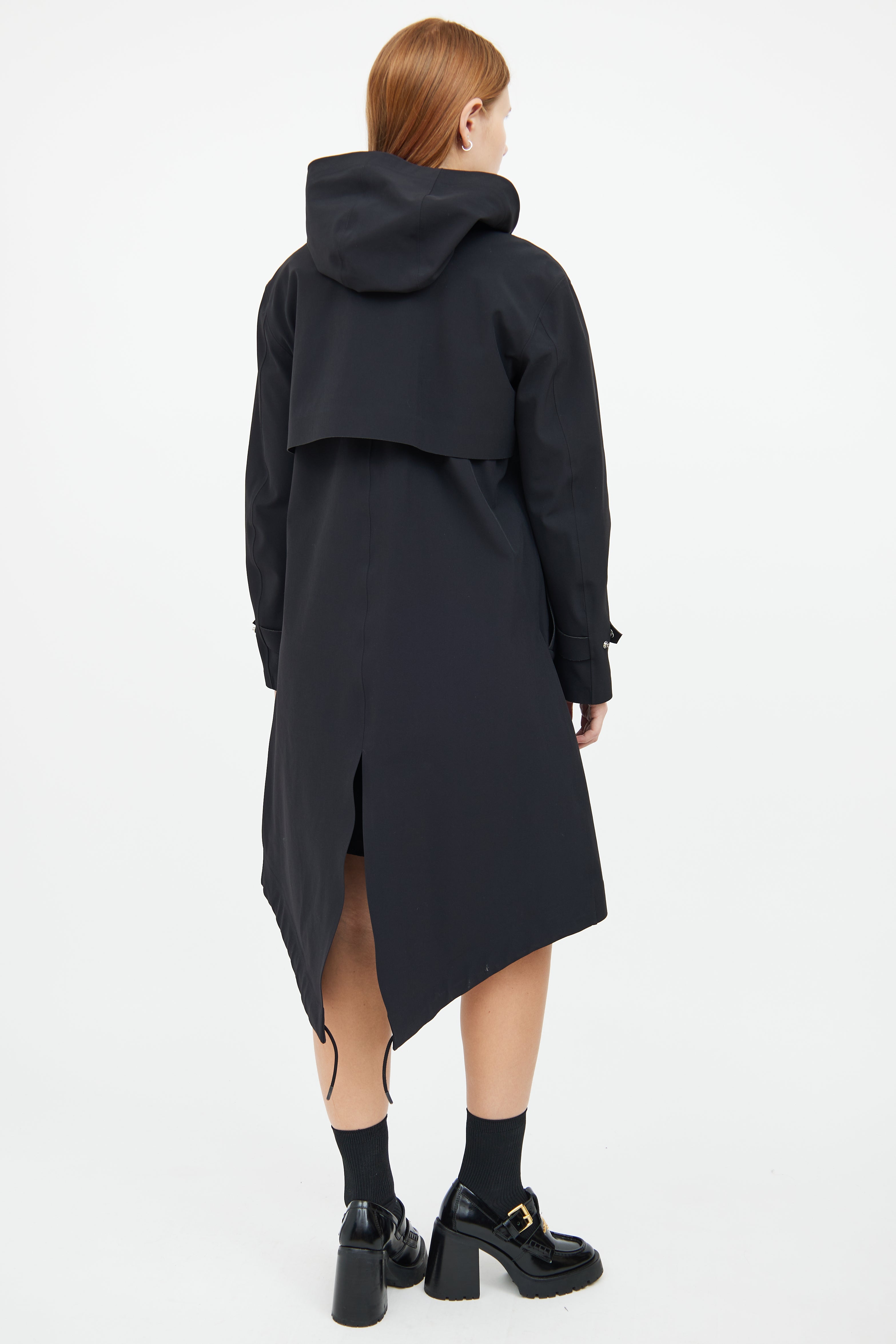 Pre-owned T by Alexander Wang black long trench coat featuring long sleeves with buttoned cuff straps, gun flap, storm shield at back, interior layer with two way zip closure, double breasted snap button closure, dual storm pockets, attached hood, low hem with drawstring at rear.