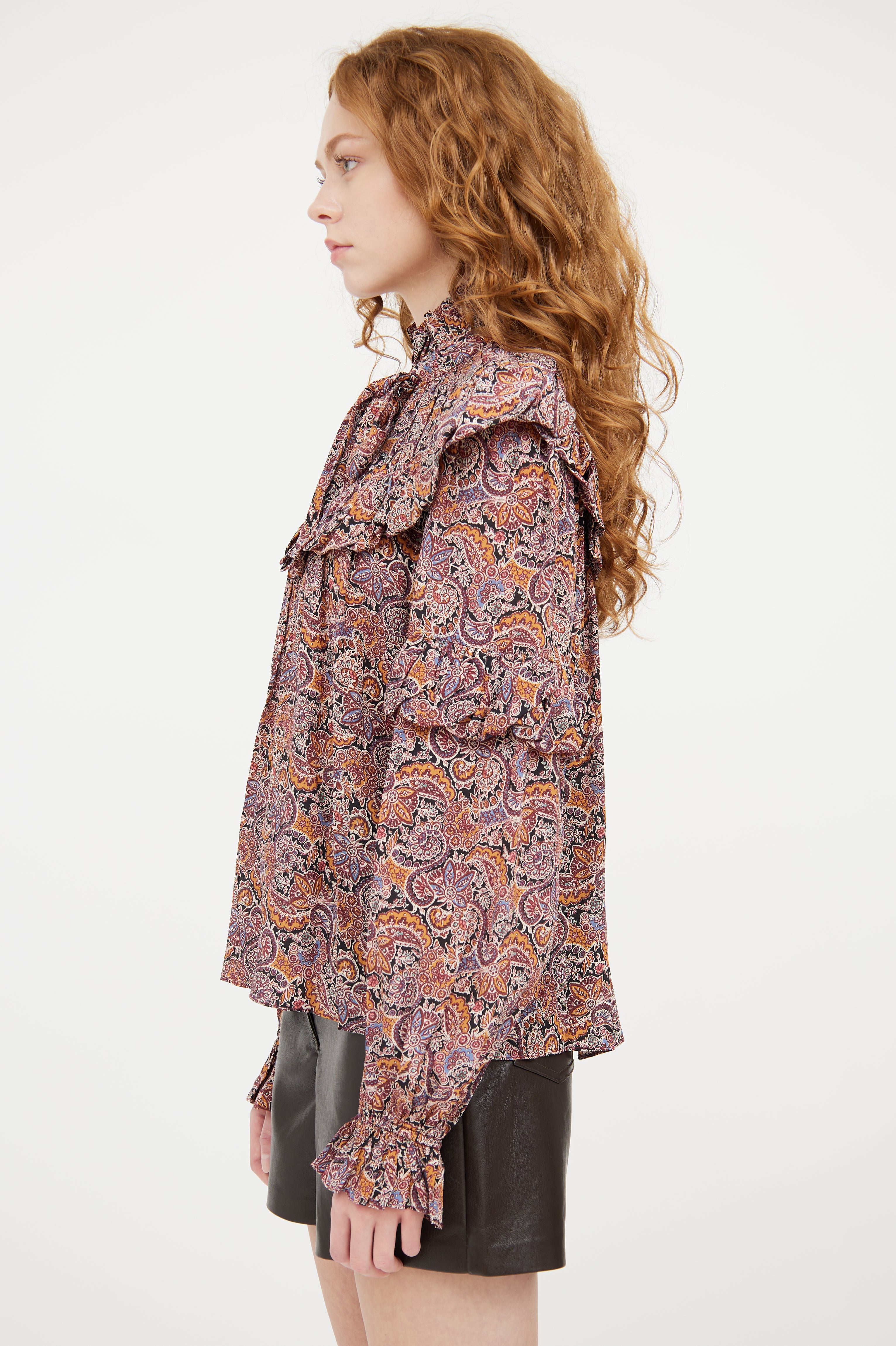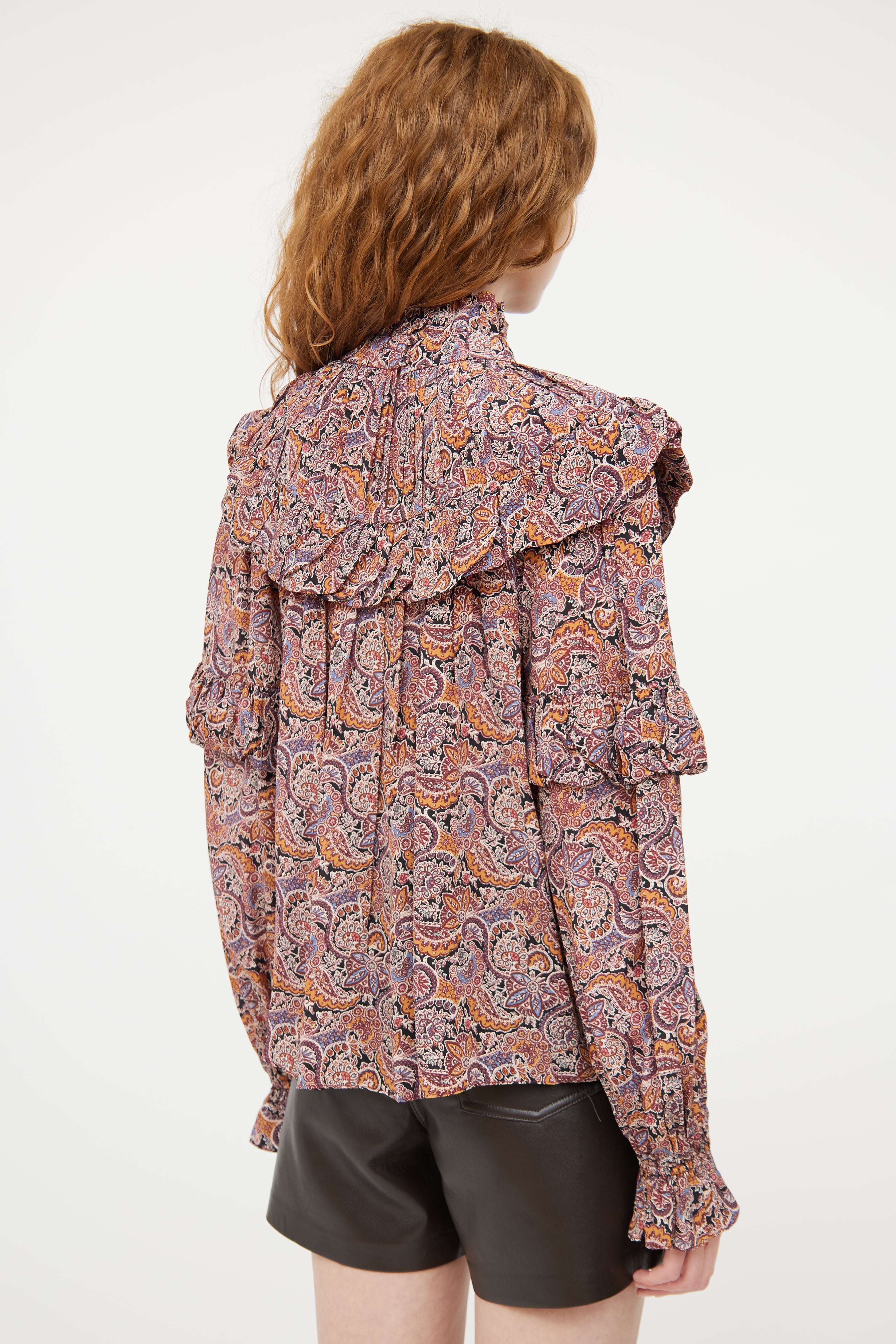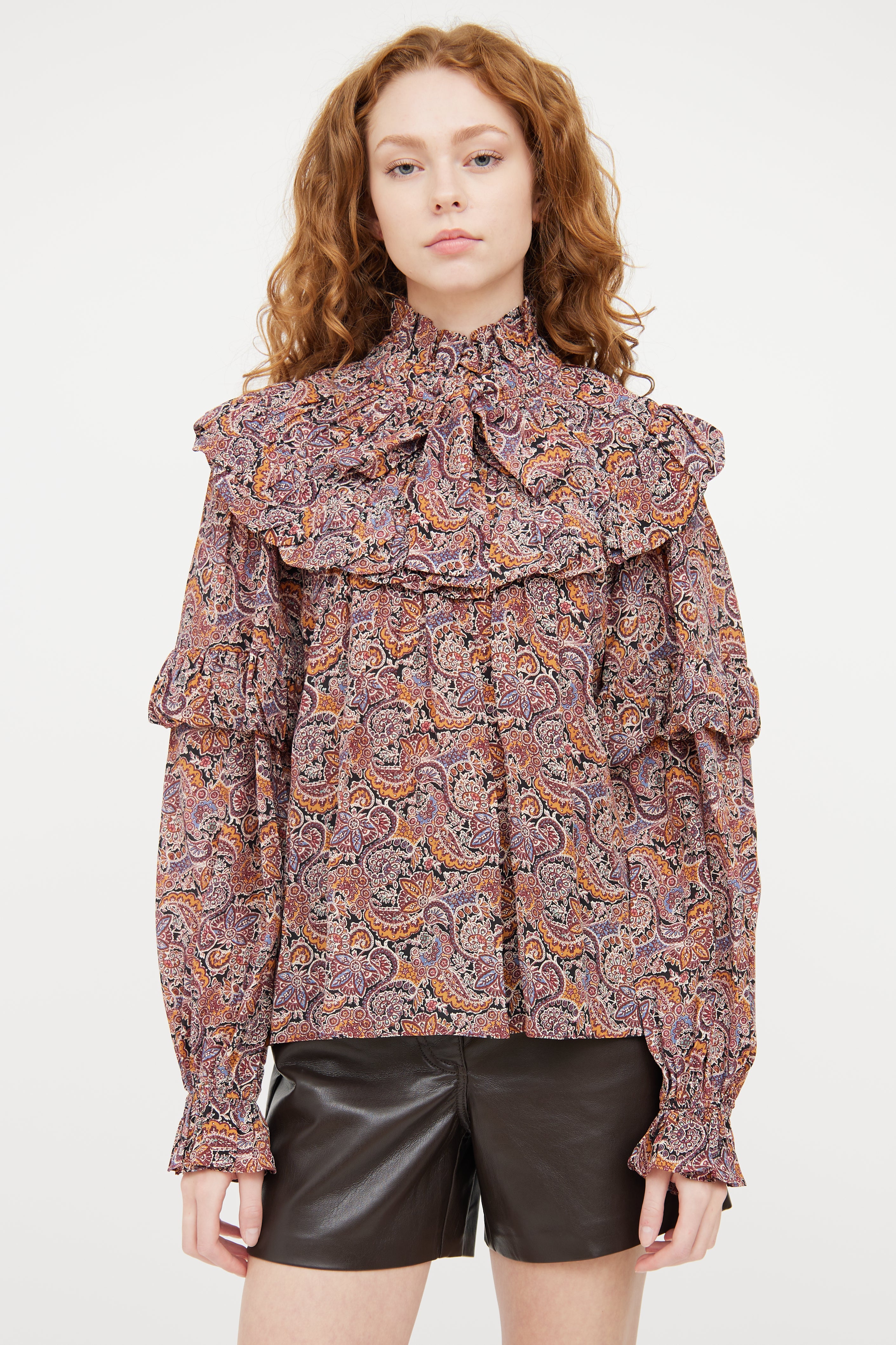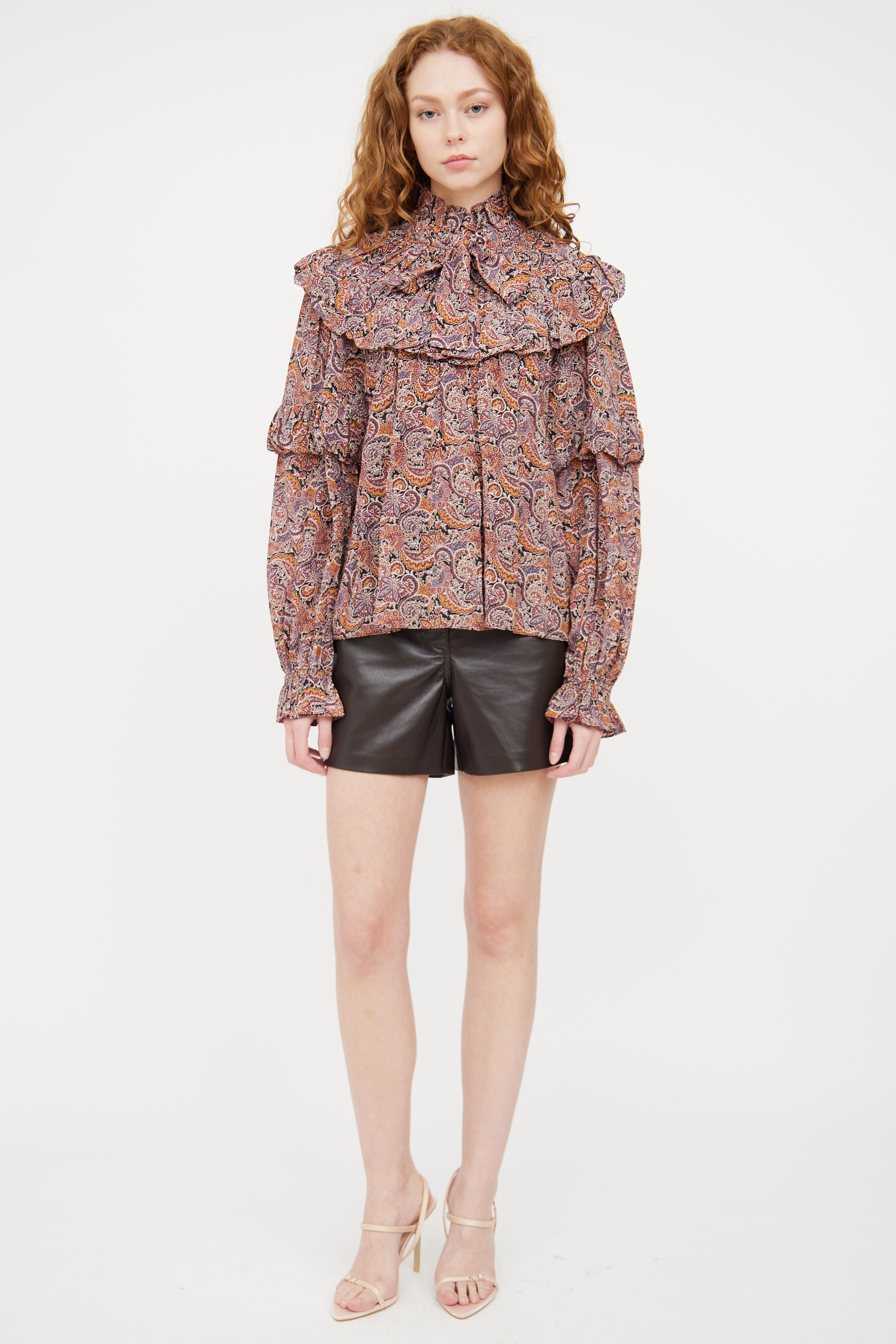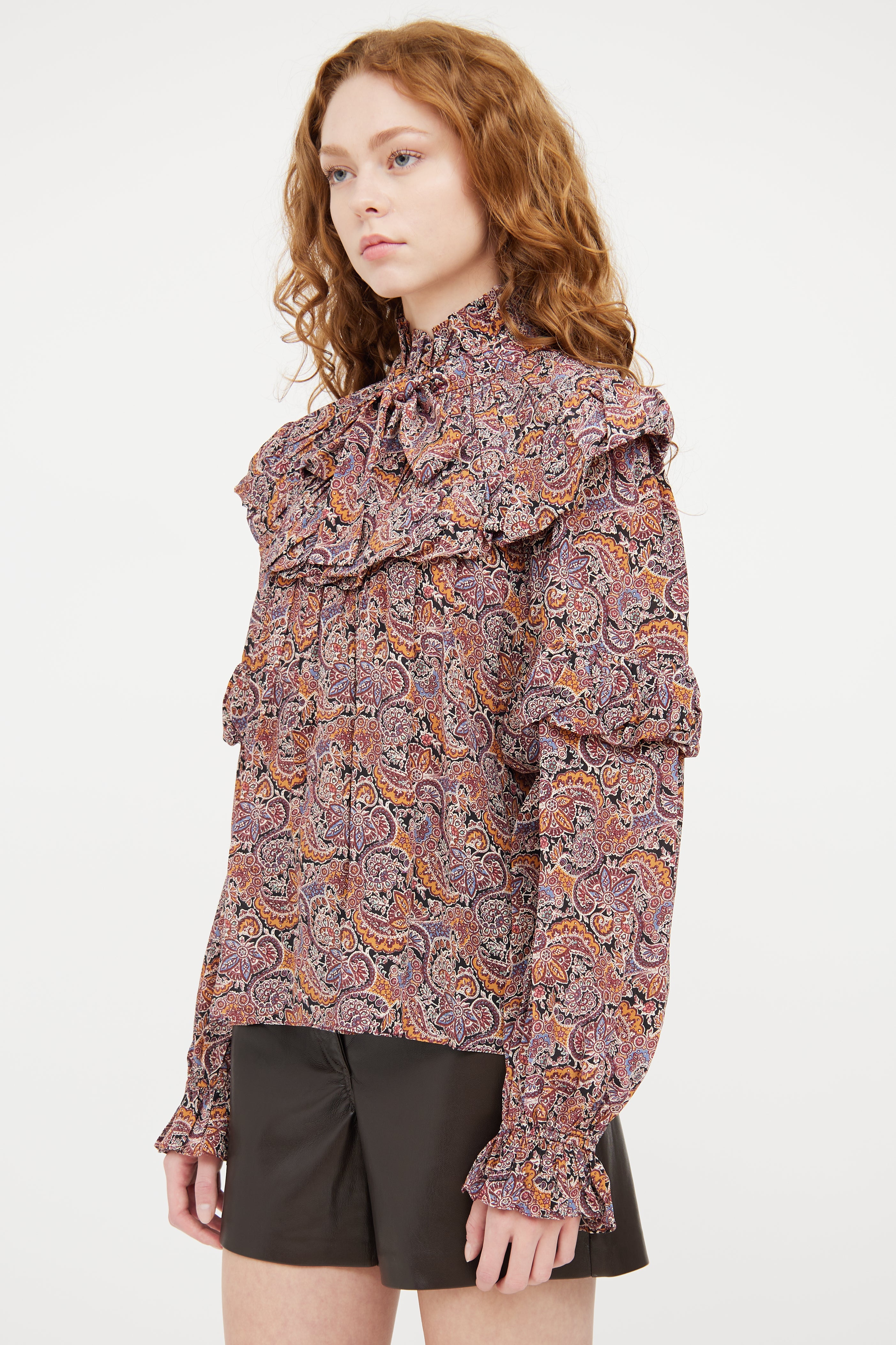 Pre-owned Ulla Johnson burgundy silk top featuring a multicolour floral pattern throughout, mock neck collar with tie detail, pleated layered bust, tiered sleeves with ruffled cuffs, and button closure at back.