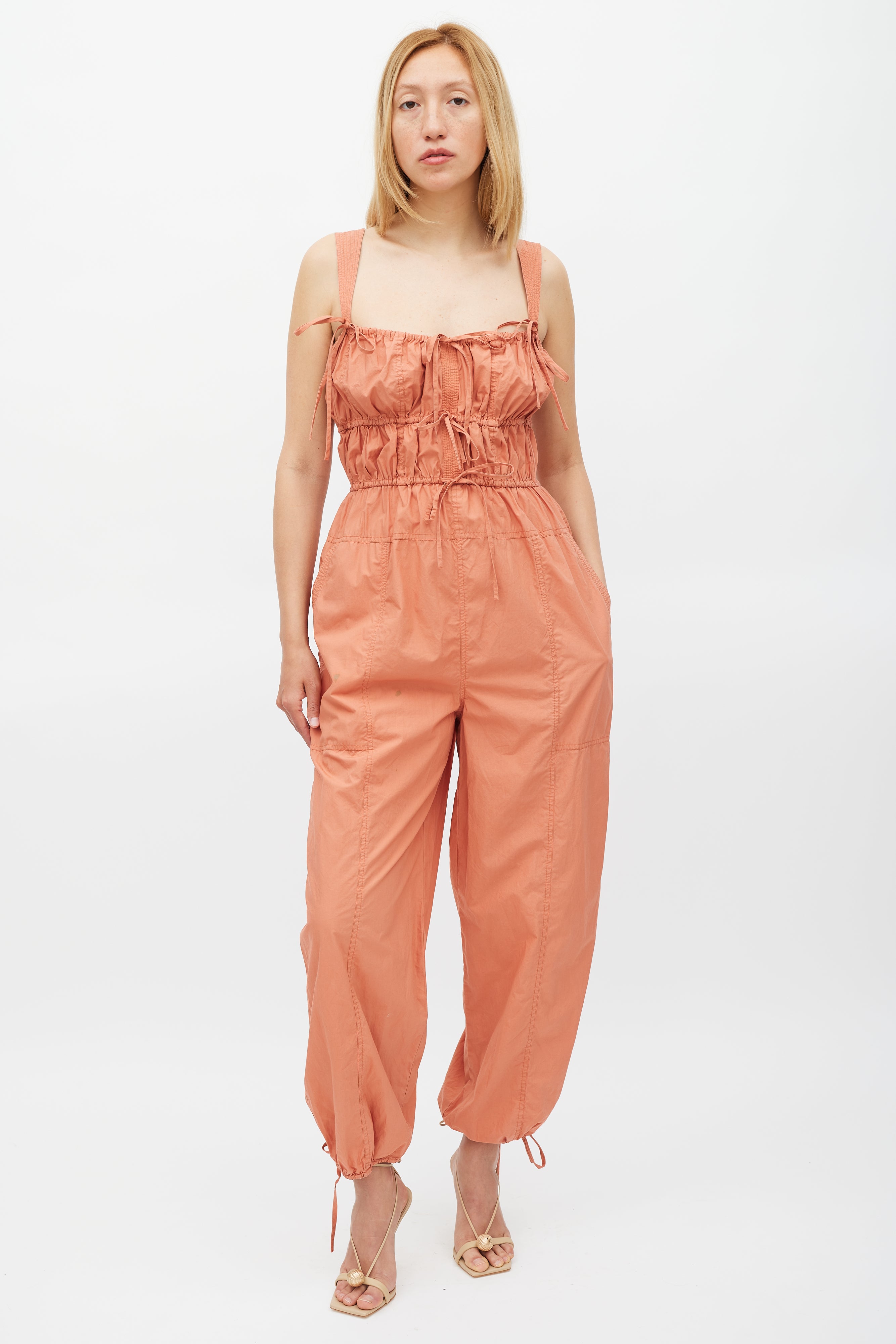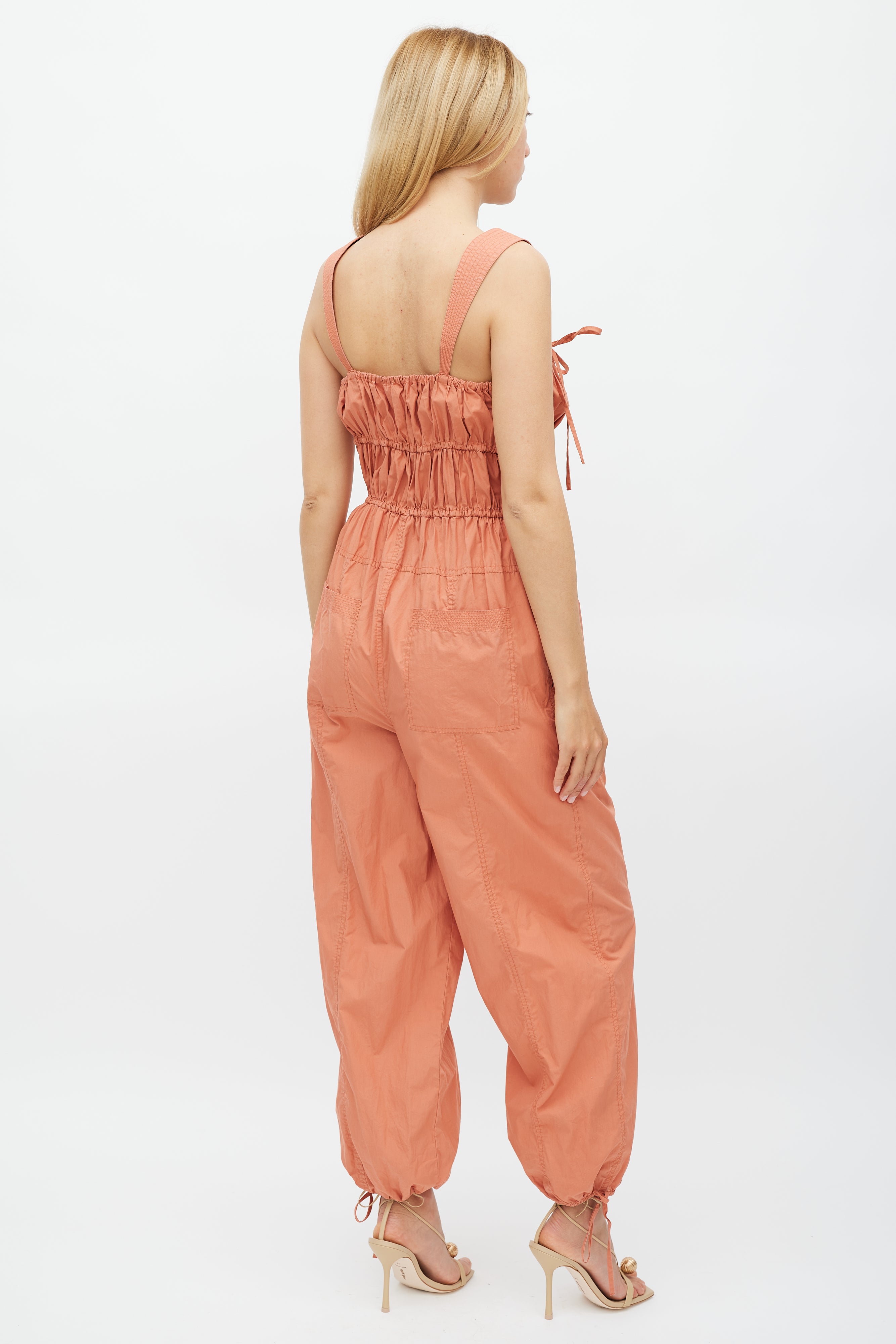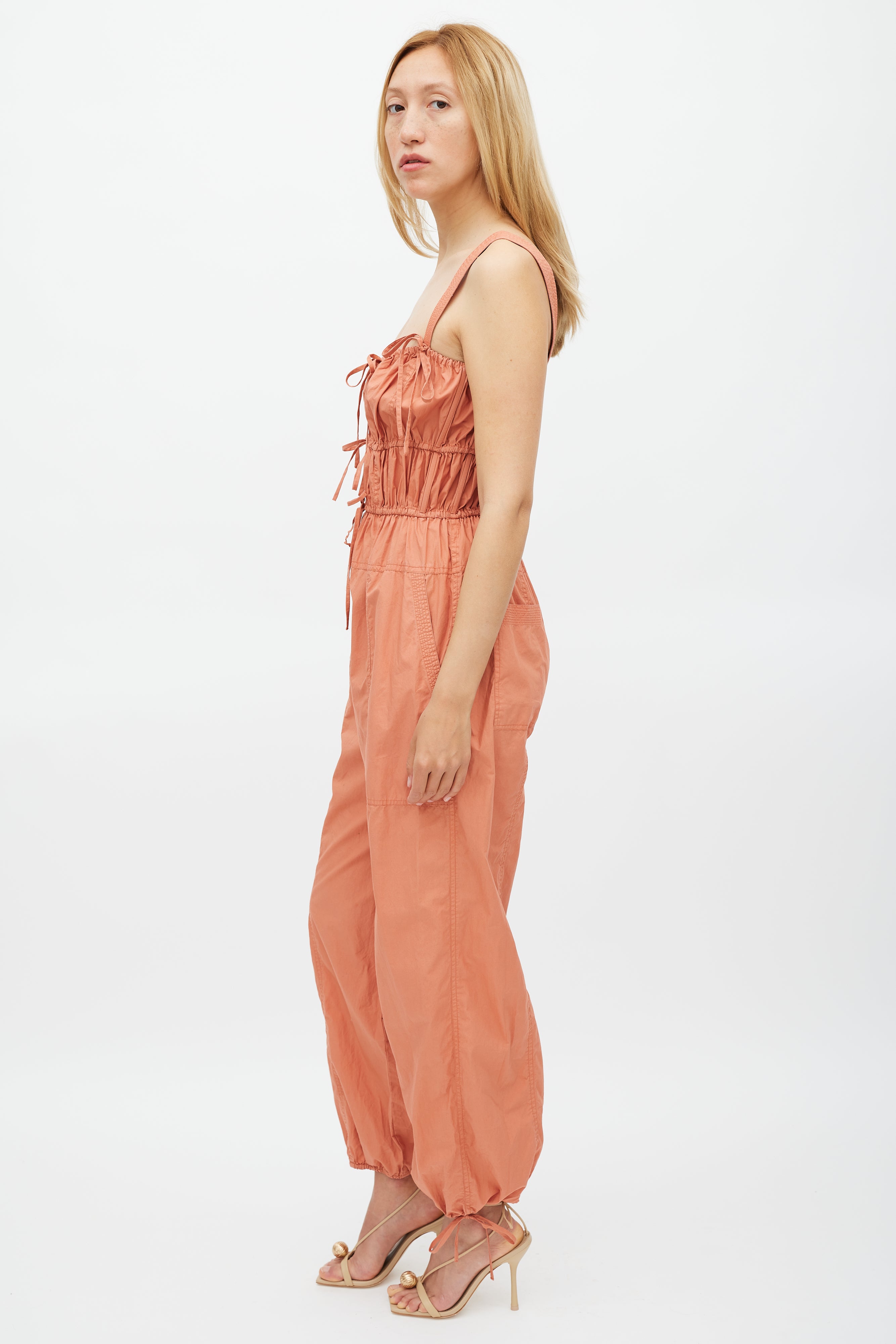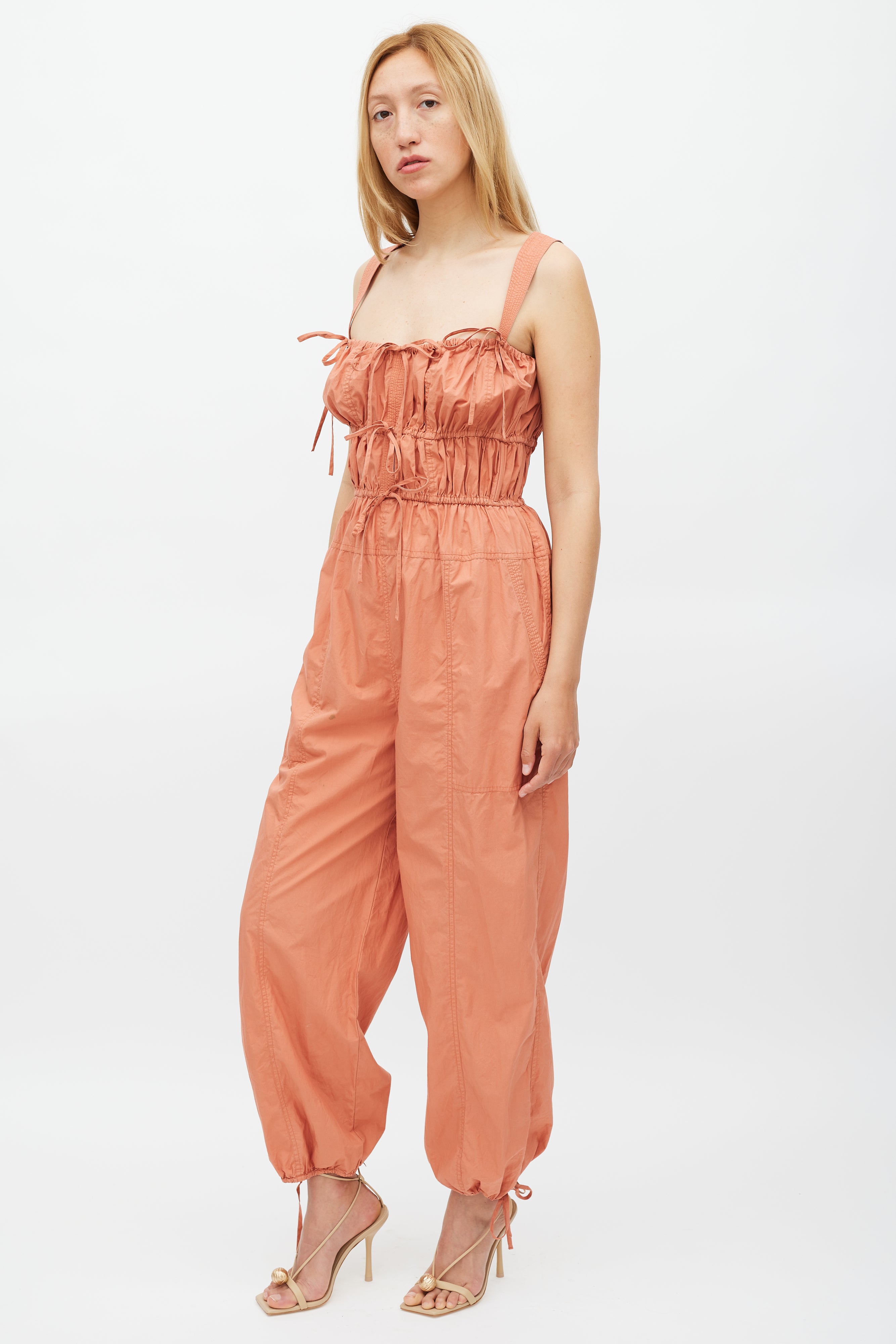 Pre-owned Ulla Johnson orange jumpsuit featuring fixed shoulder straps, gathered bodice with drawstring details, side boning, elasticized waist, two front hip pockets, two back patch pockets, and elasticized ankle cuffs with drawstring detail.
