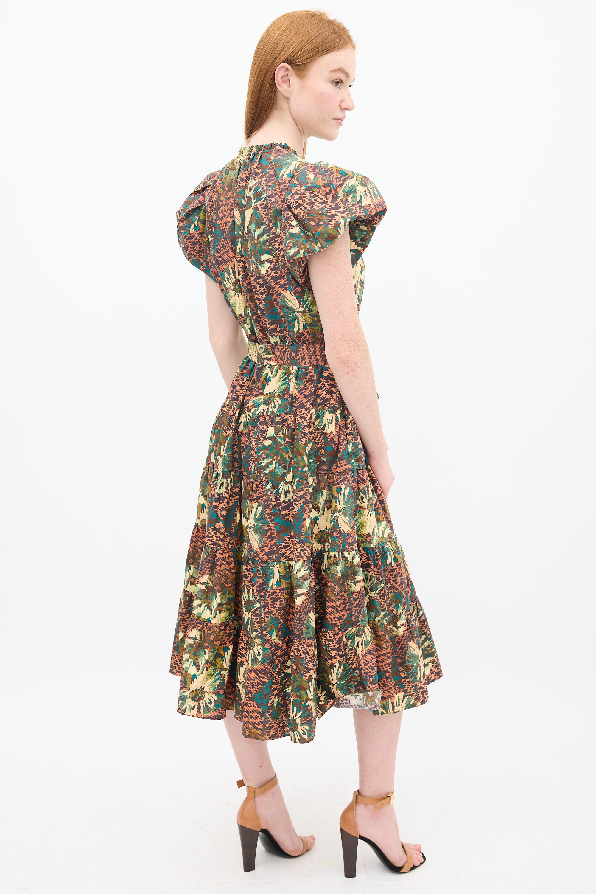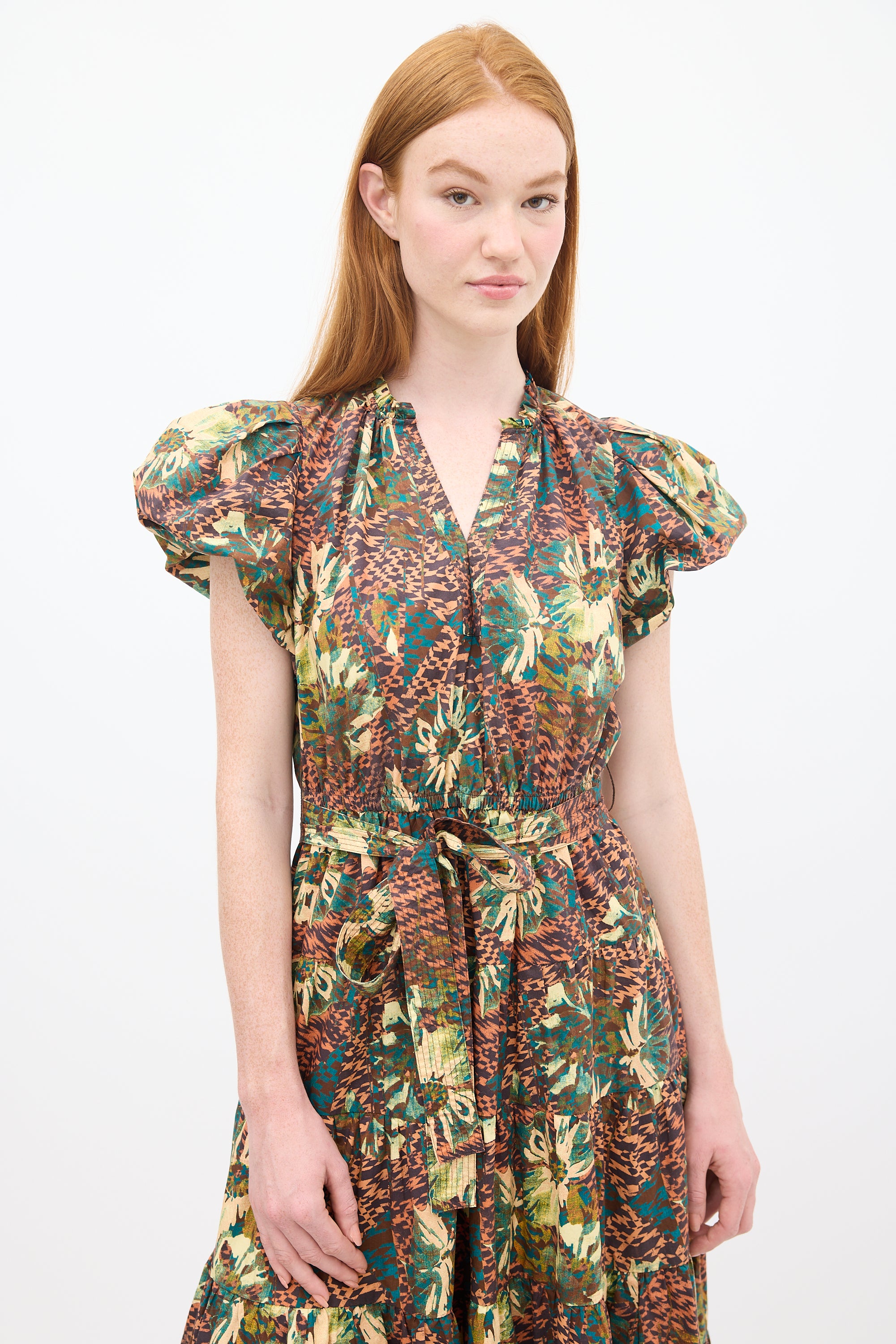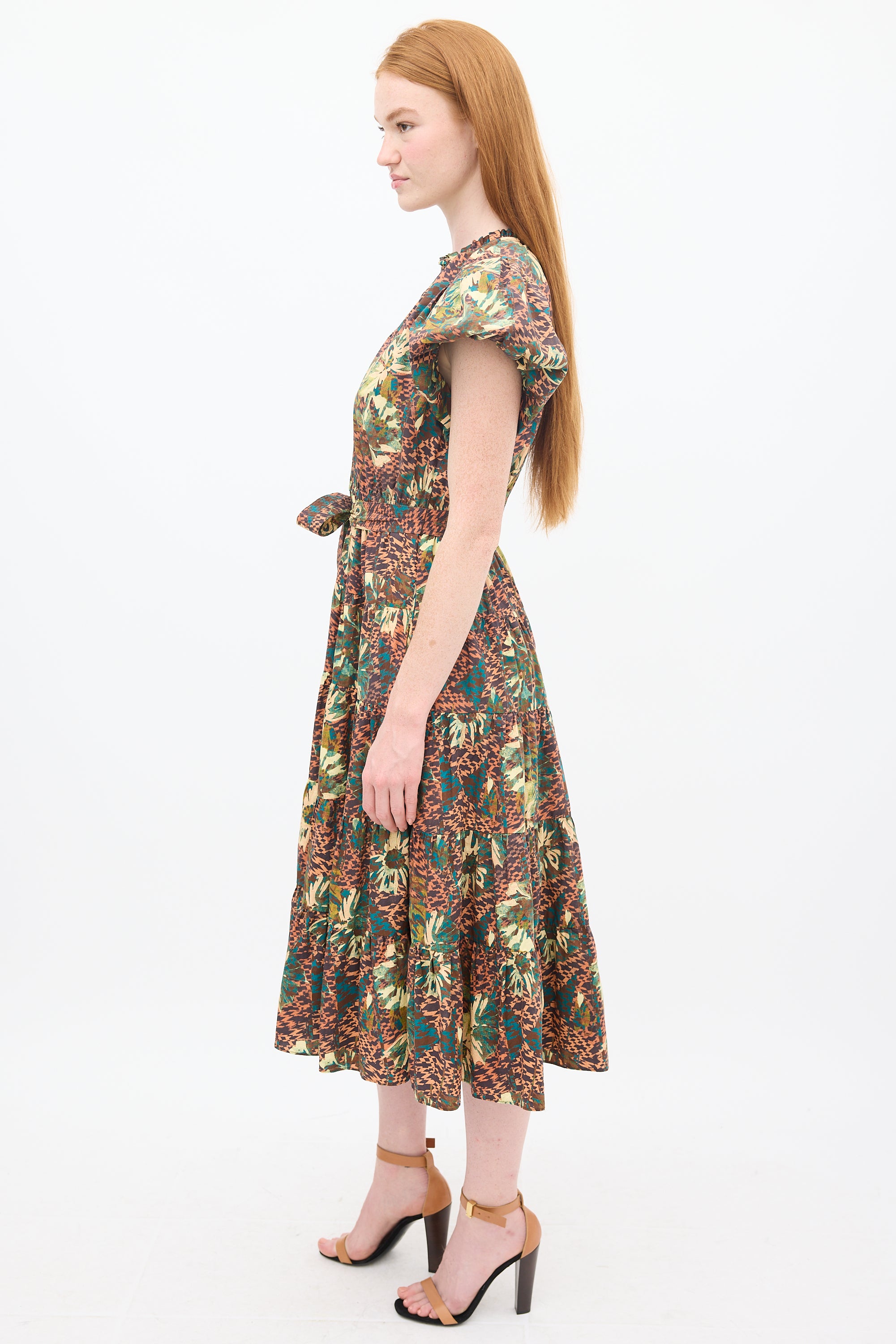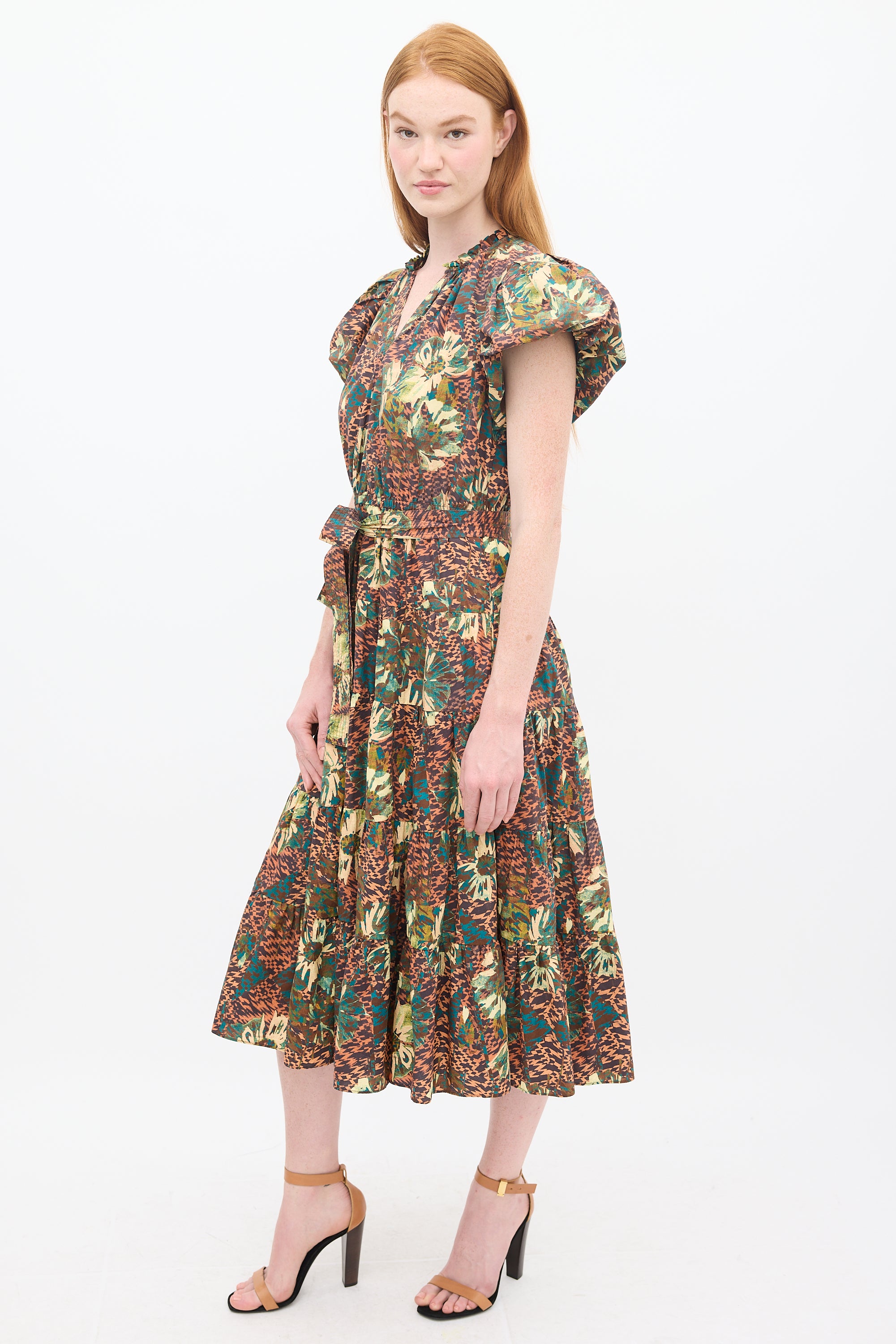 Pre-owned Ulla Johnson orange and multicolour cotton Ottilie midi dress featuring a V-neckline with ruffle trim, elasticized waist with tie belt, in seam pockets, tiered skirt, short puff sleeves, and abstract floral print throughout. Clipped to fit model.