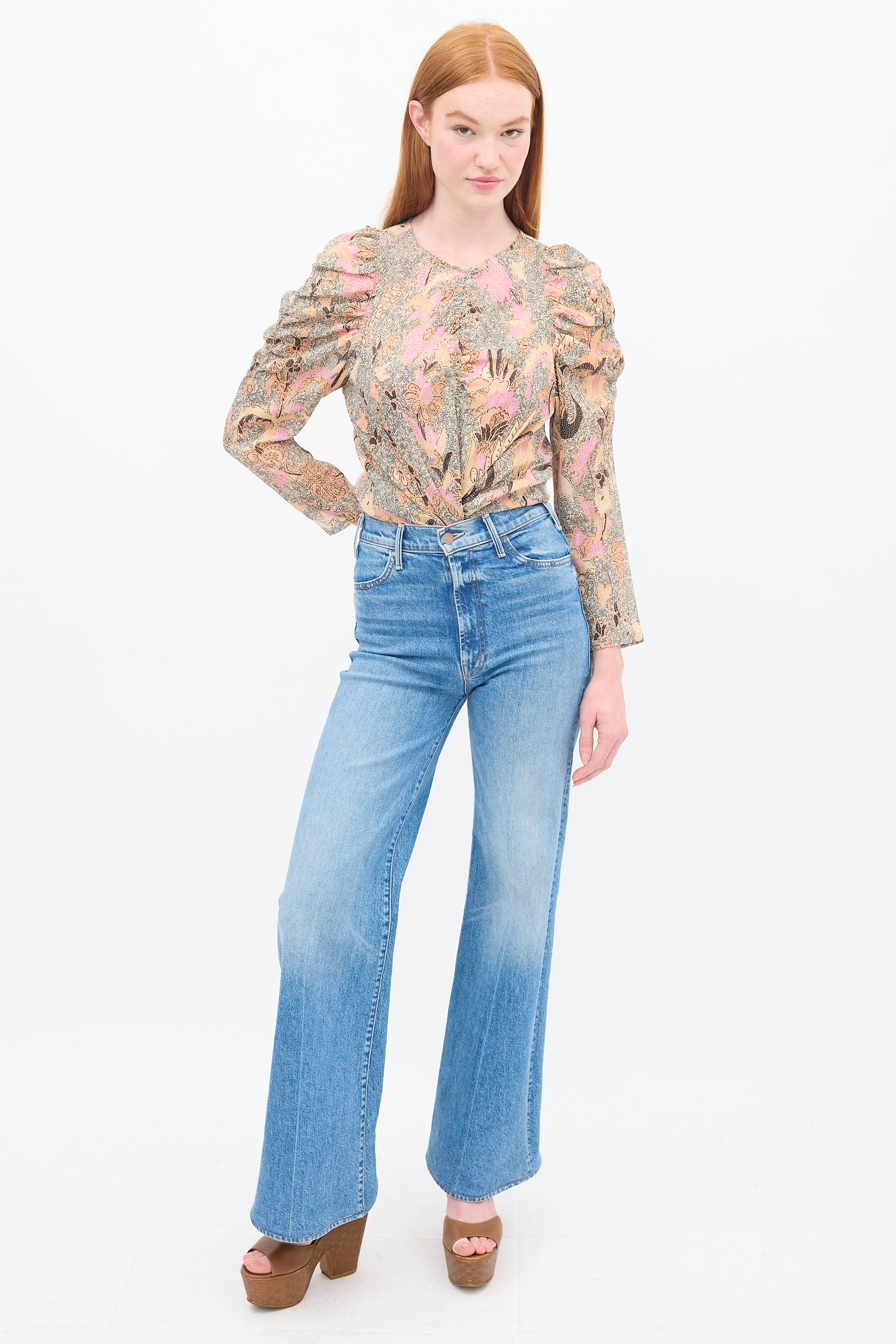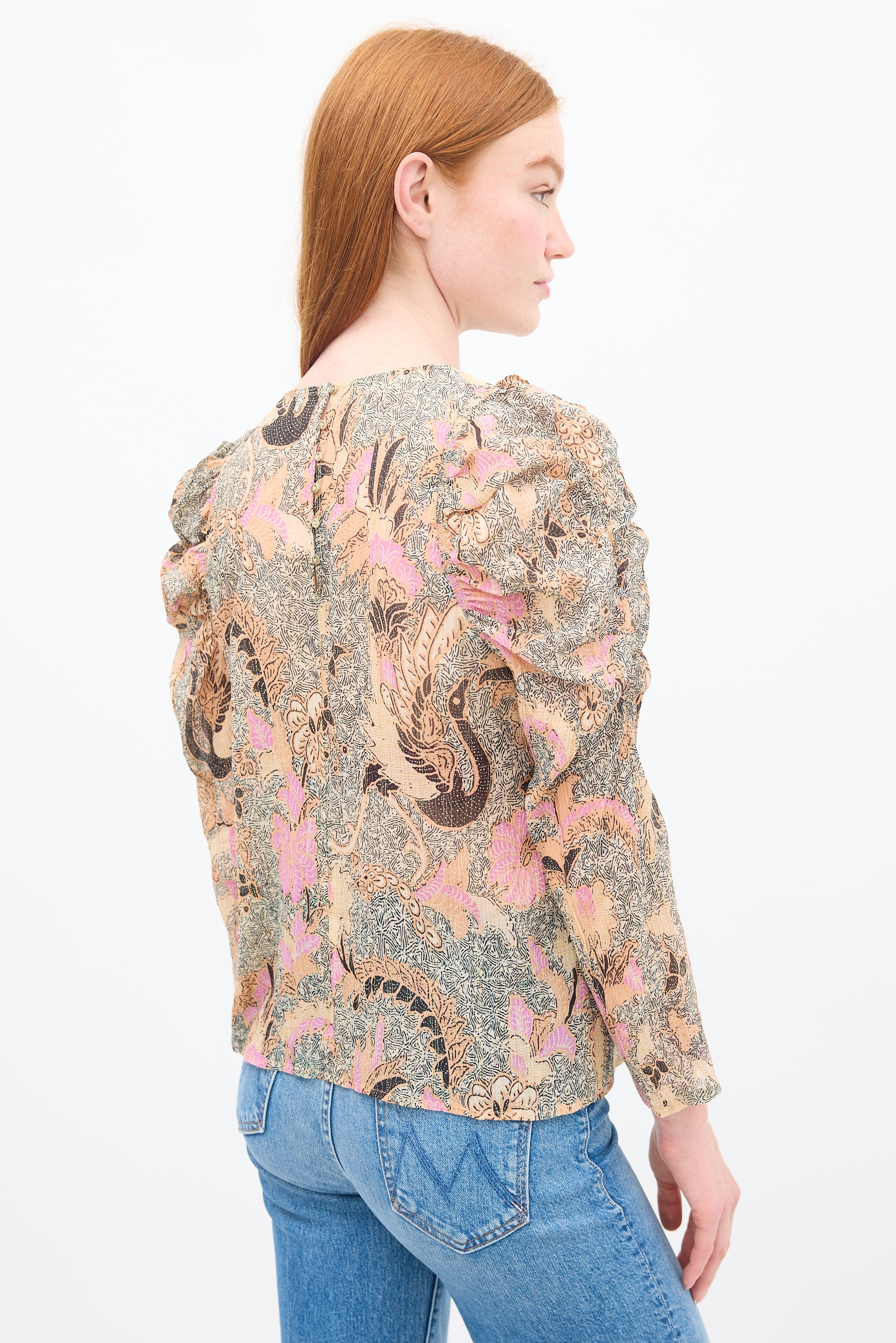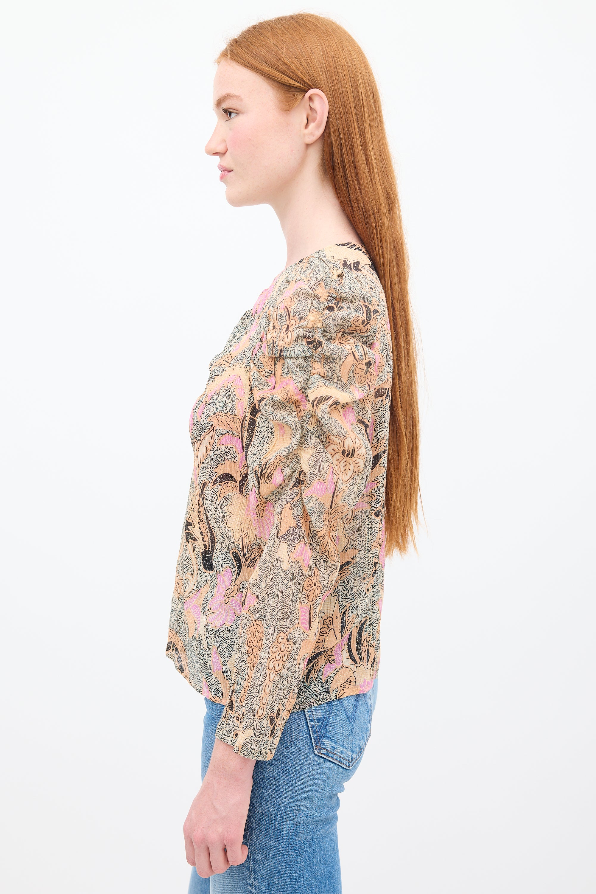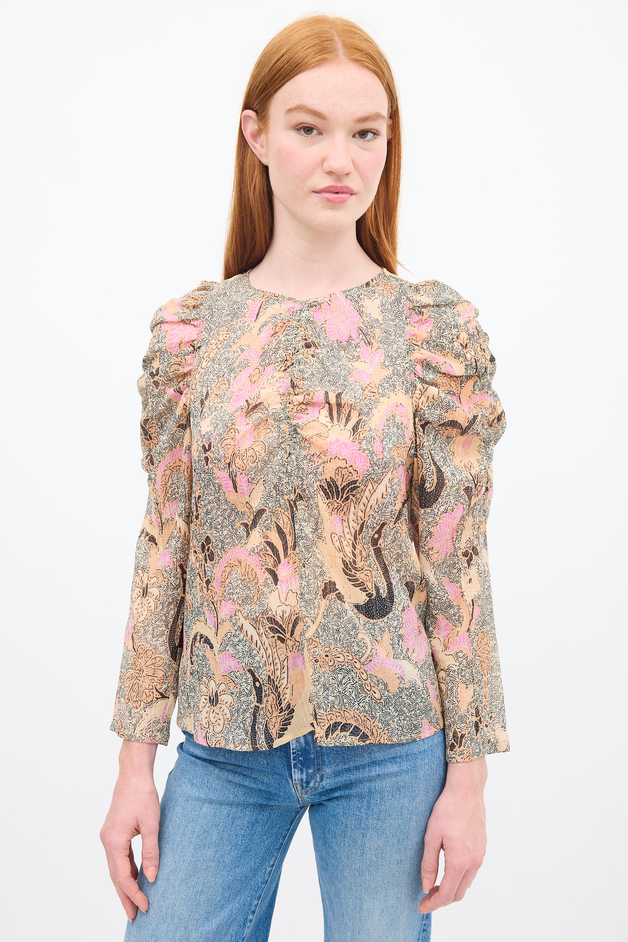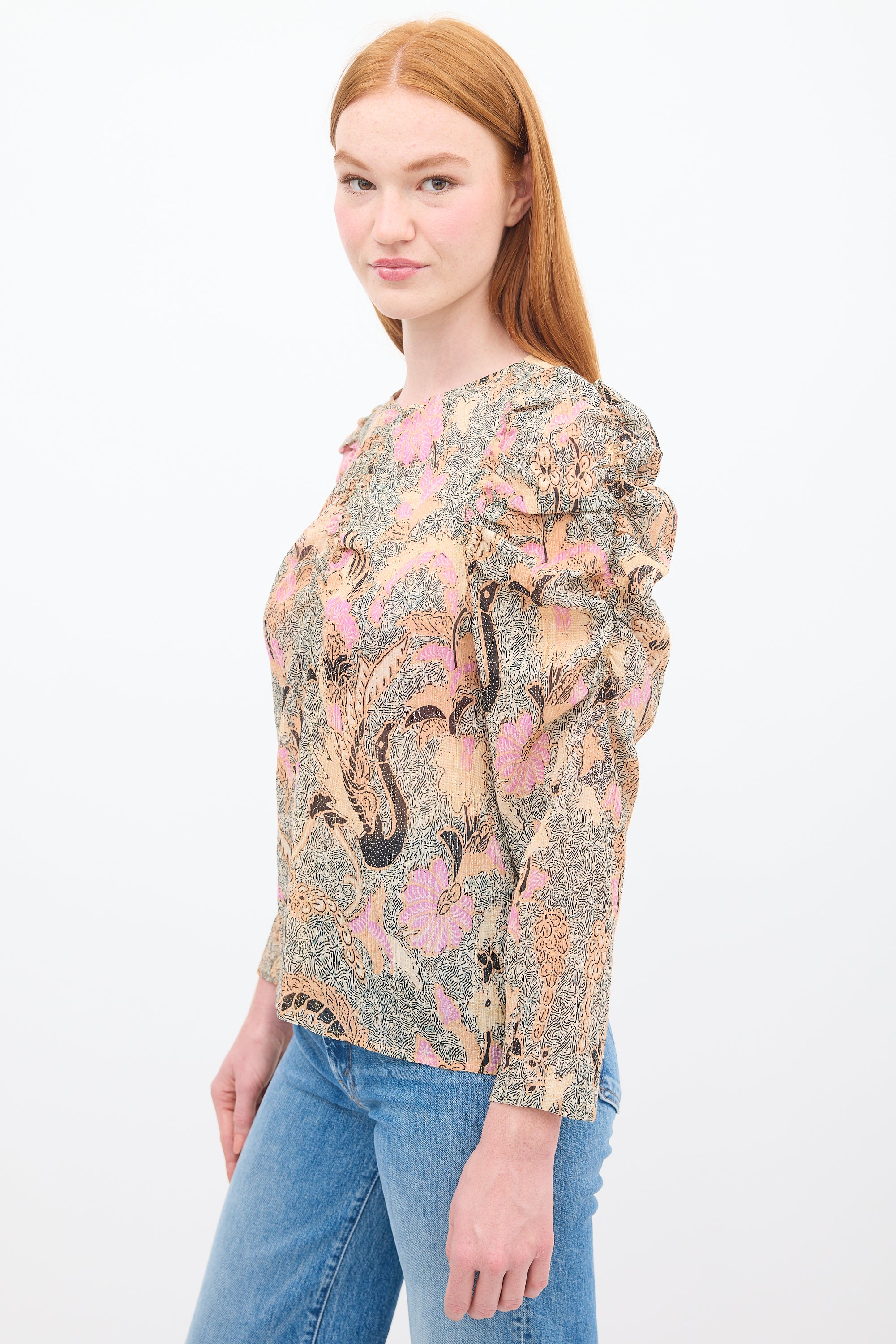 Pre-owned Ulla Johnson orange and multicolour top featuring a round neckline, button up front, floral and bird motif print, gold tone metallic threading throughout, ruching at centre front, and ruched long sleeves.