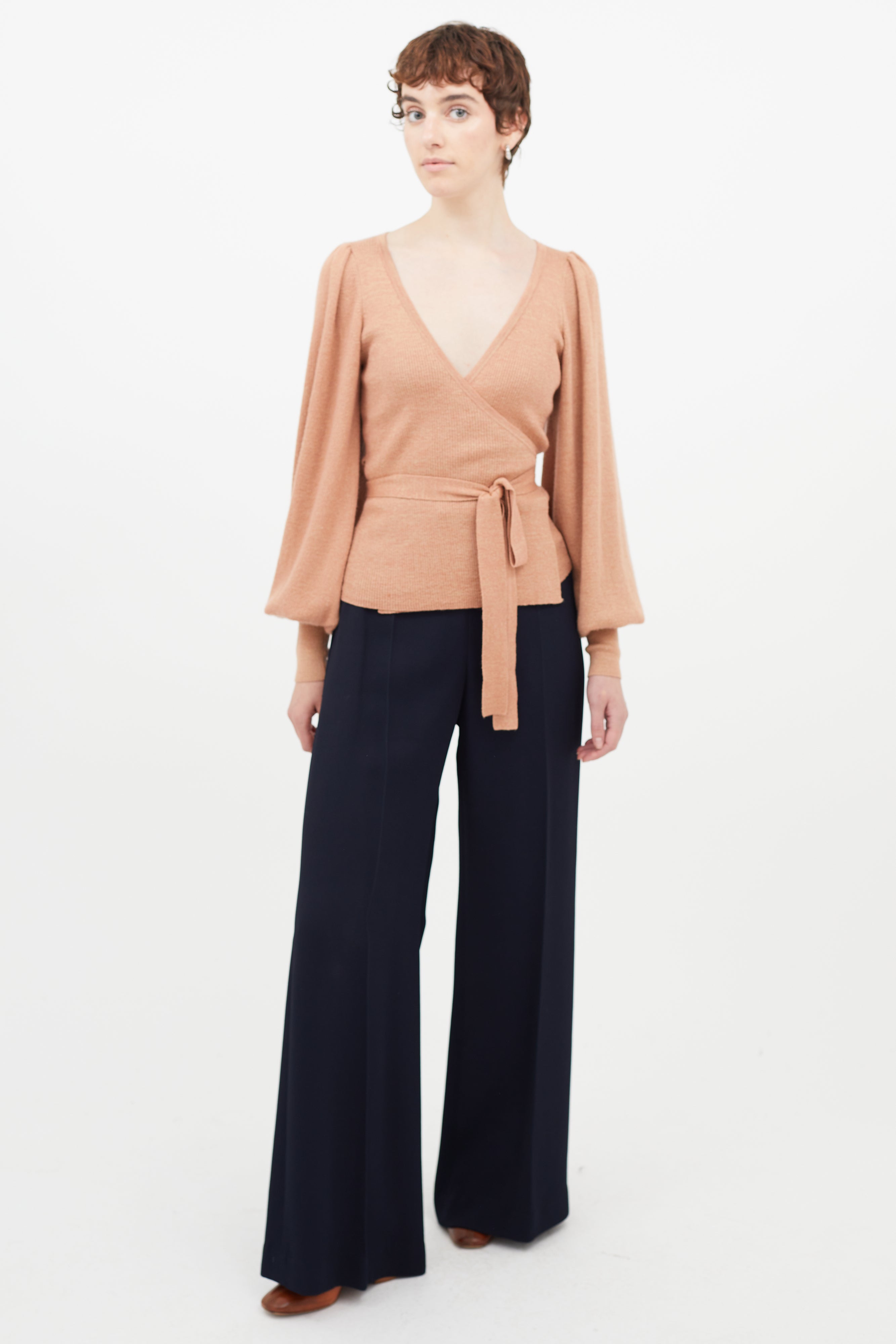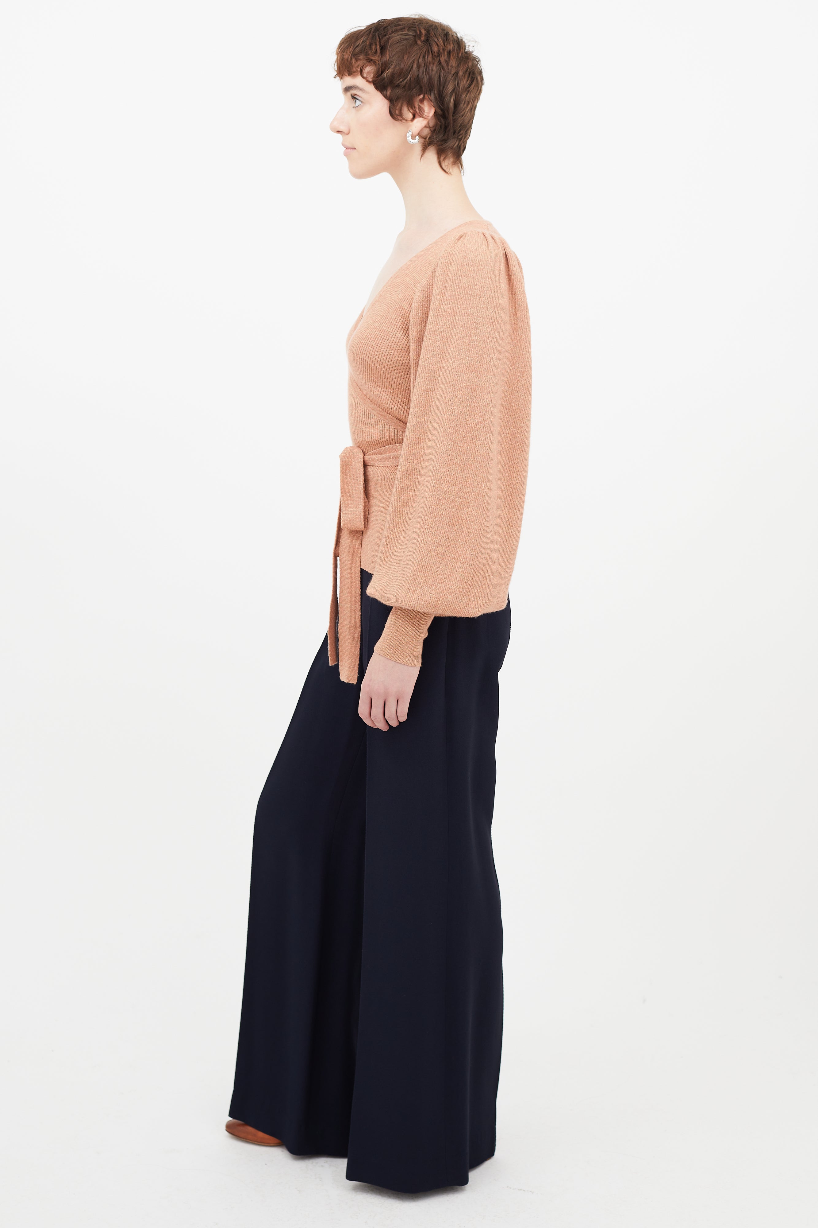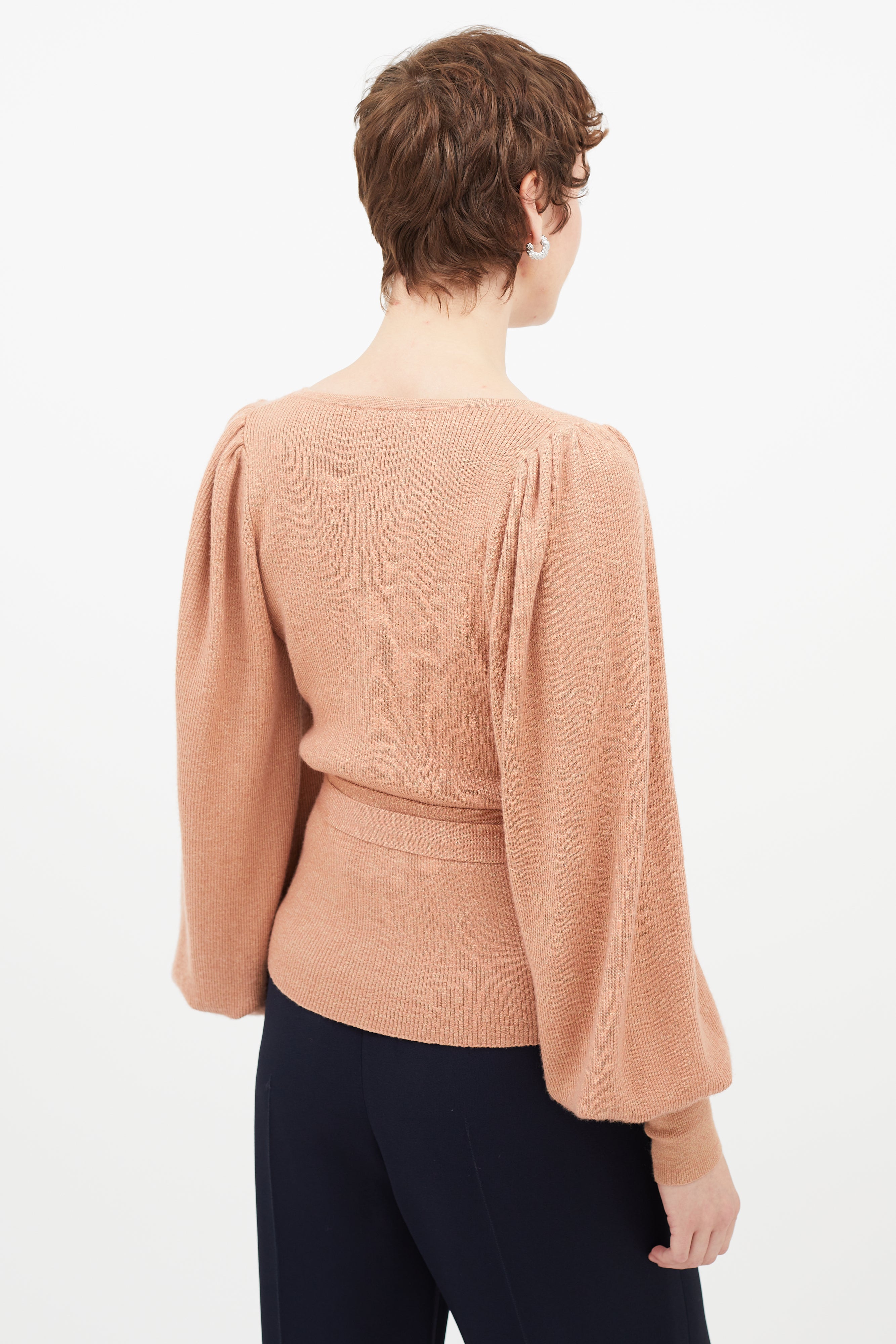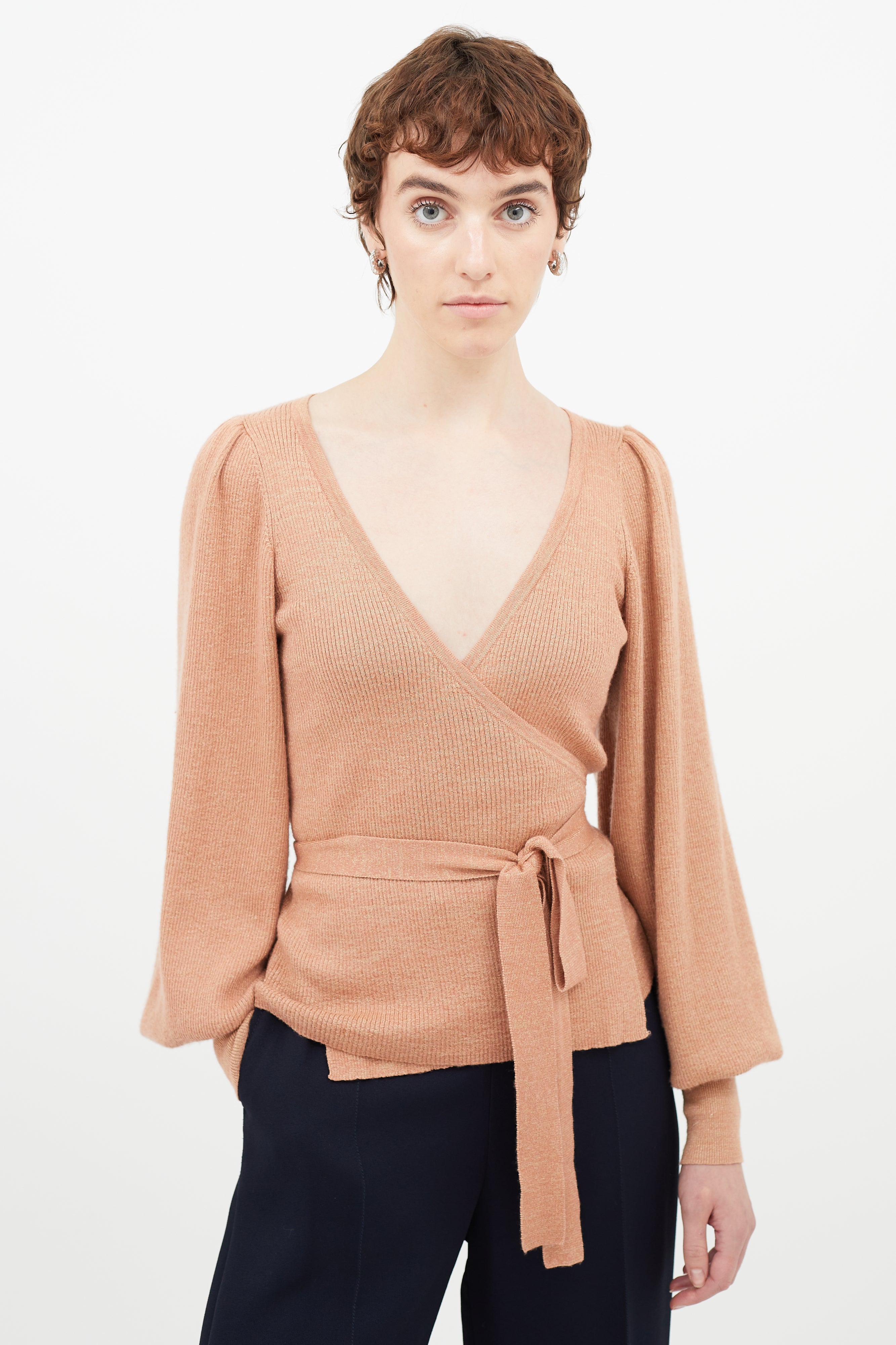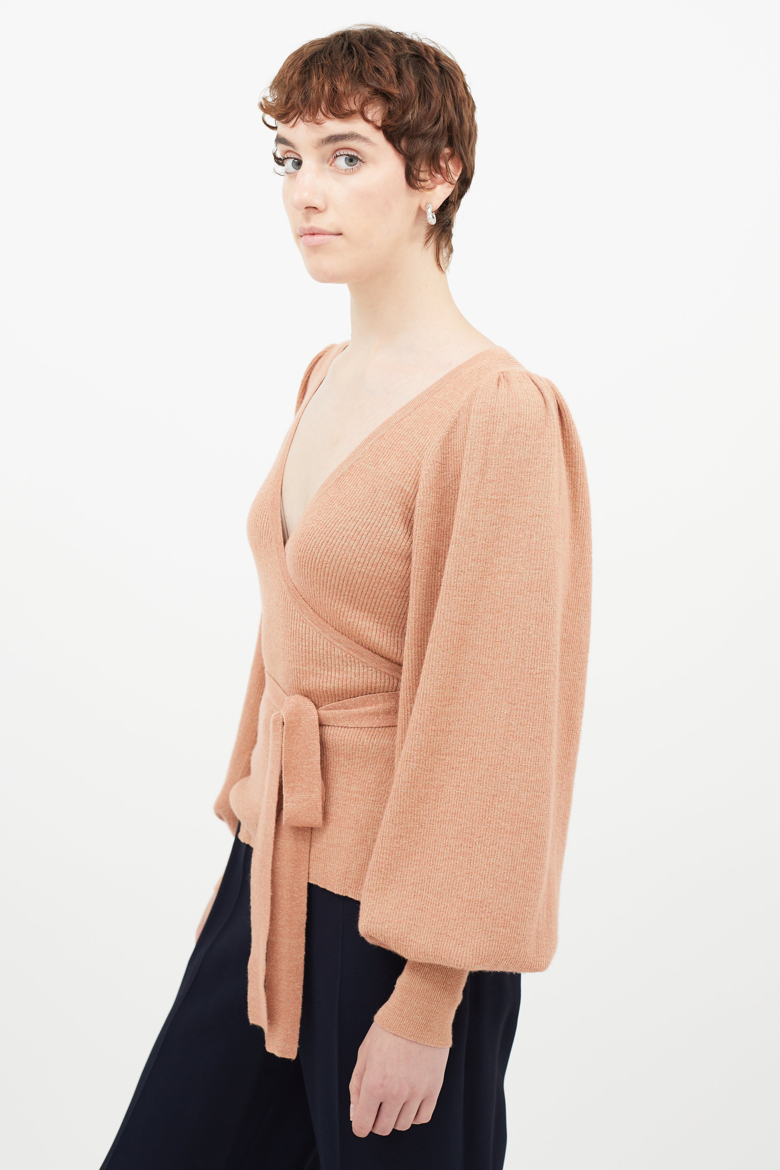 Pre-owned Ulla Johnson pink metallic cardigan featuring a surplice neckline, long sleeves with extended cuffs, and wrap front closure.