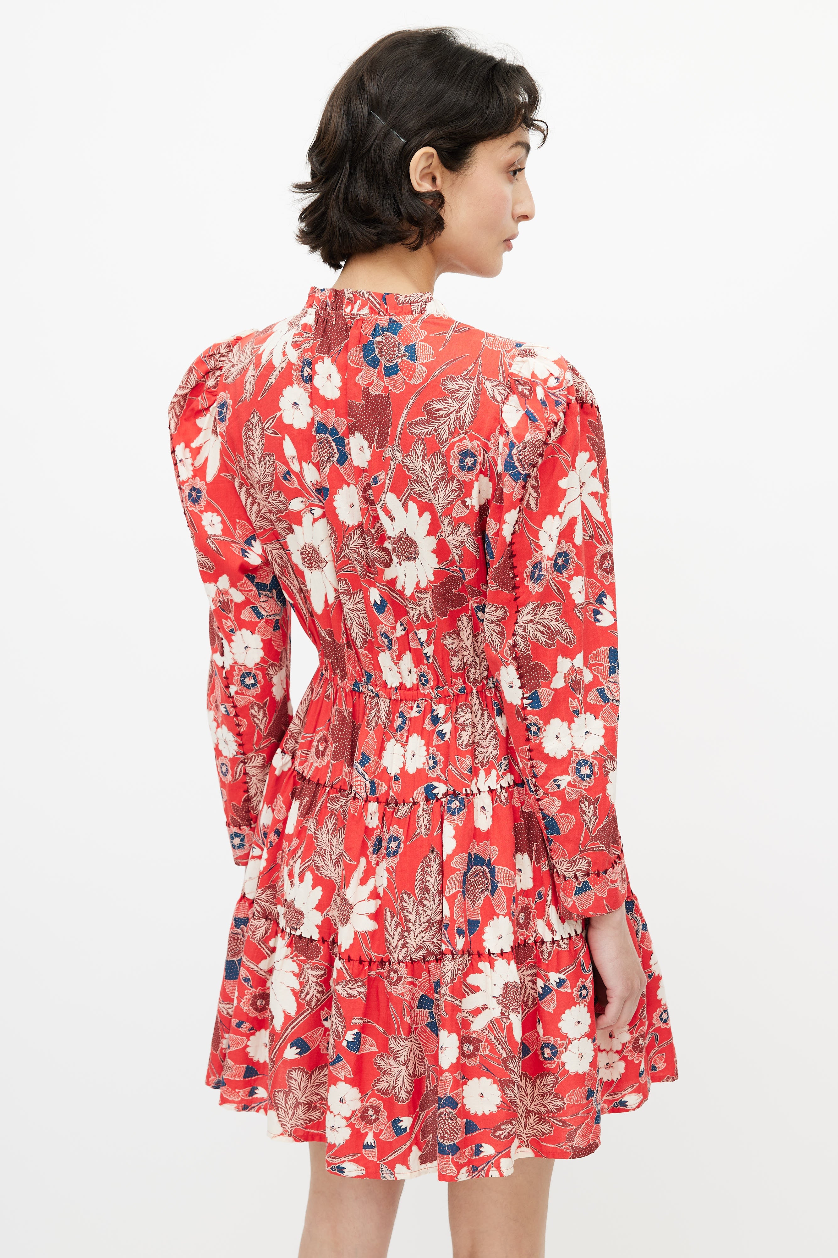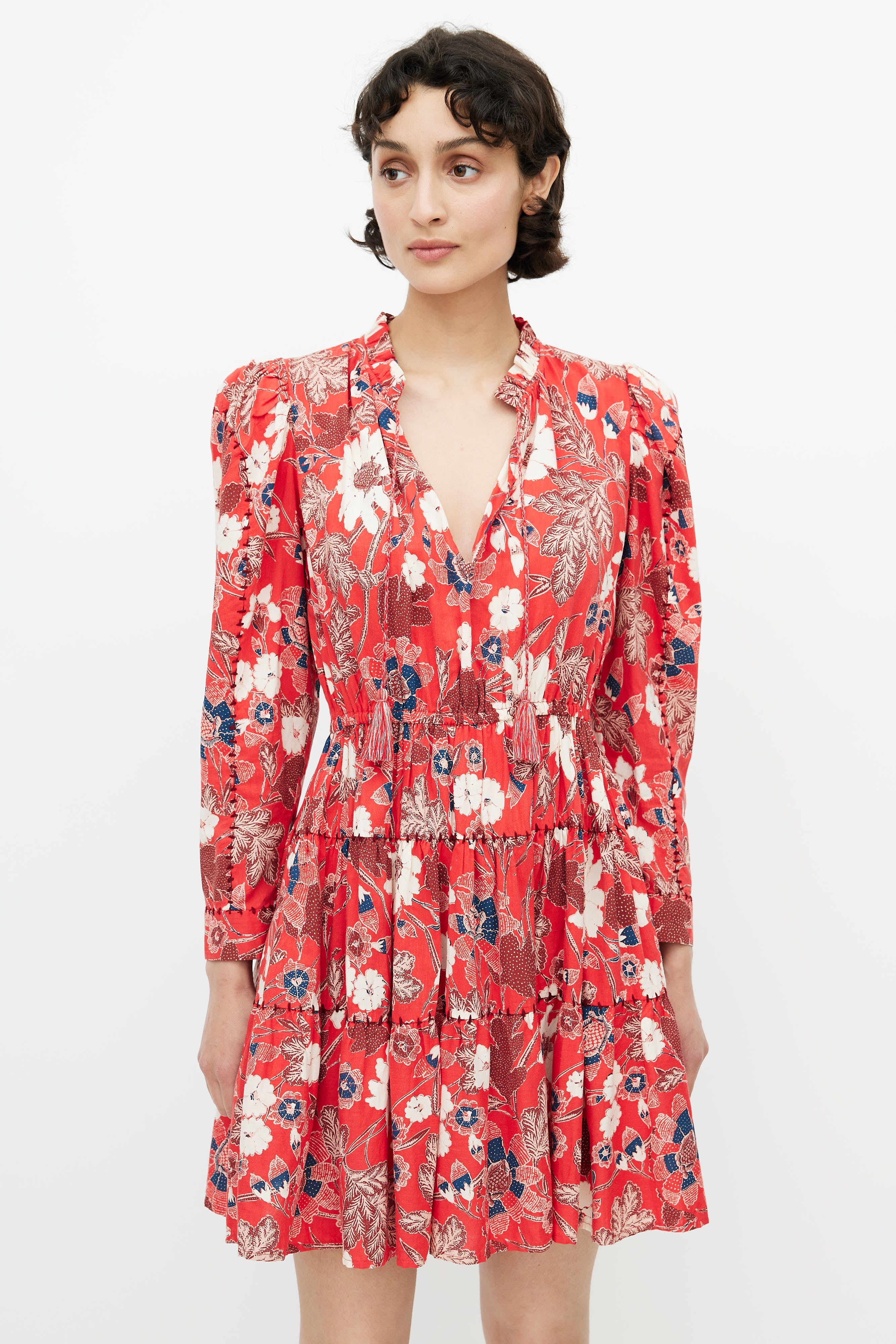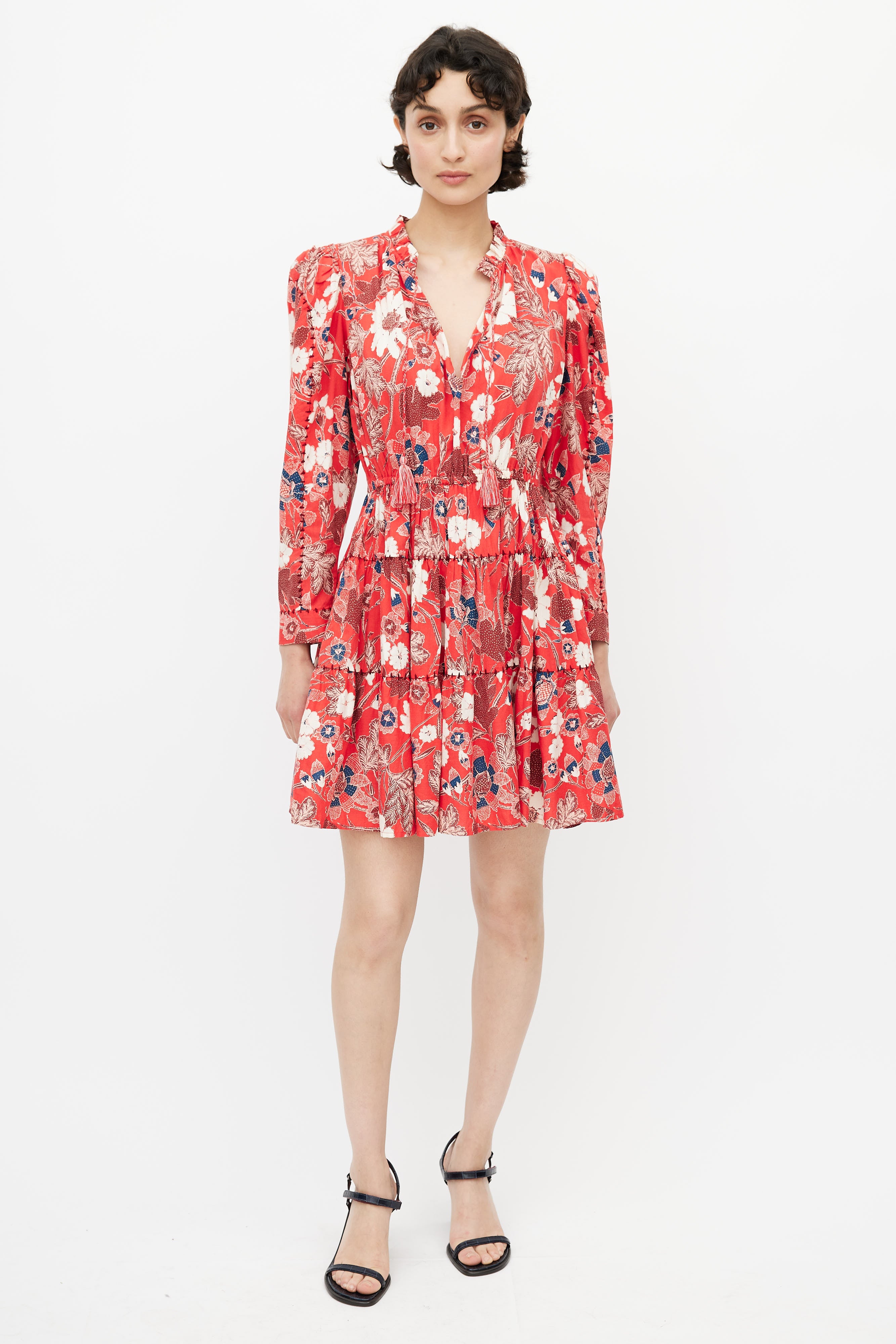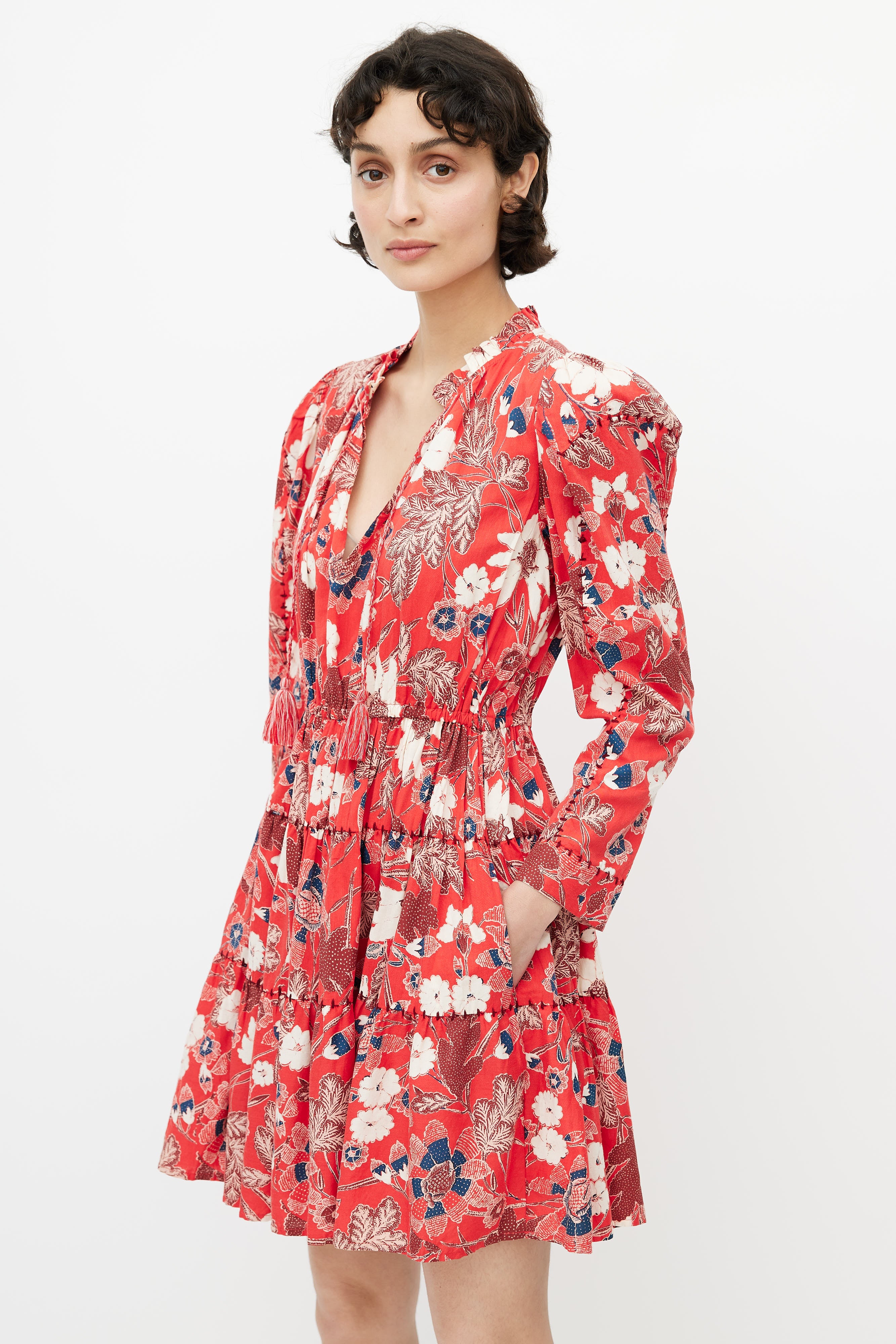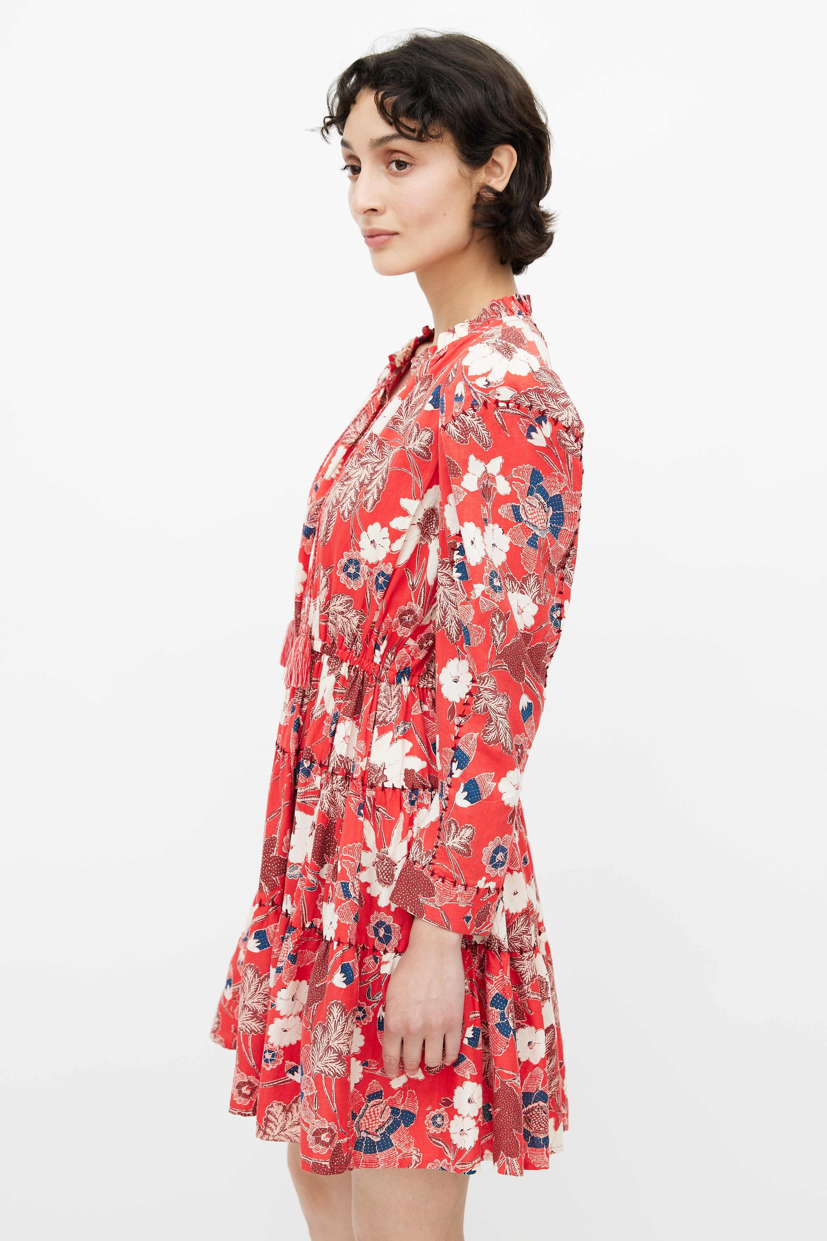 Pre-owned Ulla Johnson red dress featuring multi coloured floral print, keyhole neckline with tassel fastening, elasticized waist, two concealed pockets at side, and red stitching detail throughout.