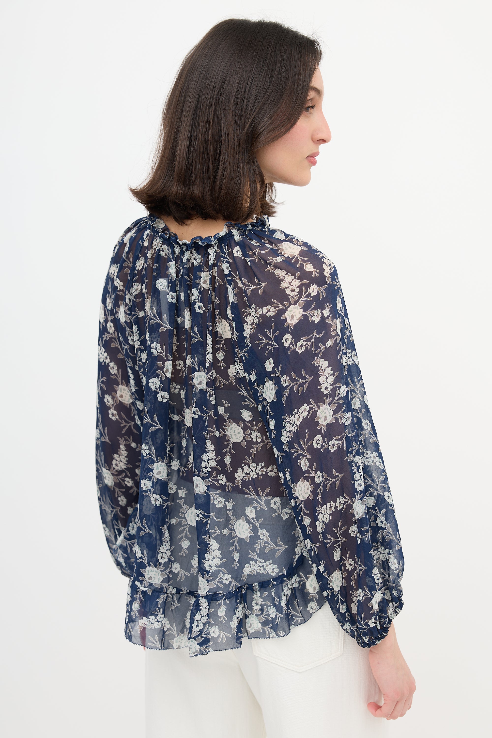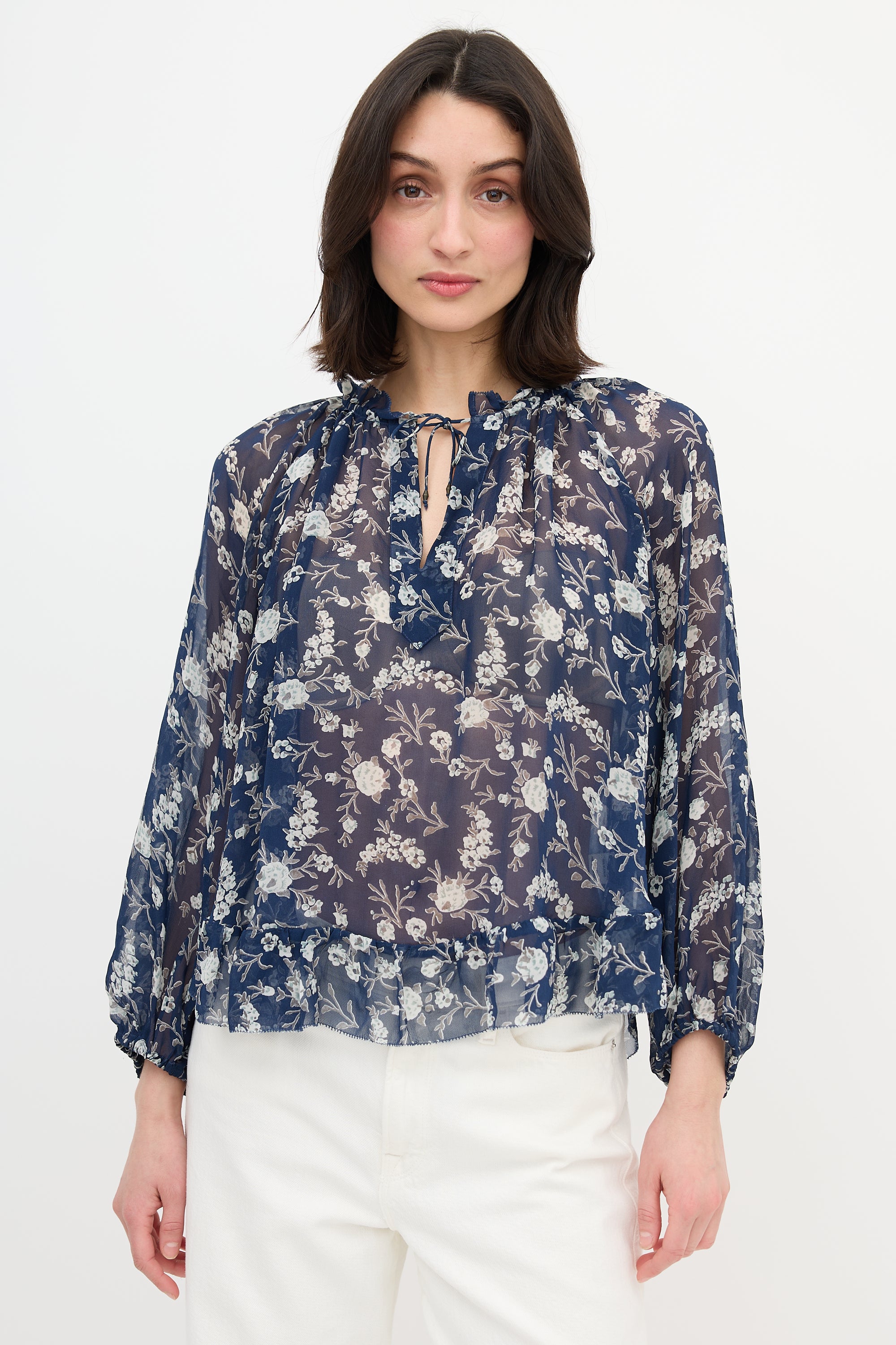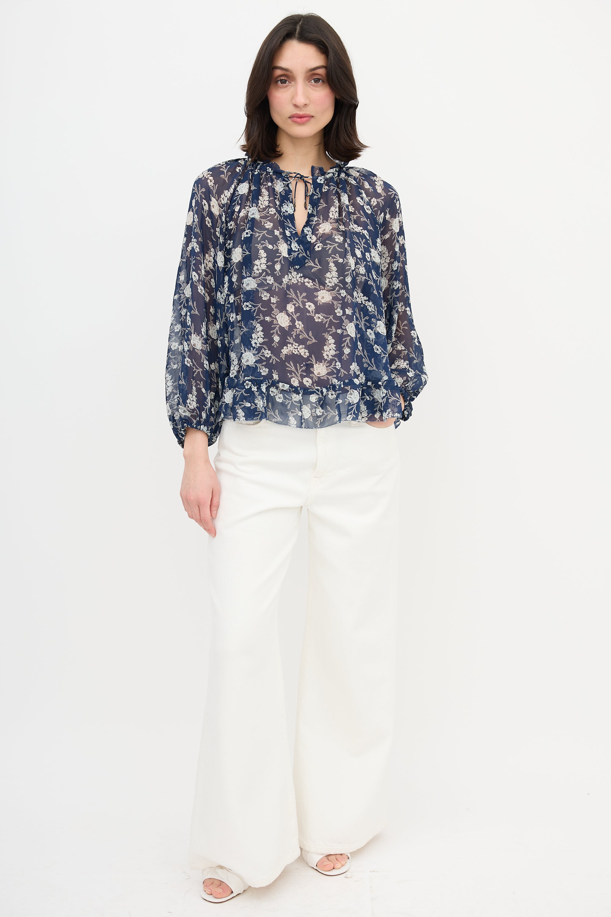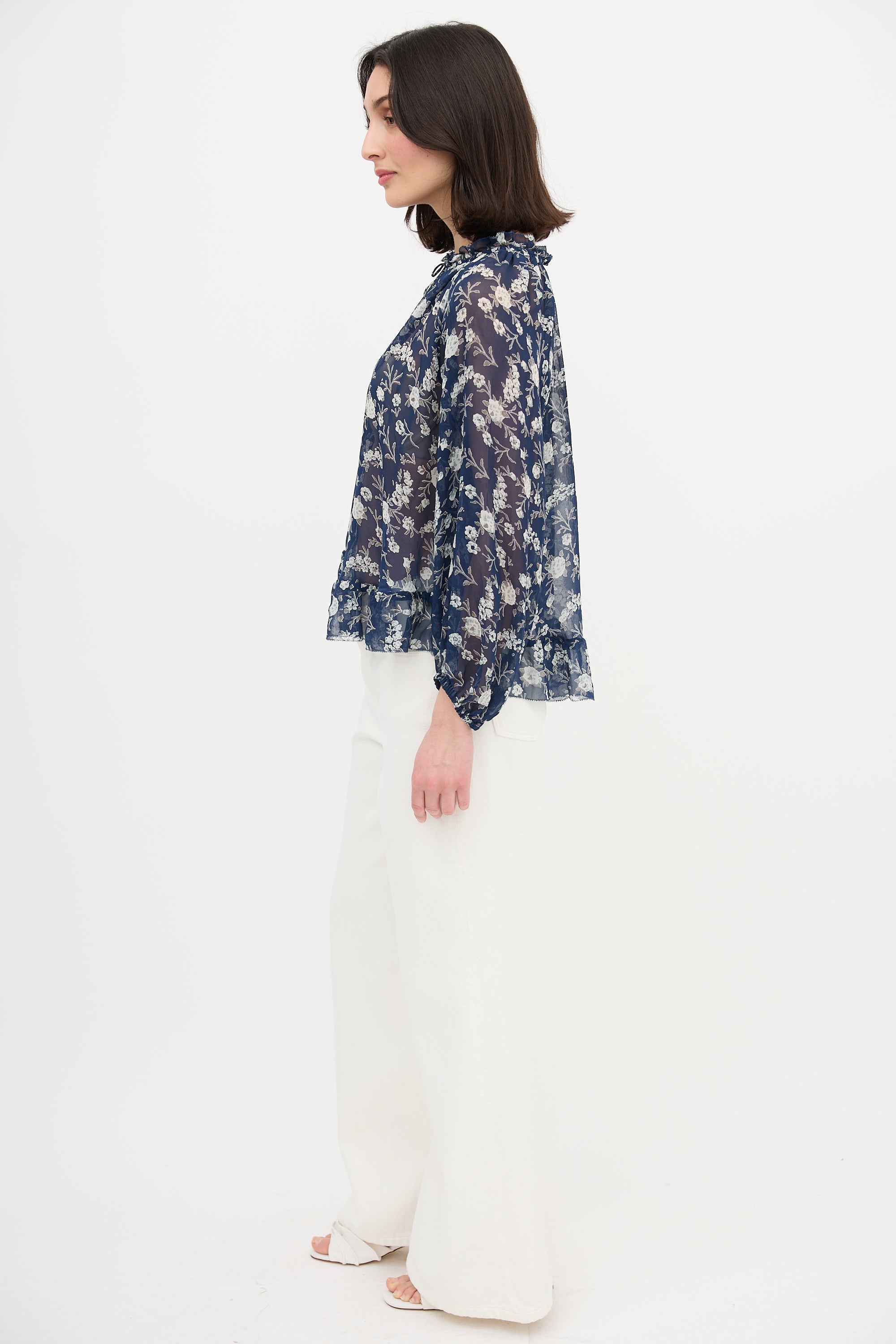 Pre-owned Ulla Johnson blue silk Rosine blouse featuring a V-neckline with tie and ruffle trim, white floral pattern, gathered yoke, long sleeves with elasticized cuffs, and ruffle hem.