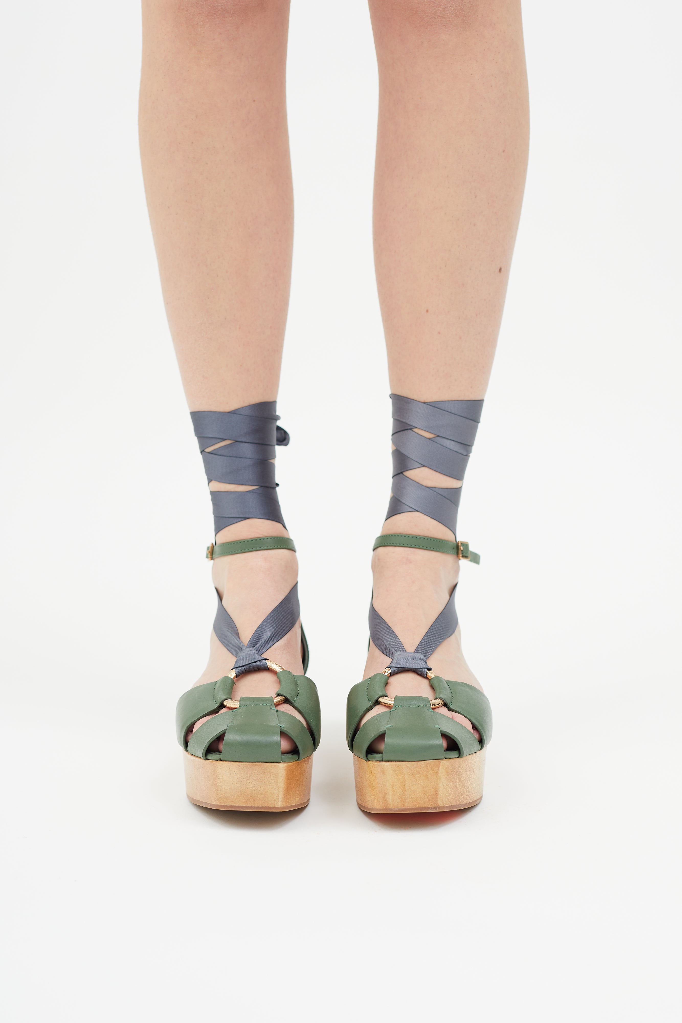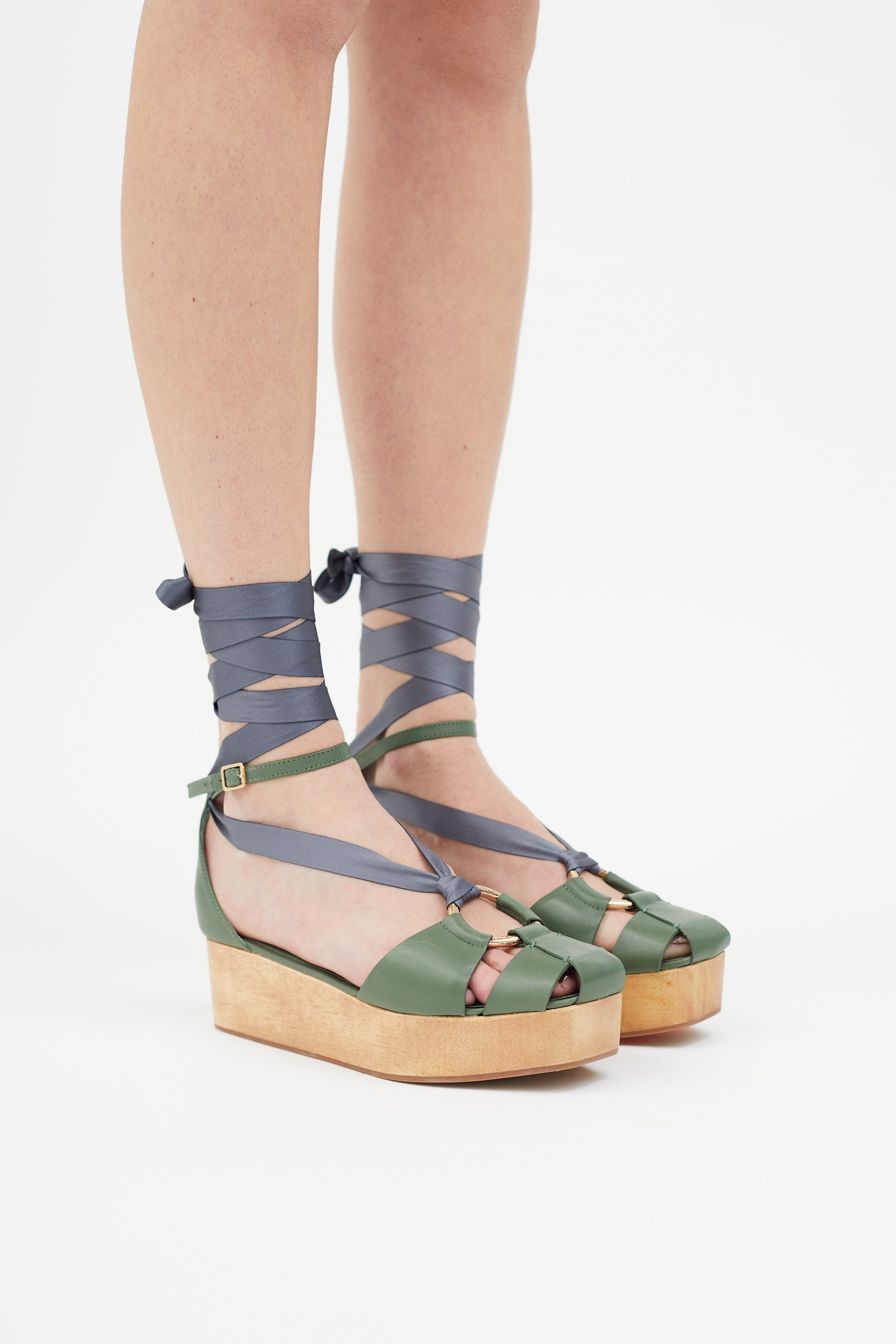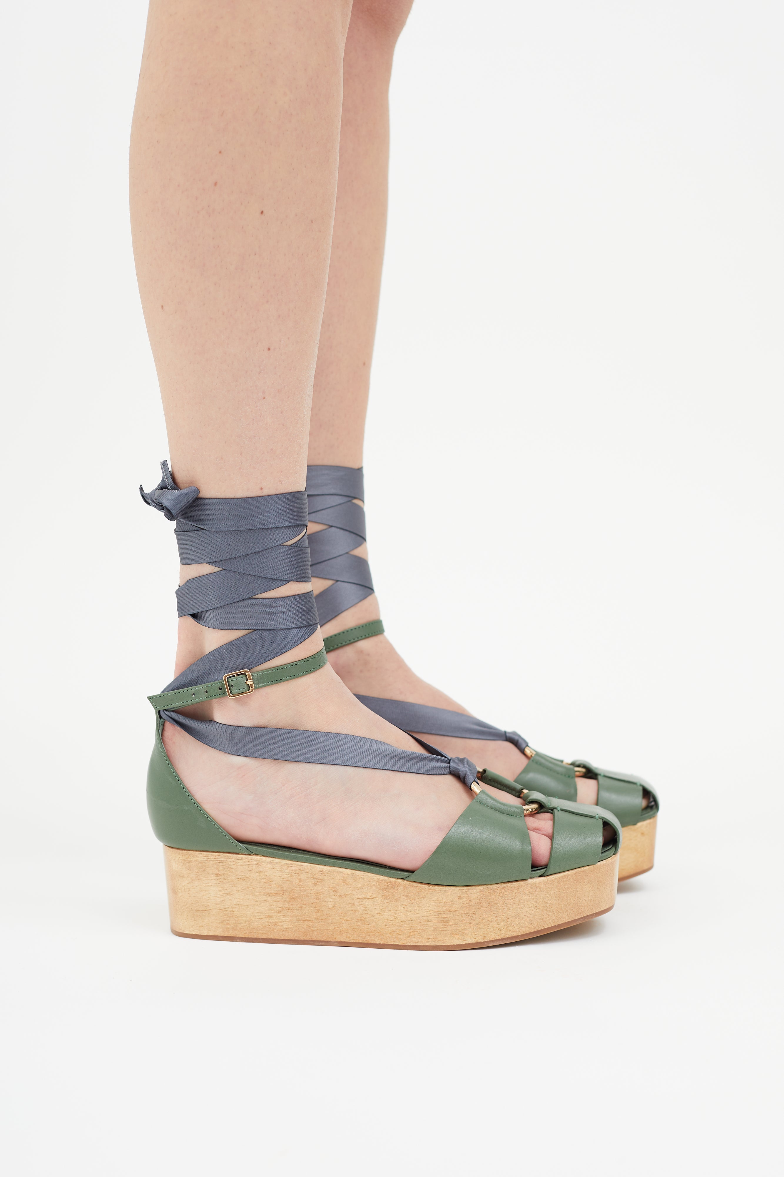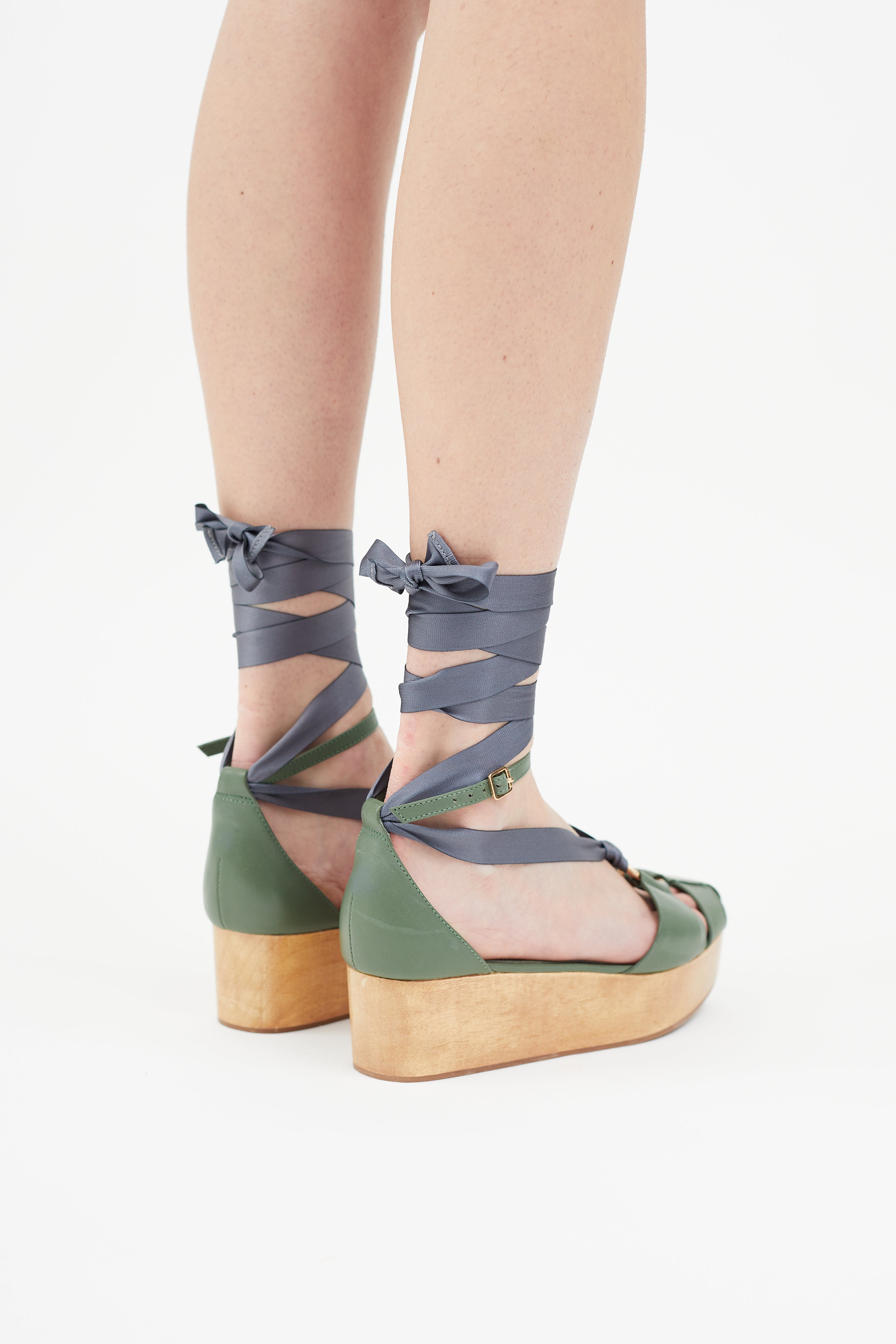 Pre-owned Ulla Johnson SS 2018 green leather Mako platform sandal featuring adjustable ankle straps with gold-tone pin-buckle and dark grey ribbon lace up ankle, multiple straps with gold-tone ring at toe box, square toe and wood platform with rubber outsole.